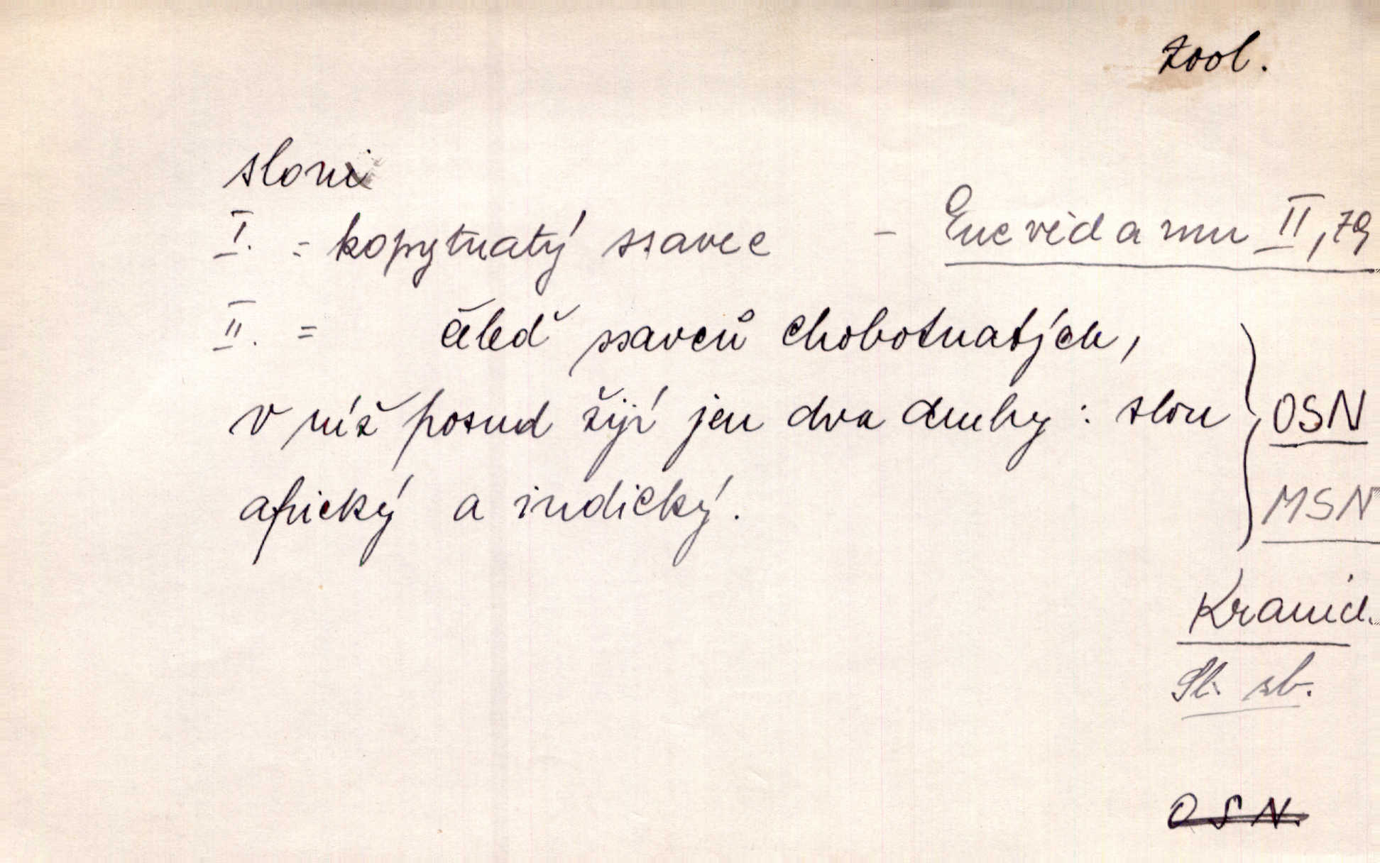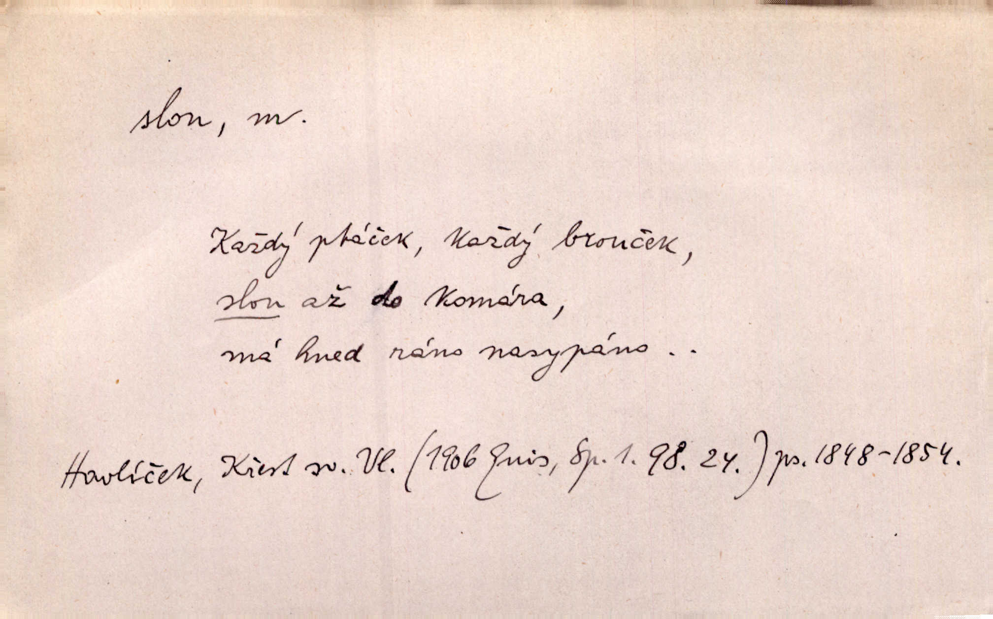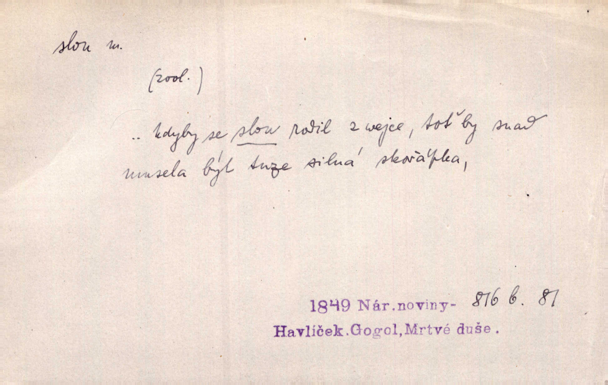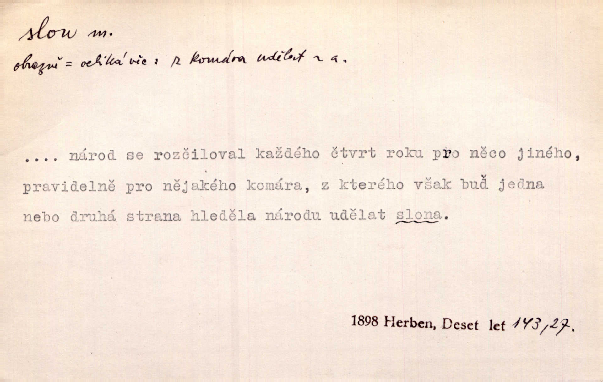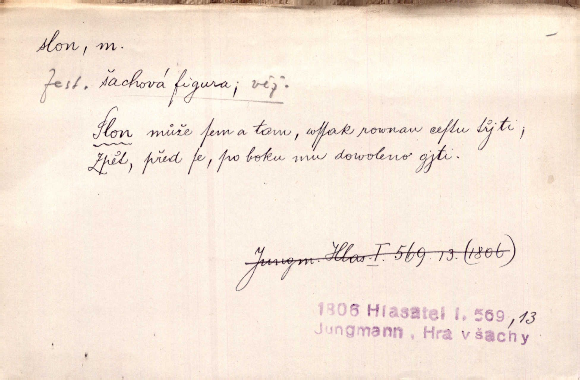 - slon, -a m. největší suchozemský ssavec, s mocným chobotem. I viděl jsem [v zoologické zahradě] koupat se slony. K. Čap. Celou těžkou truhlu položil si na záda a dupaje jako slon odnášel ji na saně. Rais. Tak tlustou kůži má jako slon. Ner. A vyhráť ne a ne [lutrista], leda nějaké to ambo nebo extráto, ale to bylo jako moucha pro slona pramálo. Rais. Zool. slon africký druh ssavců z podřádu Proboscidea, Loxodonta africana; sloni indičtí rod ssavců z čeledi Proboscidea, Elephas. D Expr. člověk ve společnosti neohrabaný. Markétka vykládá, co jí kdo řekl, který z těch mladých slonů jí přišlápl střevíc. Řezáč. D Expr. třetí osoba doprovázející dvojici (milenců); nevítaný společník vůbec. Tak tedy ti dva mládenci chodili do zámku za pannami Šimákovými a mladý poeta Bělohrobský dělal jim jaksi slona. J. Kvap. Můžete mi zase přijít, abych vám dělal slona na nějakém výletě. Schein. D Vulg. nadávka. Co chceš, slone, pár do nosu? Haš. „Teď pobídni, ty jeden slone!“ zvolal na Ondru. Klost.