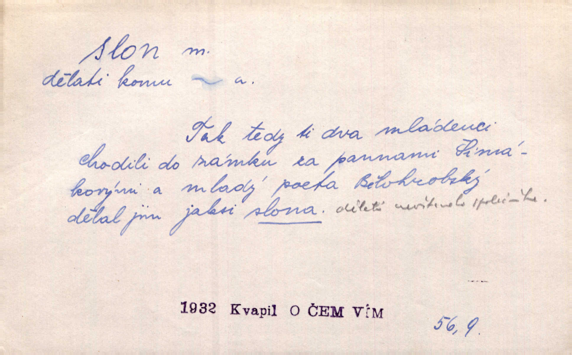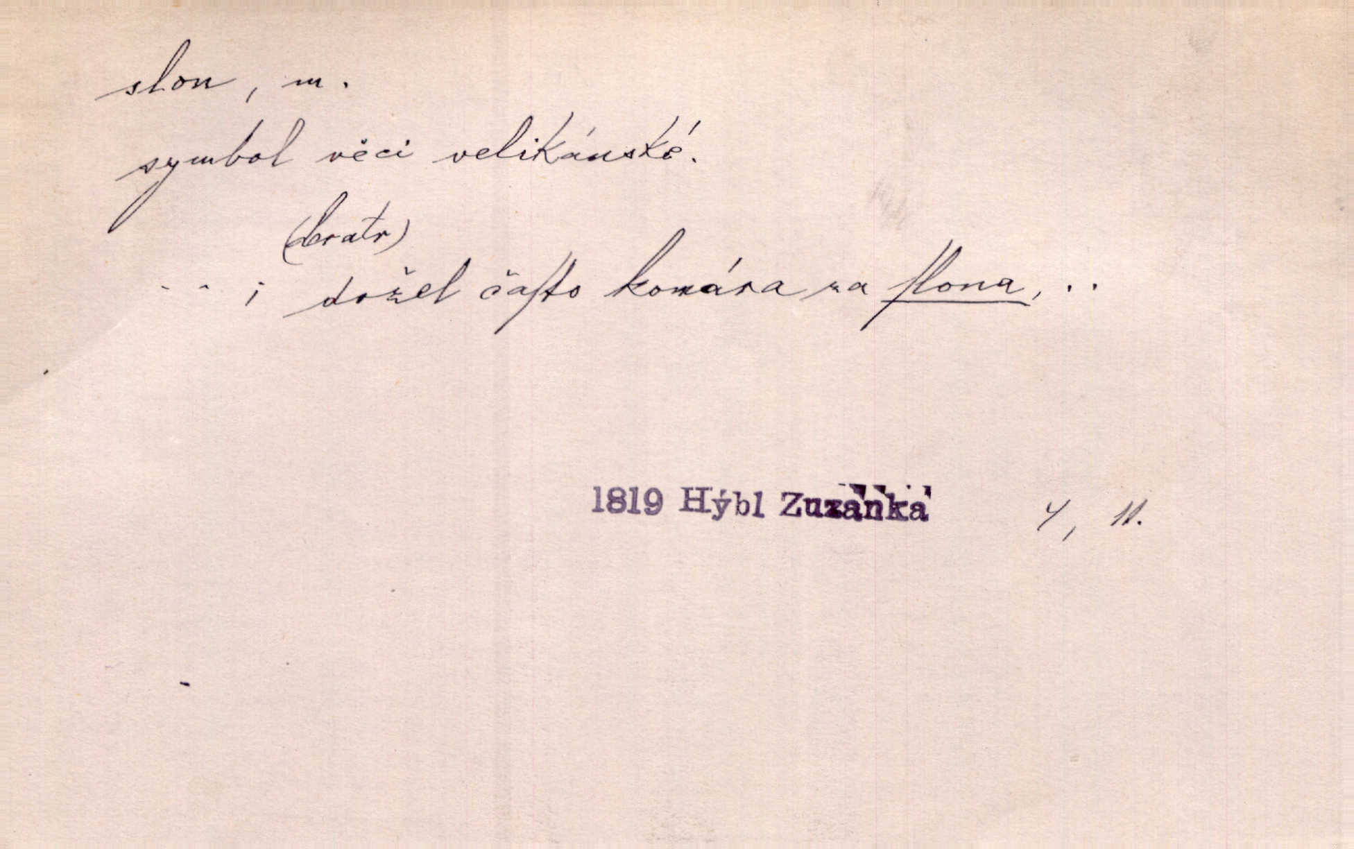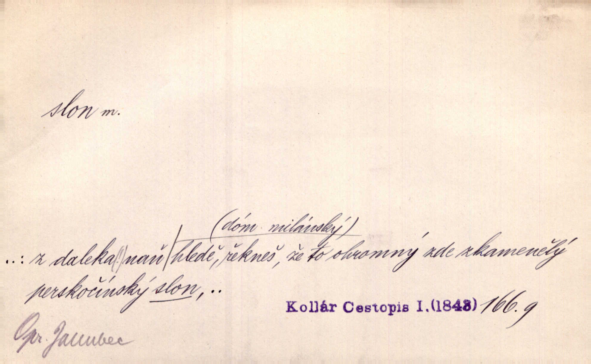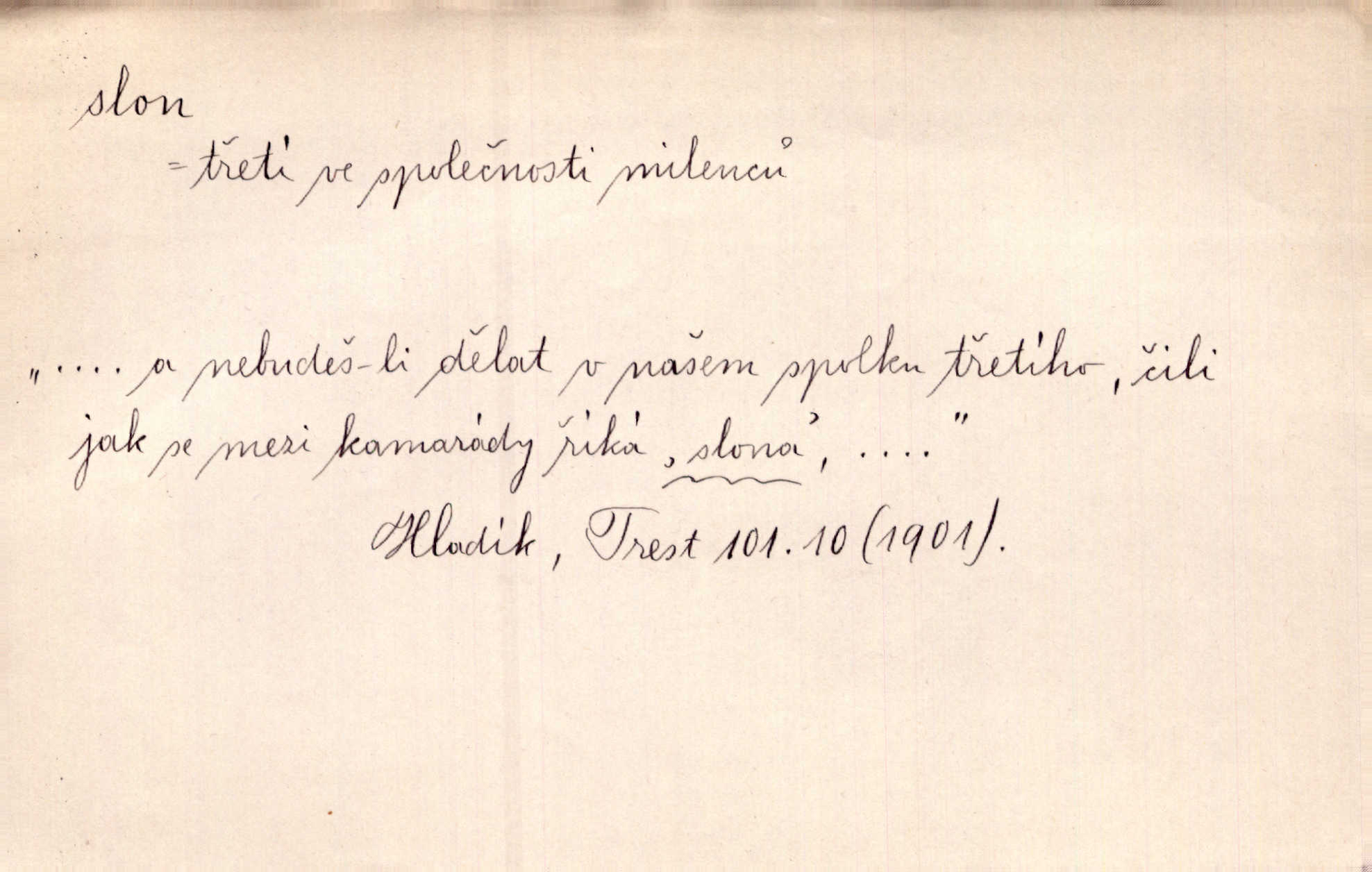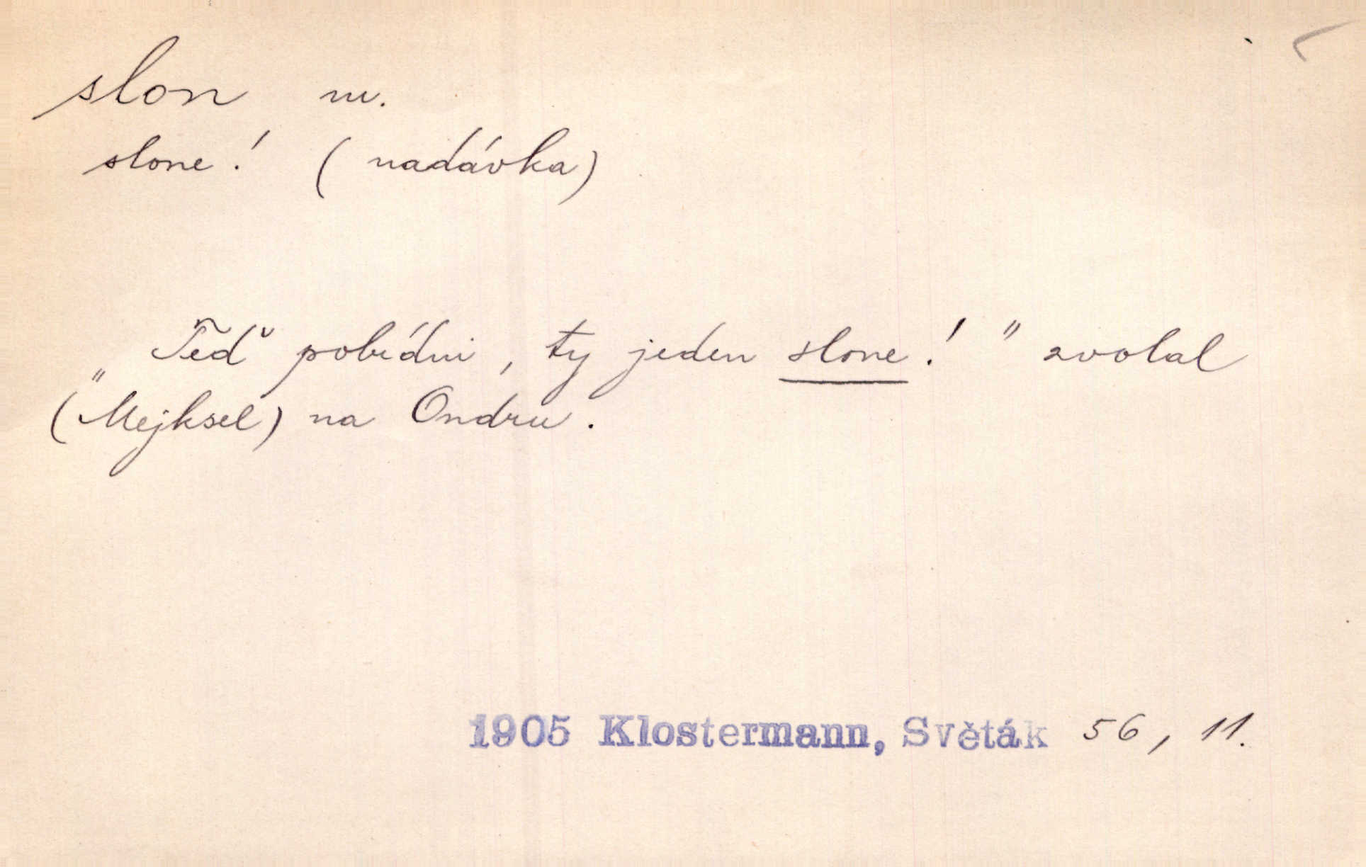 - slon, -a m. největší suchozemský ssavec, s mocným chobotem. I viděl jsem [v zoologické zahradě] koupat se slony. K. Čap. Celou těžkou truhlu položil si na záda a dupaje jako slon odnášel ji na saně. Rais. Tak tlustou kůži má jako slon. Ner. A vyhráť ne a ne [lutrista], leda nějaké to ambo nebo extráto, ale to bylo jako moucha pro slona pramálo. Rais. Zool. slon africký druh ssavců z podřádu Proboscidea, Loxodonta africana; sloni indičtí rod ssavců z čeledi Proboscidea, Elephas. D Expr. člověk ve společnosti neohrabaný. Markétka vykládá, co jí kdo řekl, který z těch mladých slonů jí přišlápl střevíc. Řezáč. D Expr. třetí osoba doprovázející dvojici (milenců); nevítaný společník vůbec. Tak tedy ti dva mládenci chodili do zámku za pannami Šimákovými a mladý poeta Bělohrobský dělal jim jaksi slona. J. Kvap. Můžete mi zase přijít, abych vám dělal slona na nějakém výletě. Schein. D Vulg. nadávka. Co chceš, slone, pár do nosu? Haš. „Teď pobídni, ty jeden slone!“ zvolal na Ondru. Klost.