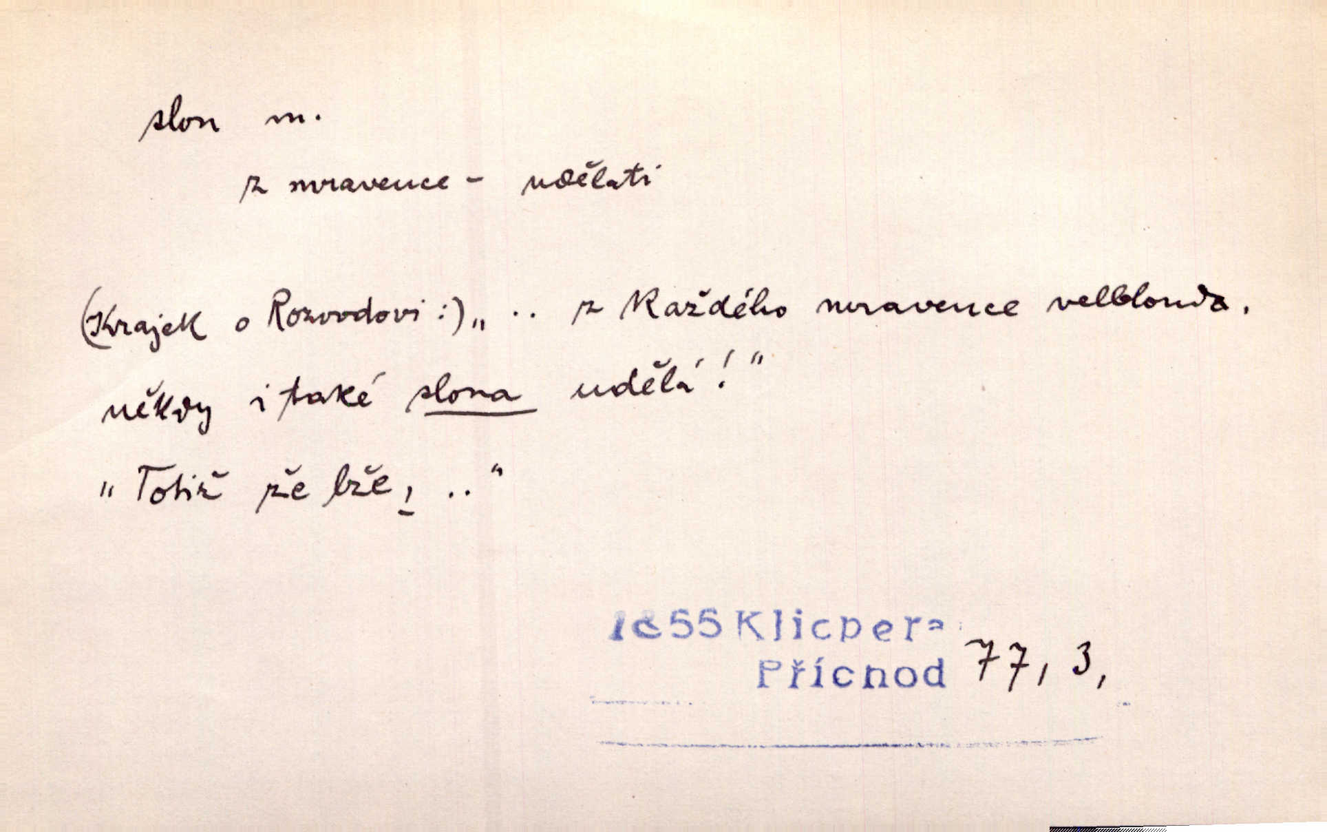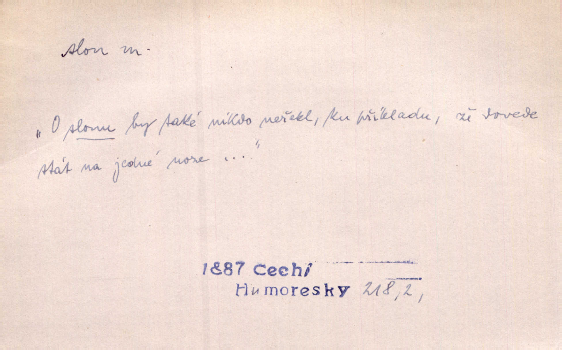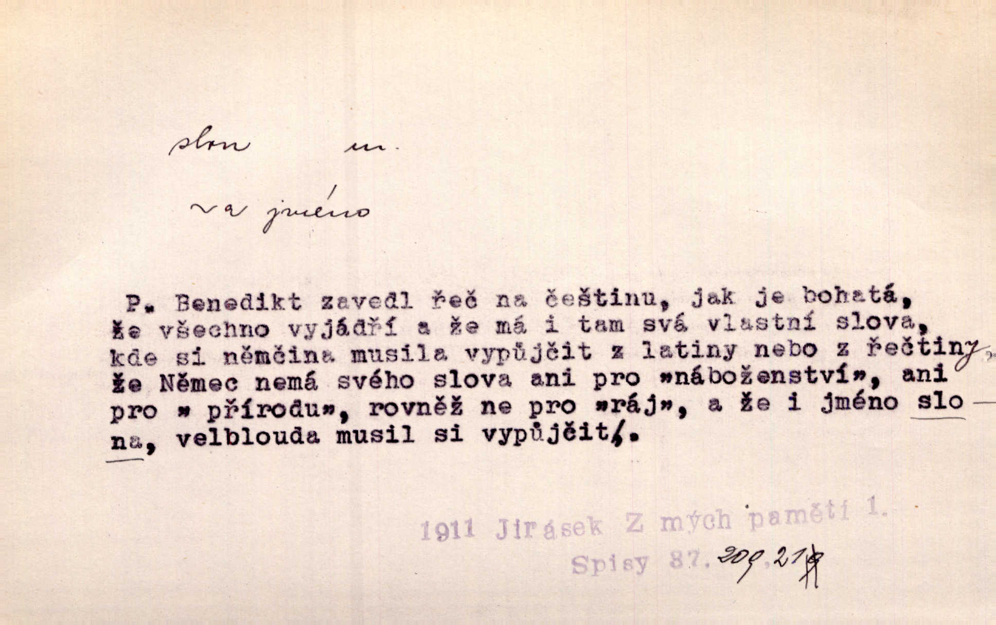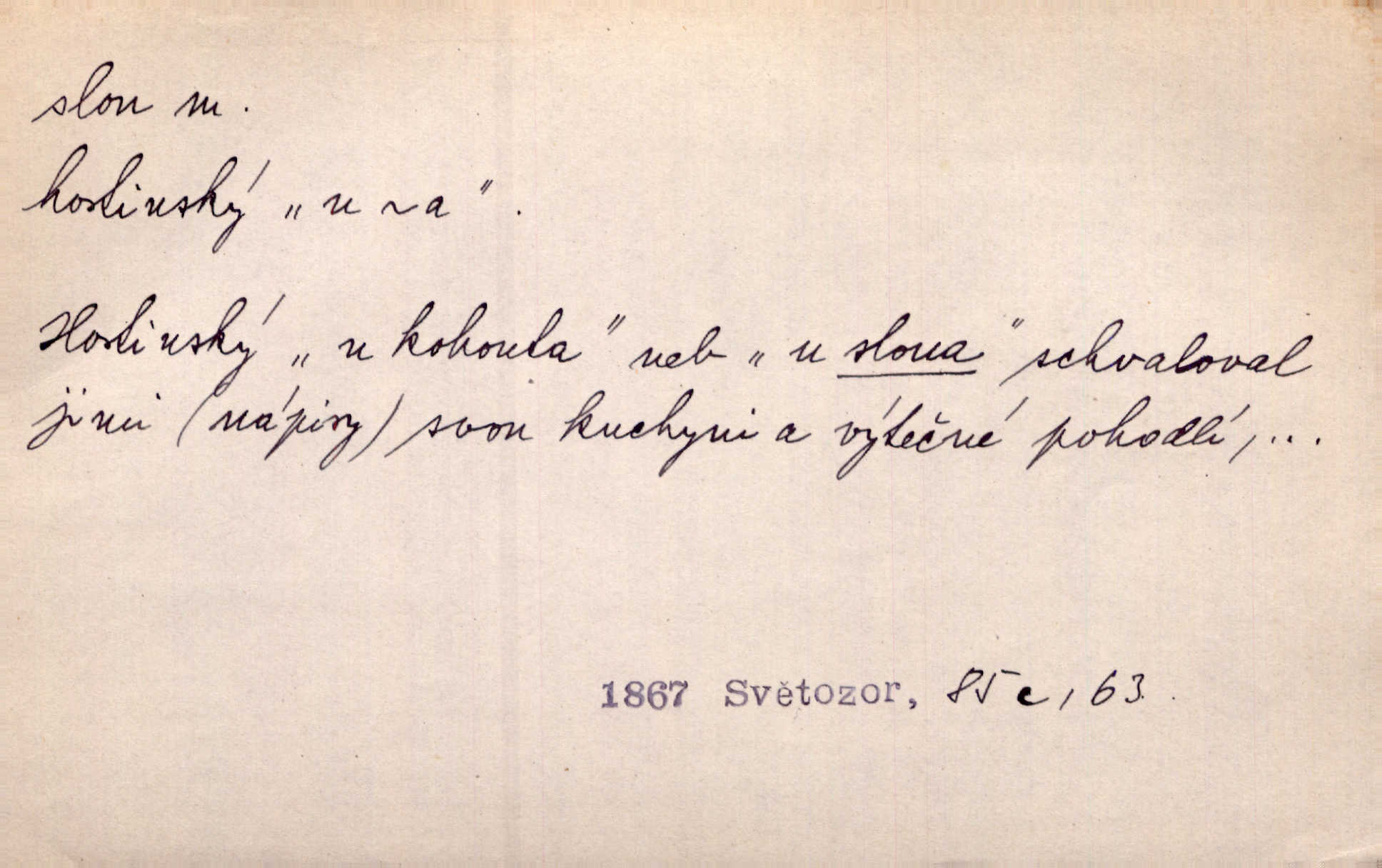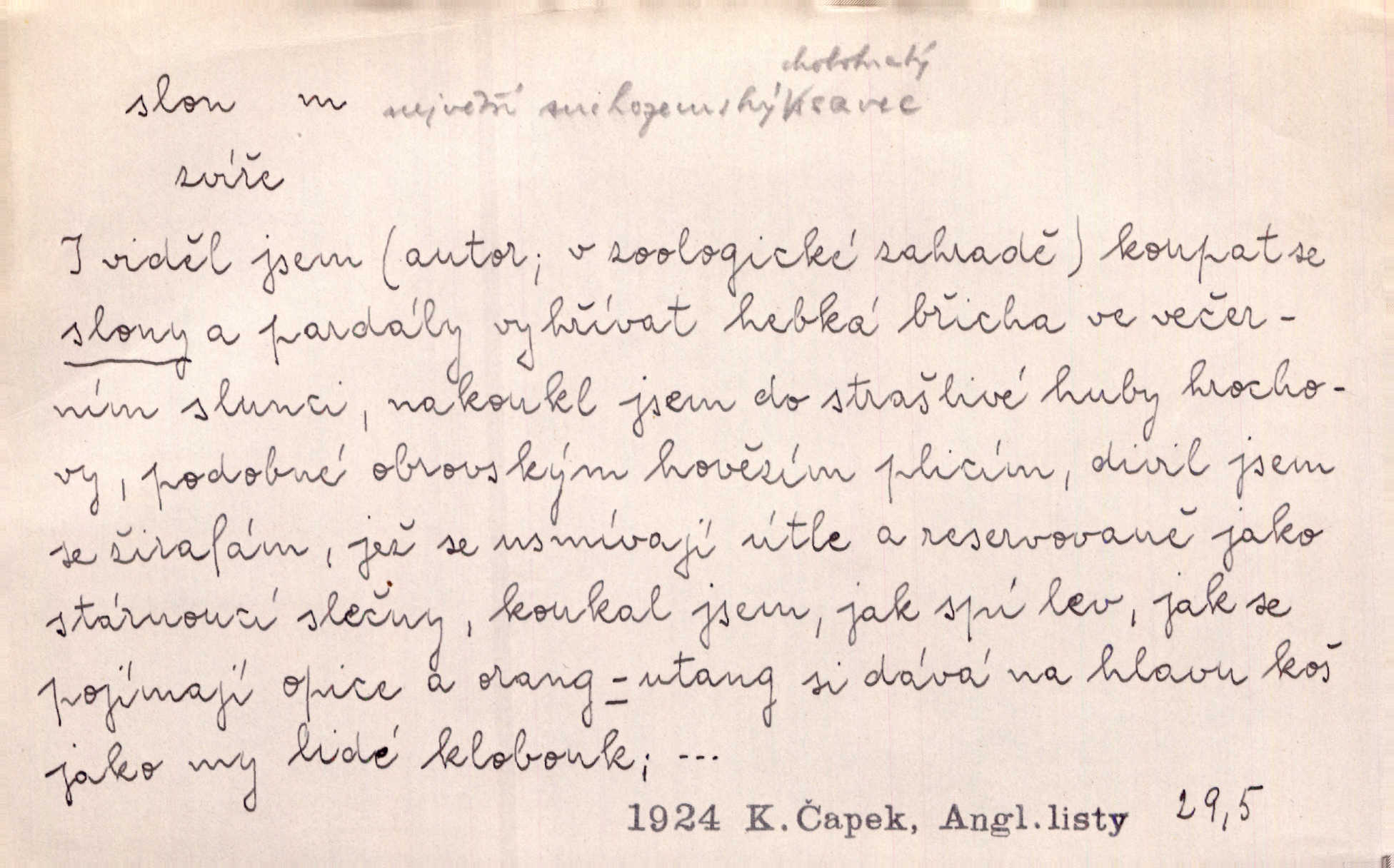 - slon, -a m. největší suchozemský ssavec, s mocným chobotem. I viděl jsem [v zoologické zahradě] koupat se slony. K. Čap. Celou těžkou truhlu položil si na záda a dupaje jako slon odnášel ji na saně. Rais. Tak tlustou kůži má jako slon. Ner. A vyhráť ne a ne [lutrista], leda nějaké to ambo nebo extráto, ale to bylo jako moucha pro slona pramálo. Rais. Zool. slon africký druh ssavců z podřádu Proboscidea, Loxodonta africana; sloni indičtí rod ssavců z čeledi Proboscidea, Elephas. D Expr. člověk ve společnosti neohrabaný. Markétka vykládá, co jí kdo řekl, který z těch mladých slonů jí přišlápl střevíc. Řezáč. D Expr. třetí osoba doprovázející dvojici (milenců); nevítaný společník vůbec. Tak tedy ti dva mládenci chodili do zámku za pannami Šimákovými a mladý poeta Bělohrobský dělal jim jaksi slona. J. Kvap. Můžete mi zase přijít, abych vám dělal slona na nějakém výletě. Schein. D Vulg. nadávka. Co chceš, slone, pár do nosu? Haš. „Teď pobídni, ty jeden slone!“ zvolal na Ondru. Klost.