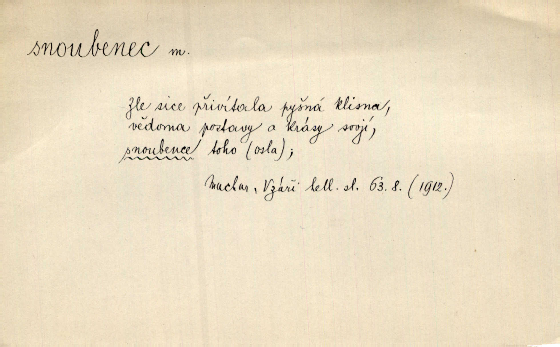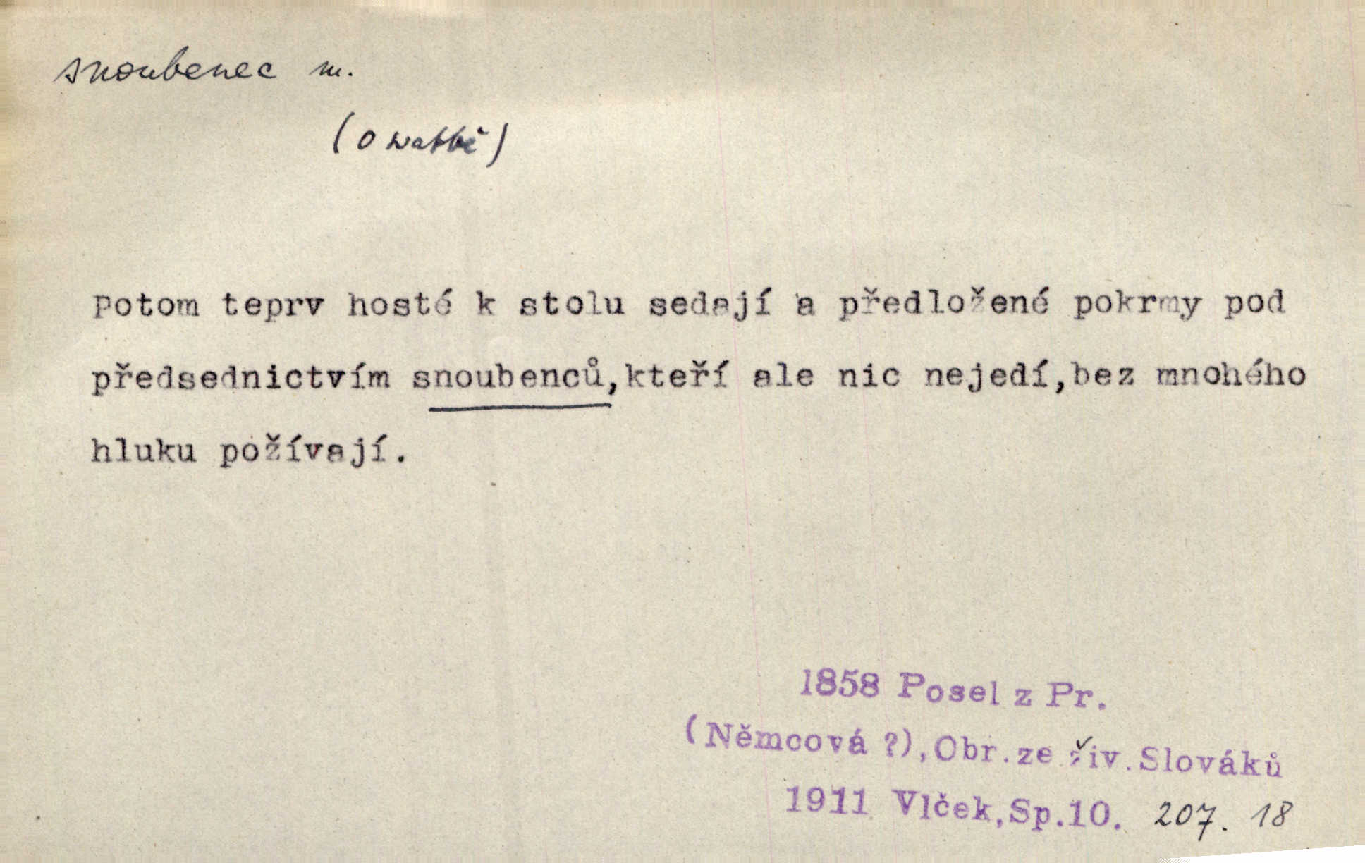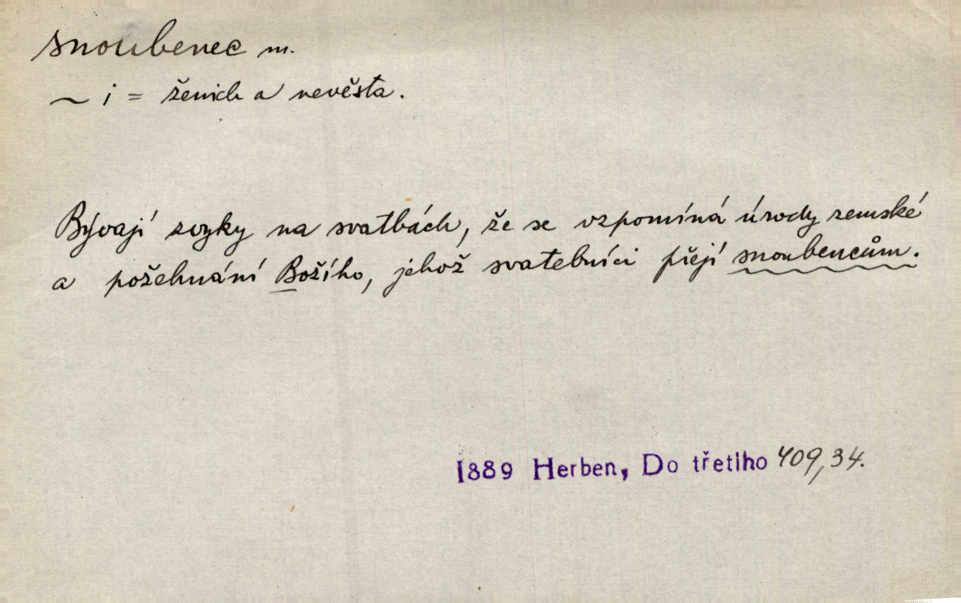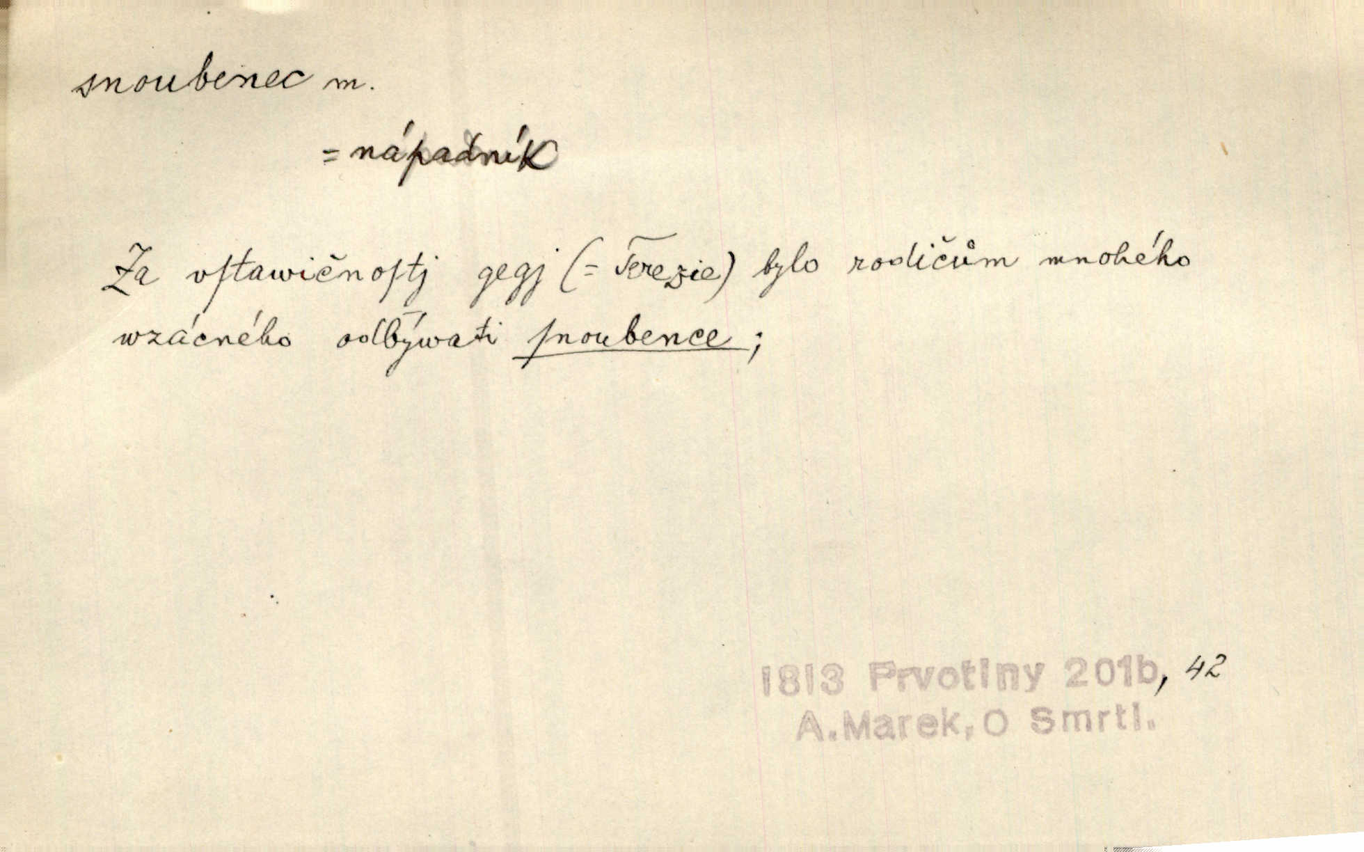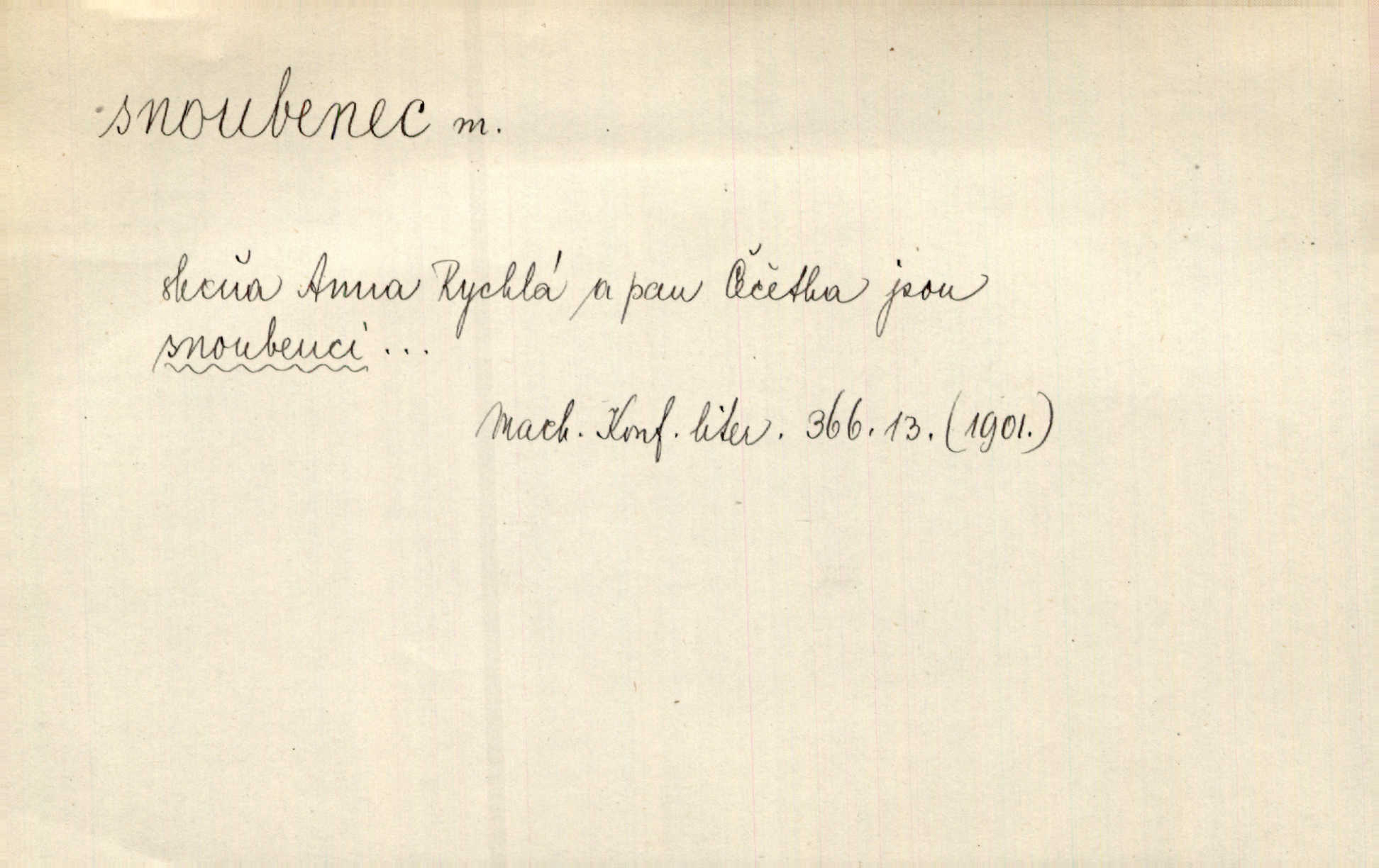 - snoubenec, -nce m. ten, kdo uzavřel úmluvu o zasnoubení; pl. snoubenci nastávající manželé, ženich a nevěsta. Po boku jedné z těchto dívek seděl mladý muž, který si počínal jako snoubenec její. Čech. Slečna Anna Rychlá a pan Čečetka jsou snoubenci. Mach. Bývají zvyky na svatbách, že se vzpomíná úrody zemské a požehnání Božího, jehož svatebníci přejí snoubencům. Herb. Přen. Zasvěcenec musí se vyvinouti z objetí přítomnosti a státi se „snoubencem“ tradice. Píša. Dnes slaví Tvoji [Máchovu] památku snoubenci ducha Tvého. Pfleg.