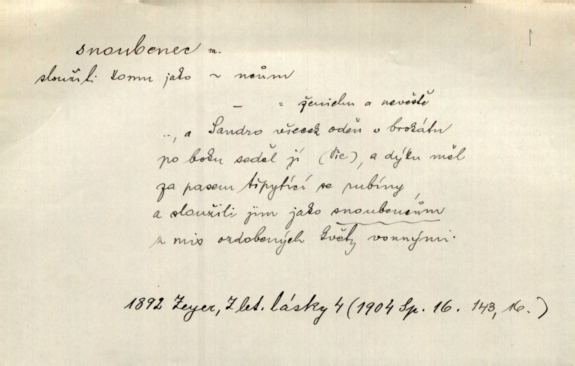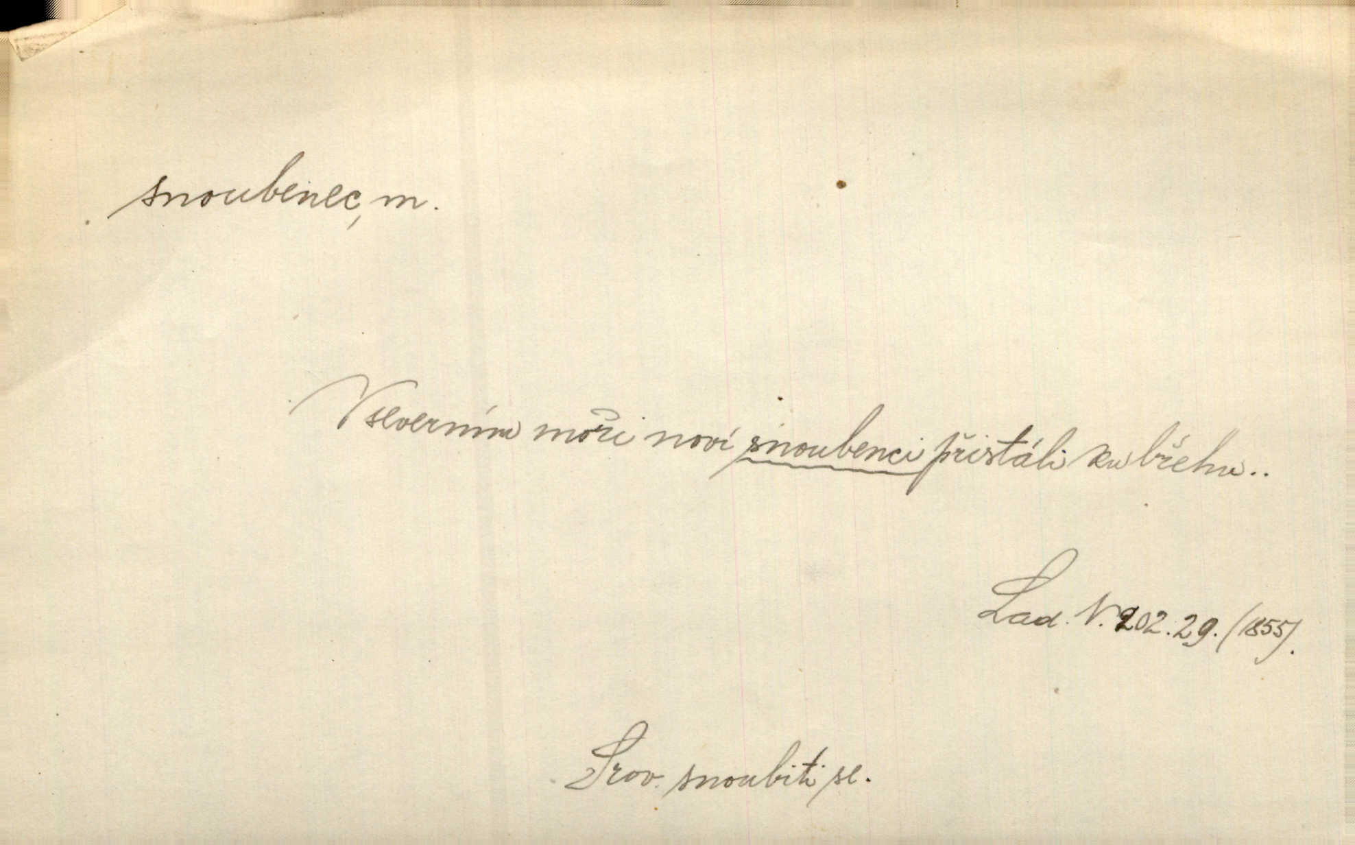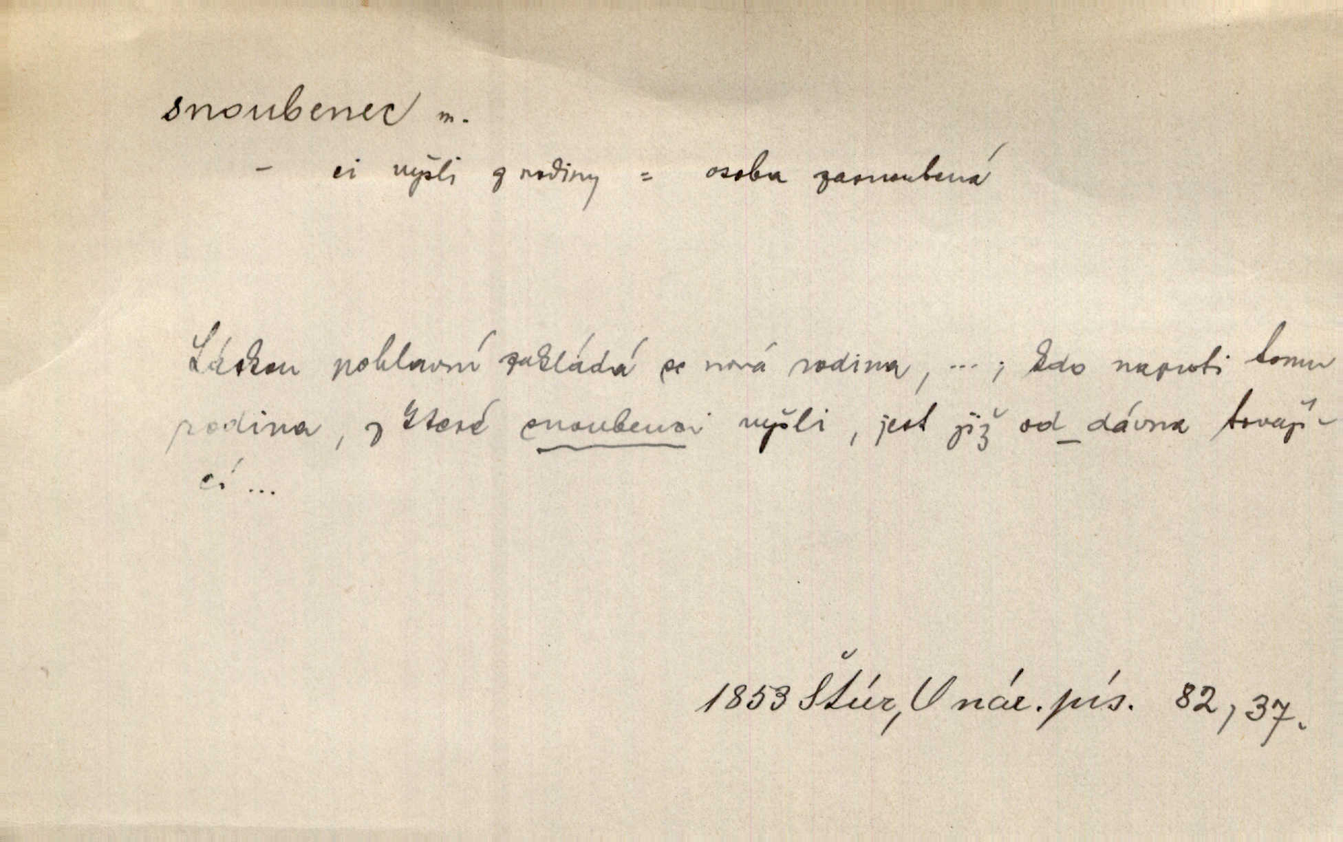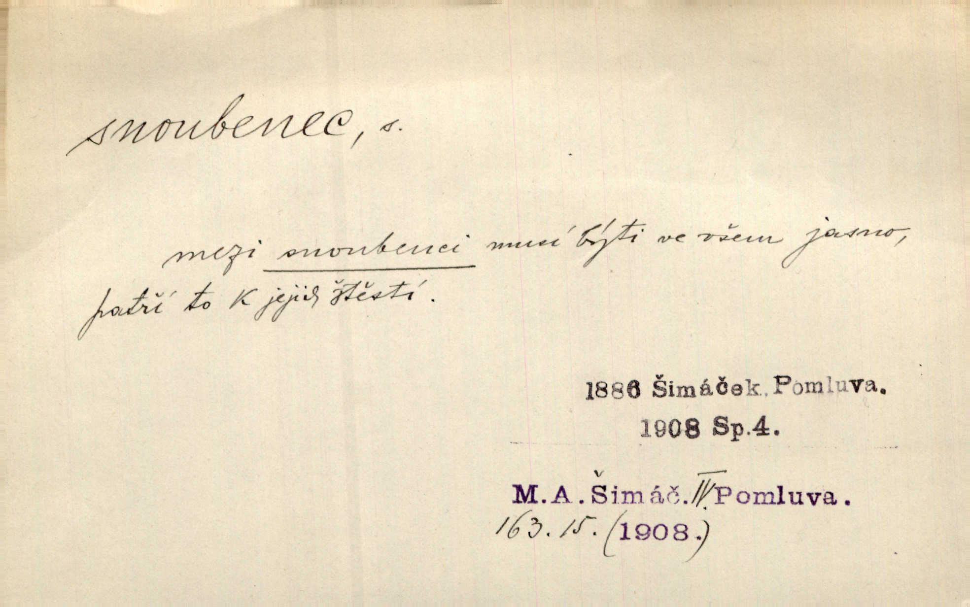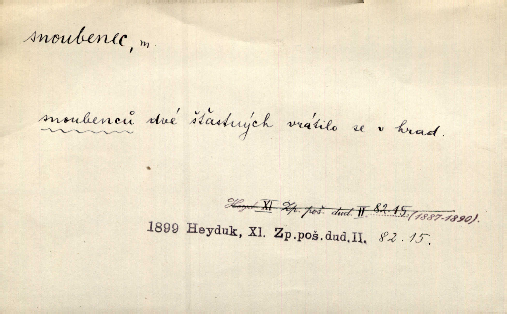 - snoubenec, -nce m. ten, kdo uzavřel úmluvu o zasnoubení; pl. snoubenci nastávající manželé, ženich a nevěsta. Po boku jedné z těchto dívek seděl mladý muž, který si počínal jako snoubenec její. Čech. Slečna Anna Rychlá a pan Čečetka jsou snoubenci. Mach. Bývají zvyky na svatbách, že se vzpomíná úrody zemské a požehnání Božího, jehož svatebníci přejí snoubencům. Herb. Přen. Zasvěcenec musí se vyvinouti z objetí přítomnosti a státi se „snoubencem“ tradice. Píša. Dnes slaví Tvoji [Máchovu] památku snoubenci ducha Tvého. Pfleg.