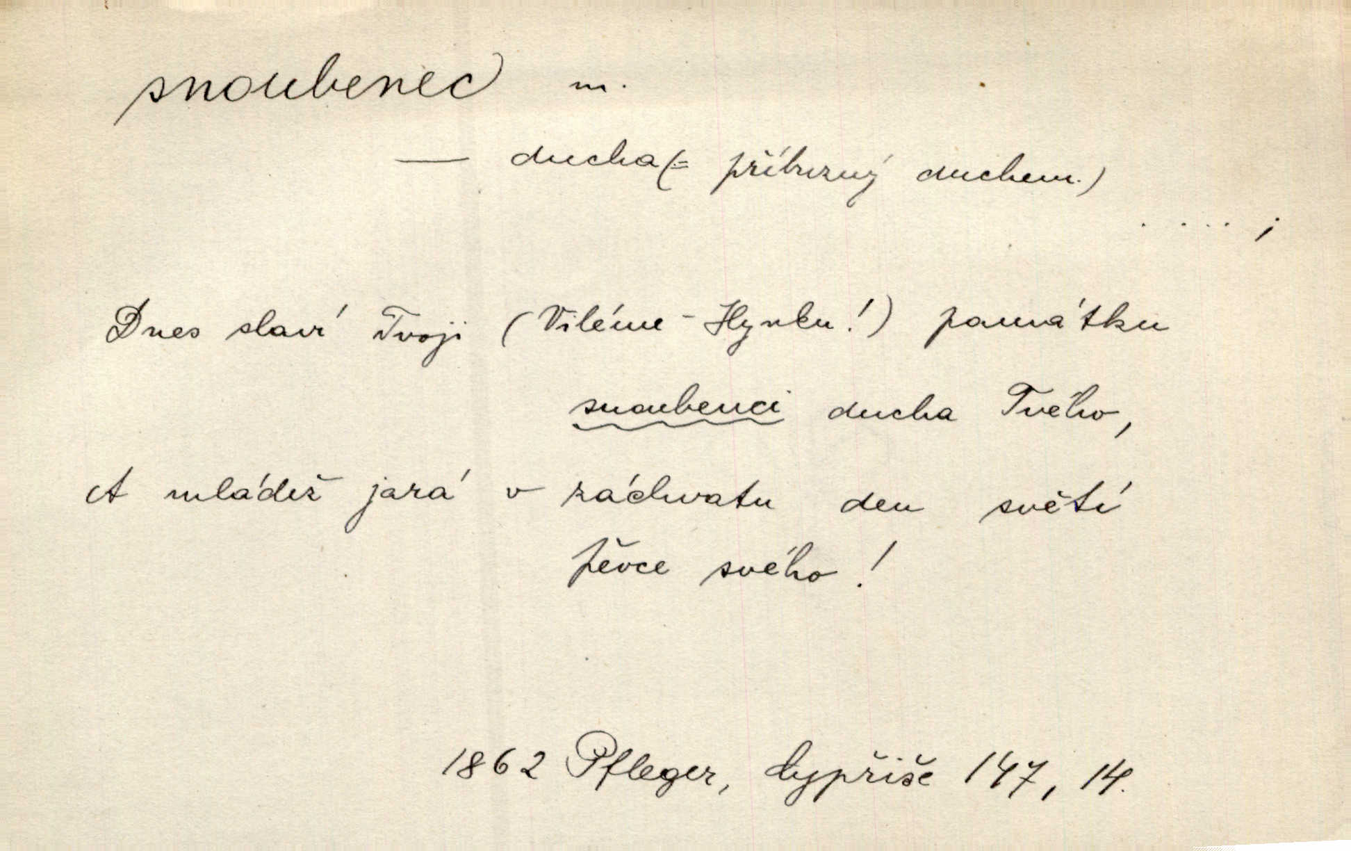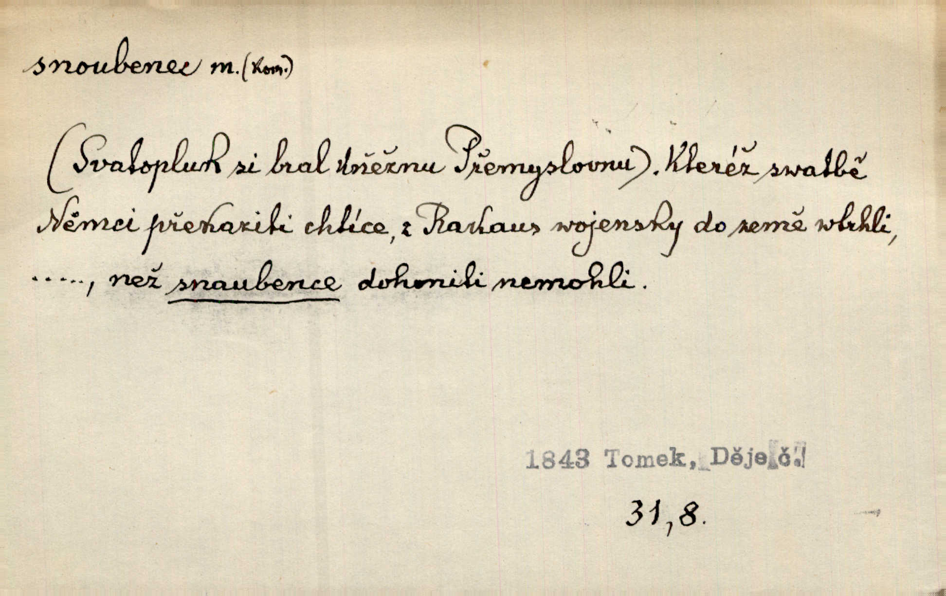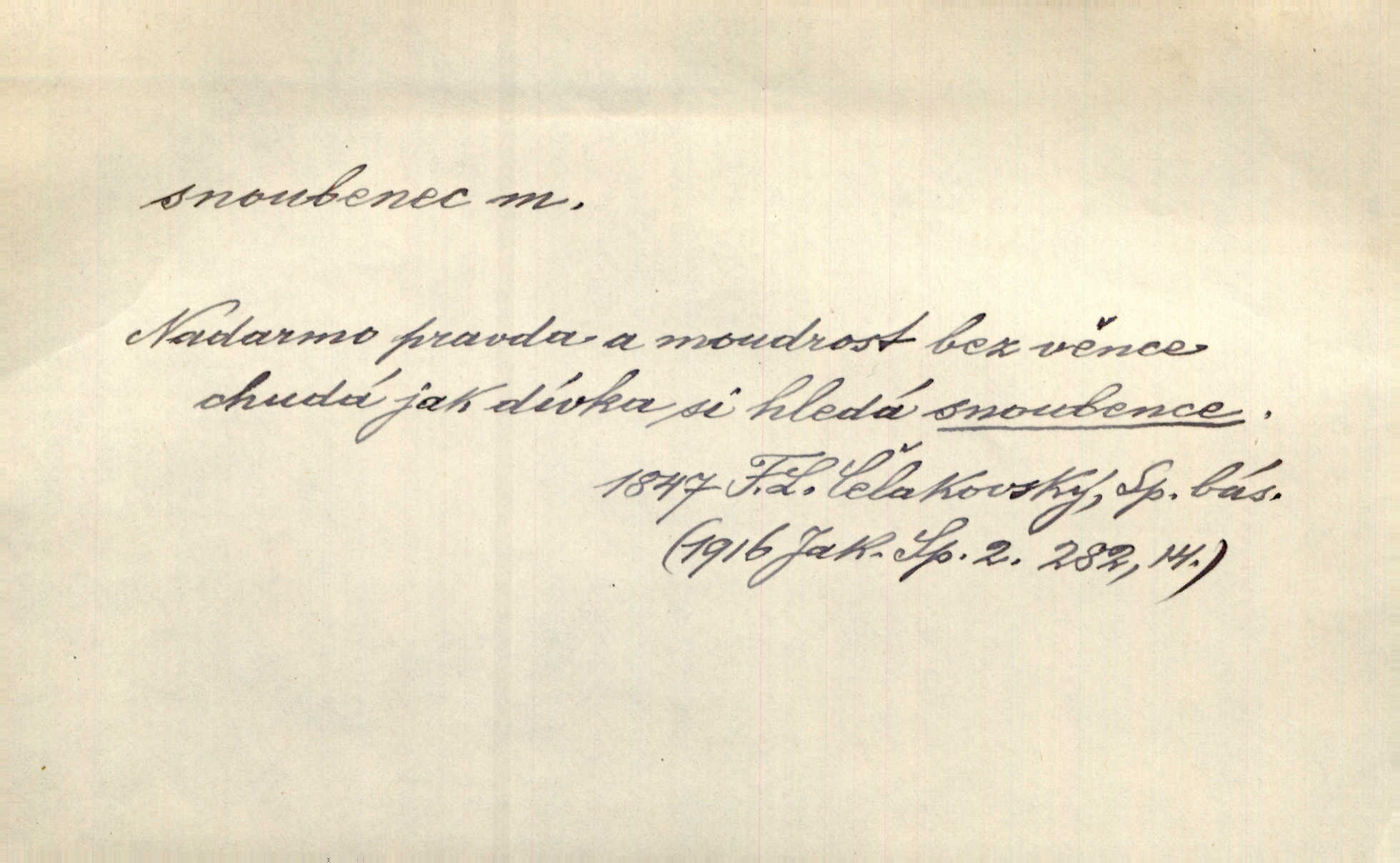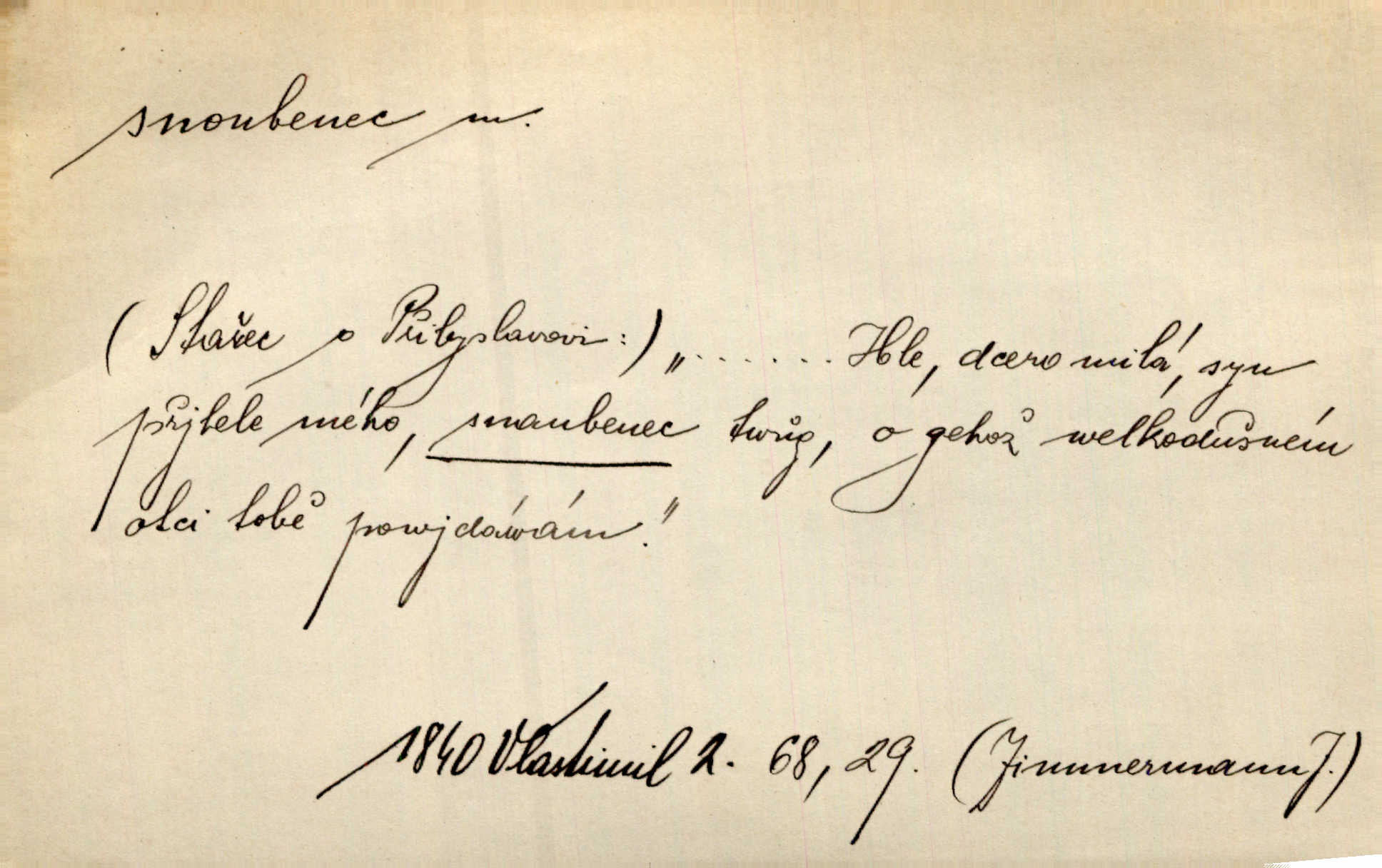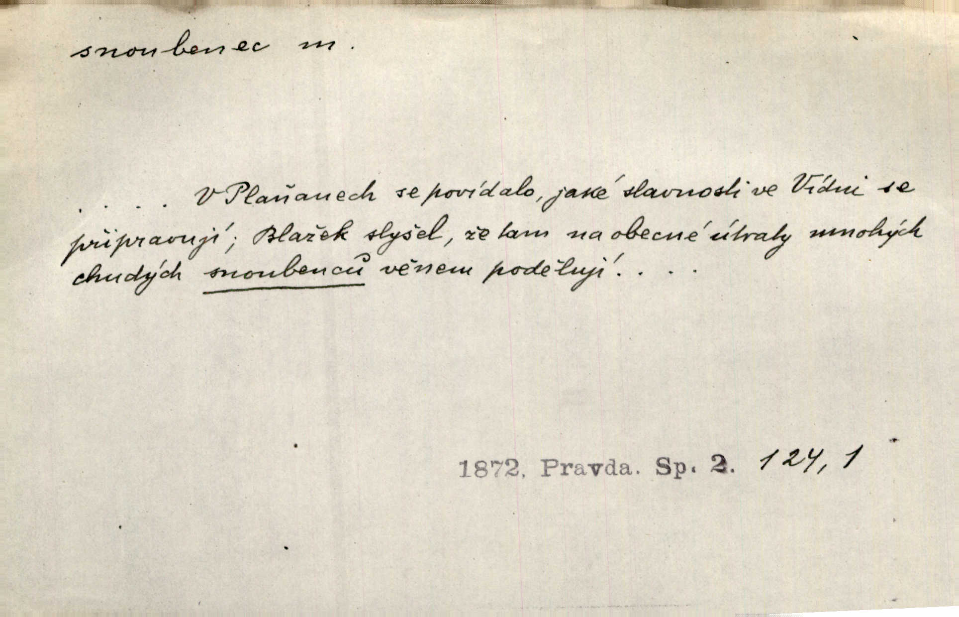 - snoubenec, -nce m. ten, kdo uzavřel úmluvu o zasnoubení; pl. snoubenci nastávající manželé, ženich a nevěsta. Po boku jedné z těchto dívek seděl mladý muž, který si počínal jako snoubenec její. Čech. Slečna Anna Rychlá a pan Čečetka jsou snoubenci. Mach. Bývají zvyky na svatbách, že se vzpomíná úrody zemské a požehnání Božího, jehož svatebníci přejí snoubencům. Herb. Přen. Zasvěcenec musí se vyvinouti z objetí přítomnosti a státi se „snoubencem“ tradice. Píša. Dnes slaví Tvoji [Máchovu] památku snoubenci ducha Tvého. Pfleg.