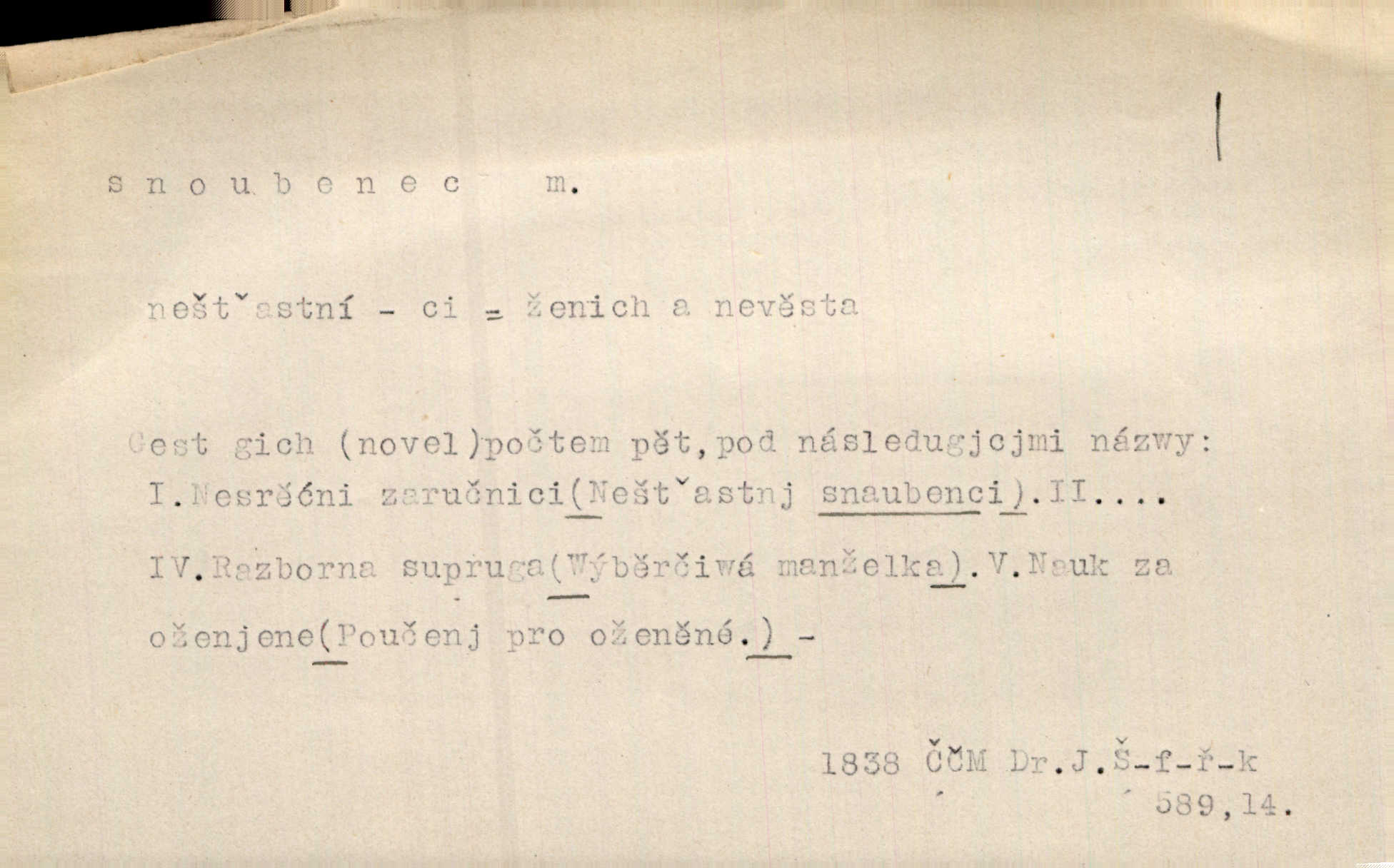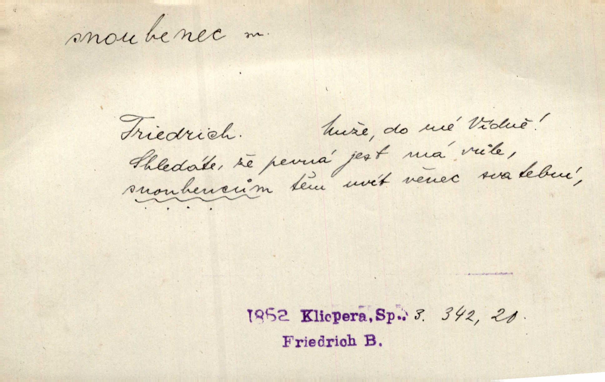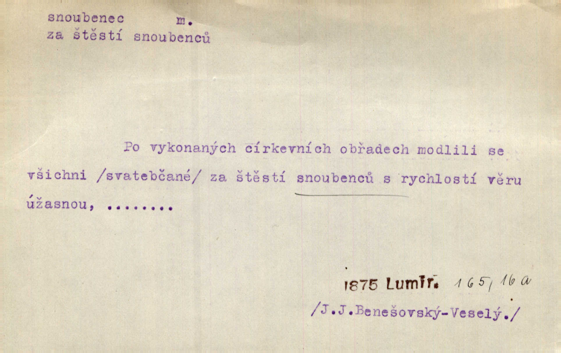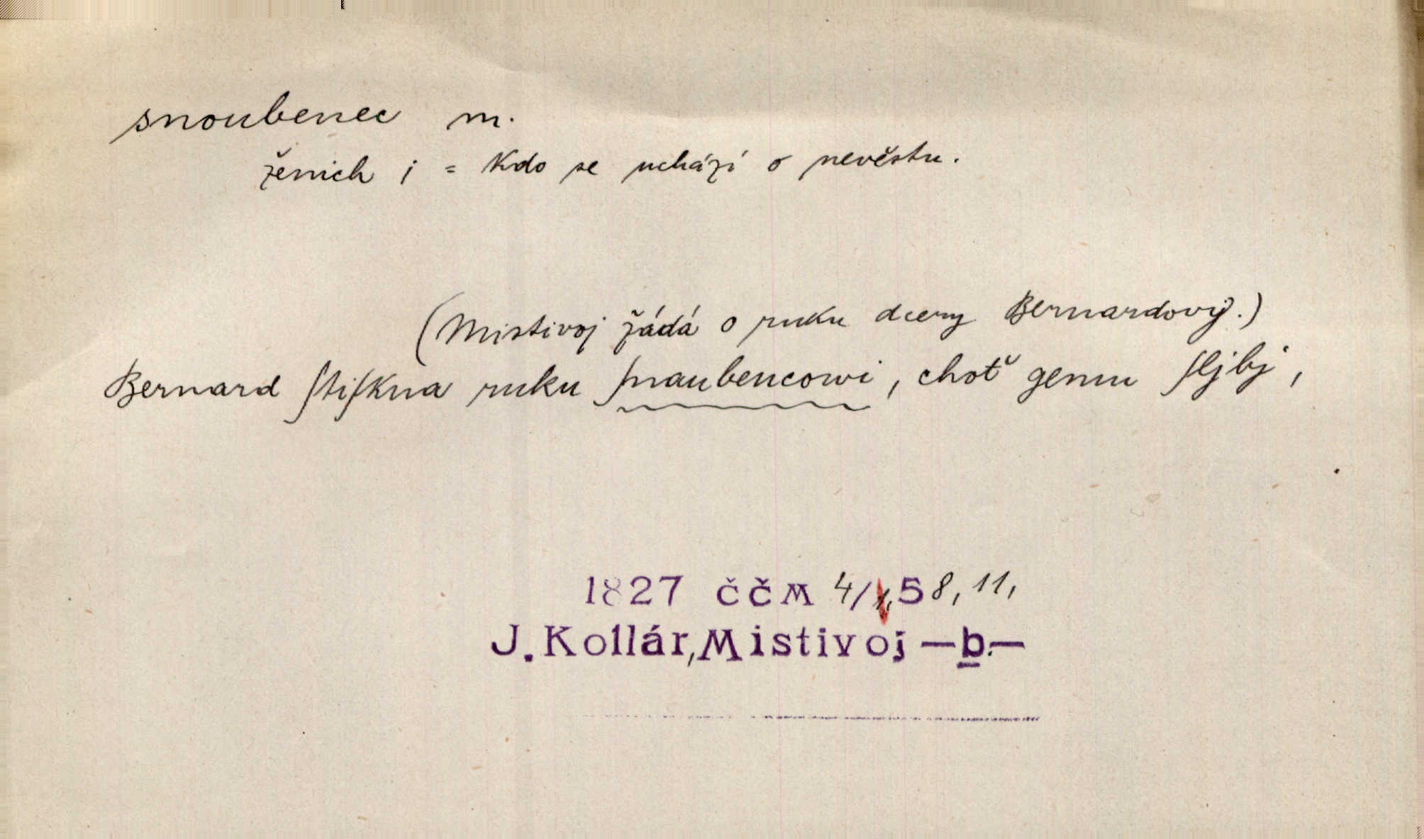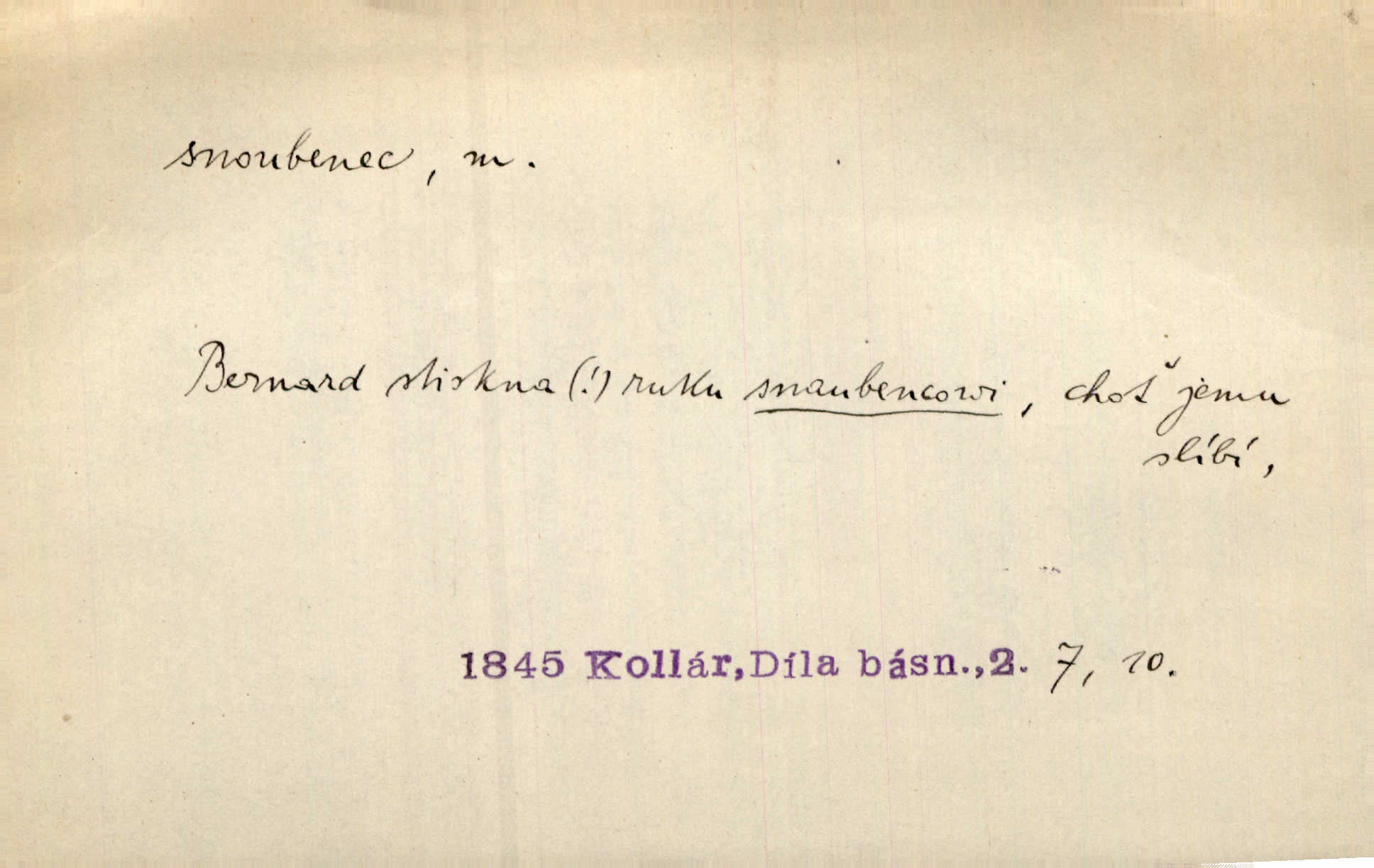 - snoubenec, -nce m. ten, kdo uzavřel úmluvu o zasnoubení; pl. snoubenci nastávající manželé, ženich a nevěsta. Po boku jedné z těchto dívek seděl mladý muž, který si počínal jako snoubenec její. Čech. Slečna Anna Rychlá a pan Čečetka jsou snoubenci. Mach. Bývají zvyky na svatbách, že se vzpomíná úrody zemské a požehnání Božího, jehož svatebníci přejí snoubencům. Herb. Přen. Zasvěcenec musí se vyvinouti z objetí přítomnosti a státi se „snoubencem“ tradice. Píša. Dnes slaví Tvoji [Máchovu] památku snoubenci ducha Tvého. Pfleg.