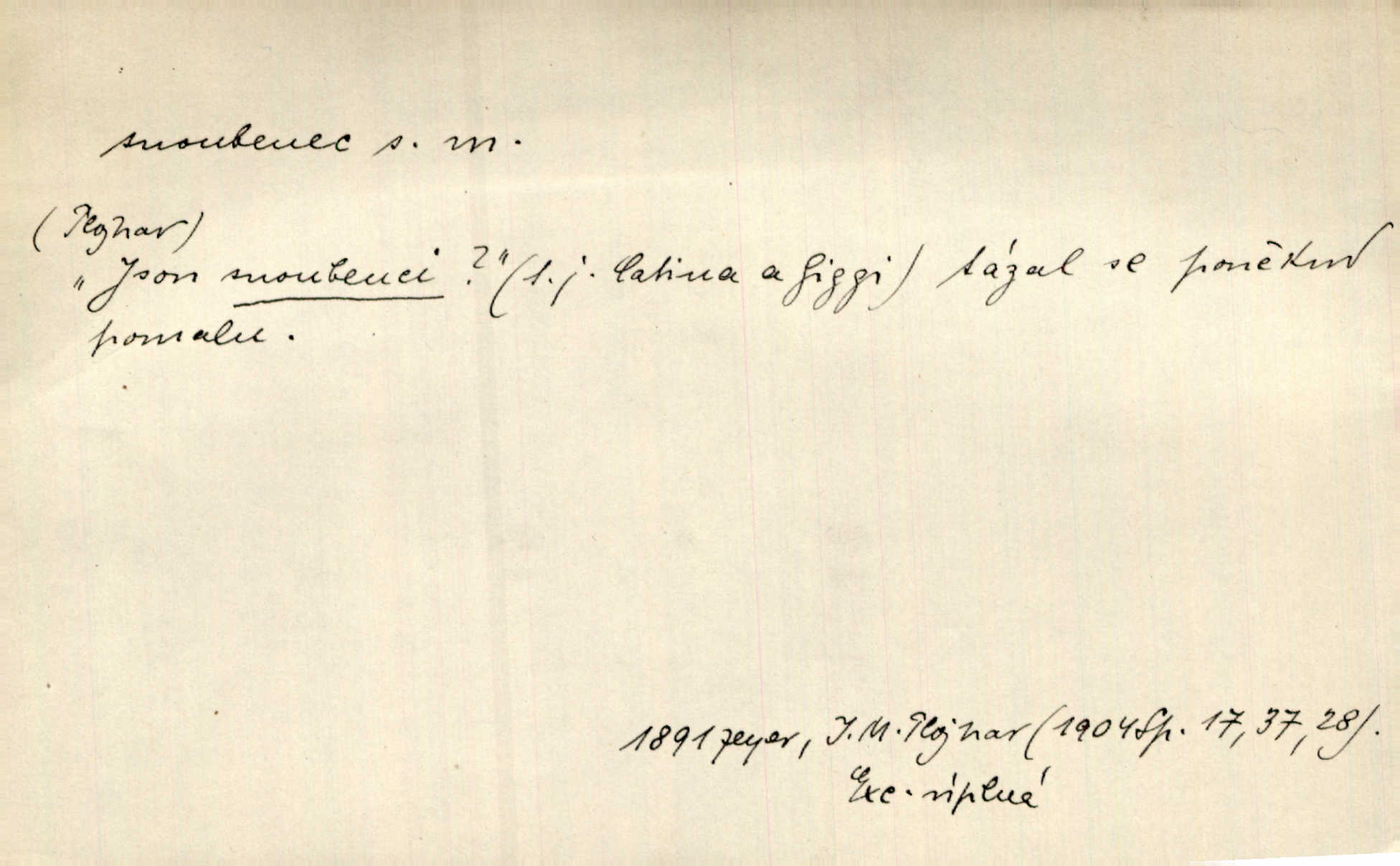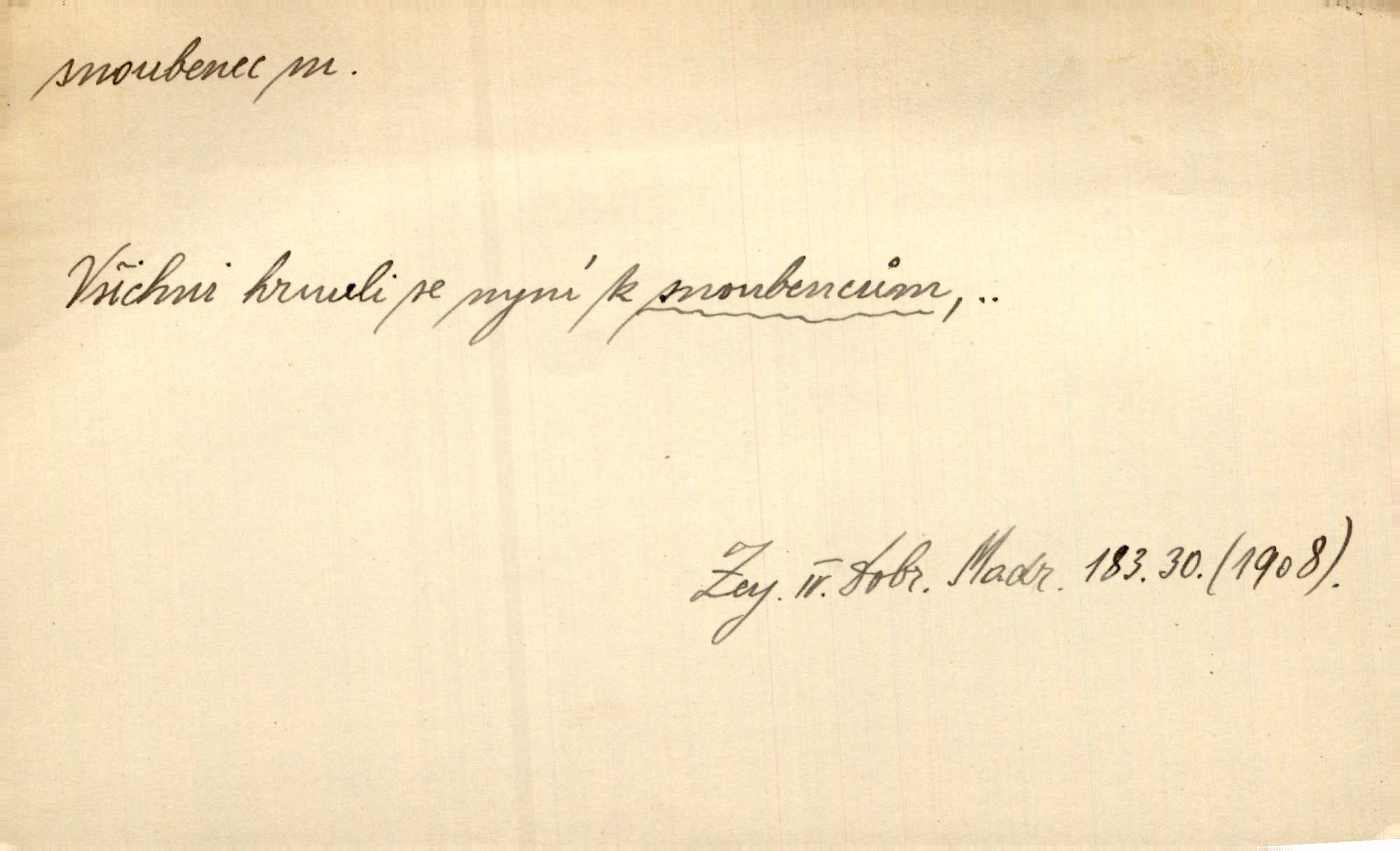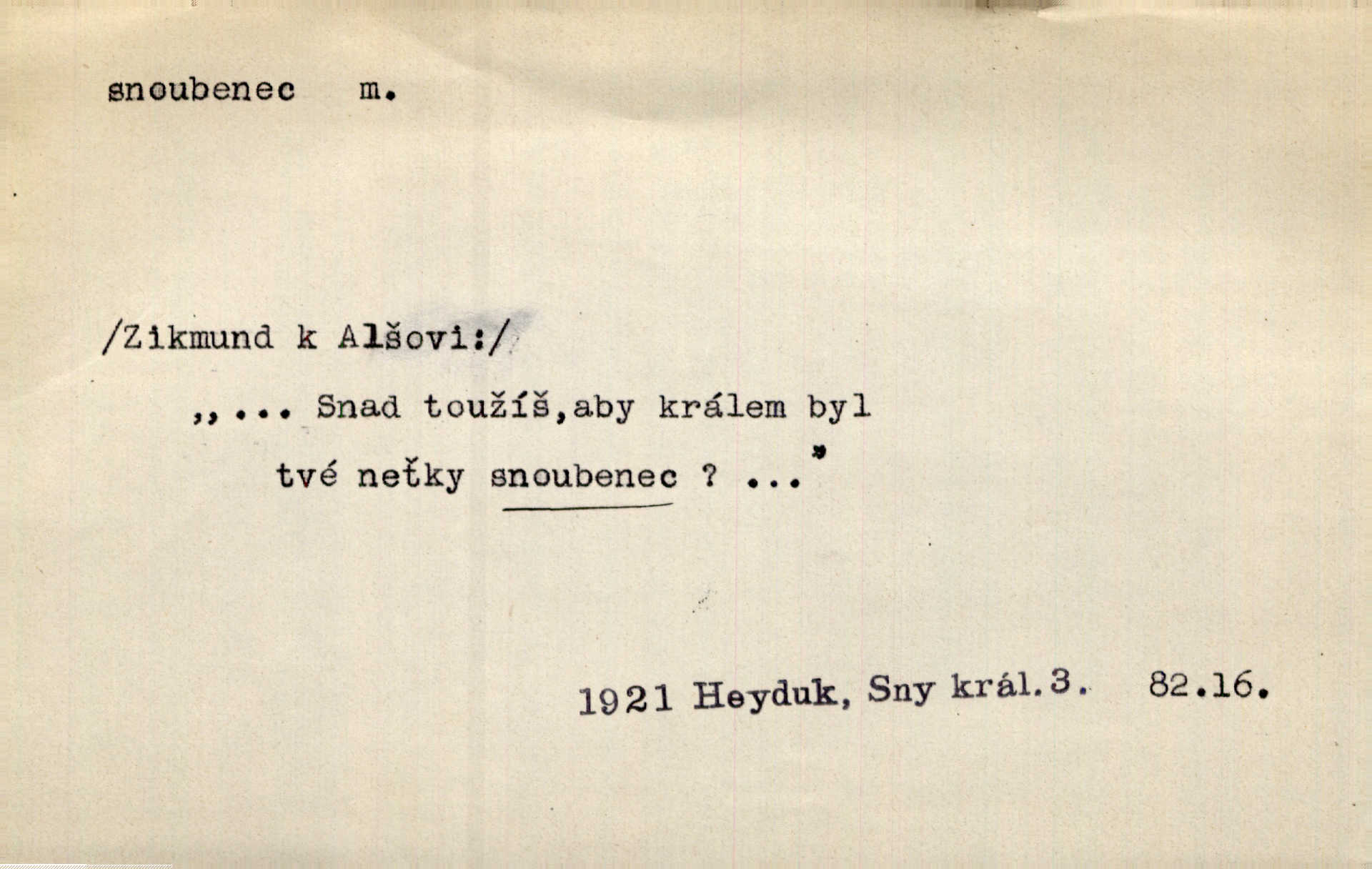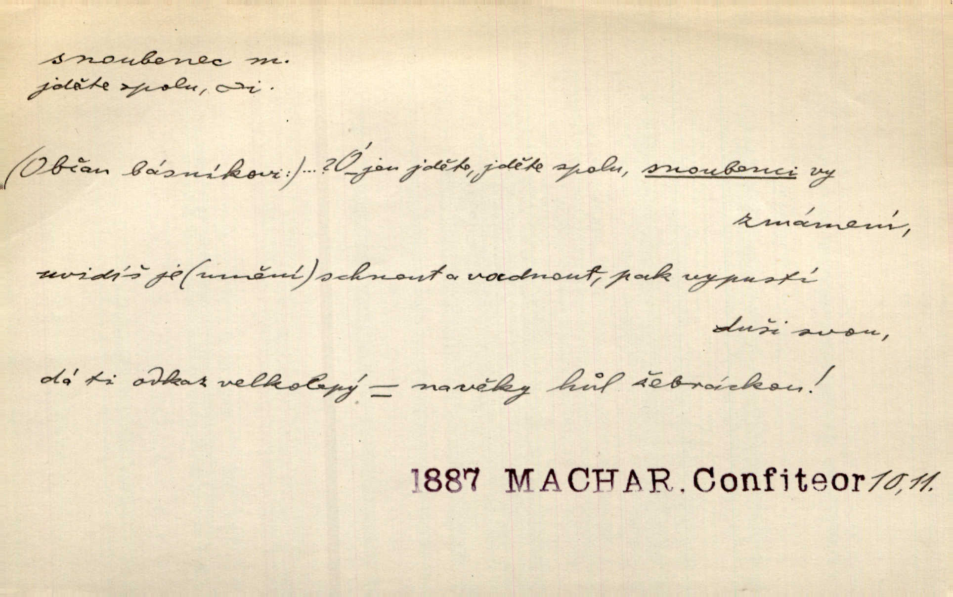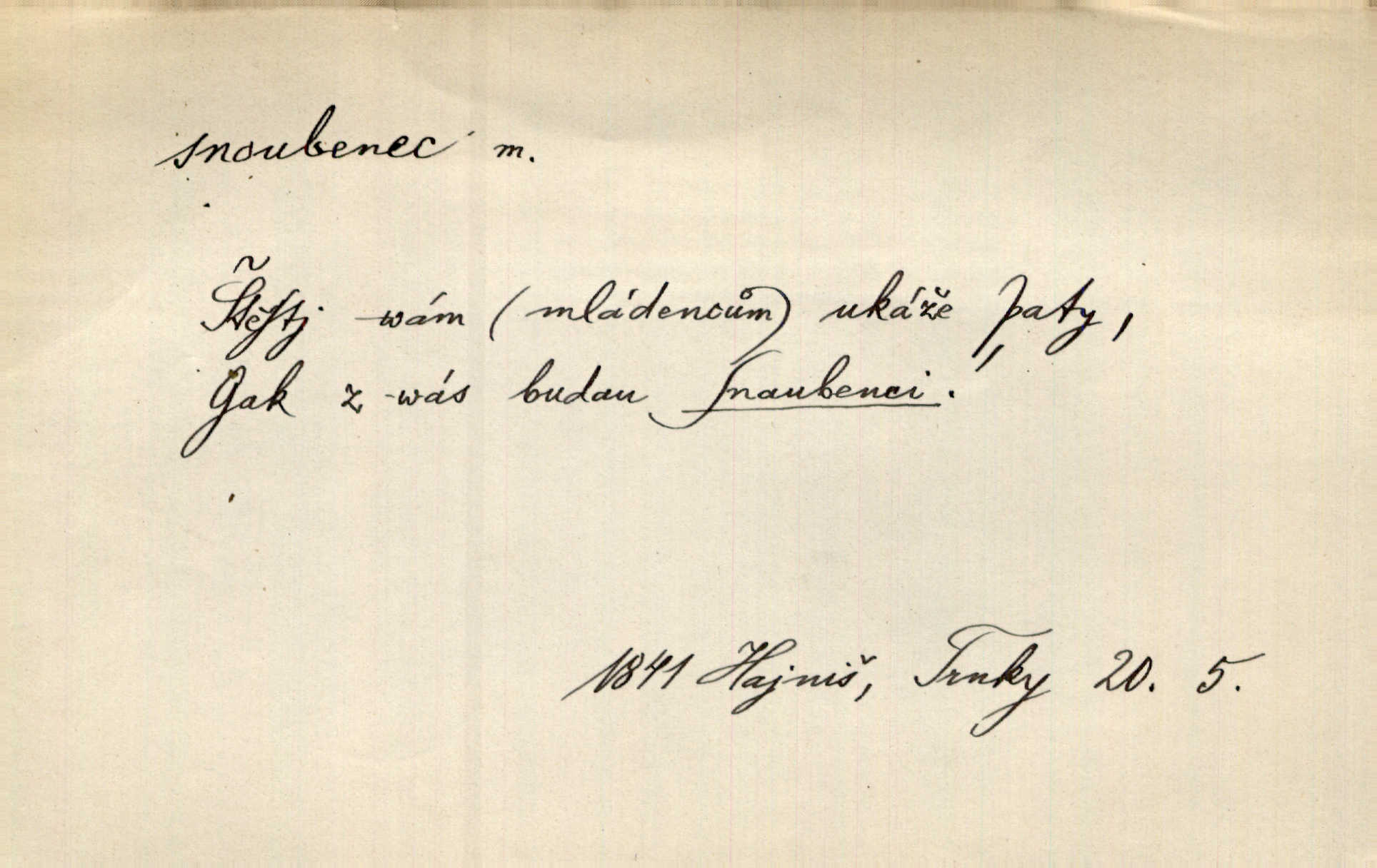 - snoubenec, -nce m. ten, kdo uzavřel úmluvu o zasnoubení; pl. snoubenci nastávající manželé, ženich a nevěsta. Po boku jedné z těchto dívek seděl mladý muž, který si počínal jako snoubenec její. Čech. Slečna Anna Rychlá a pan Čečetka jsou snoubenci. Mach. Bývají zvyky na svatbách, že se vzpomíná úrody zemské a požehnání Božího, jehož svatebníci přejí snoubencům. Herb. Přen. Zasvěcenec musí se vyvinouti z objetí přítomnosti a státi se „snoubencem“ tradice. Píša. Dnes slaví Tvoji [Máchovu] památku snoubenci ducha Tvého. Pfleg.