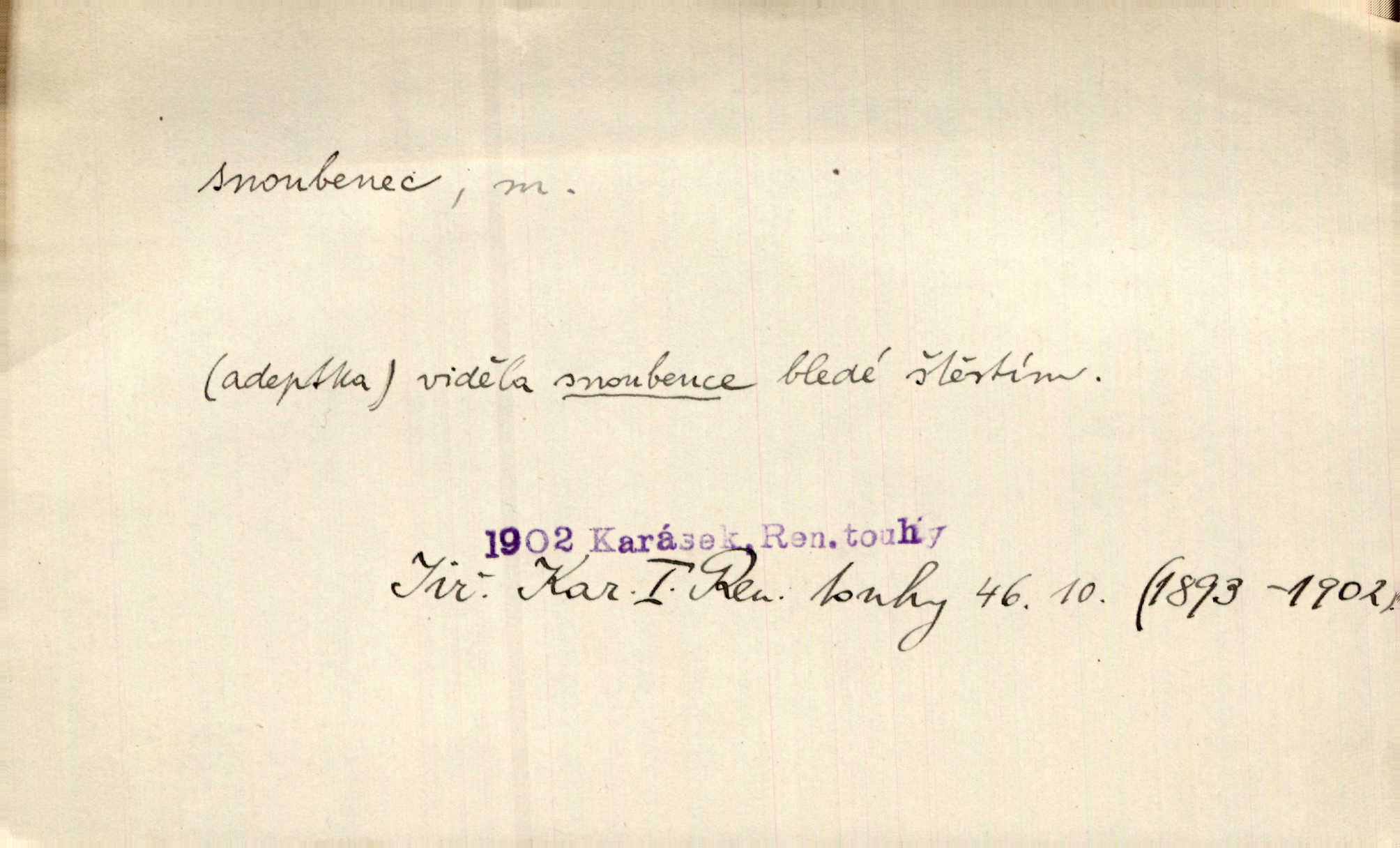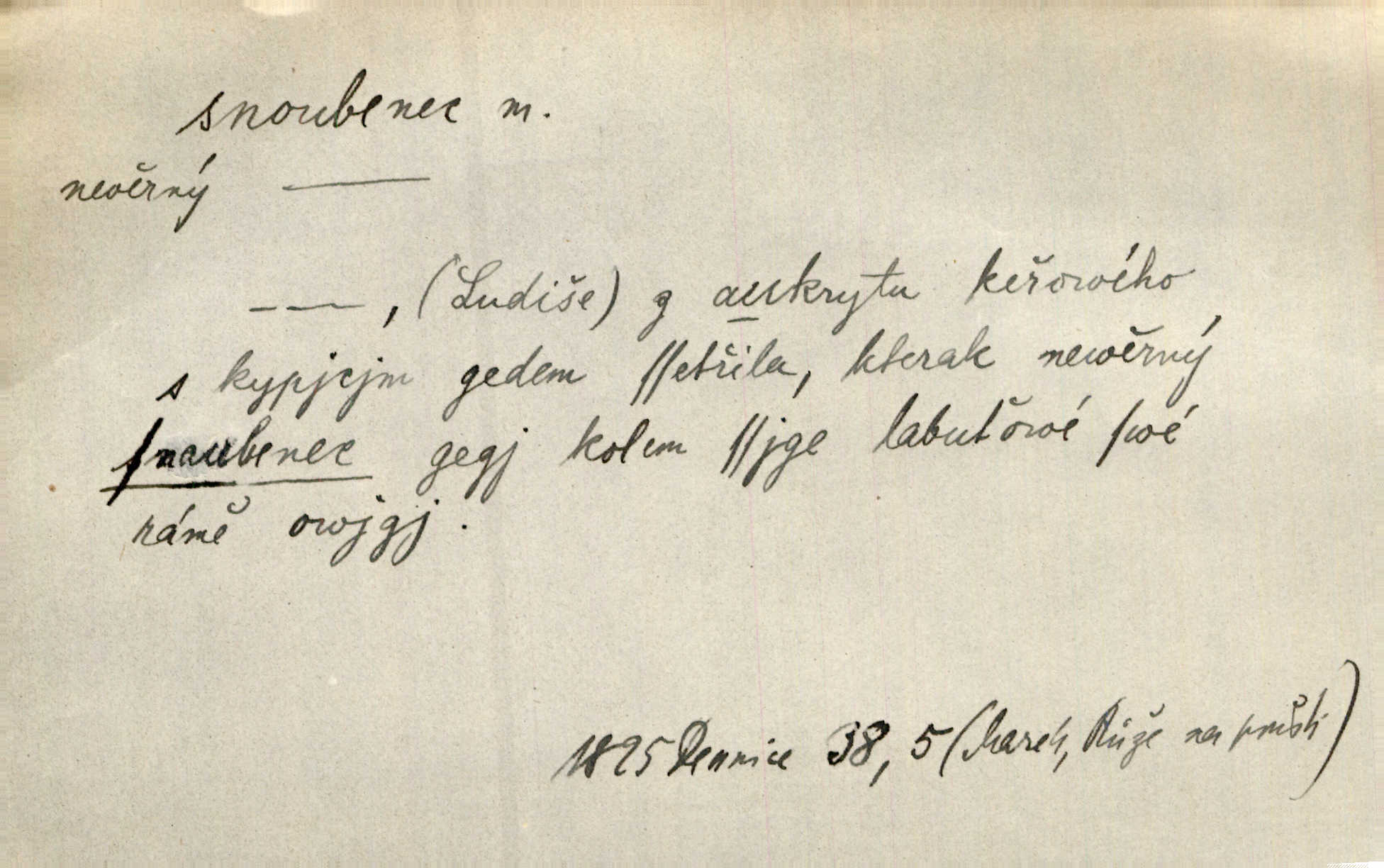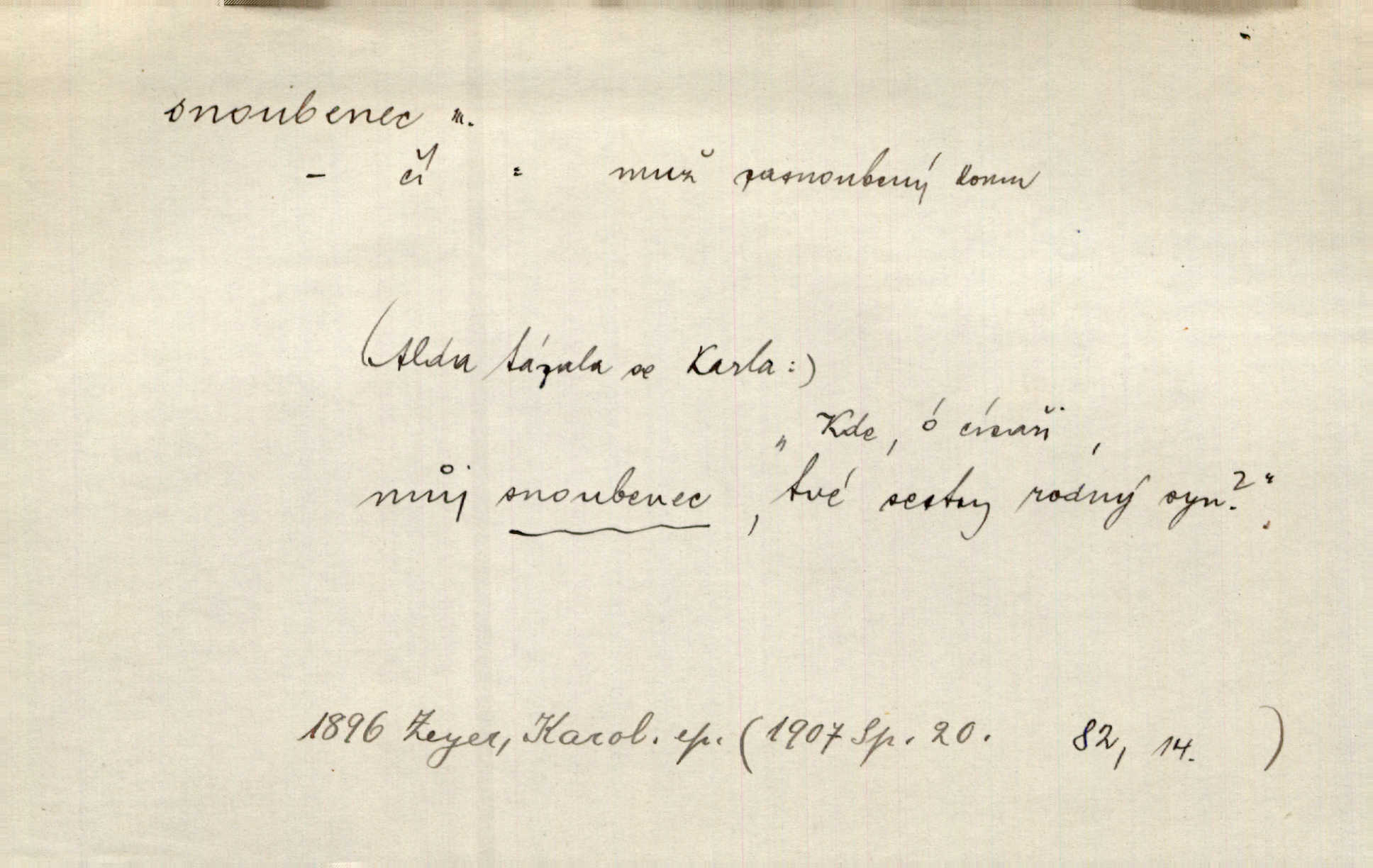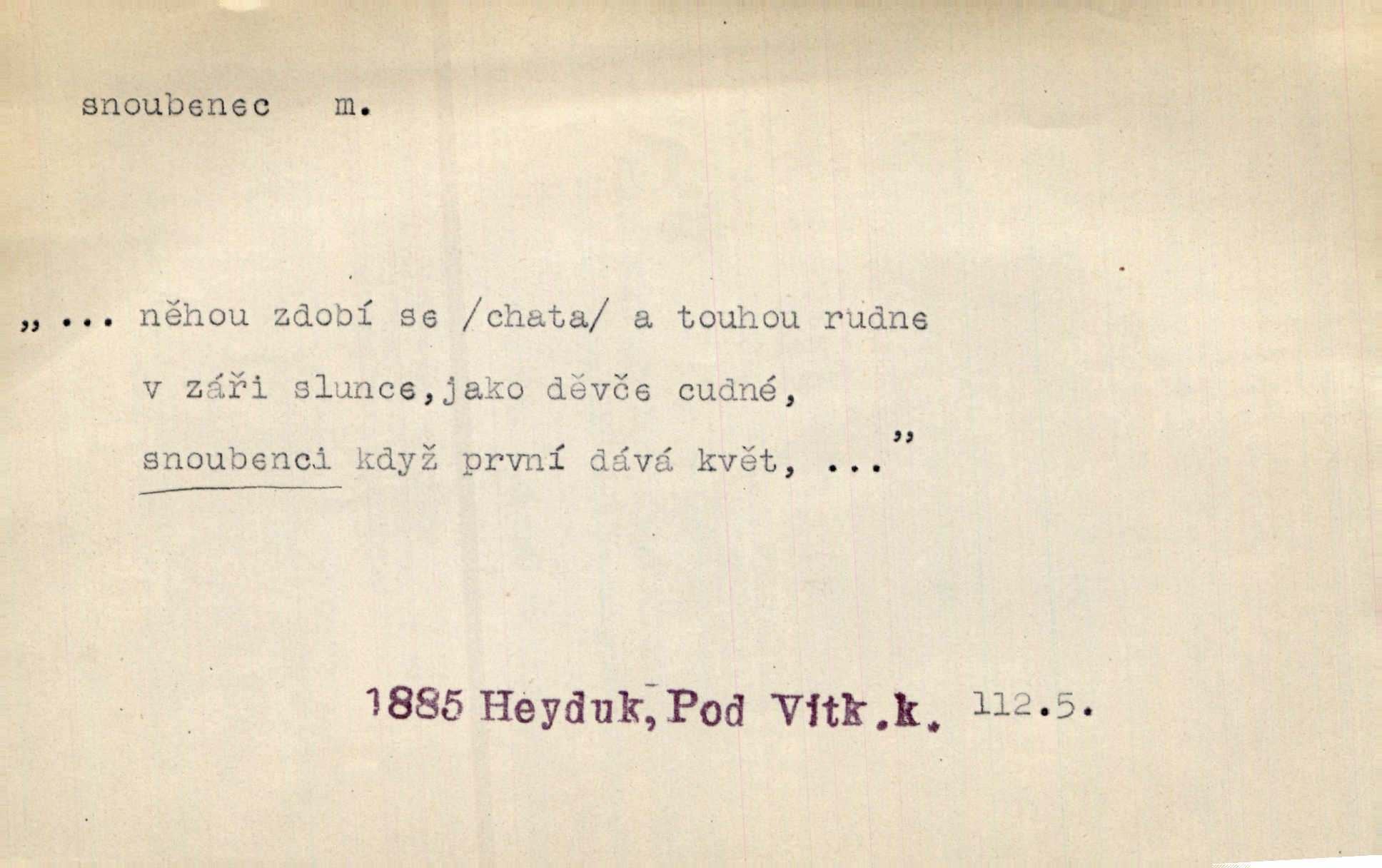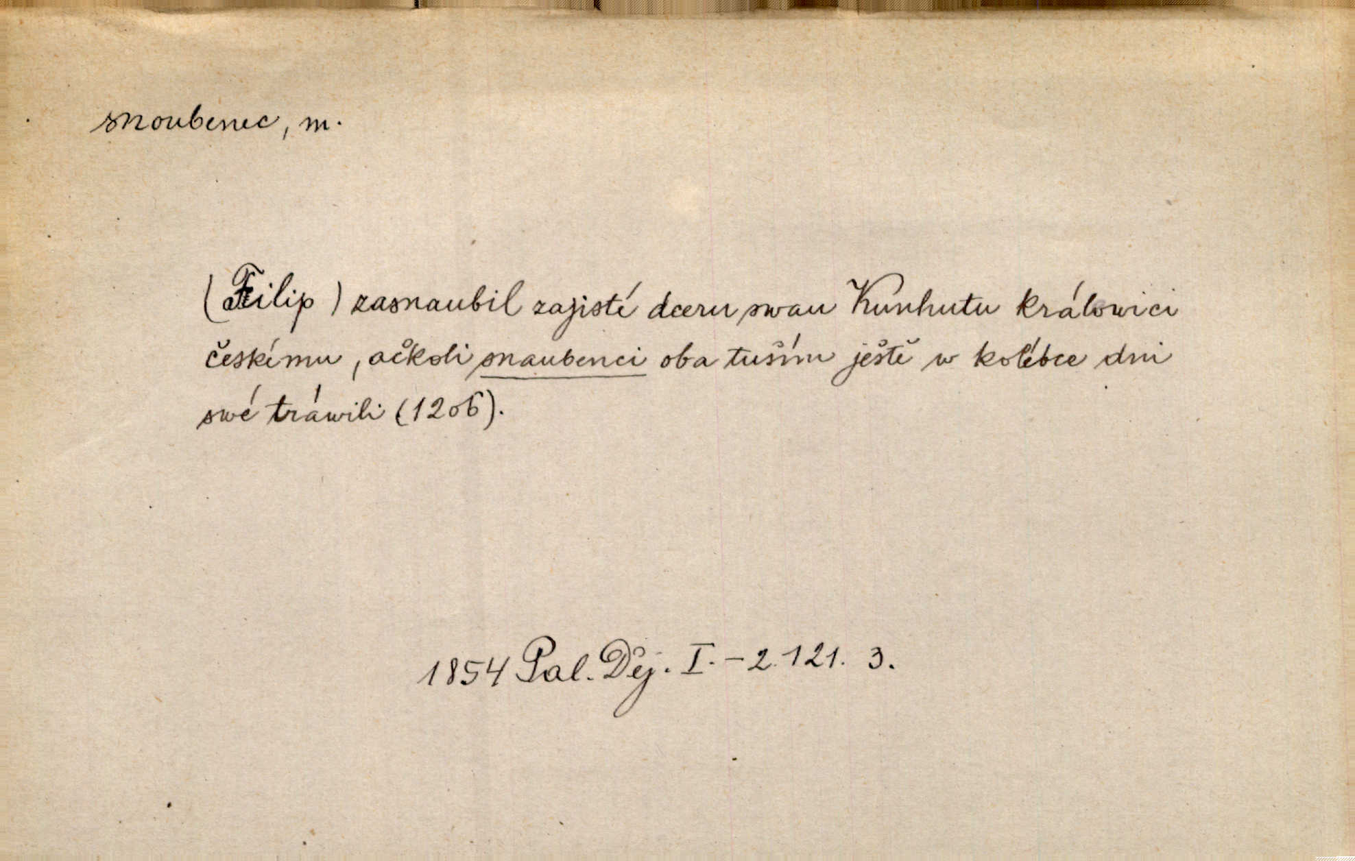 - snoubenec, -nce m. ten, kdo uzavřel úmluvu o zasnoubení; pl. snoubenci nastávající manželé, ženich a nevěsta. Po boku jedné z těchto dívek seděl mladý muž, který si počínal jako snoubenec její. Čech. Slečna Anna Rychlá a pan Čečetka jsou snoubenci. Mach. Bývají zvyky na svatbách, že se vzpomíná úrody zemské a požehnání Božího, jehož svatebníci přejí snoubencům. Herb. Přen. Zasvěcenec musí se vyvinouti z objetí přítomnosti a státi se „snoubencem“ tradice. Píša. Dnes slaví Tvoji [Máchovu] památku snoubenci ducha Tvého. Pfleg.