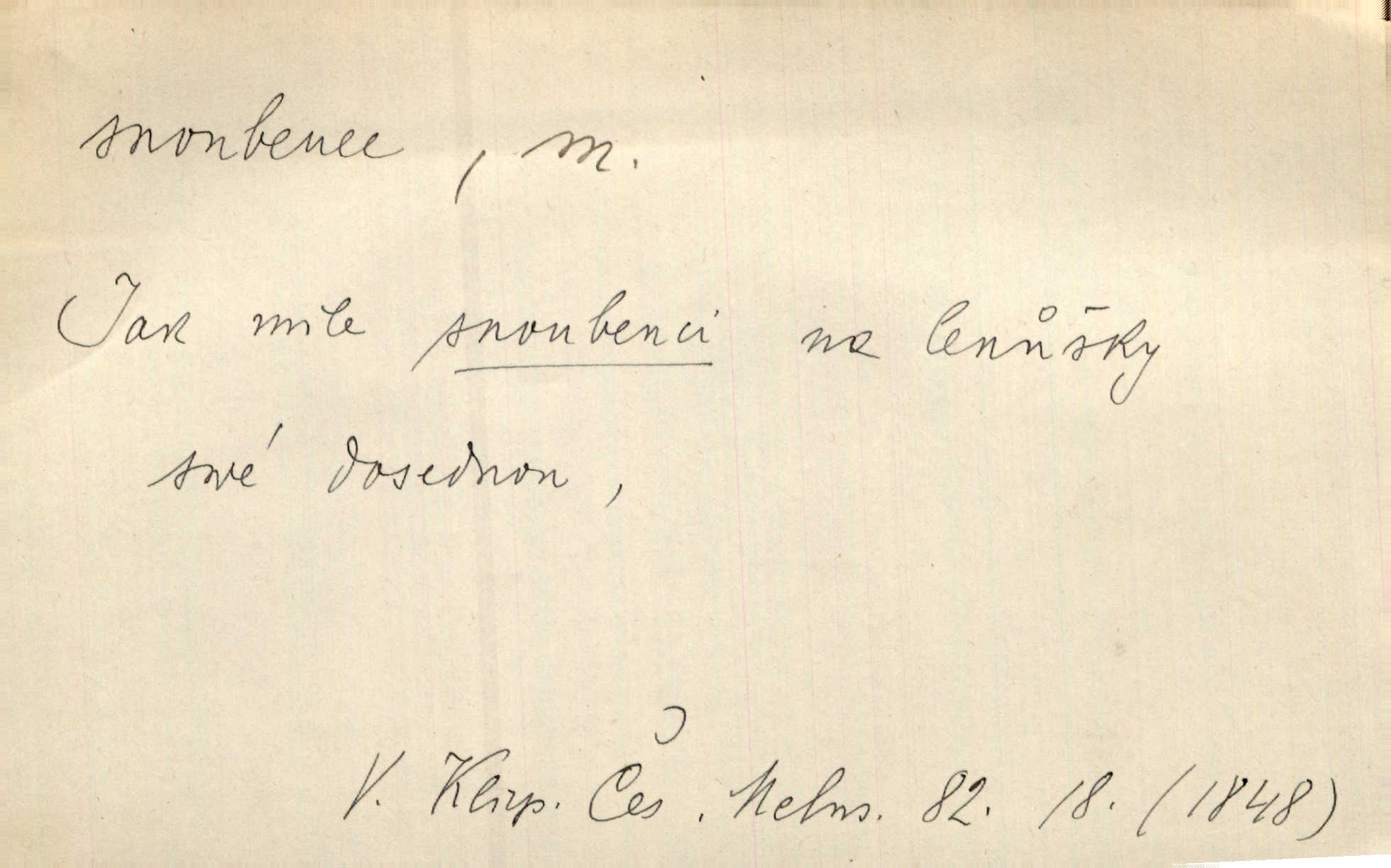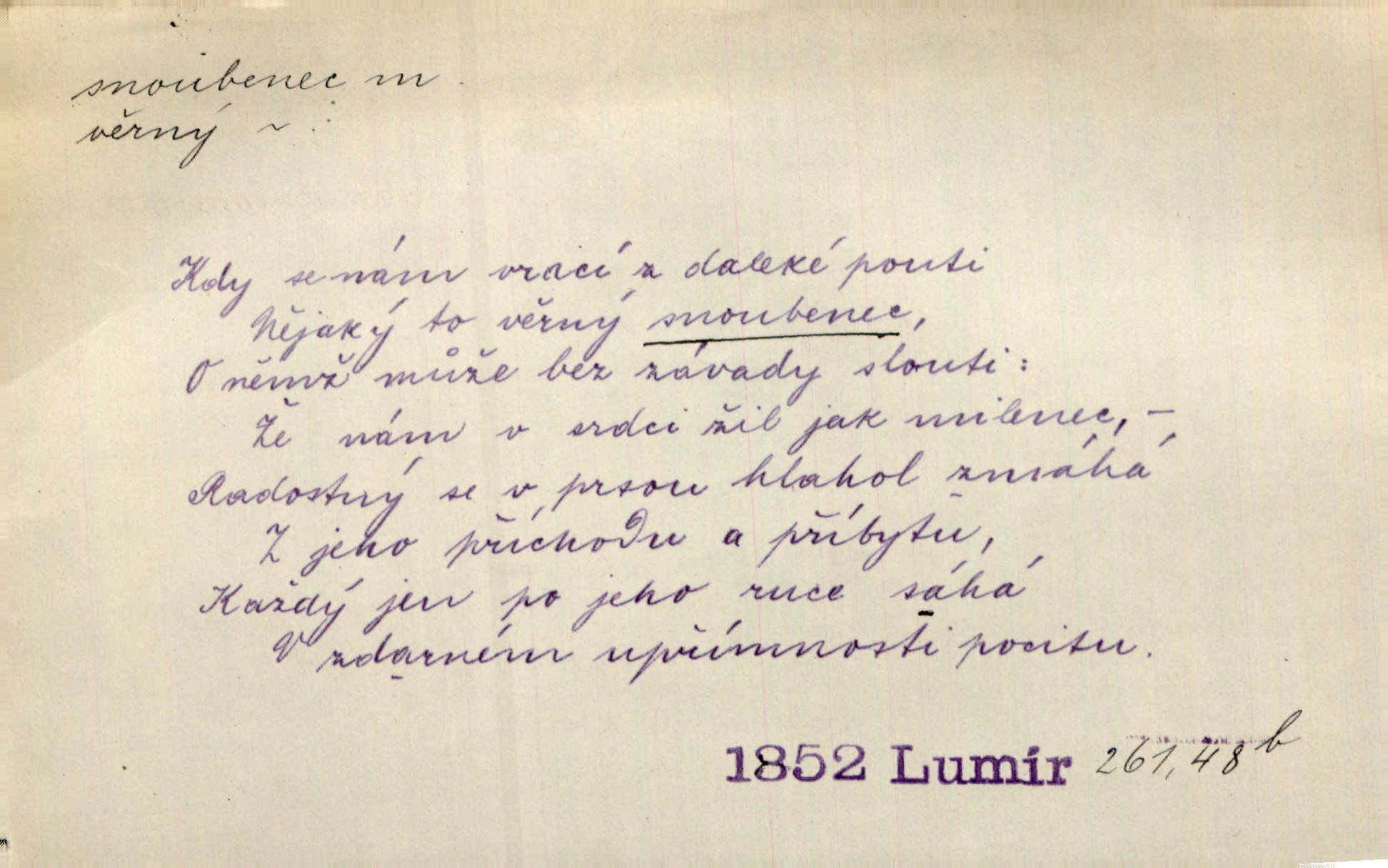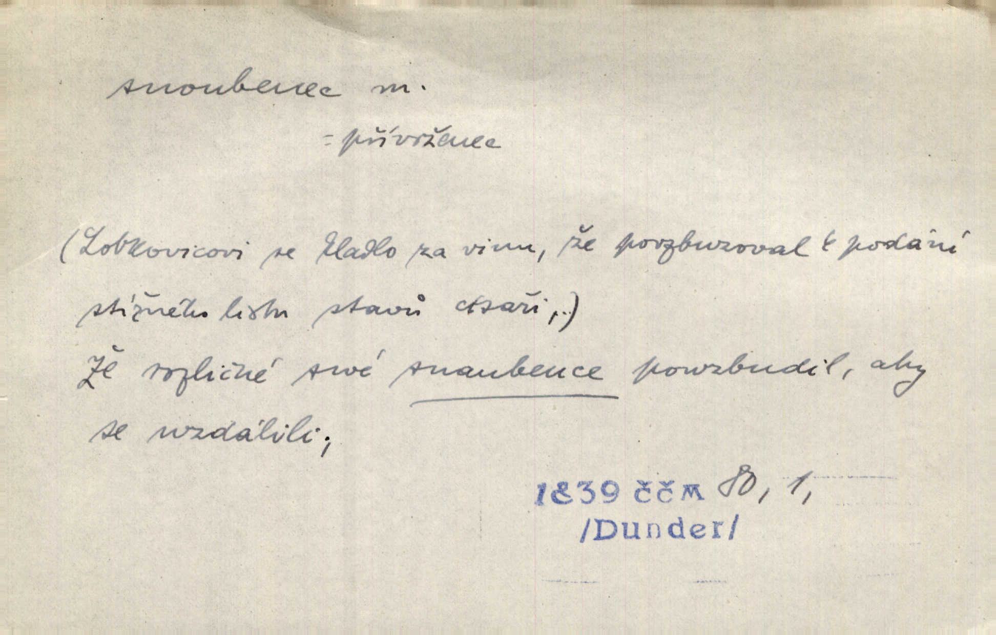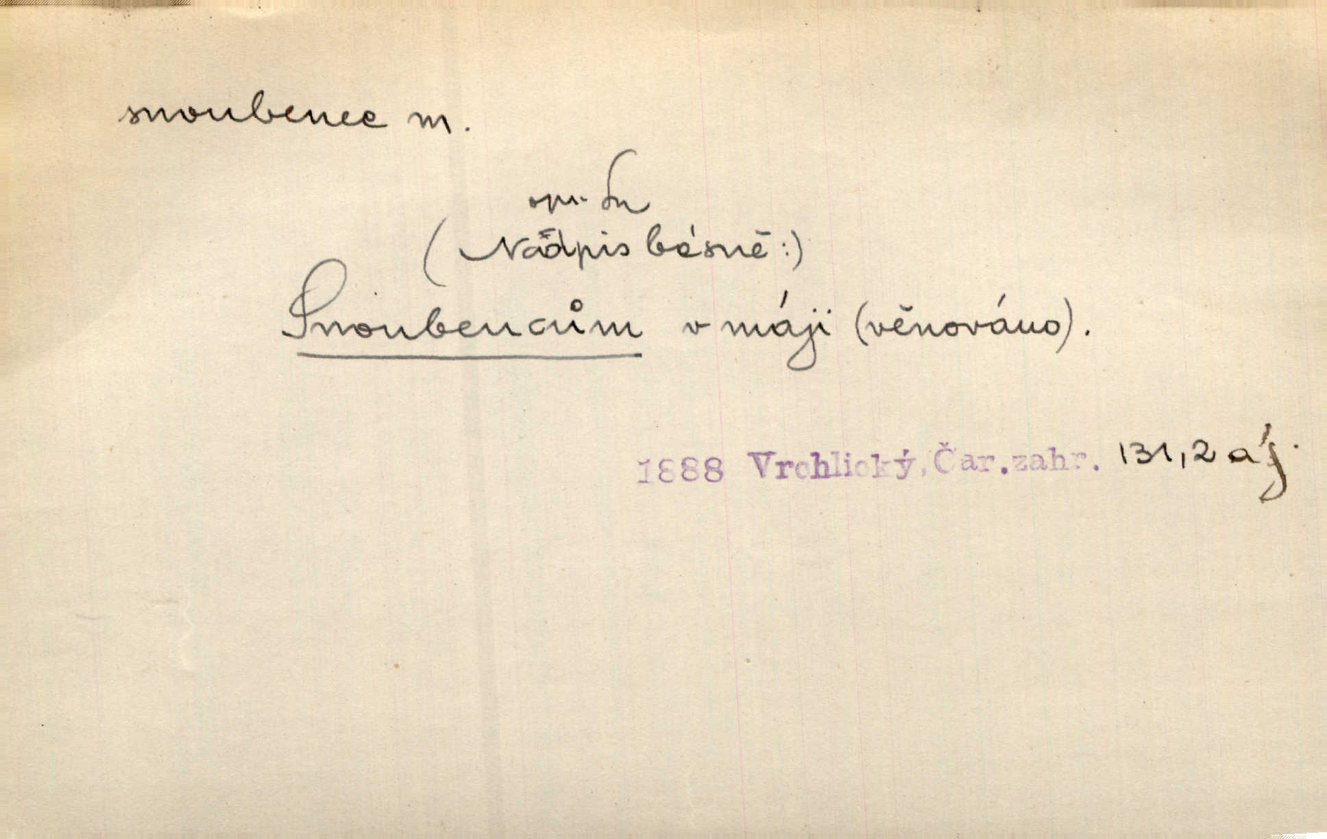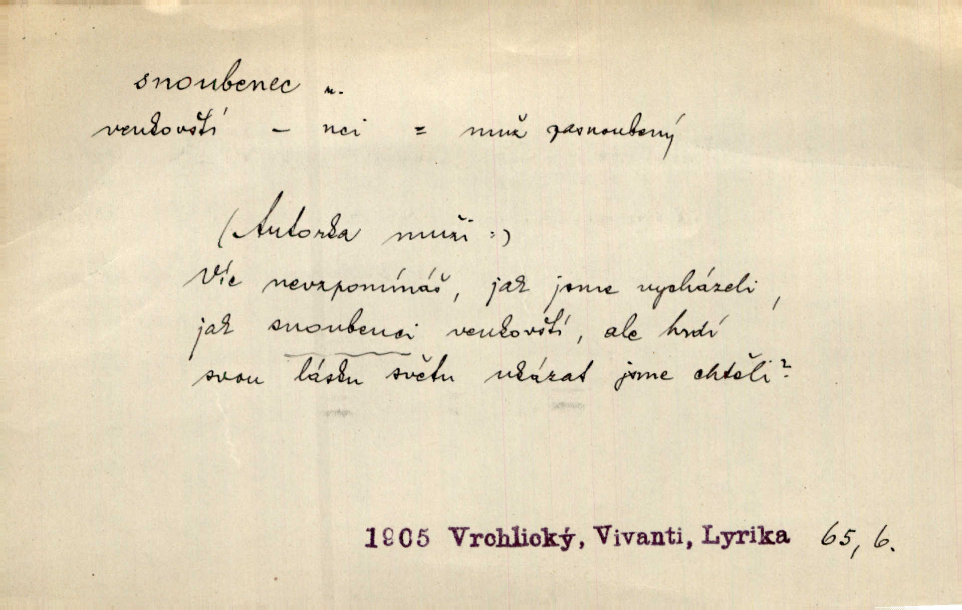- snoubenec, -nce m. ten, kdo uzavřel úmluvu o zasnoubení; pl. snoubenci nastávající manželé, ženich a nevěsta. Po boku jedné z těchto dívek seděl mladý muž, který si počínal jako snoubenec její. Čech. Slečna Anna Rychlá a pan Čečetka jsou snoubenci. Mach. Bývají zvyky na svatbách, že se vzpomíná úrody zemské a požehnání Božího, jehož svatebníci přejí snoubencům. Herb. Přen. Zasvěcenec musí se vyvinouti z objetí přítomnosti a státi se „snoubencem“ tradice. Píša. Dnes slaví Tvoji [Máchovu] památku snoubenci ducha Tvého. Pfleg.