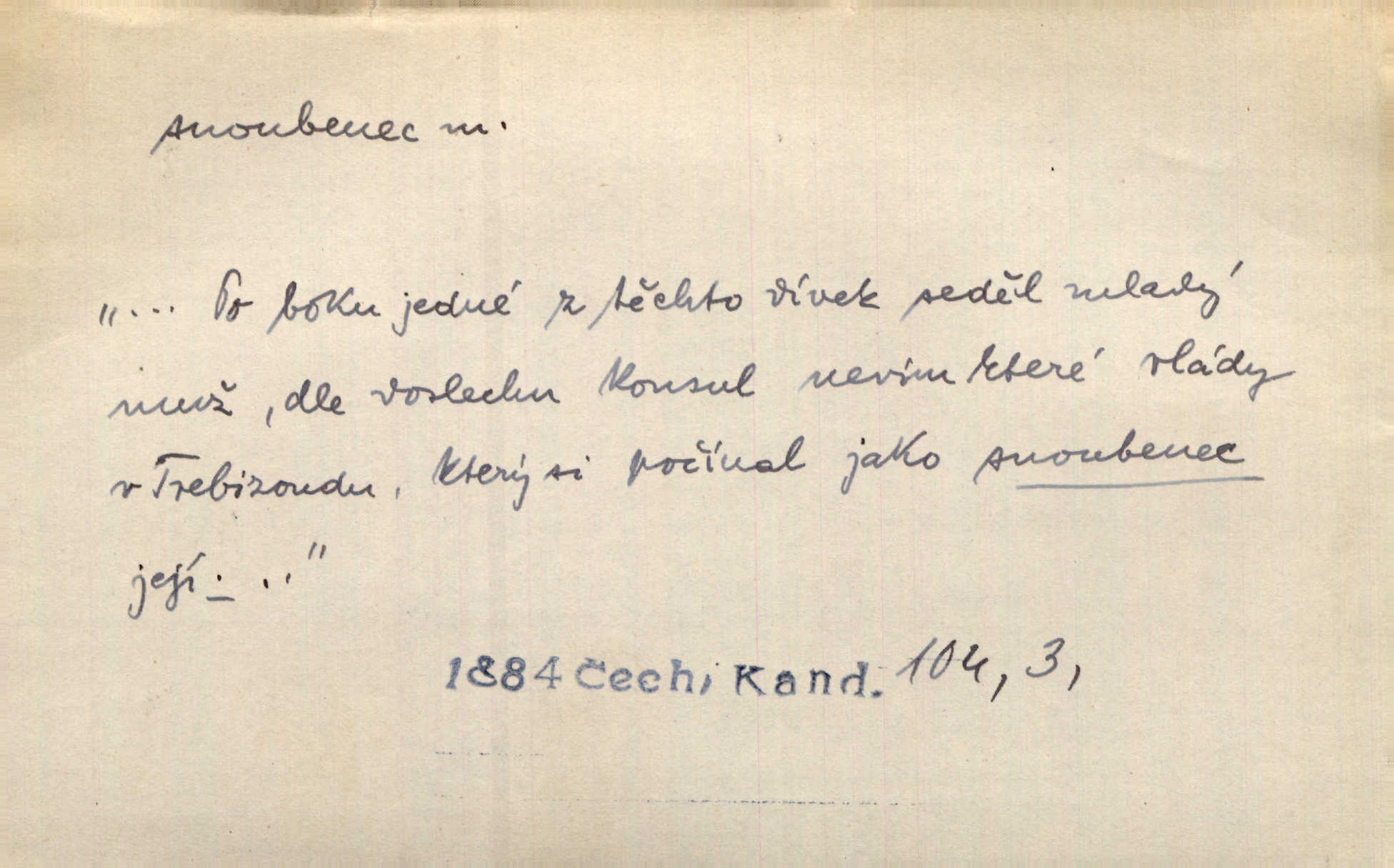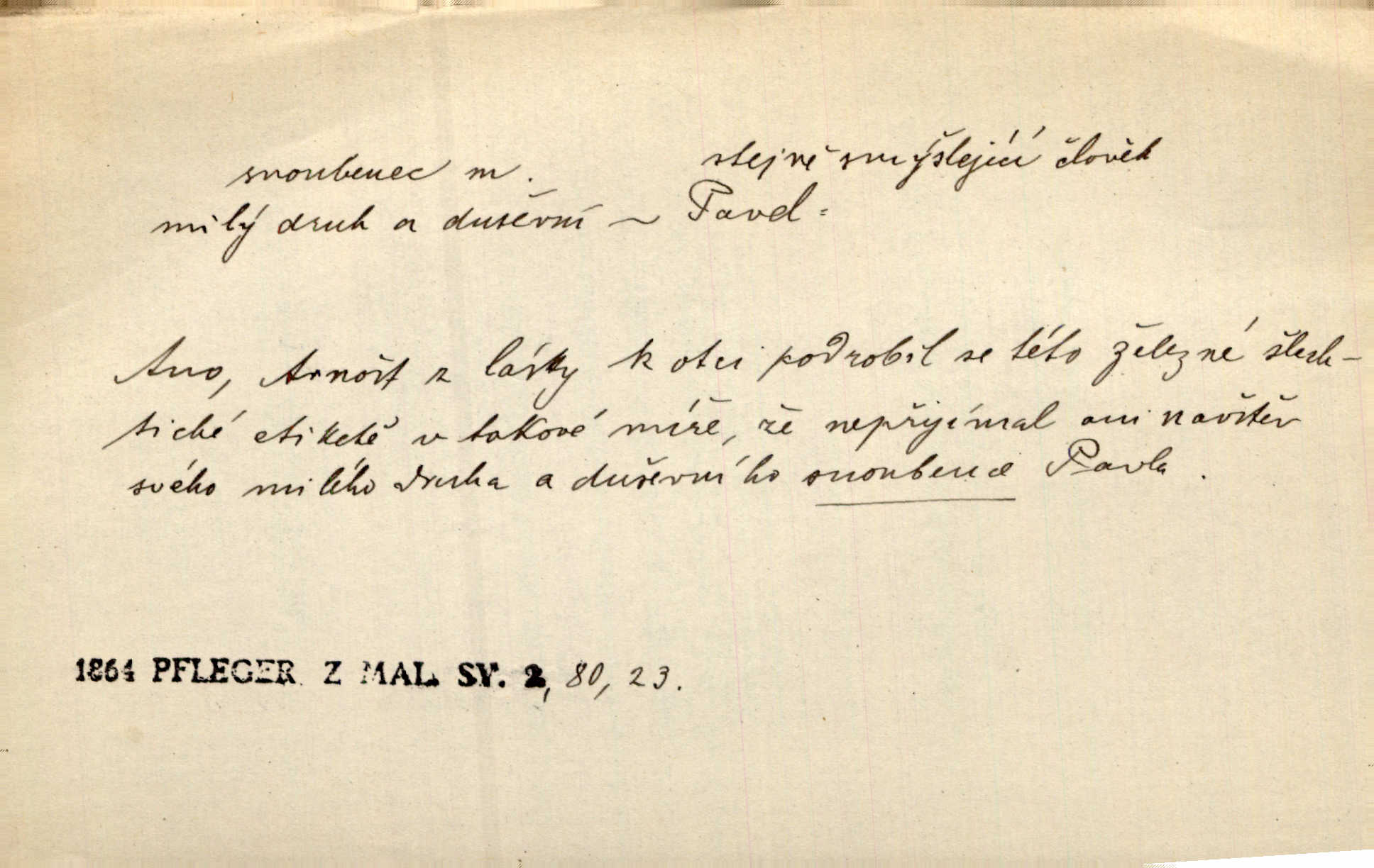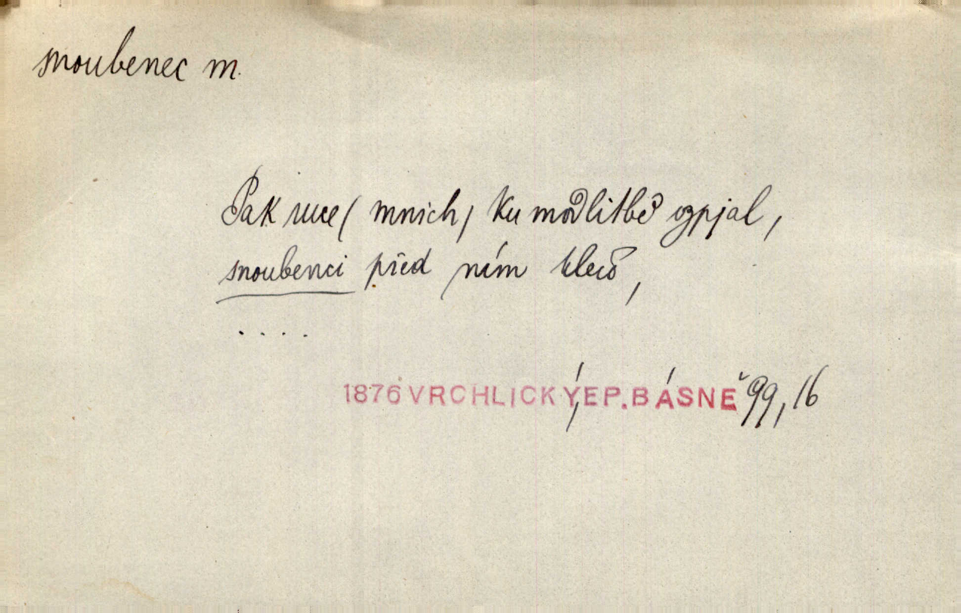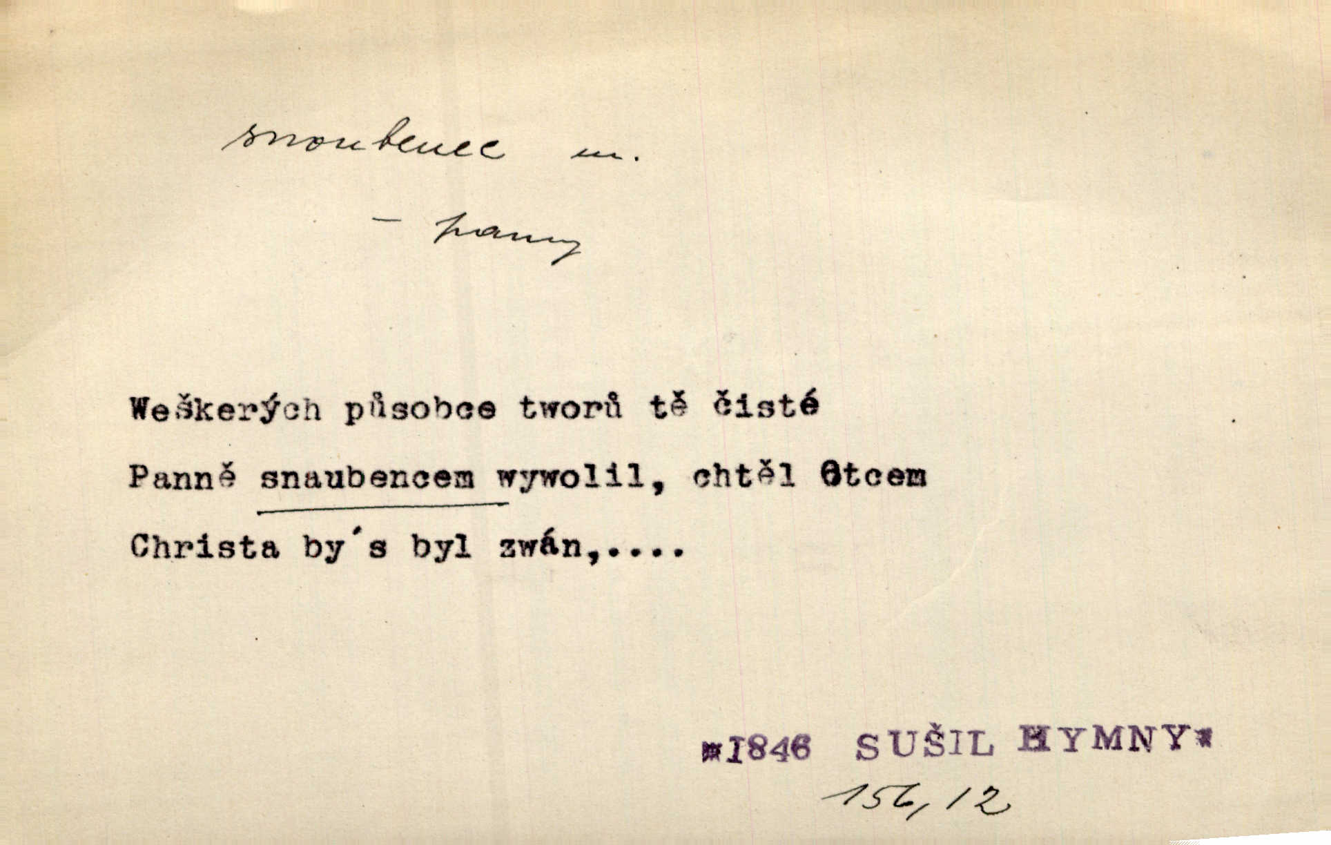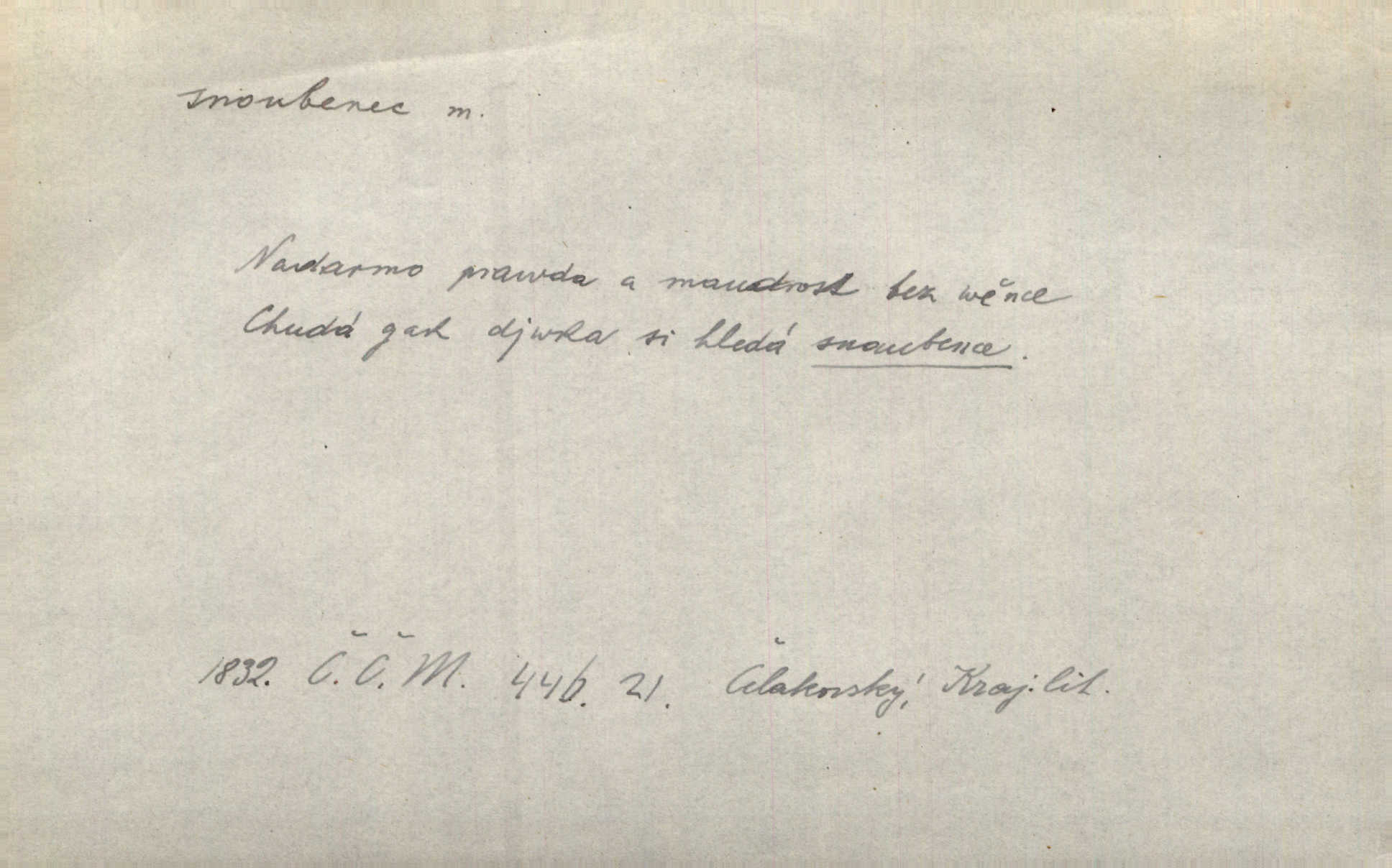- snoubenec, -nce m. ten, kdo uzavřel úmluvu o zasnoubení; pl. snoubenci nastávající manželé, ženich a nevěsta. Po boku jedné z těchto dívek seděl mladý muž, který si počínal jako snoubenec její. Čech. Slečna Anna Rychlá a pan Čečetka jsou snoubenci. Mach. Bývají zvyky na svatbách, že se vzpomíná úrody zemské a požehnání Božího, jehož svatebníci přejí snoubencům. Herb. Přen. Zasvěcenec musí se vyvinouti z objetí přítomnosti a státi se „snoubencem“ tradice. Píša. Dnes slaví Tvoji [Máchovu] památku snoubenci ducha Tvého. Pfleg.