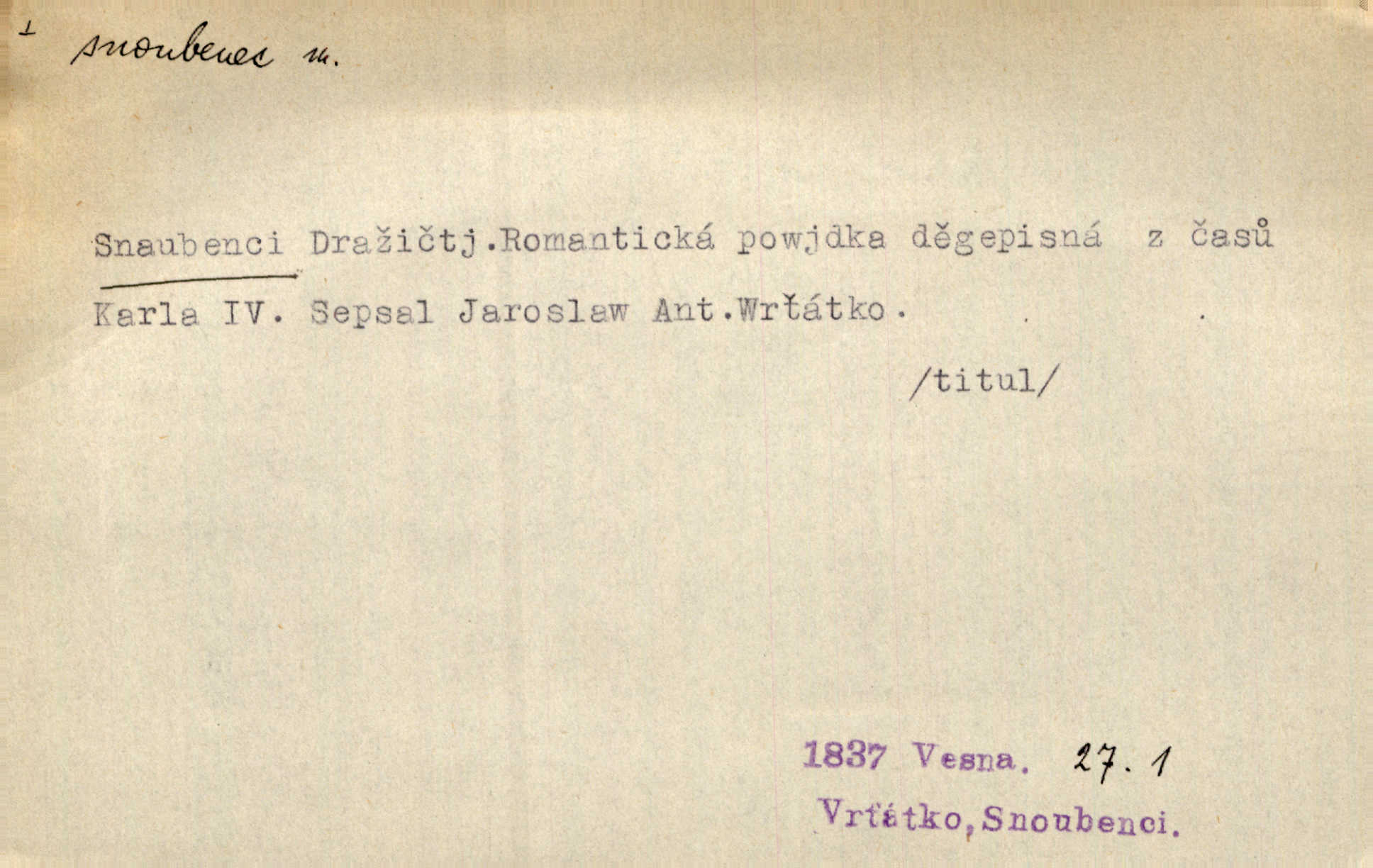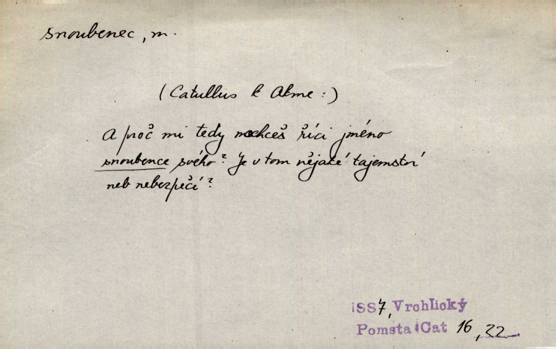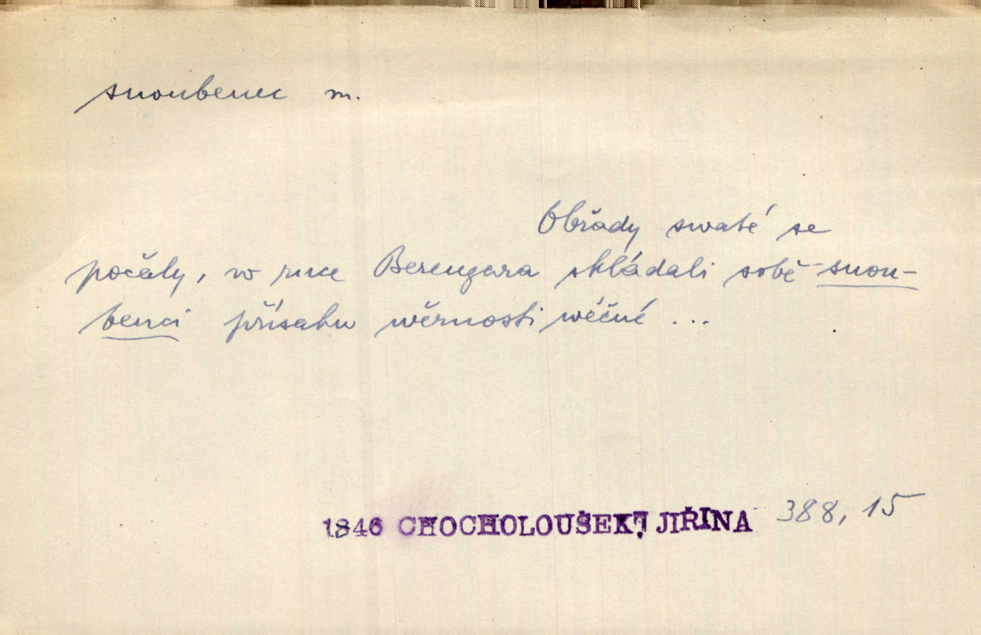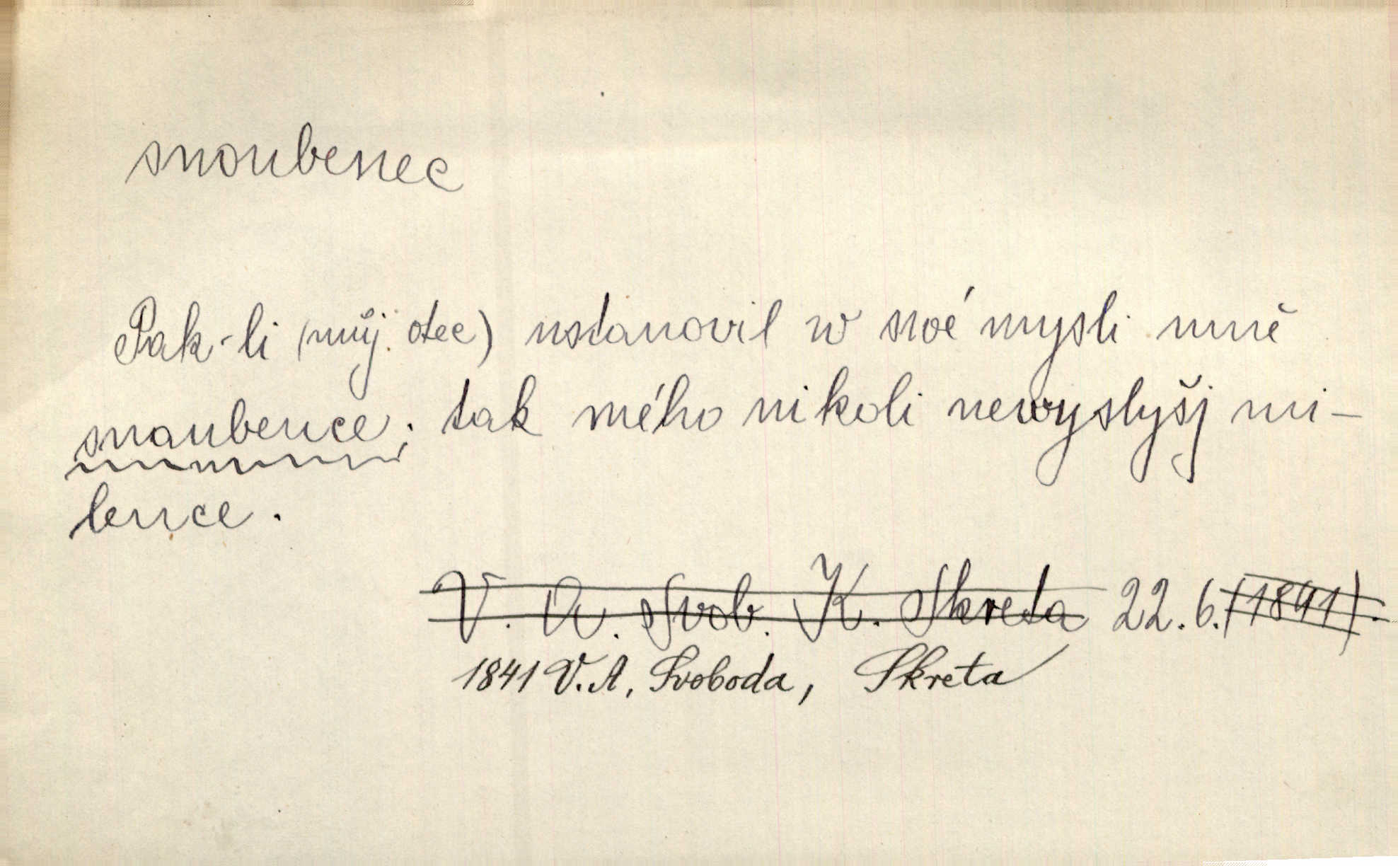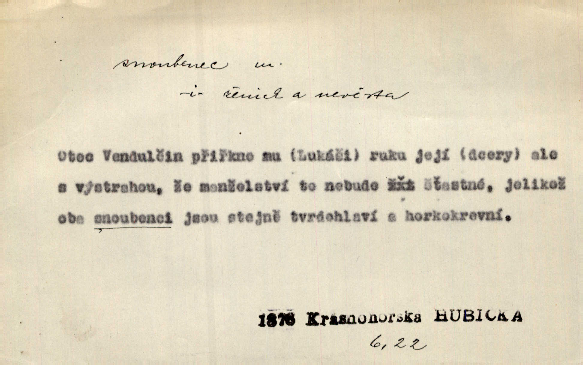 - snoubenec, -nce m. ten, kdo uzavřel úmluvu o zasnoubení; pl. snoubenci nastávající manželé, ženich a nevěsta. Po boku jedné z těchto dívek seděl mladý muž, který si počínal jako snoubenec její. Čech. Slečna Anna Rychlá a pan Čečetka jsou snoubenci. Mach. Bývají zvyky na svatbách, že se vzpomíná úrody zemské a požehnání Božího, jehož svatebníci přejí snoubencům. Herb. Přen. Zasvěcenec musí se vyvinouti z objetí přítomnosti a státi se „snoubencem“ tradice. Píša. Dnes slaví Tvoji [Máchovu] památku snoubenci ducha Tvého. Pfleg.