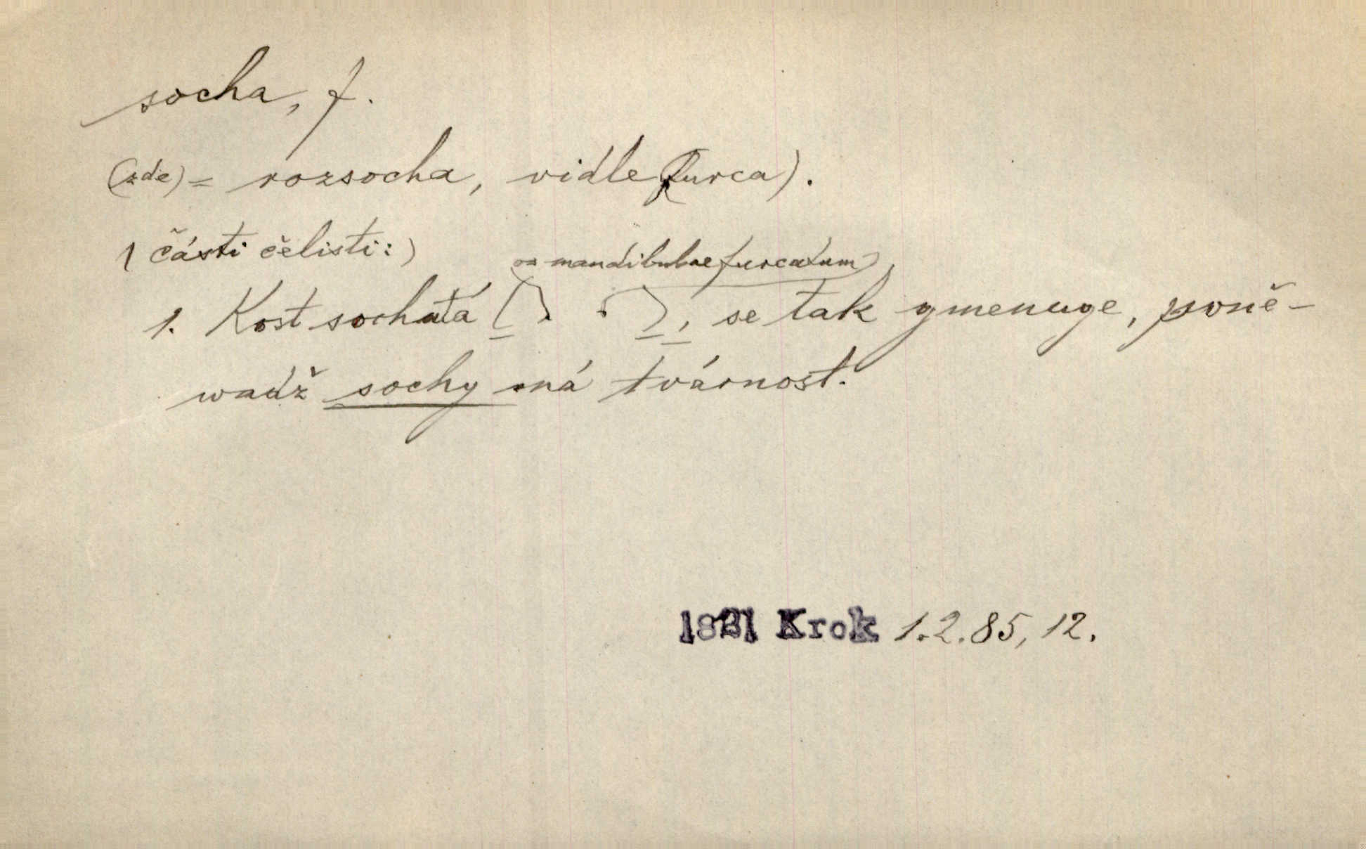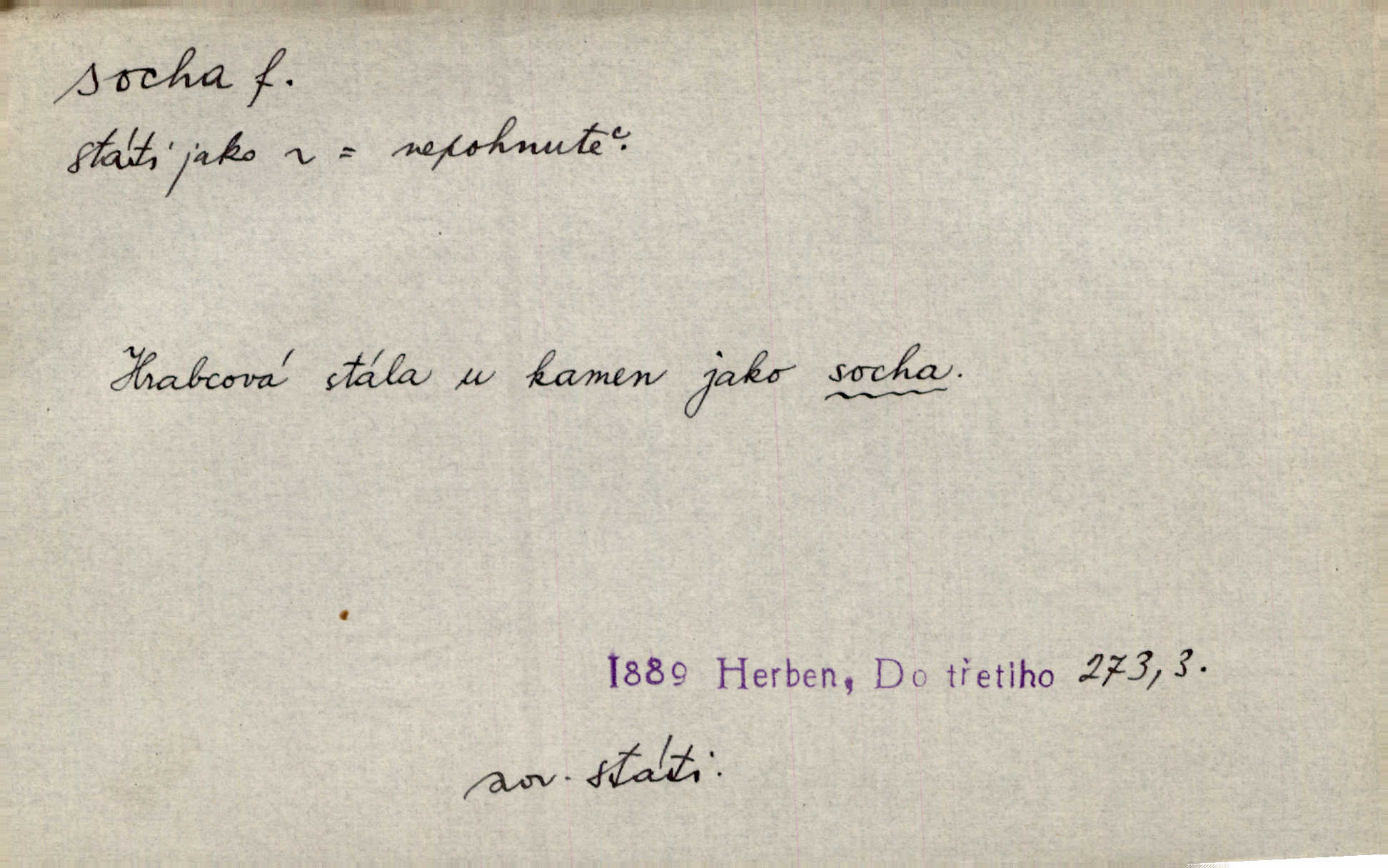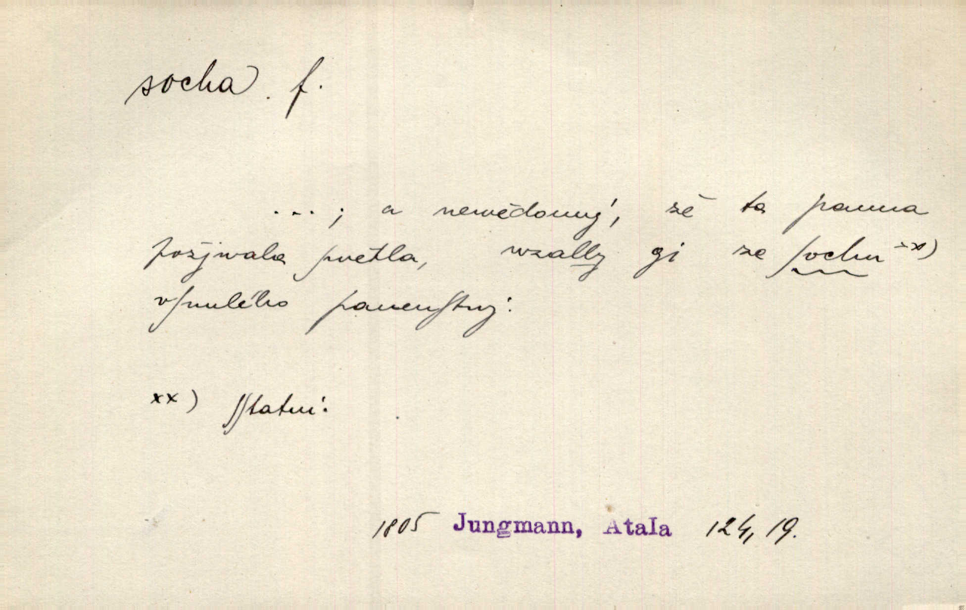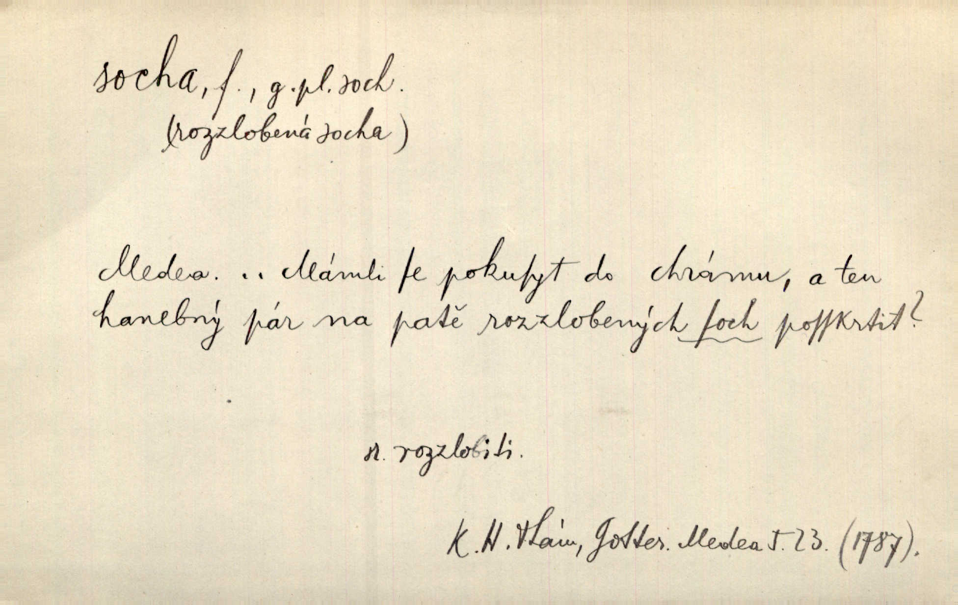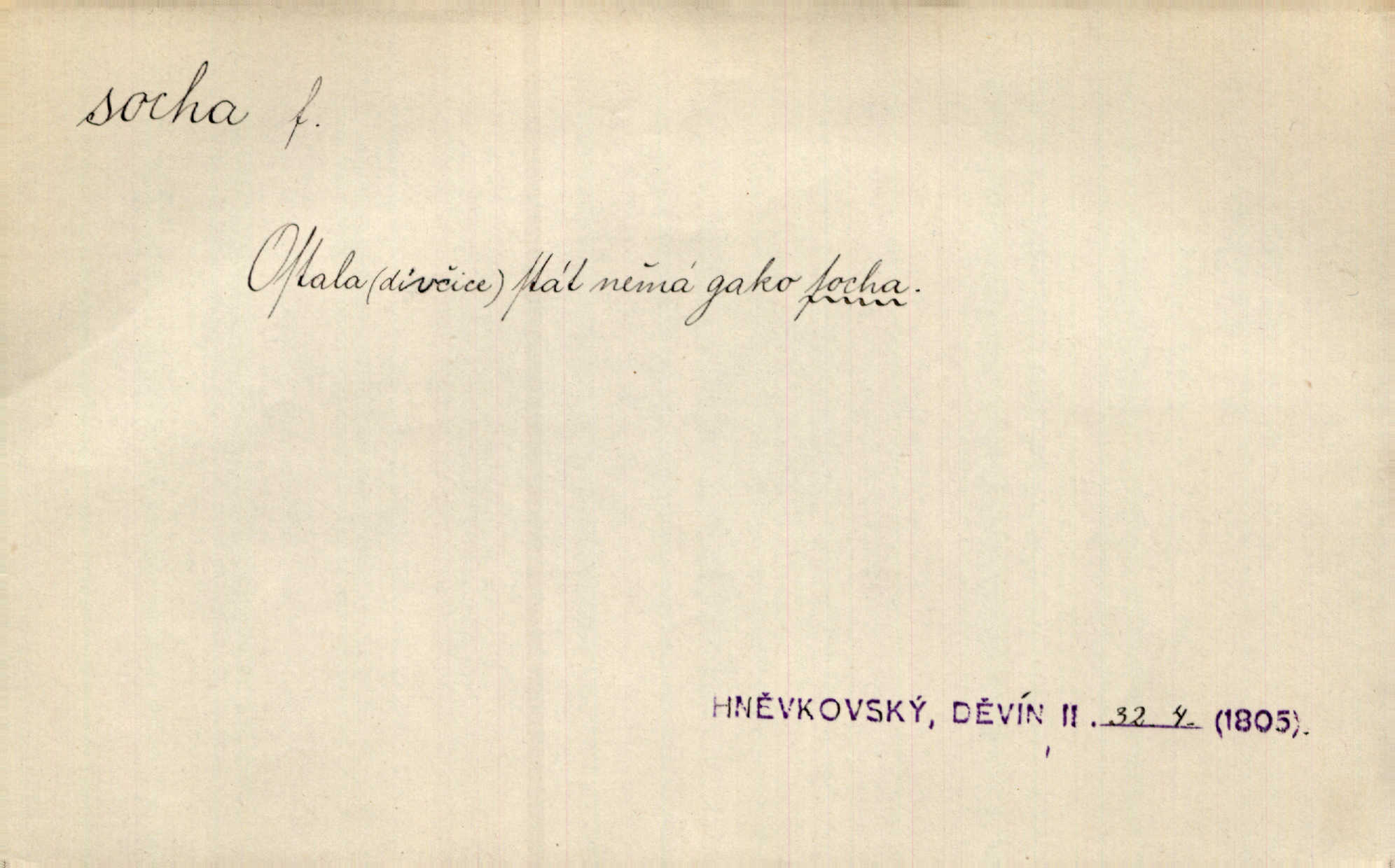 - socha, -y f. lidská n. zvířecí postava zhotovená z kovu, kamene, dřeva a p. Chrám jerusalemský stavěli feničtí cizinci, socha a obraz byly Mojžíšem zapovězeny. Ner. Hlava mu šla kolem, když viděl tolik pozlacených soch, velikých lamp. Prav. Hrabcová stála u kamen jako socha nepohnutě, ztrnule. Herb. Ledecký poslouchal baronku pokojně jako socha. Šmil. Kráčel vedle ní jako bezduchá socha tiše, sklesle. Šmil. Přen. Litoval jsem ubohé sestřenky, že v nevinné zaslepenosti dala se připoutati k tak prázdné soše k bezduchému člověku. Her. D podpora, obyč. dřevěná, s horním koncem dvojitým. Haluze jabloní jsou jakoby zbytečně podepřeny sochami, protože není sněhu, který by je přetížil. Lid. nov. Les. postranní kůly a stahovačka, kterými se udržuje v hranicích vyrovnané palivové dřevo. D v starších dobách dřevěná rozsocha, upravená jako oradlo. Aby je zkypřili [půdy]‚ k tomu jim dostačovalo dřevěné oradlo, jemuž říkali „socha“. Hol. D část kuše, na níž byl upevněn luk. As ve XII. století vznikl z luku samostříl, kuše či lučiště, které mimo luku bylo opatřeno dřevěnou sochou, upomínající tvarem na pažbu dnešních palných zbraní. A. Břez.