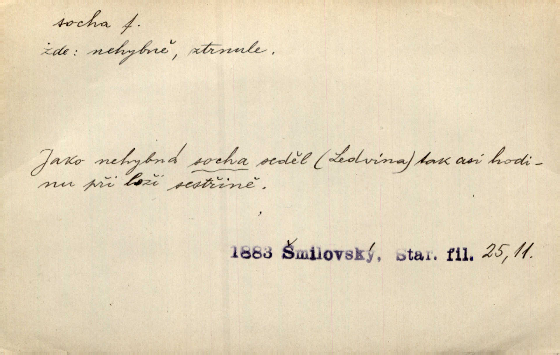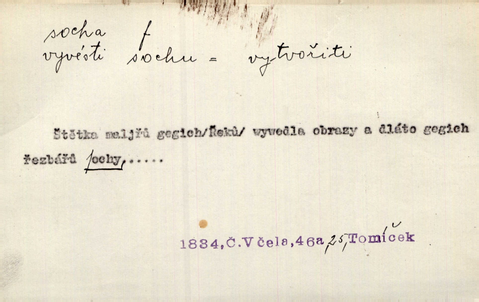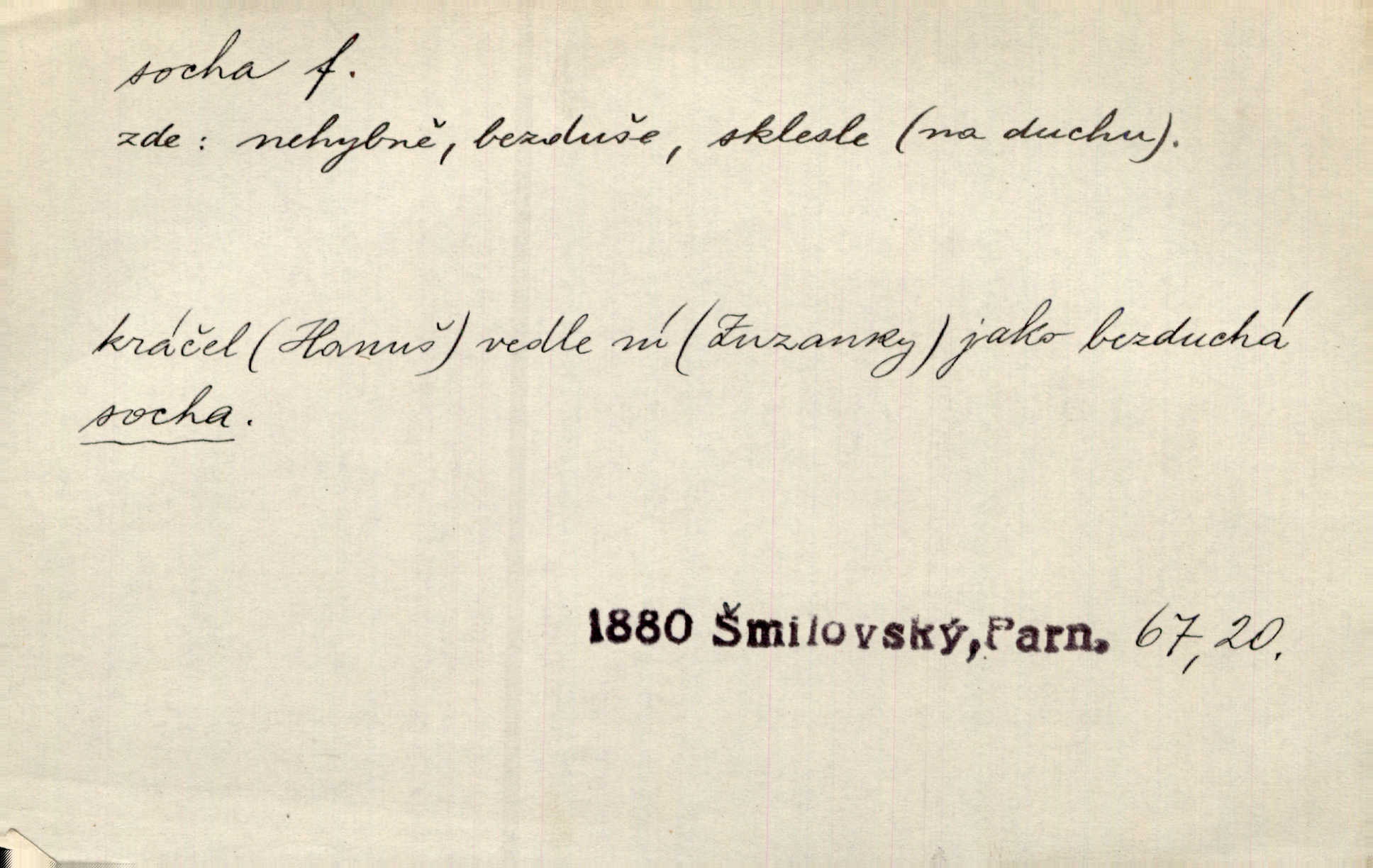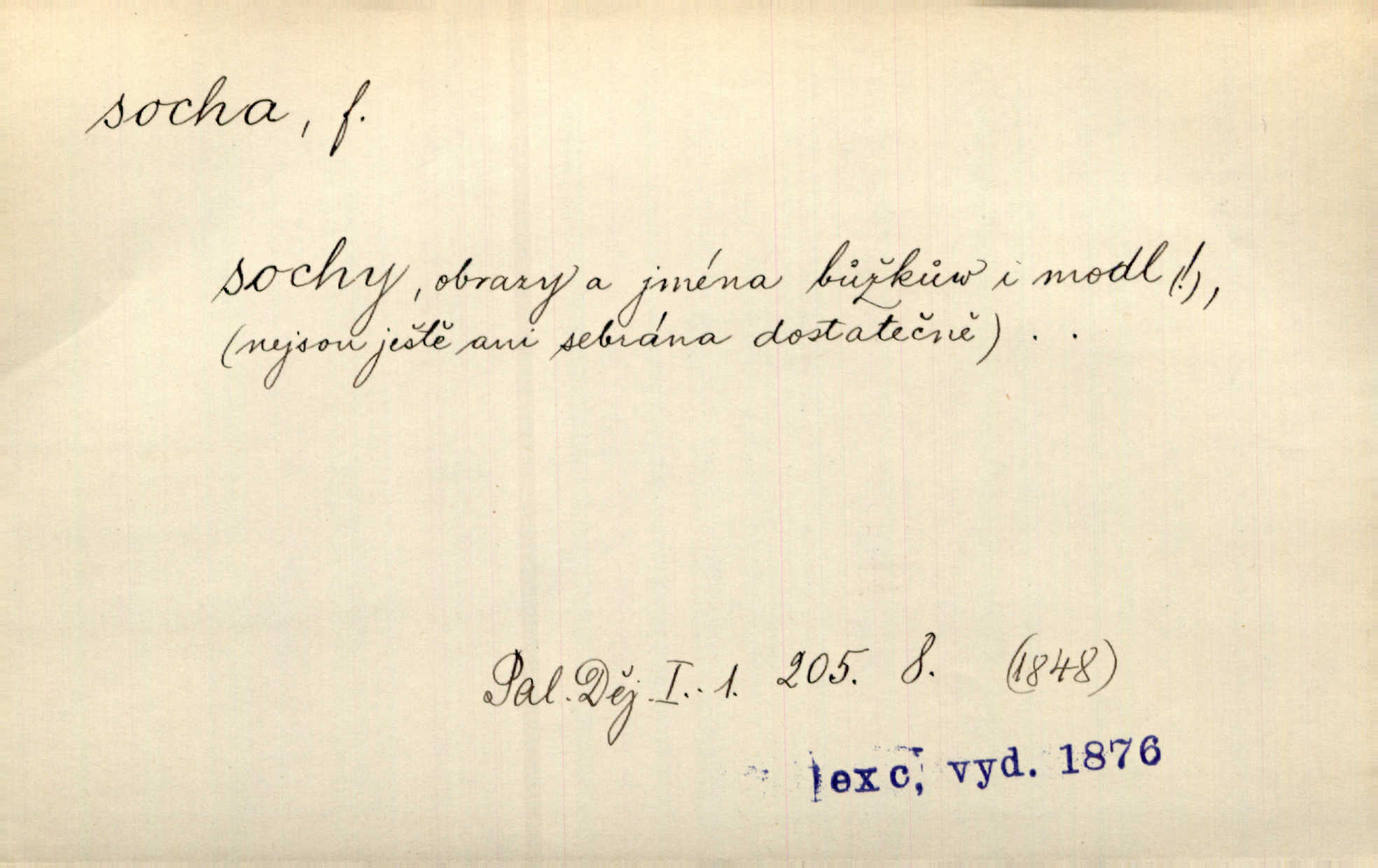 - socha, -y f. lidská n. zvířecí postava zhotovená z kovu, kamene, dřeva a p. Chrám jerusalemský stavěli feničtí cizinci, socha a obraz byly Mojžíšem zapovězeny. Ner. Hlava mu šla kolem, když viděl tolik pozlacených soch, velikých lamp. Prav. Hrabcová stála u kamen jako socha nepohnutě, ztrnule. Herb. Ledecký poslouchal baronku pokojně jako socha. Šmil. Kráčel vedle ní jako bezduchá socha tiše, sklesle. Šmil. Přen. Litoval jsem ubohé sestřenky, že v nevinné zaslepenosti dala se připoutati k tak prázdné soše k bezduchému člověku. Her. D podpora, obyč. dřevěná, s horním koncem dvojitým. Haluze jabloní jsou jakoby zbytečně podepřeny sochami, protože není sněhu, který by je přetížil. Lid. nov. Les. postranní kůly a stahovačka, kterými se udržuje v hranicích vyrovnané palivové dřevo. D v starších dobách dřevěná rozsocha, upravená jako oradlo. Aby je zkypřili [půdy]‚ k tomu jim dostačovalo dřevěné oradlo, jemuž říkali „socha“. Hol. D část kuše, na níž byl upevněn luk. As ve XII. století vznikl z luku samostříl, kuše či lučiště, které mimo luku bylo opatřeno dřevěnou sochou, upomínající tvarem na pažbu dnešních palných zbraní. A. Břez.