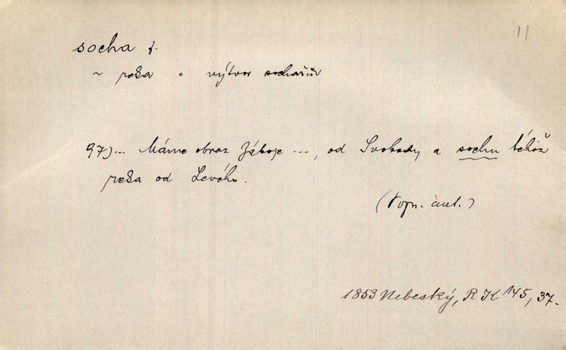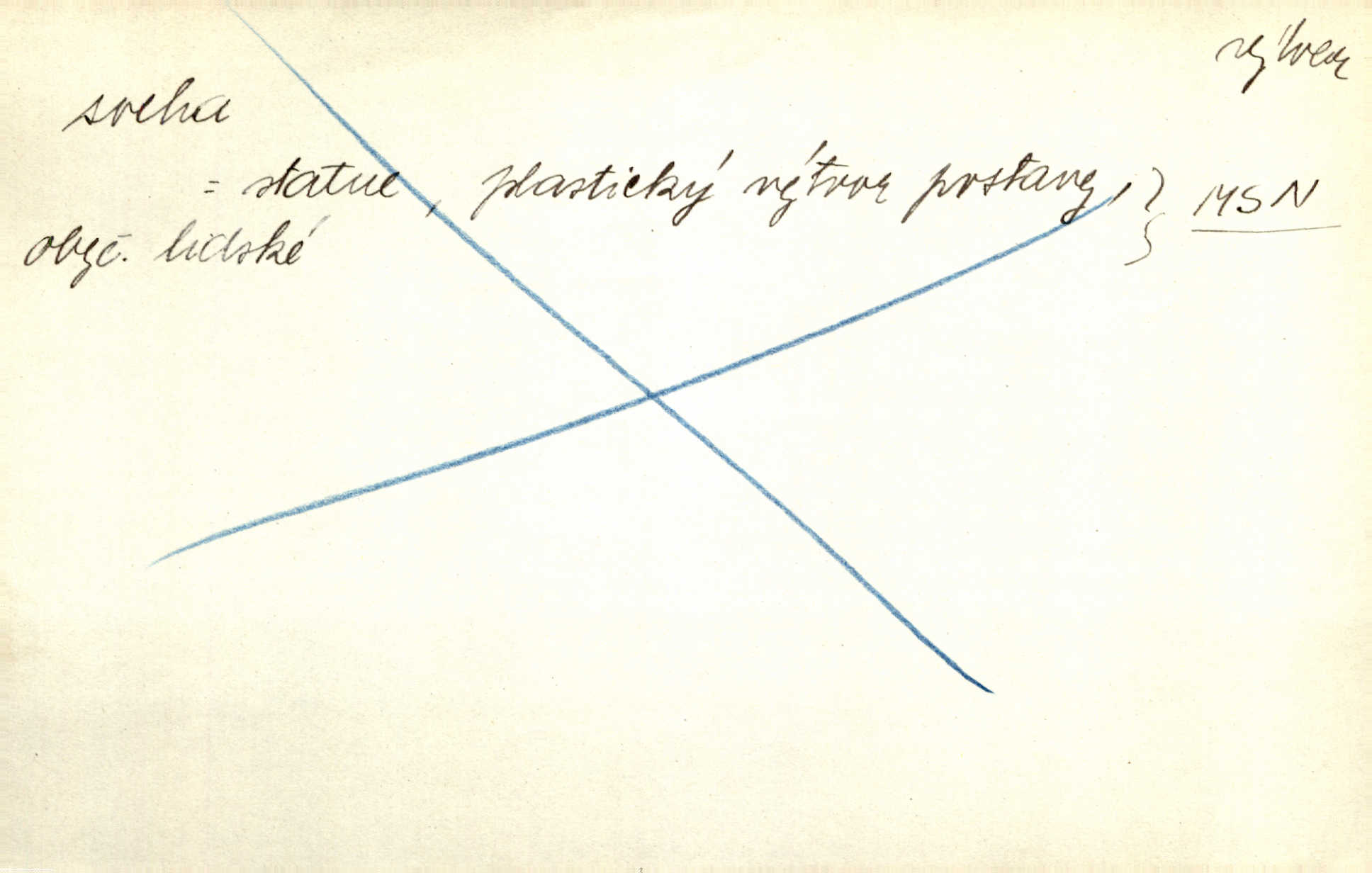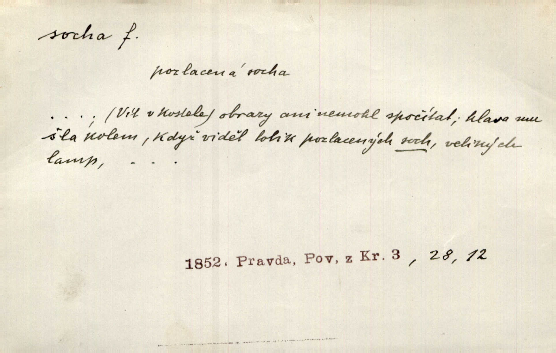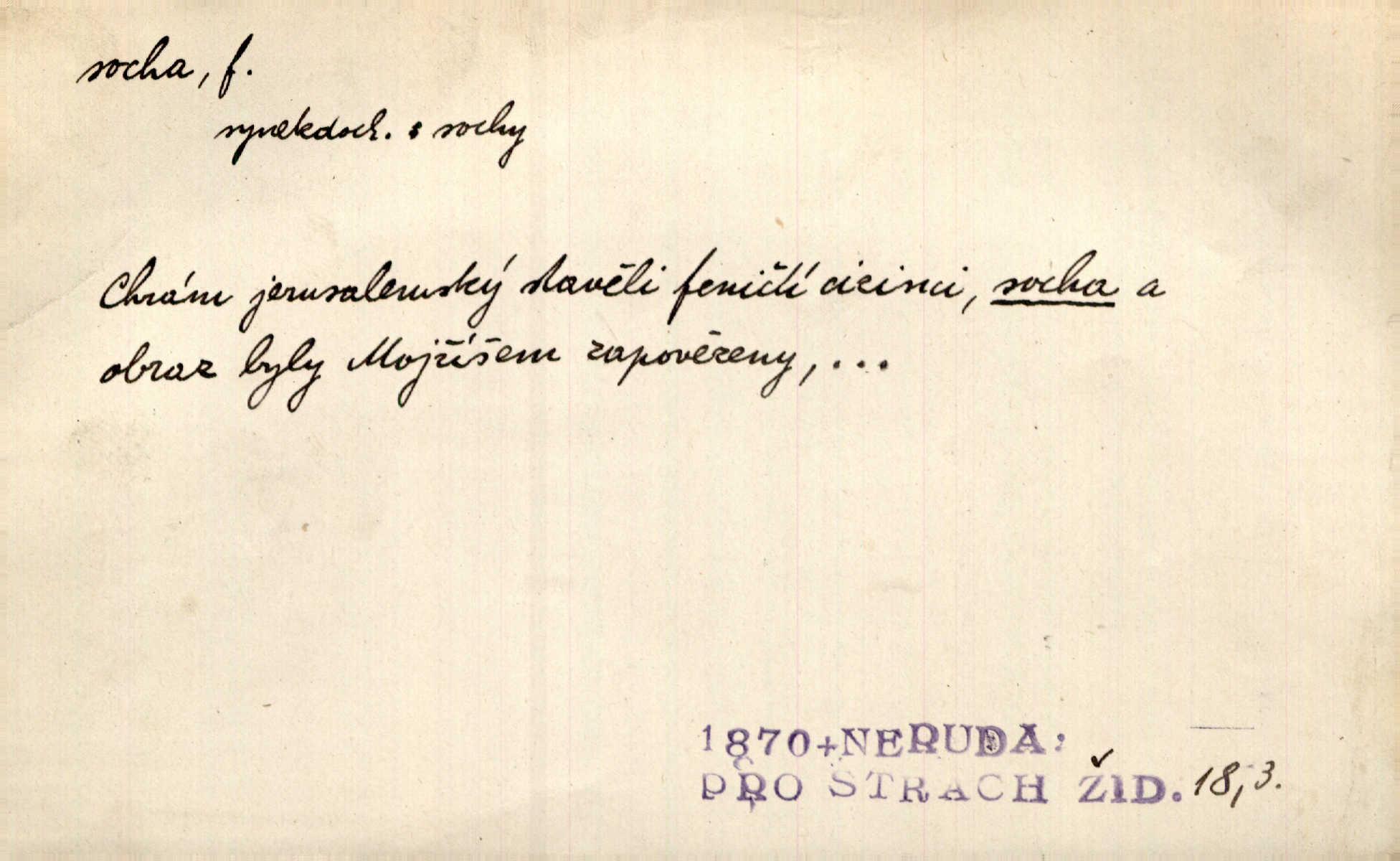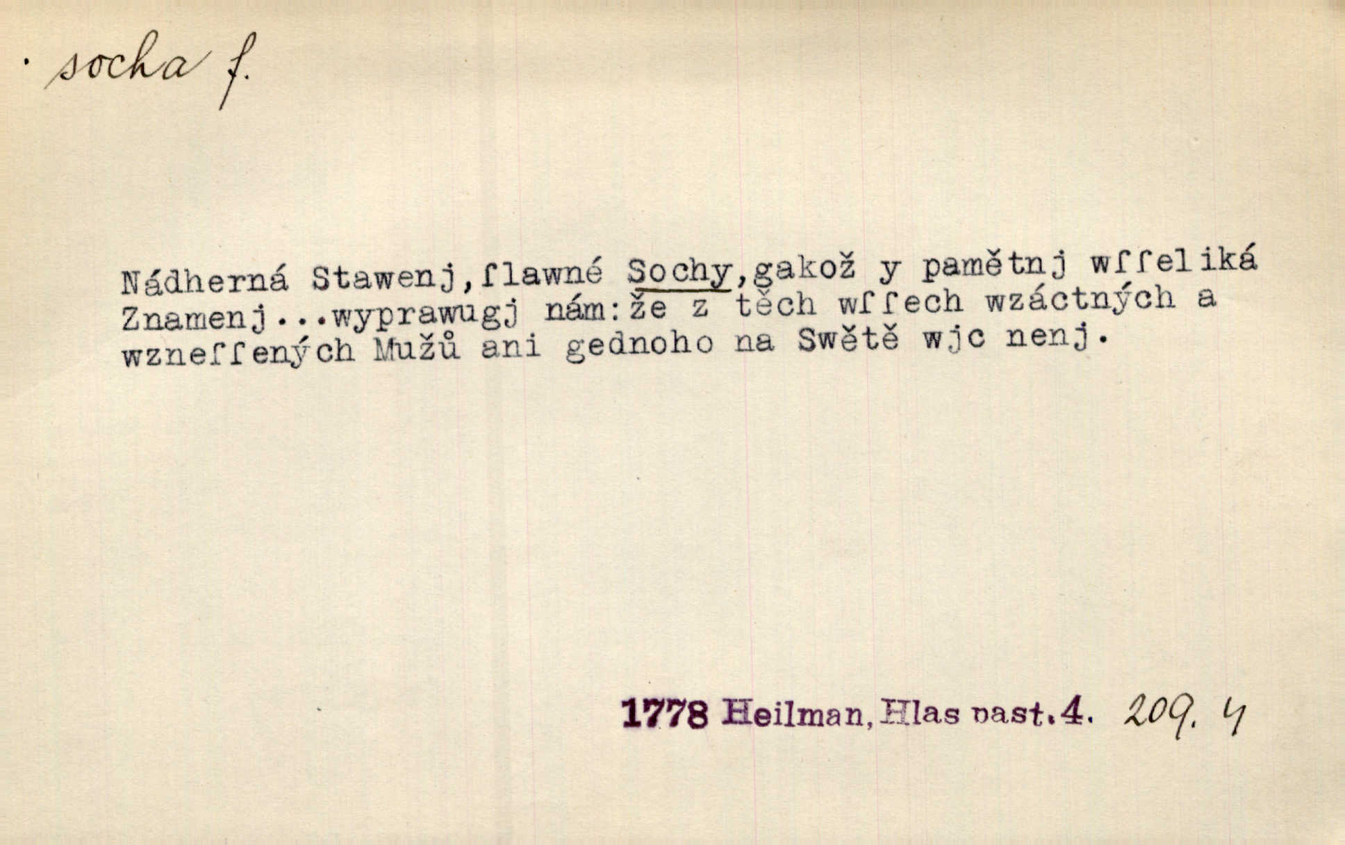 - socha, -y f. lidská n. zvířecí postava zhotovená z kovu, kamene, dřeva a p. Chrám jerusalemský stavěli feničtí cizinci, socha a obraz byly Mojžíšem zapovězeny. Ner. Hlava mu šla kolem, když viděl tolik pozlacených soch, velikých lamp. Prav. Hrabcová stála u kamen jako socha nepohnutě, ztrnule. Herb. Ledecký poslouchal baronku pokojně jako socha. Šmil. Kráčel vedle ní jako bezduchá socha tiše, sklesle. Šmil. Přen. Litoval jsem ubohé sestřenky, že v nevinné zaslepenosti dala se připoutati k tak prázdné soše k bezduchému člověku. Her. D podpora, obyč. dřevěná, s horním koncem dvojitým. Haluze jabloní jsou jakoby zbytečně podepřeny sochami, protože není sněhu, který by je přetížil. Lid. nov. Les. postranní kůly a stahovačka, kterými se udržuje v hranicích vyrovnané palivové dřevo. D v starších dobách dřevěná rozsocha, upravená jako oradlo. Aby je zkypřili [půdy]‚ k tomu jim dostačovalo dřevěné oradlo, jemuž říkali „socha“. Hol. D část kuše, na níž byl upevněn luk. As ve XII. století vznikl z luku samostříl, kuše či lučiště, které mimo luku bylo opatřeno dřevěnou sochou, upomínající tvarem na pažbu dnešních palných zbraní. A. Břez.