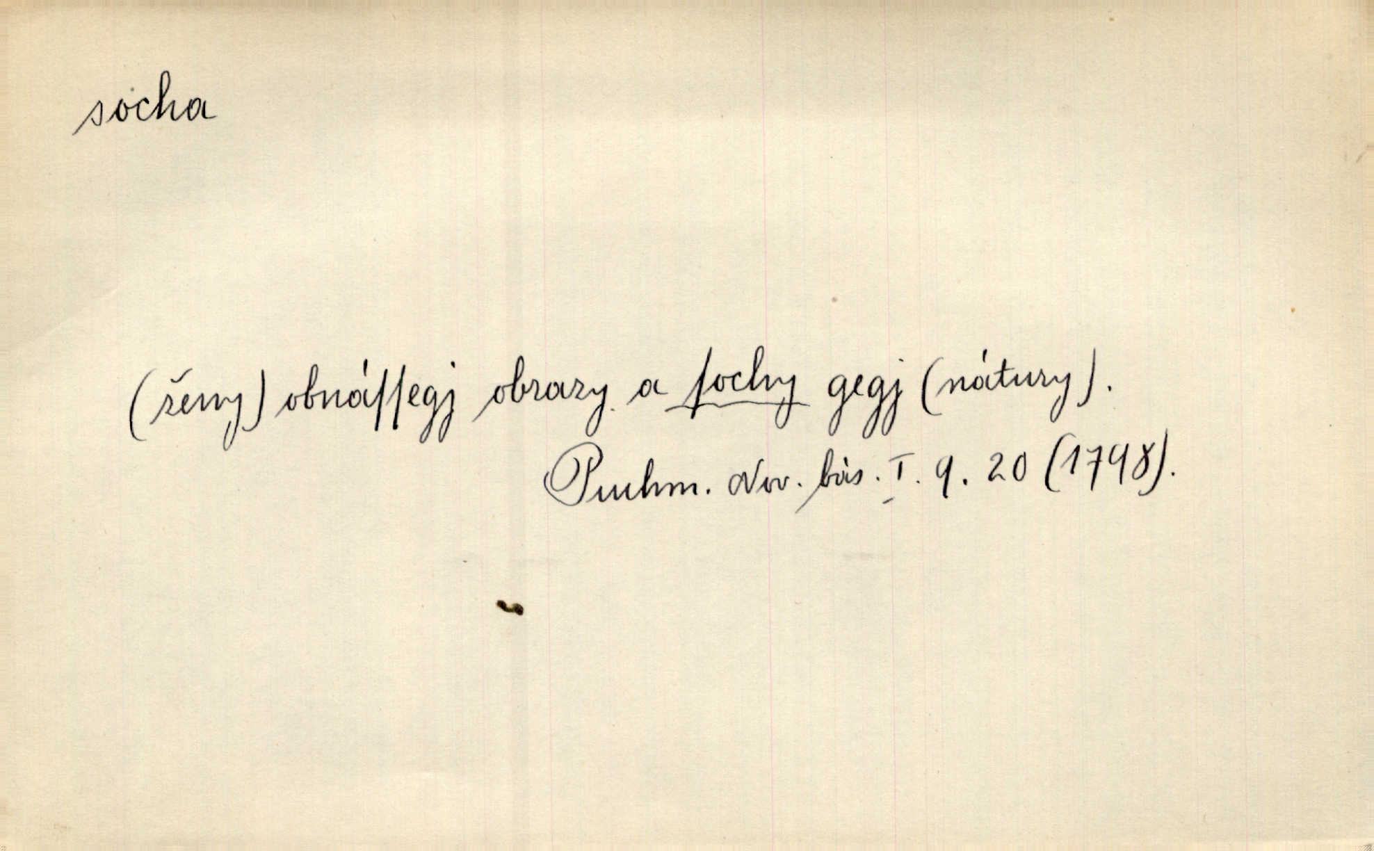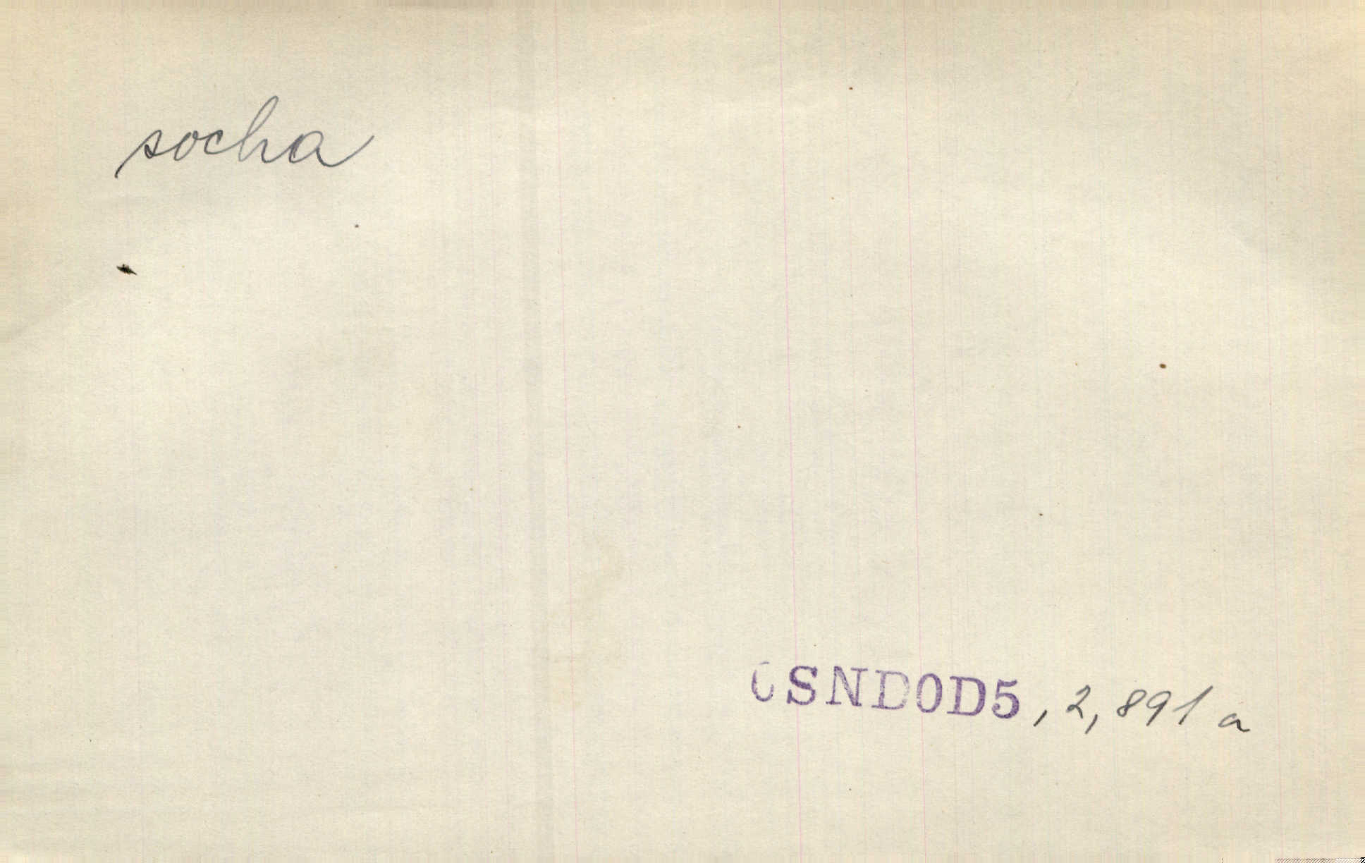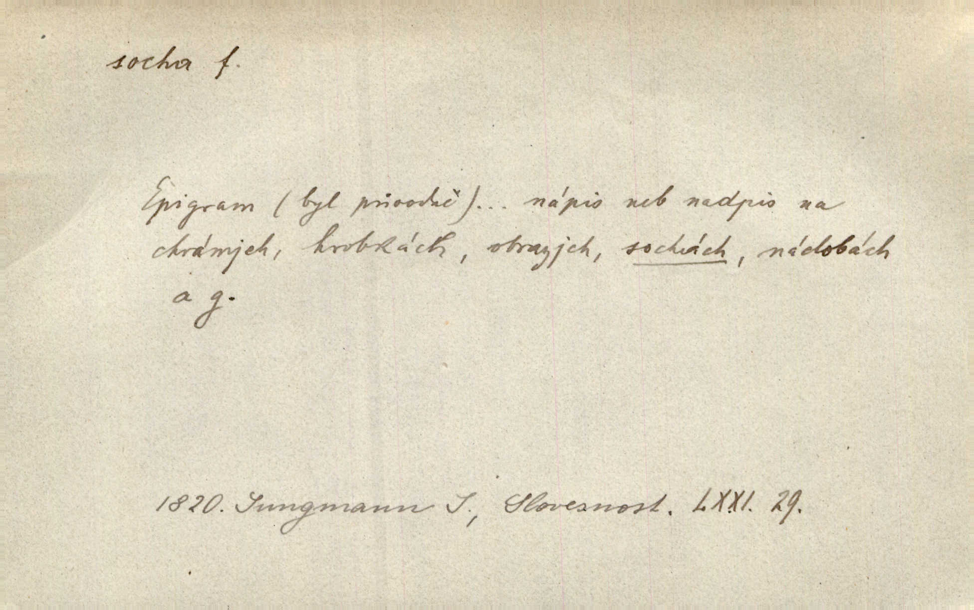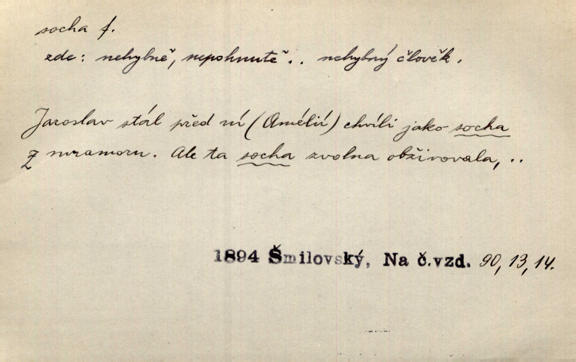 - socha, -y f. lidská n. zvířecí postava zhotovená z kovu, kamene, dřeva a p. Chrám jerusalemský stavěli feničtí cizinci, socha a obraz byly Mojžíšem zapovězeny. Ner. Hlava mu šla kolem, když viděl tolik pozlacených soch, velikých lamp. Prav. Hrabcová stála u kamen jako socha nepohnutě, ztrnule. Herb. Ledecký poslouchal baronku pokojně jako socha. Šmil. Kráčel vedle ní jako bezduchá socha tiše, sklesle. Šmil. Přen. Litoval jsem ubohé sestřenky, že v nevinné zaslepenosti dala se připoutati k tak prázdné soše k bezduchému člověku. Her. D podpora, obyč. dřevěná, s horním koncem dvojitým. Haluze jabloní jsou jakoby zbytečně podepřeny sochami, protože není sněhu, který by je přetížil. Lid. nov. Les. postranní kůly a stahovačka, kterými se udržuje v hranicích vyrovnané palivové dřevo. D v starších dobách dřevěná rozsocha, upravená jako oradlo. Aby je zkypřili [půdy]‚ k tomu jim dostačovalo dřevěné oradlo, jemuž říkali „socha“. Hol. D část kuše, na níž byl upevněn luk. As ve XII. století vznikl z luku samostříl, kuše či lučiště, které mimo luku bylo opatřeno dřevěnou sochou, upomínající tvarem na pažbu dnešních palných zbraní. A. Břez.
