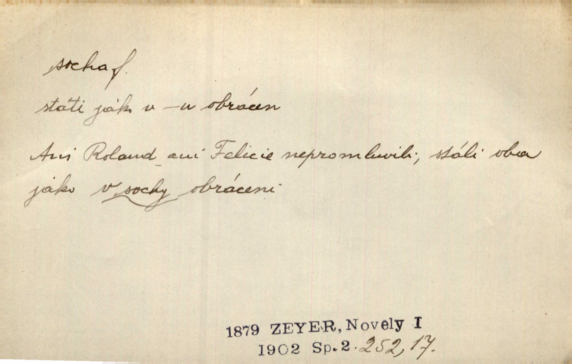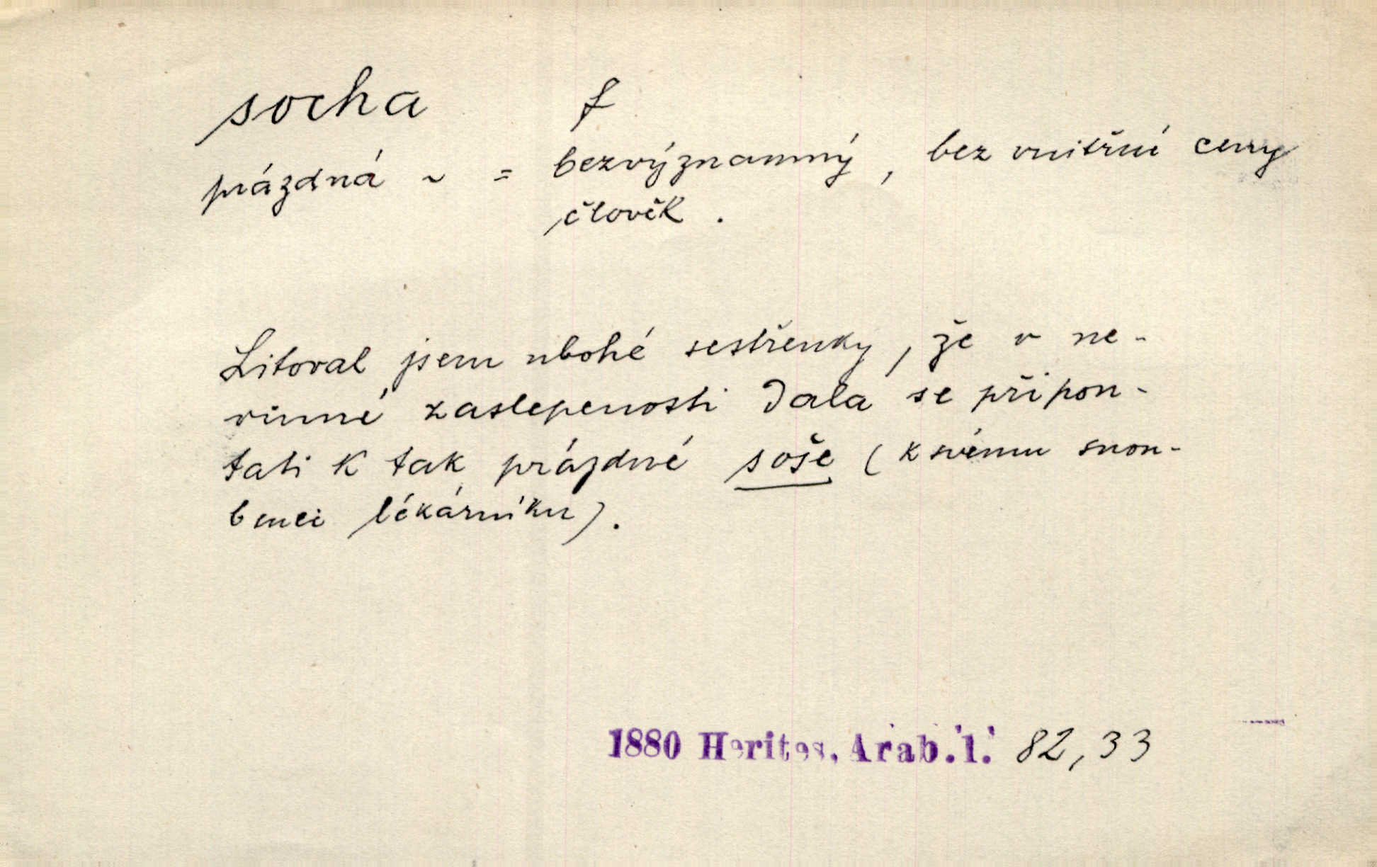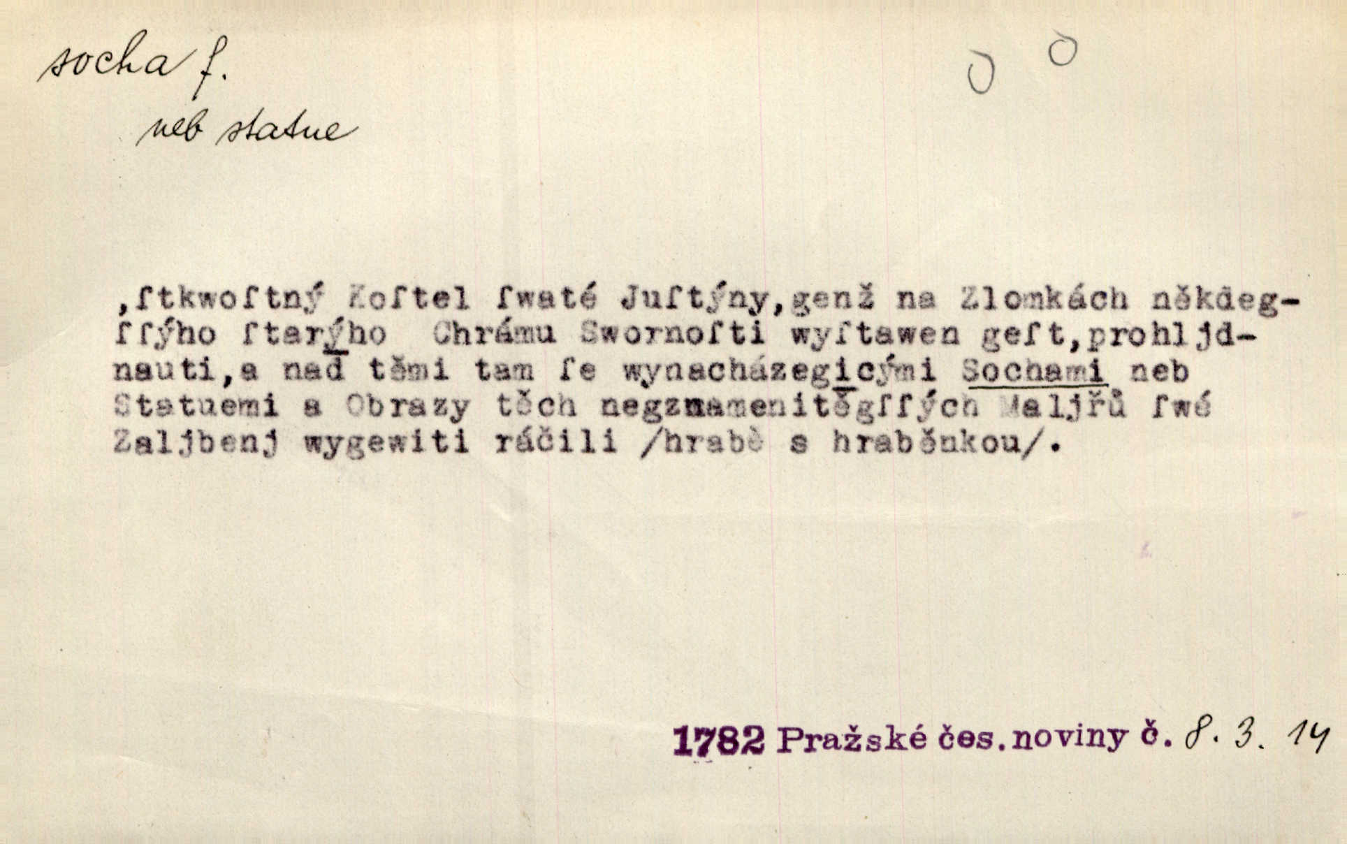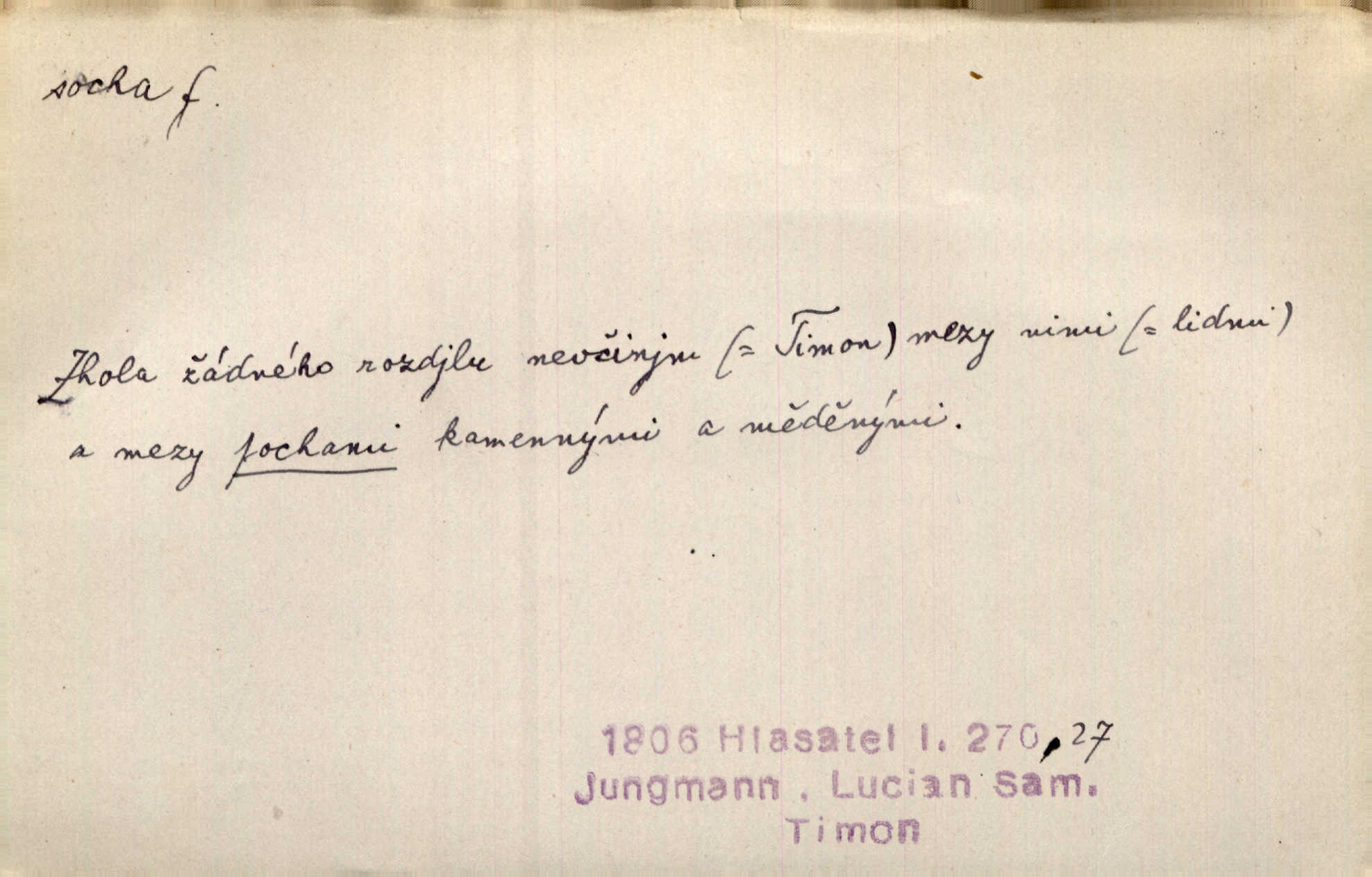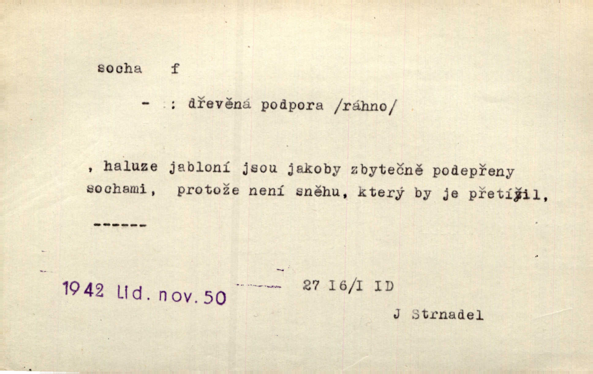 - socha, -y f. lidská n. zvířecí postava zhotovená z kovu, kamene, dřeva a p. Chrám jerusalemský stavěli feničtí cizinci, socha a obraz byly Mojžíšem zapovězeny. Ner. Hlava mu šla kolem, když viděl tolik pozlacených soch, velikých lamp. Prav. Hrabcová stála u kamen jako socha nepohnutě, ztrnule. Herb. Ledecký poslouchal baronku pokojně jako socha. Šmil. Kráčel vedle ní jako bezduchá socha tiše, sklesle. Šmil. Přen. Litoval jsem ubohé sestřenky, že v nevinné zaslepenosti dala se připoutati k tak prázdné soše k bezduchému člověku. Her. D podpora, obyč. dřevěná, s horním koncem dvojitým. Haluze jabloní jsou jakoby zbytečně podepřeny sochami, protože není sněhu, který by je přetížil. Lid. nov. Les. postranní kůly a stahovačka, kterými se udržuje v hranicích vyrovnané palivové dřevo. D v starších dobách dřevěná rozsocha, upravená jako oradlo. Aby je zkypřili [půdy]‚ k tomu jim dostačovalo dřevěné oradlo, jemuž říkali „socha“. Hol. D část kuše, na níž byl upevněn luk. As ve XII. století vznikl z luku samostříl, kuše či lučiště, které mimo luku bylo opatřeno dřevěnou sochou, upomínající tvarem na pažbu dnešních palných zbraní. A. Břez.