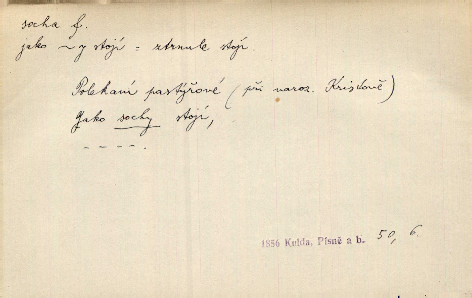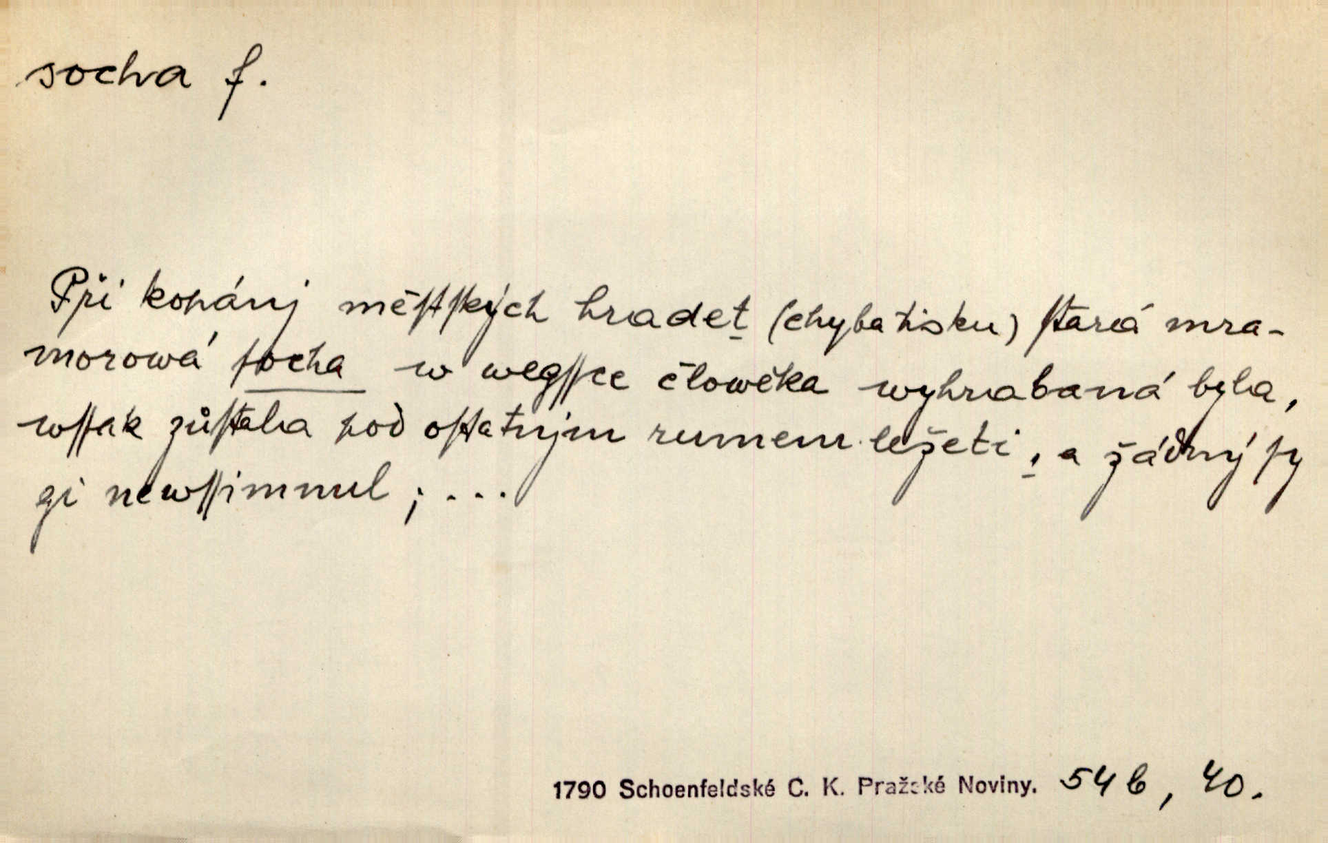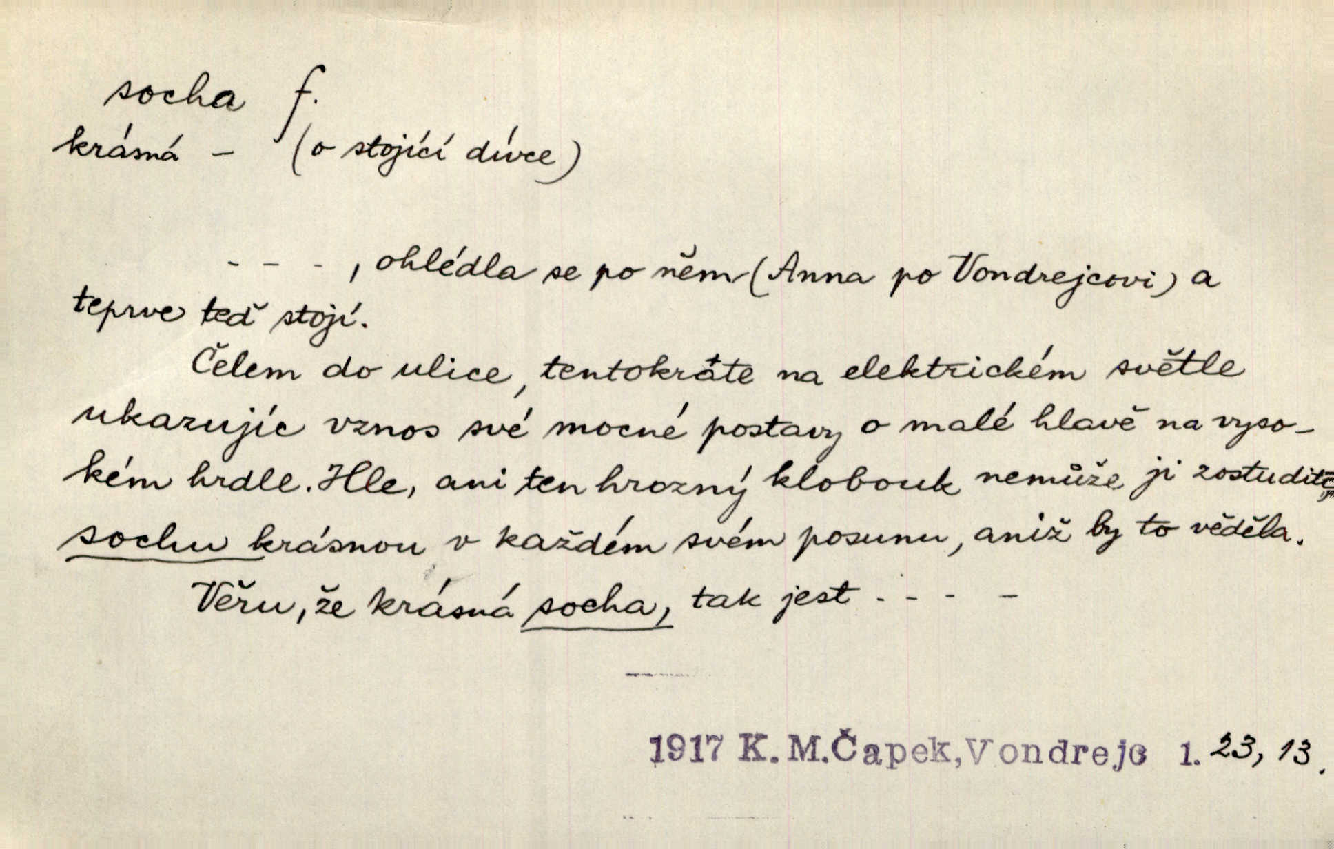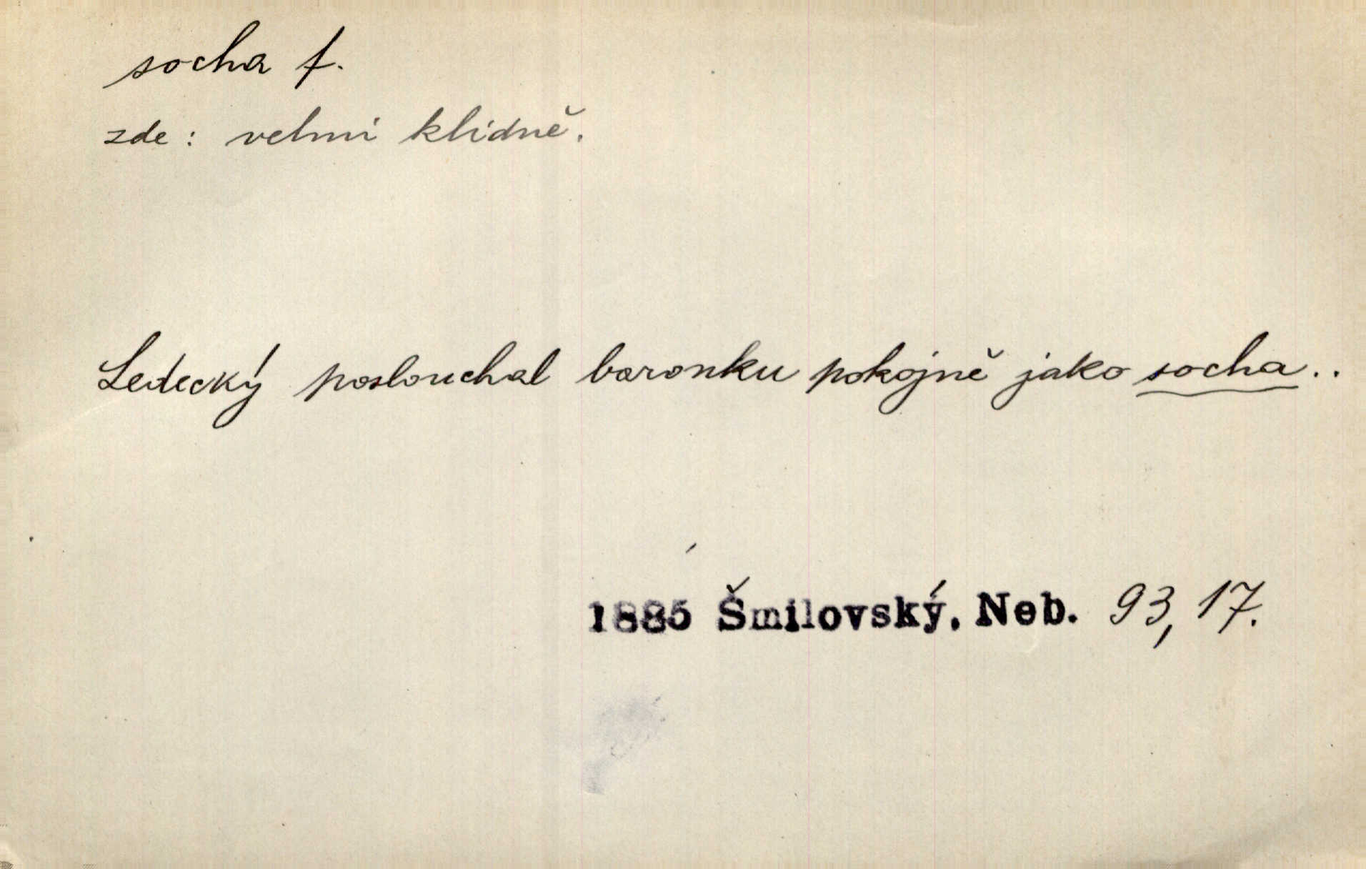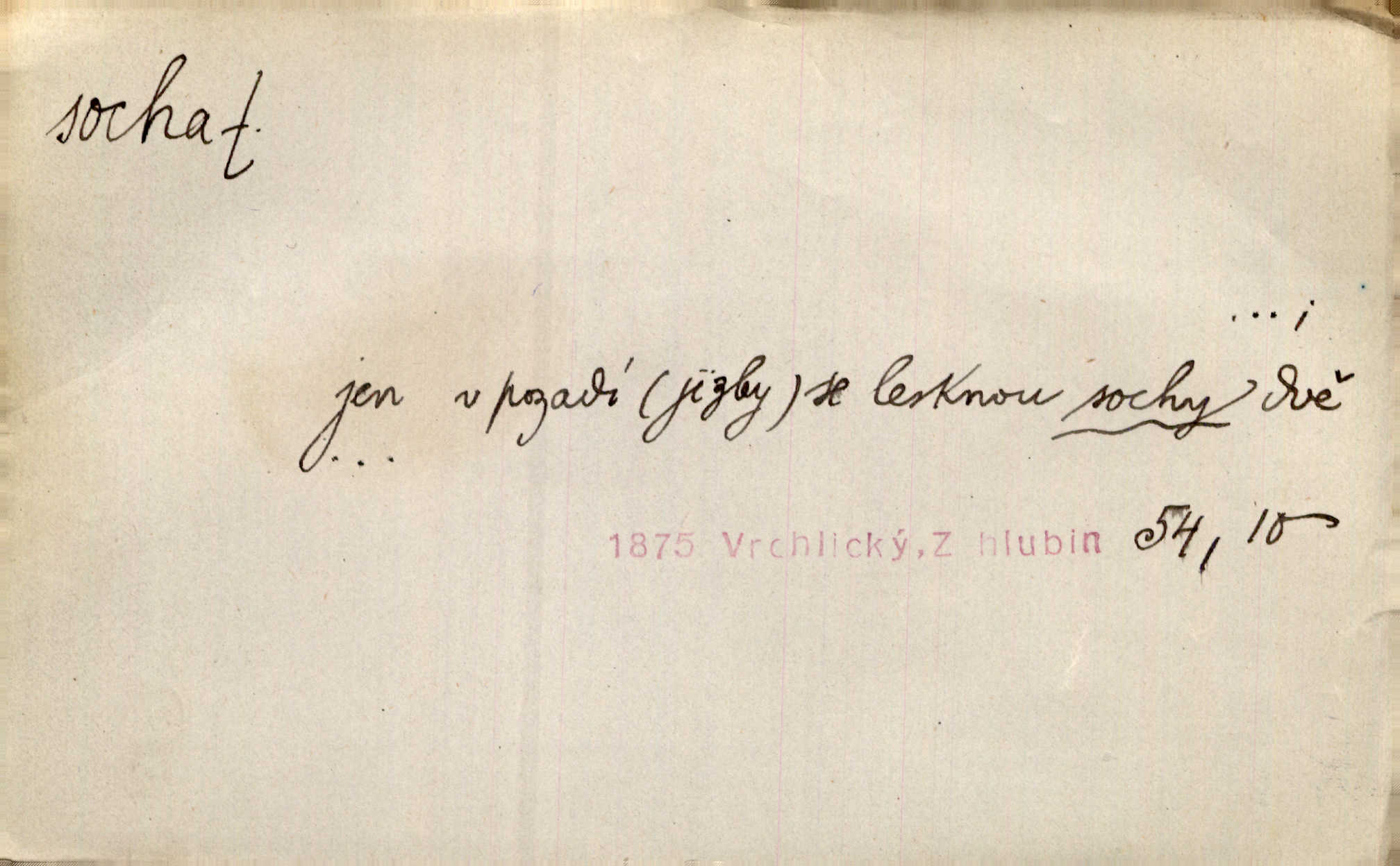 - socha, -y f. lidská n. zvířecí postava zhotovená z kovu, kamene, dřeva a p. Chrám jerusalemský stavěli feničtí cizinci, socha a obraz byly Mojžíšem zapovězeny. Ner. Hlava mu šla kolem, když viděl tolik pozlacených soch, velikých lamp. Prav. Hrabcová stála u kamen jako socha nepohnutě, ztrnule. Herb. Ledecký poslouchal baronku pokojně jako socha. Šmil. Kráčel vedle ní jako bezduchá socha tiše, sklesle. Šmil. Přen. Litoval jsem ubohé sestřenky, že v nevinné zaslepenosti dala se připoutati k tak prázdné soše k bezduchému člověku. Her. D podpora, obyč. dřevěná, s horním koncem dvojitým. Haluze jabloní jsou jakoby zbytečně podepřeny sochami, protože není sněhu, který by je přetížil. Lid. nov. Les. postranní kůly a stahovačka, kterými se udržuje v hranicích vyrovnané palivové dřevo. D v starších dobách dřevěná rozsocha, upravená jako oradlo. Aby je zkypřili [půdy]‚ k tomu jim dostačovalo dřevěné oradlo, jemuž říkali „socha“. Hol. D část kuše, na níž byl upevněn luk. As ve XII. století vznikl z luku samostříl, kuše či lučiště, které mimo luku bylo opatřeno dřevěnou sochou, upomínající tvarem na pažbu dnešních palných zbraní. A. Břez.