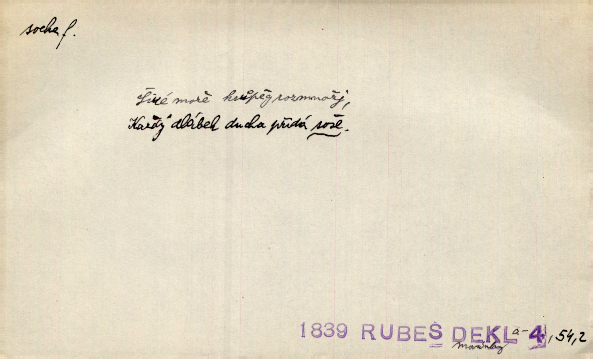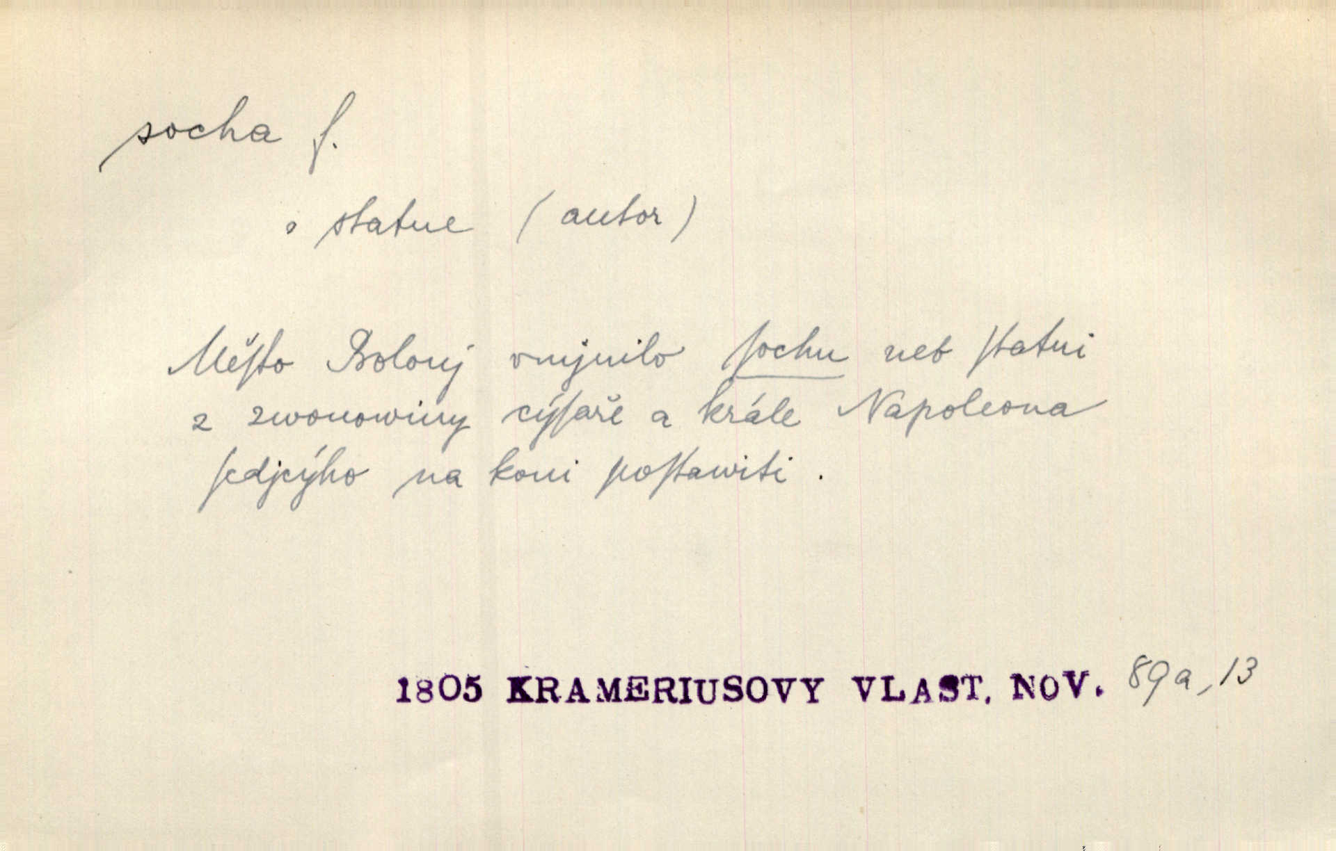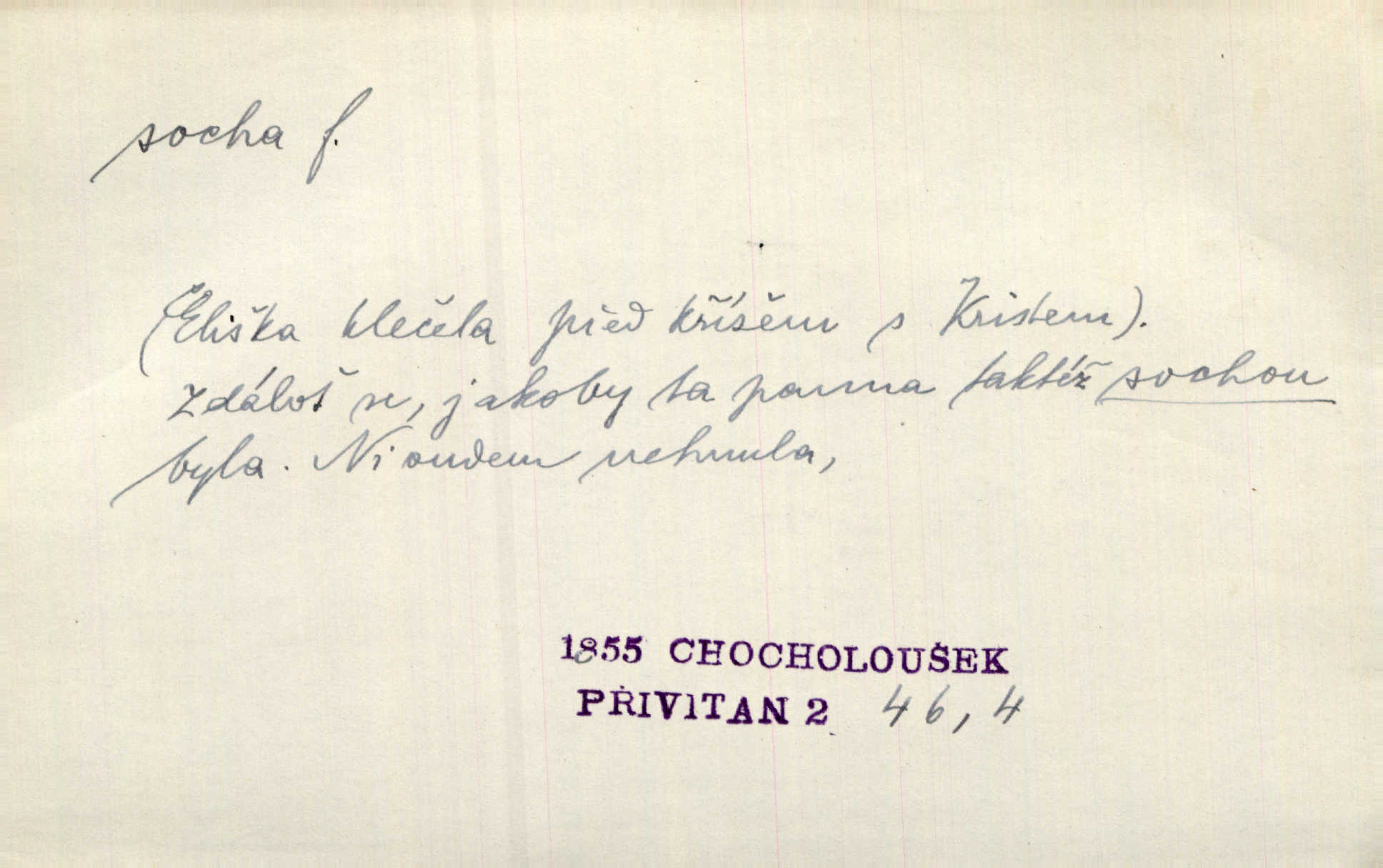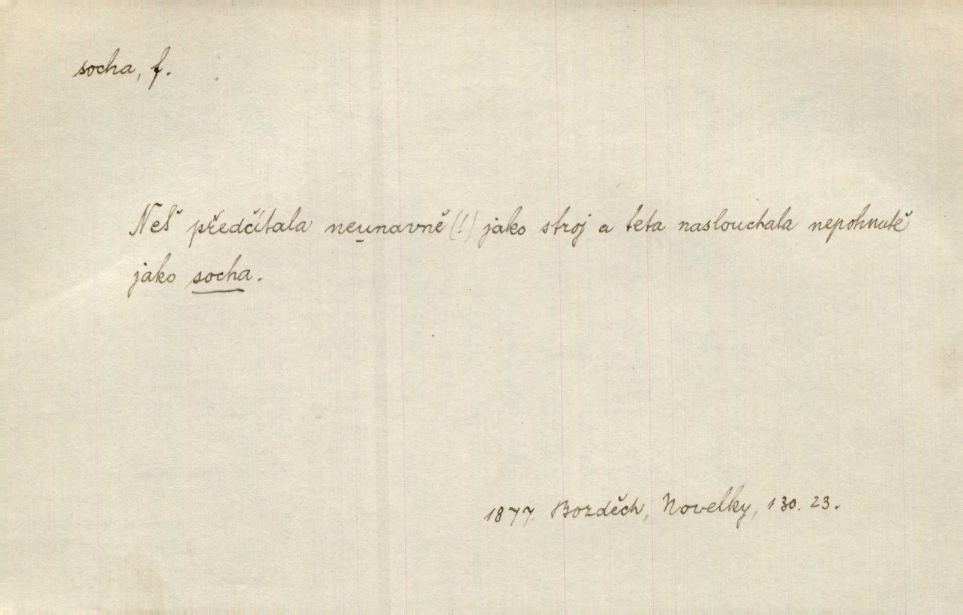 - socha, -y f. lidská n. zvířecí postava zhotovená z kovu, kamene, dřeva a p. Chrám jerusalemský stavěli feničtí cizinci, socha a obraz byly Mojžíšem zapovězeny. Ner. Hlava mu šla kolem, když viděl tolik pozlacených soch, velikých lamp. Prav. Hrabcová stála u kamen jako socha nepohnutě, ztrnule. Herb. Ledecký poslouchal baronku pokojně jako socha. Šmil. Kráčel vedle ní jako bezduchá socha tiše, sklesle. Šmil. Přen. Litoval jsem ubohé sestřenky, že v nevinné zaslepenosti dala se připoutati k tak prázdné soše k bezduchému člověku. Her. D podpora, obyč. dřevěná, s horním koncem dvojitým. Haluze jabloní jsou jakoby zbytečně podepřeny sochami, protože není sněhu, který by je přetížil. Lid. nov. Les. postranní kůly a stahovačka, kterými se udržuje v hranicích vyrovnané palivové dřevo. D v starších dobách dřevěná rozsocha, upravená jako oradlo. Aby je zkypřili [půdy]‚ k tomu jim dostačovalo dřevěné oradlo, jemuž říkali „socha“. Hol. D část kuše, na níž byl upevněn luk. As ve XII. století vznikl z luku samostříl, kuše či lučiště, které mimo luku bylo opatřeno dřevěnou sochou, upomínající tvarem na pažbu dnešních palných zbraní. A. Břez.
