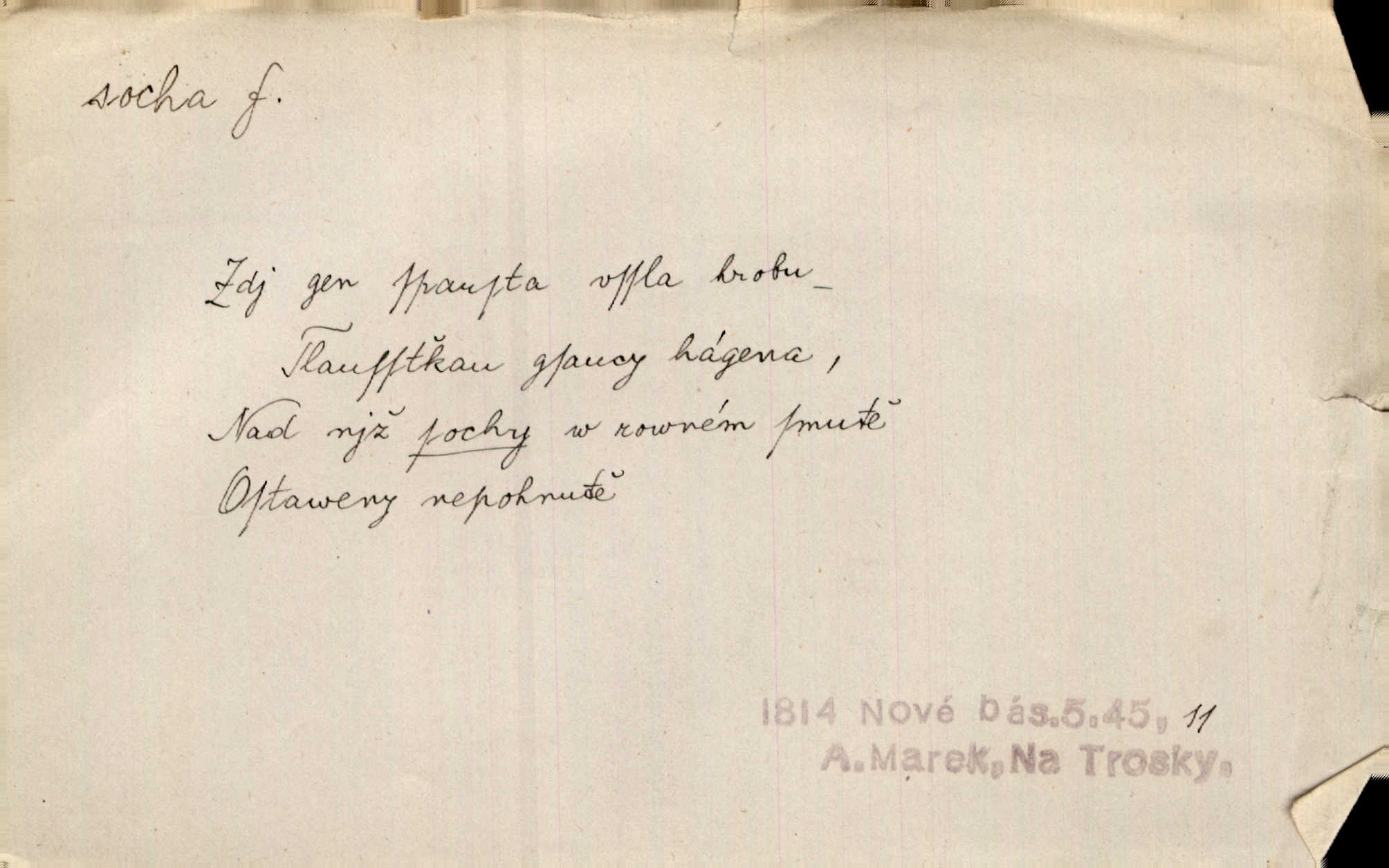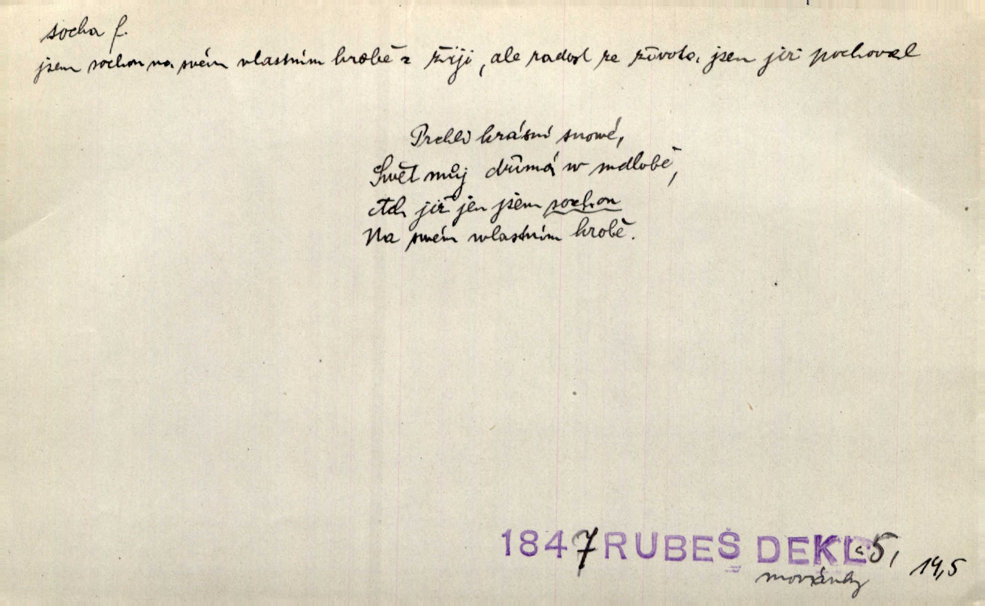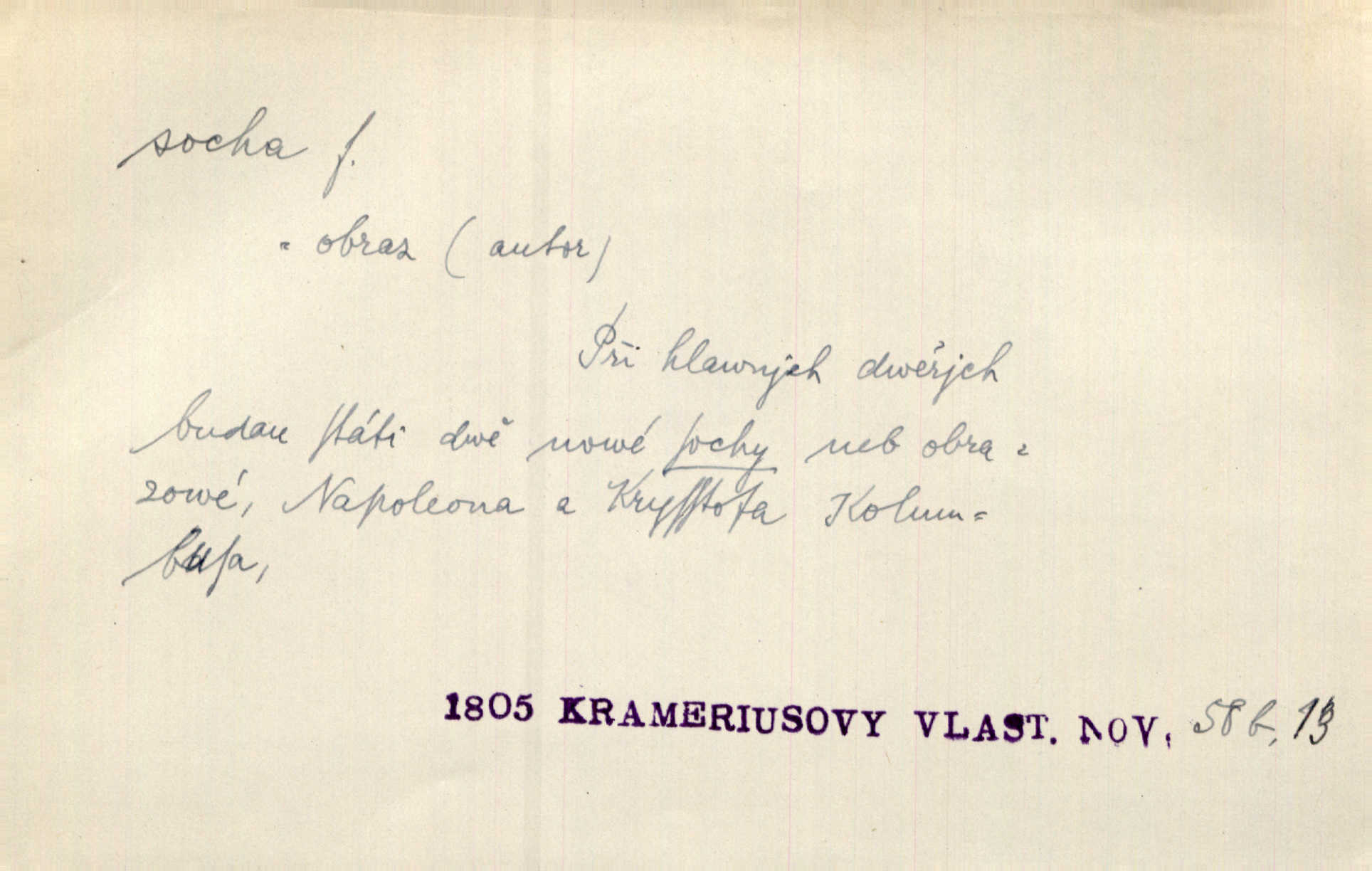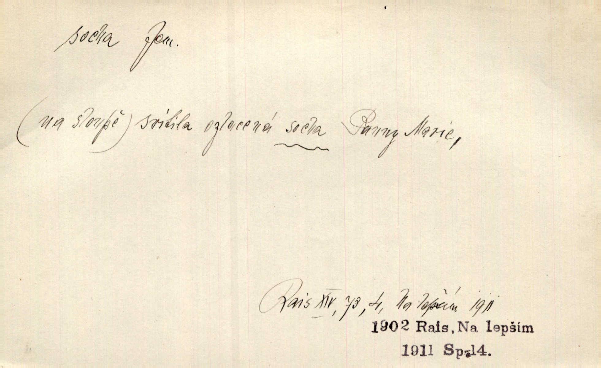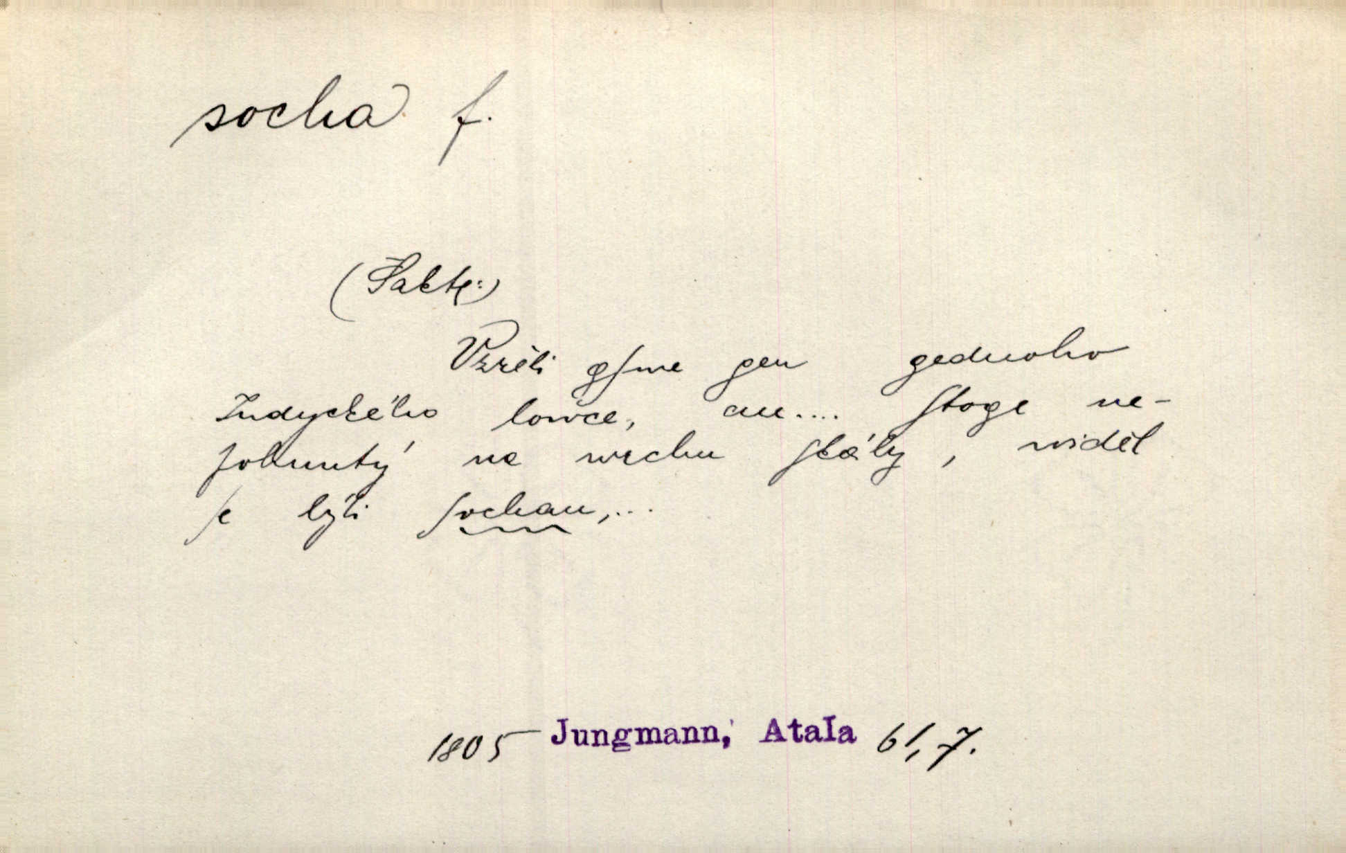 - socha, -y f. lidská n. zvířecí postava zhotovená z kovu, kamene, dřeva a p. Chrám jerusalemský stavěli feničtí cizinci, socha a obraz byly Mojžíšem zapovězeny. Ner. Hlava mu šla kolem, když viděl tolik pozlacených soch, velikých lamp. Prav. Hrabcová stála u kamen jako socha nepohnutě, ztrnule. Herb. Ledecký poslouchal baronku pokojně jako socha. Šmil. Kráčel vedle ní jako bezduchá socha tiše, sklesle. Šmil. Přen. Litoval jsem ubohé sestřenky, že v nevinné zaslepenosti dala se připoutati k tak prázdné soše k bezduchému člověku. Her. D podpora, obyč. dřevěná, s horním koncem dvojitým. Haluze jabloní jsou jakoby zbytečně podepřeny sochami, protože není sněhu, který by je přetížil. Lid. nov. Les. postranní kůly a stahovačka, kterými se udržuje v hranicích vyrovnané palivové dřevo. D v starších dobách dřevěná rozsocha, upravená jako oradlo. Aby je zkypřili [půdy]‚ k tomu jim dostačovalo dřevěné oradlo, jemuž říkali „socha“. Hol. D část kuše, na níž byl upevněn luk. As ve XII. století vznikl z luku samostříl, kuše či lučiště, které mimo luku bylo opatřeno dřevěnou sochou, upomínající tvarem na pažbu dnešních palných zbraní. A. Břez.