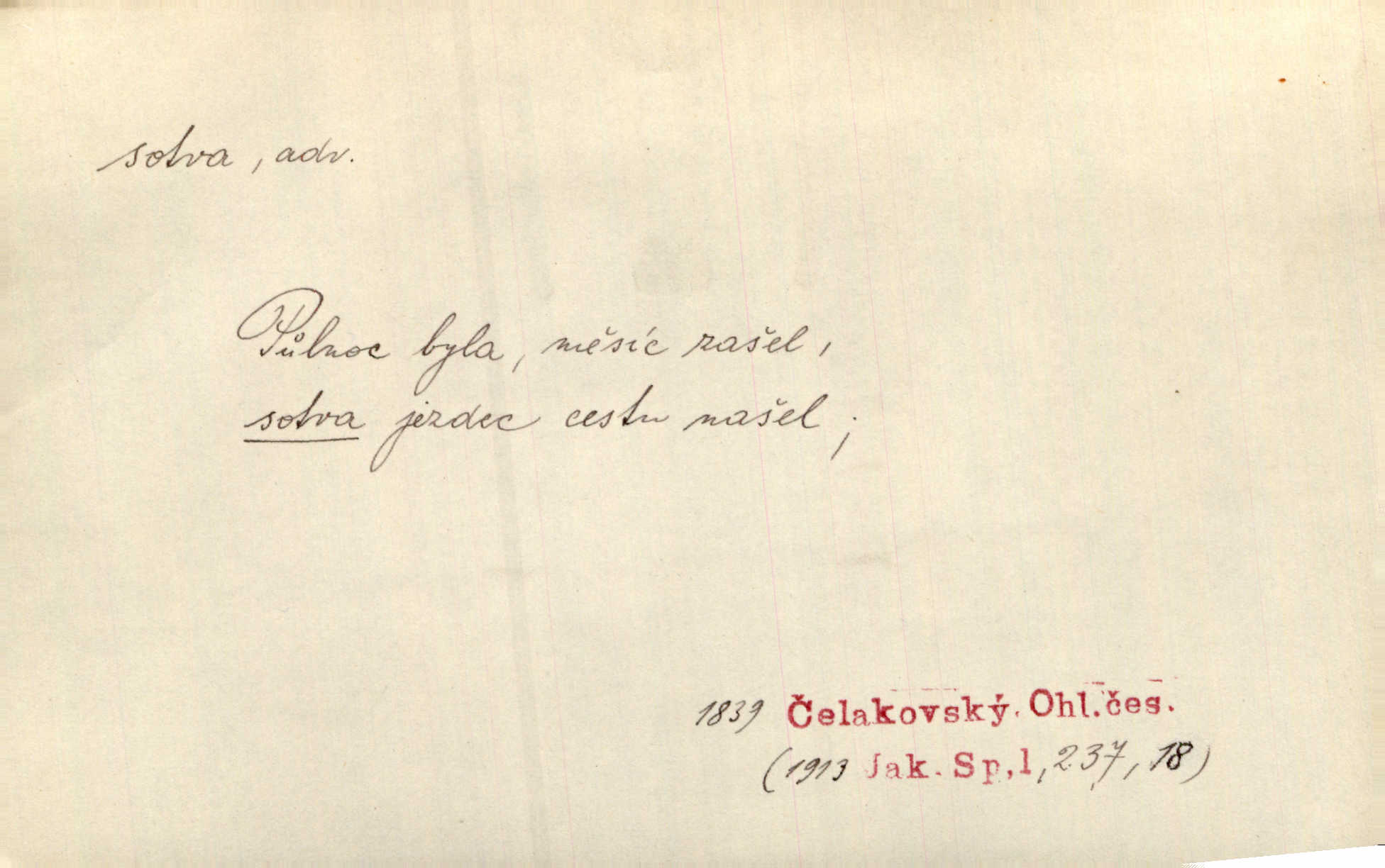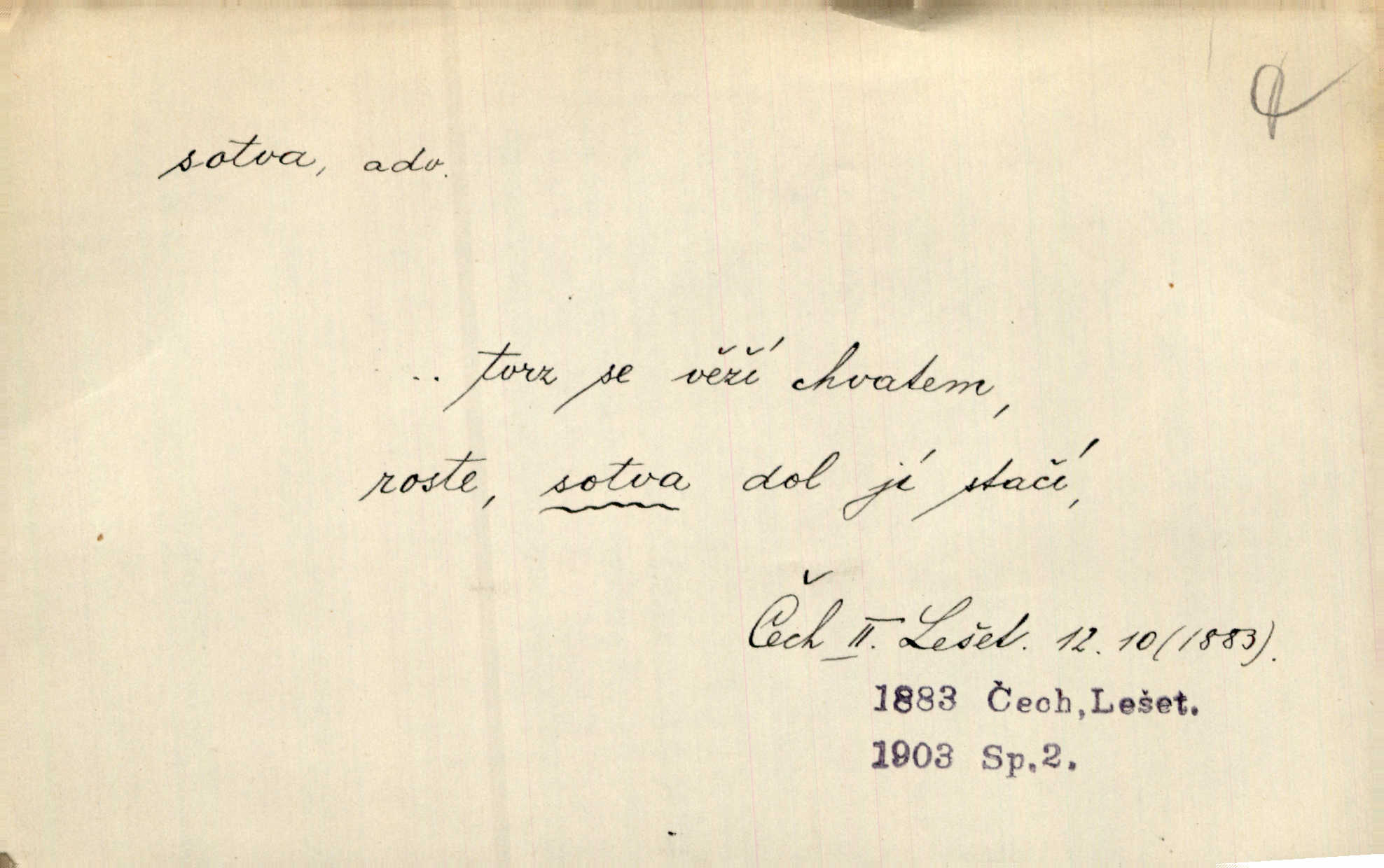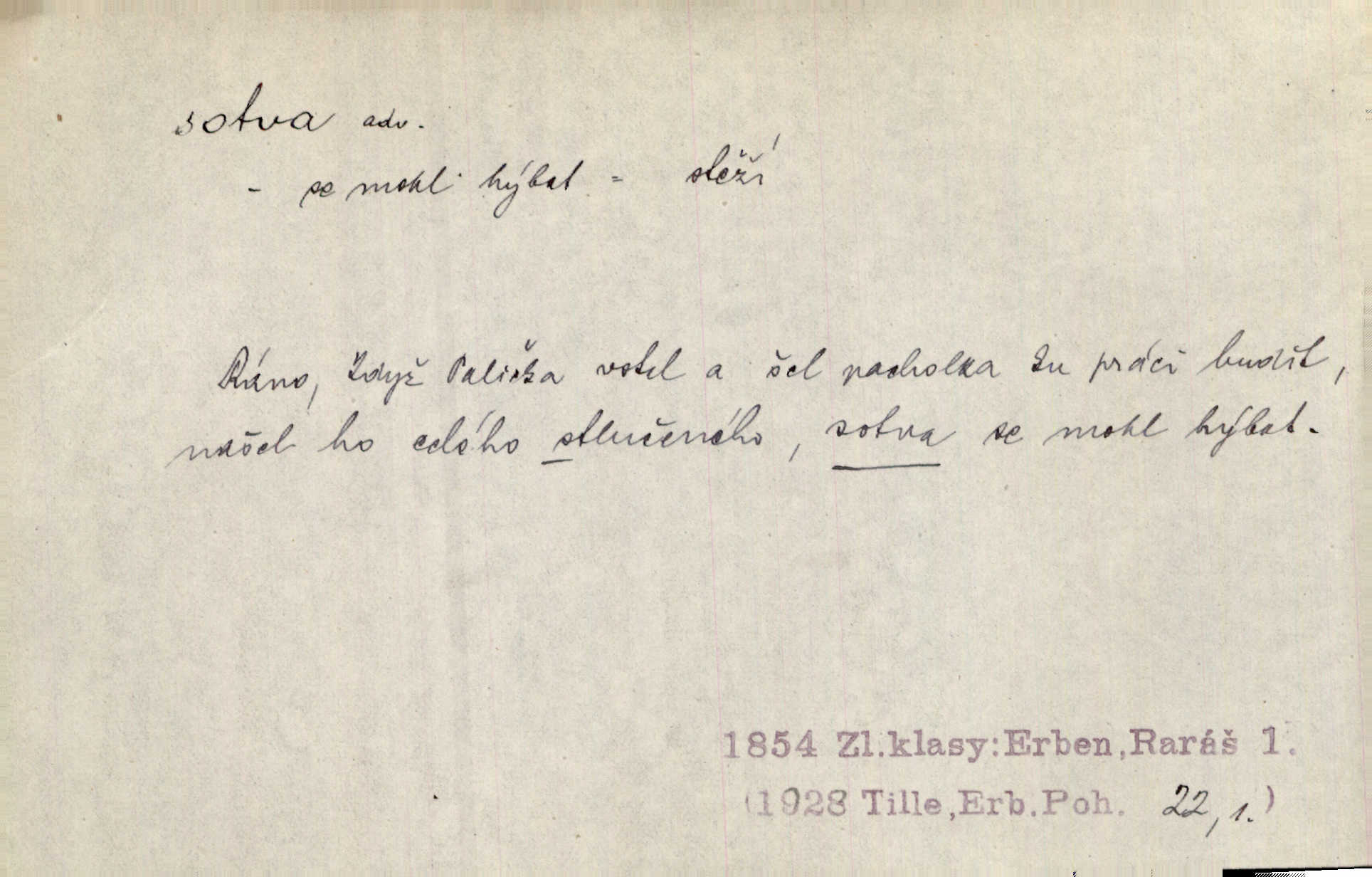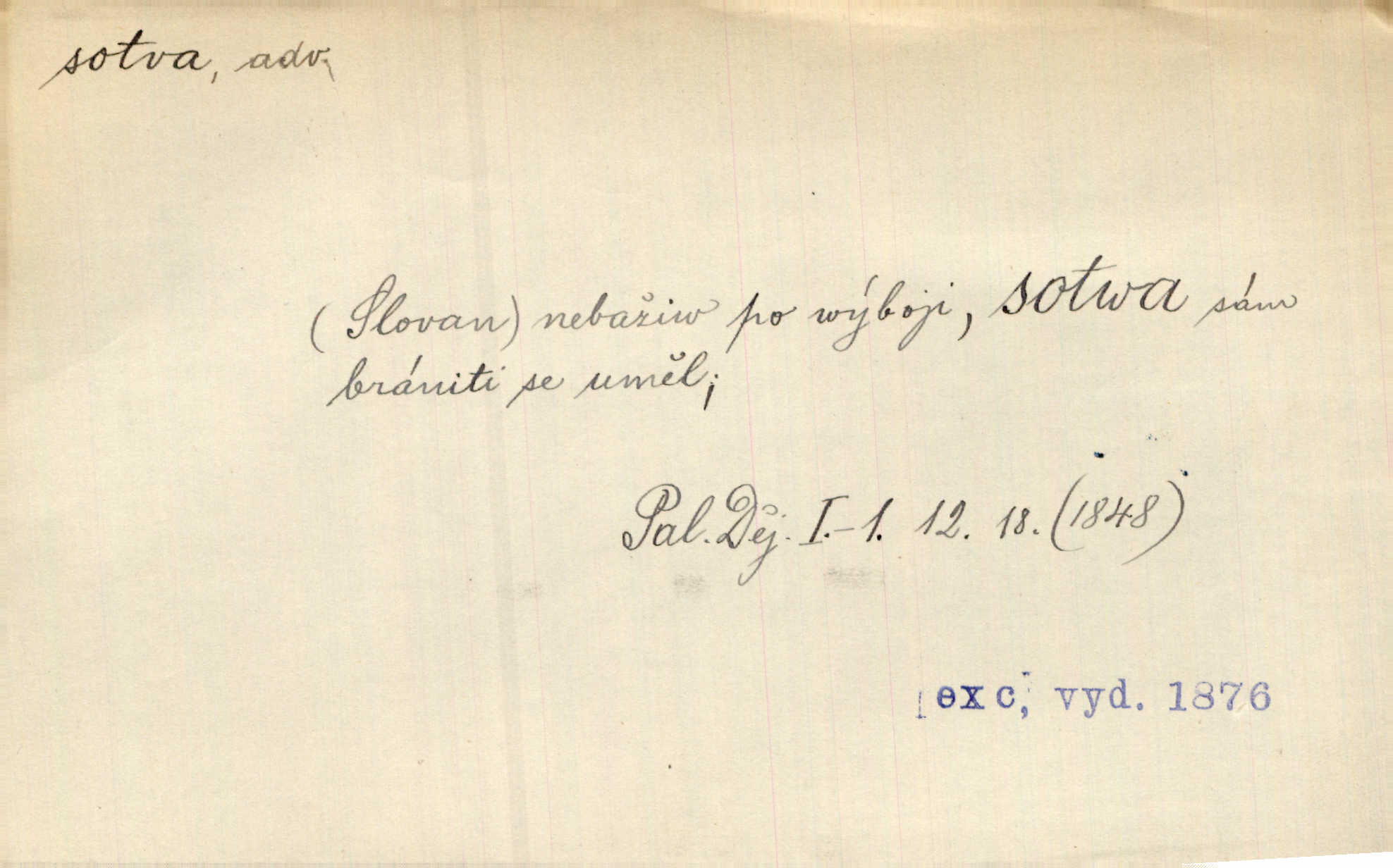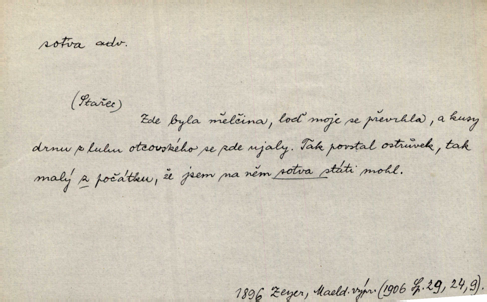 - sotva (poněk. zast. sotvy) adv. stěží, s námahou, těžce. Babička chudák stará sotva se vyškrábala. Něm. Já už taky kolikrát sotva lezu. Rais. Béře, béře ze hromady — klín již plný, sotva vstává. Erb. Oběma Karlíkům nasekal, že sotva šli. Jir. Vidí před sebou uzounký otvor, takže by se tam velký člověk sotva byl protáhnouti mohl. Něm. Vraziv [do světnice], dechu sotva popadaje jektal: „Maminko —.“ Rais. Mohla sotva ubránit se pláče. Vrch. Sotva ten jazyk že jsme si zachovali, a to ještě ne všichni a ne čistě. Havl. Žebrák sluchu sotvy věří. Staš. D vyjadřuje pochybnost, mírný odpor; asi ne, patrně ne, pravděpodobně nikoli. Kdybys věděla, kde to vlastně sedíš, sotva by se ti tu líbilo. Svět. To se sotva dá upříti, že se mnohá [dívka] snaží, aby zde našla obdivovatele. Hál. Komu není shůry dáno, v apatyce sotva koupí. Hajn. Jaký on je, on sotva uvěří. Jir. Máš na hradě co na práci? Sotva! Jan. [Rozárka:] Či není to zákonu jedno, kdo se dá za vinu potrestat? [Prokop:] To sotva. Tyl. „To on už, prosím, také sotva přijde,“ zněla odpověď. Šim. Od oné noci sotva kdo práh jizby té překročil. Jir. Myslíval, že by mu stará služka sotva čím mohla posloužiti. Jir. Dlouho se tu sotva kdy omeškal. Jir. D vyjadřuje velmi malou míru děje, činnosti, nemnoho, nepatrně, téměř ne. Přečetné obory technické leží ladem vůbec netknuty, nebo jen sotva. Čteme. V zadu naloženy byly dva kufry, které pro otepě sena sotva bylo viděti. Jir. Té noci jsem sotva oka zamhouřil. Jir. Cizinec bydlí na pusté skále, slunce mu sotva zasvítá! Mácha. Nebe stálo jako mramorové, suché listí sotva zašustělo. Herb. Na můj pozdrav sotva poděkovala. Šim. Olga sotva že se ohlédla a usmála. R. Svob. D vyjadřuje těsné dovršení něčeho, jen tak tak. To bylo děvčátko sotva tříleté. Rais. Dvacetiletý panovník oženil se s překrásnou Milenou Vukotićovou, tehdáž sotva čtrnáctiletou. Hol. Zdálo se mu, že leží sotva minutu. Herrm. Vždyť jsem pil sotva sklenici vína. K. Čap. Zpěváci přezpívali sotva dvě sloky. Třeb. Udělal sotva dvacet krokův. Šmil. Mně se nelíbila žádná, neboť mně sotva po kolena dosahovaly. Herb. D nedlouho, nedávno, krátce předtím. Jan Kolářík, mladý mužák sotva ženatý, vezl v zimě na saních dřevo s kopce. Herb. Vypadala jako z hnízda vyhozené, sotva vylíhlé ptáče. R. Svob. Slunce, které bylo sotva vyšlo, zdálo se jí šeré. Zey.