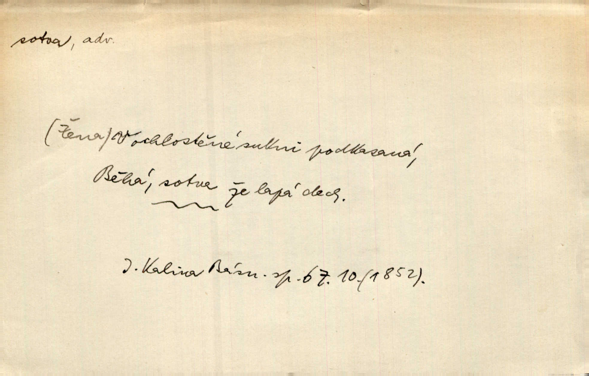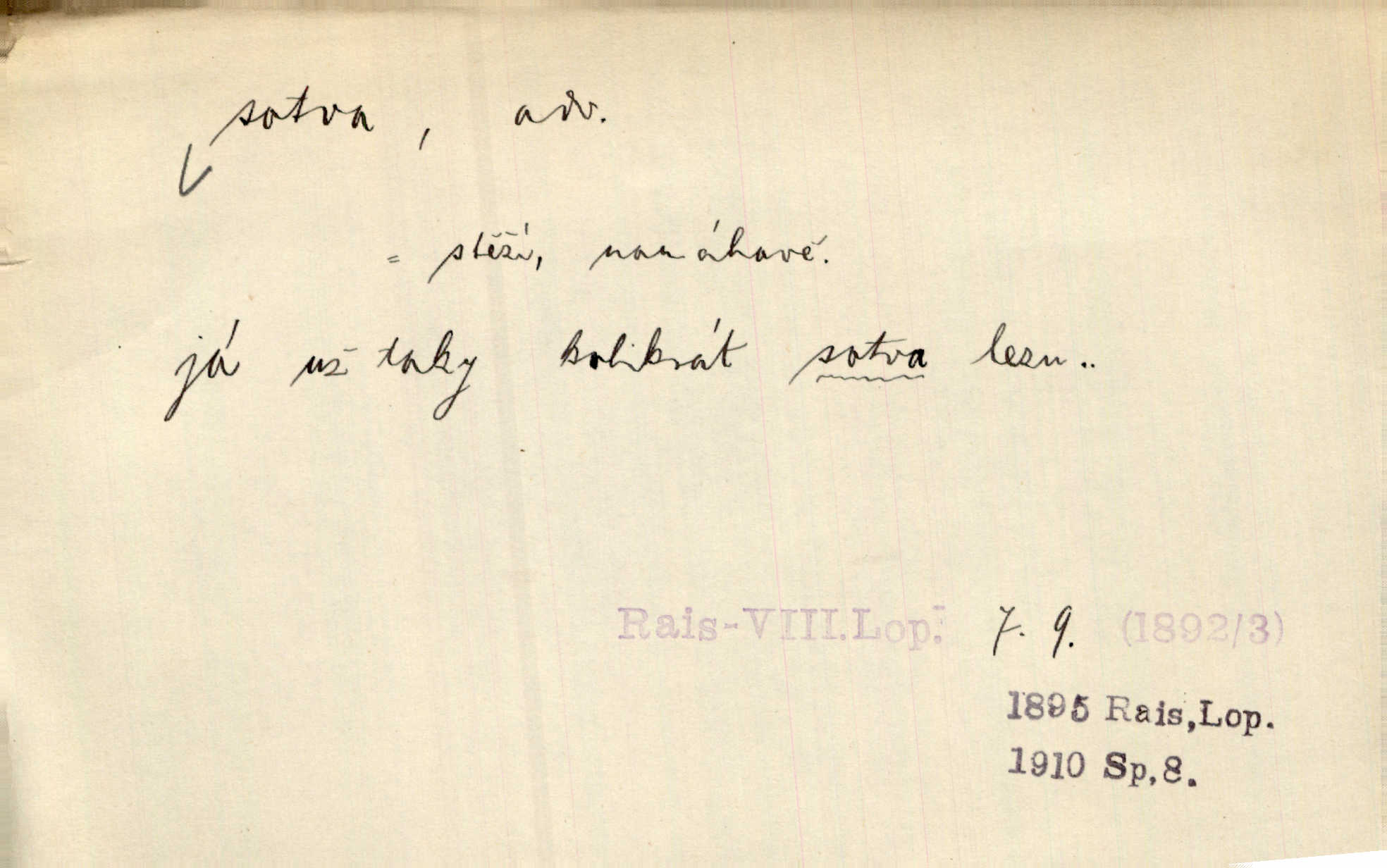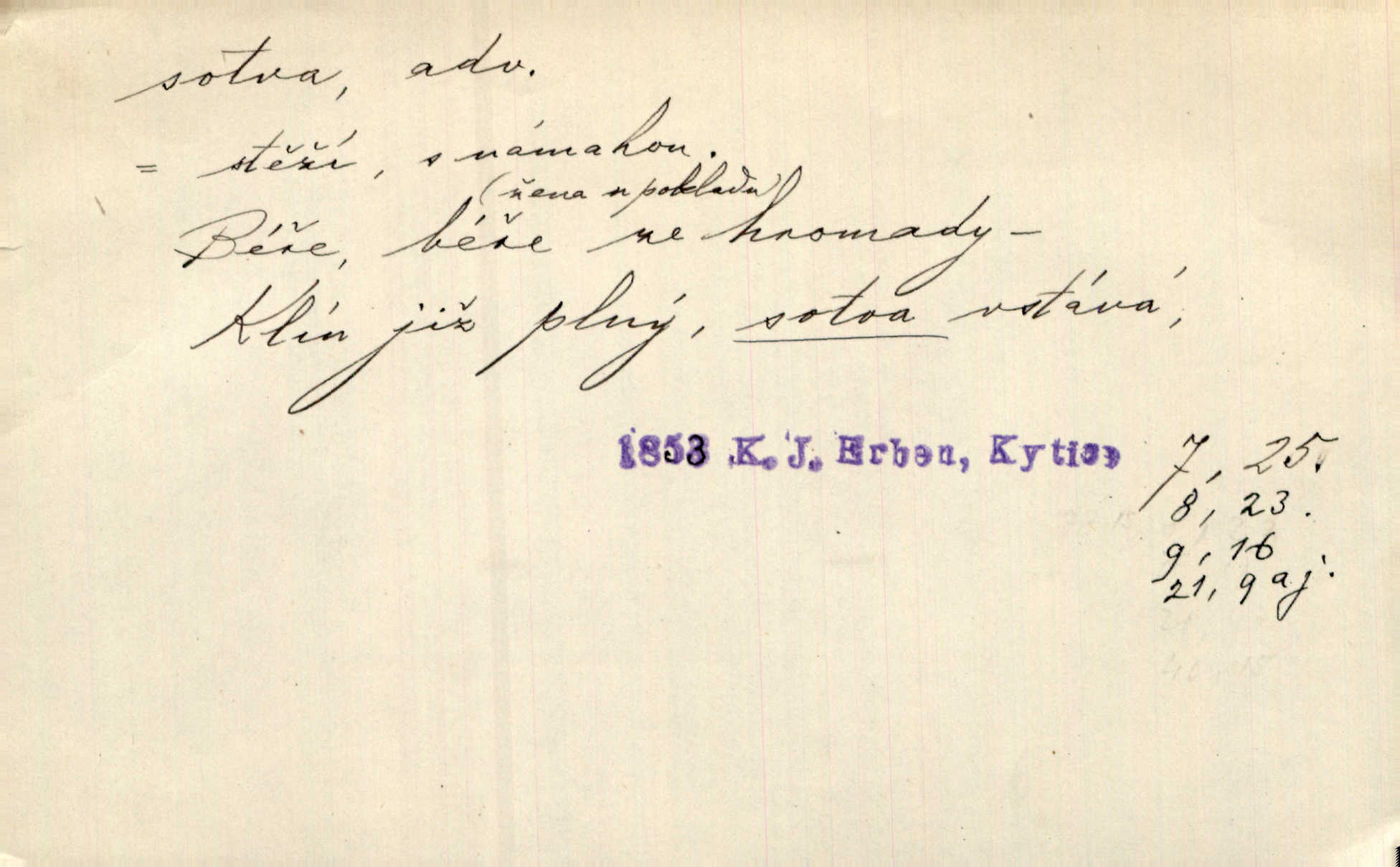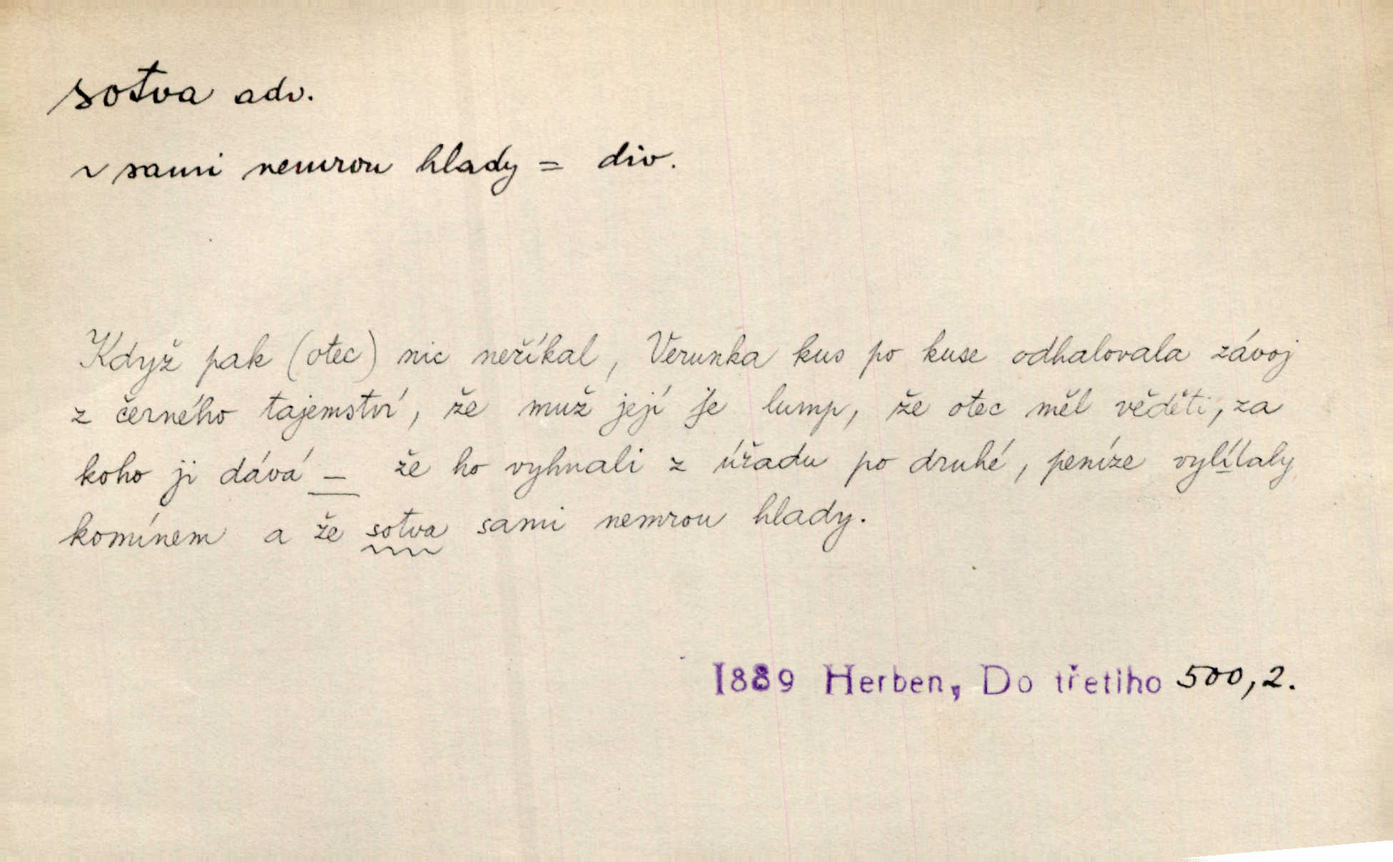 - sotva (poněk. zast. sotvy) adv. stěží, s námahou, těžce. Babička chudák stará sotva se vyškrábala. Něm. Já už taky kolikrát sotva lezu. Rais. Béře, béře ze hromady — klín již plný, sotva vstává. Erb. Oběma Karlíkům nasekal, že sotva šli. Jir. Vidí před sebou uzounký otvor, takže by se tam velký člověk sotva byl protáhnouti mohl. Něm. Vraziv [do světnice], dechu sotva popadaje jektal: „Maminko —.“ Rais. Mohla sotva ubránit se pláče. Vrch. Sotva ten jazyk že jsme si zachovali, a to ještě ne všichni a ne čistě. Havl. Žebrák sluchu sotvy věří. Staš. D vyjadřuje pochybnost, mírný odpor; asi ne, patrně ne, pravděpodobně nikoli. Kdybys věděla, kde to vlastně sedíš, sotva by se ti tu líbilo. Svět. To se sotva dá upříti, že se mnohá [dívka] snaží, aby zde našla obdivovatele. Hál. Komu není shůry dáno, v apatyce sotva koupí. Hajn. Jaký on je, on sotva uvěří. Jir. Máš na hradě co na práci? Sotva! Jan. [Rozárka:] Či není to zákonu jedno, kdo se dá za vinu potrestat? [Prokop:] To sotva. Tyl. „To on už, prosím, také sotva přijde,“ zněla odpověď. Šim. Od oné noci sotva kdo práh jizby té překročil. Jir. Myslíval, že by mu stará služka sotva čím mohla posloužiti. Jir. Dlouho se tu sotva kdy omeškal. Jir. D vyjadřuje velmi malou míru děje, činnosti, nemnoho, nepatrně, téměř ne. Přečetné obory technické leží ladem vůbec netknuty, nebo jen sotva. Čteme. V zadu naloženy byly dva kufry, které pro otepě sena sotva bylo viděti. Jir. Té noci jsem sotva oka zamhouřil. Jir. Cizinec bydlí na pusté skále, slunce mu sotva zasvítá! Mácha. Nebe stálo jako mramorové, suché listí sotva zašustělo. Herb. Na můj pozdrav sotva poděkovala. Šim. Olga sotva že se ohlédla a usmála. R. Svob. D vyjadřuje těsné dovršení něčeho, jen tak tak. To bylo děvčátko sotva tříleté. Rais. Dvacetiletý panovník oženil se s překrásnou Milenou Vukotićovou, tehdáž sotva čtrnáctiletou. Hol. Zdálo se mu, že leží sotva minutu. Herrm. Vždyť jsem pil sotva sklenici vína. K. Čap. Zpěváci přezpívali sotva dvě sloky. Třeb. Udělal sotva dvacet krokův. Šmil. Mně se nelíbila žádná, neboť mně sotva po kolena dosahovaly. Herb. D nedlouho, nedávno, krátce předtím. Jan Kolářík, mladý mužák sotva ženatý, vezl v zimě na saních dřevo s kopce. Herb. Vypadala jako z hnízda vyhozené, sotva vylíhlé ptáče. R. Svob. Slunce, které bylo sotva vyšlo, zdálo se jí šeré. Zey.