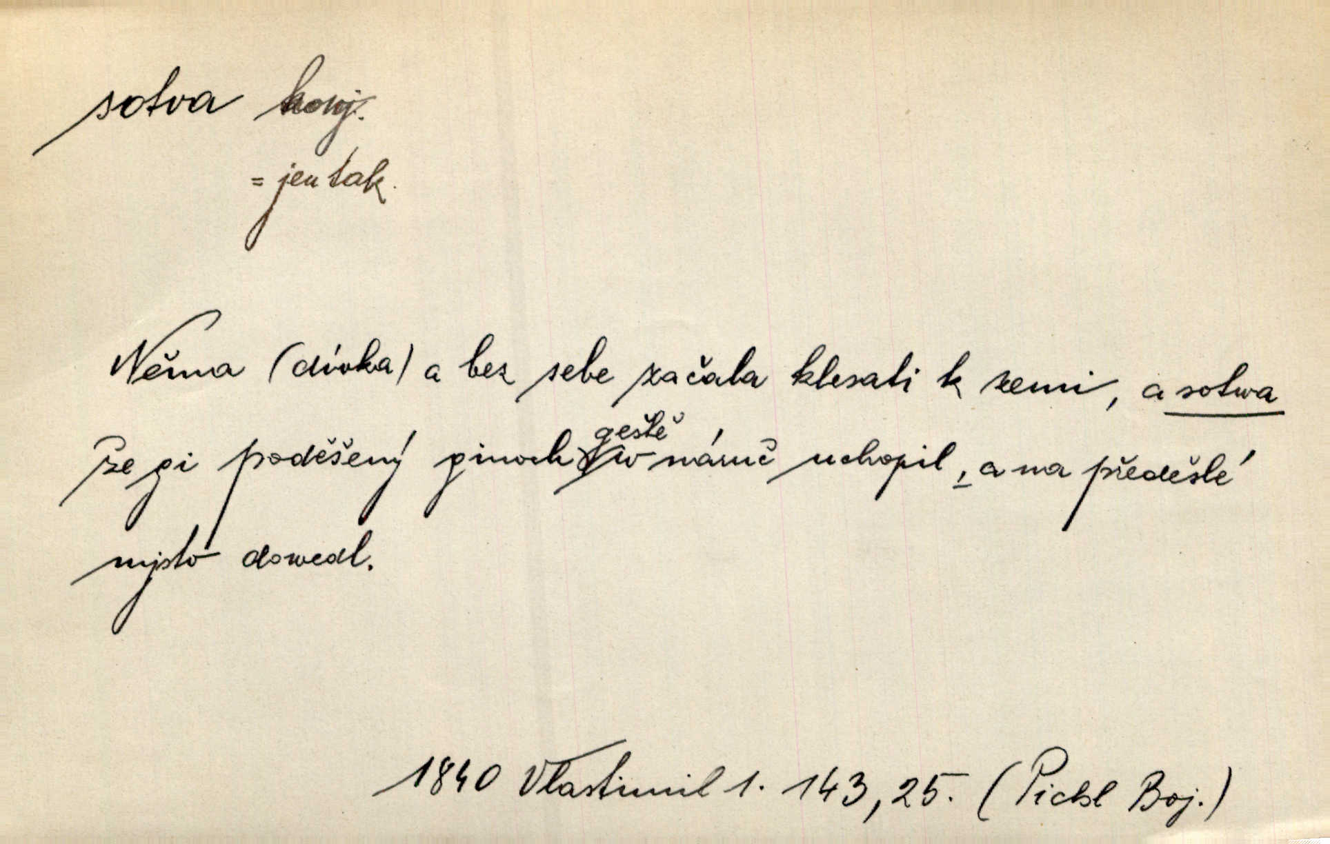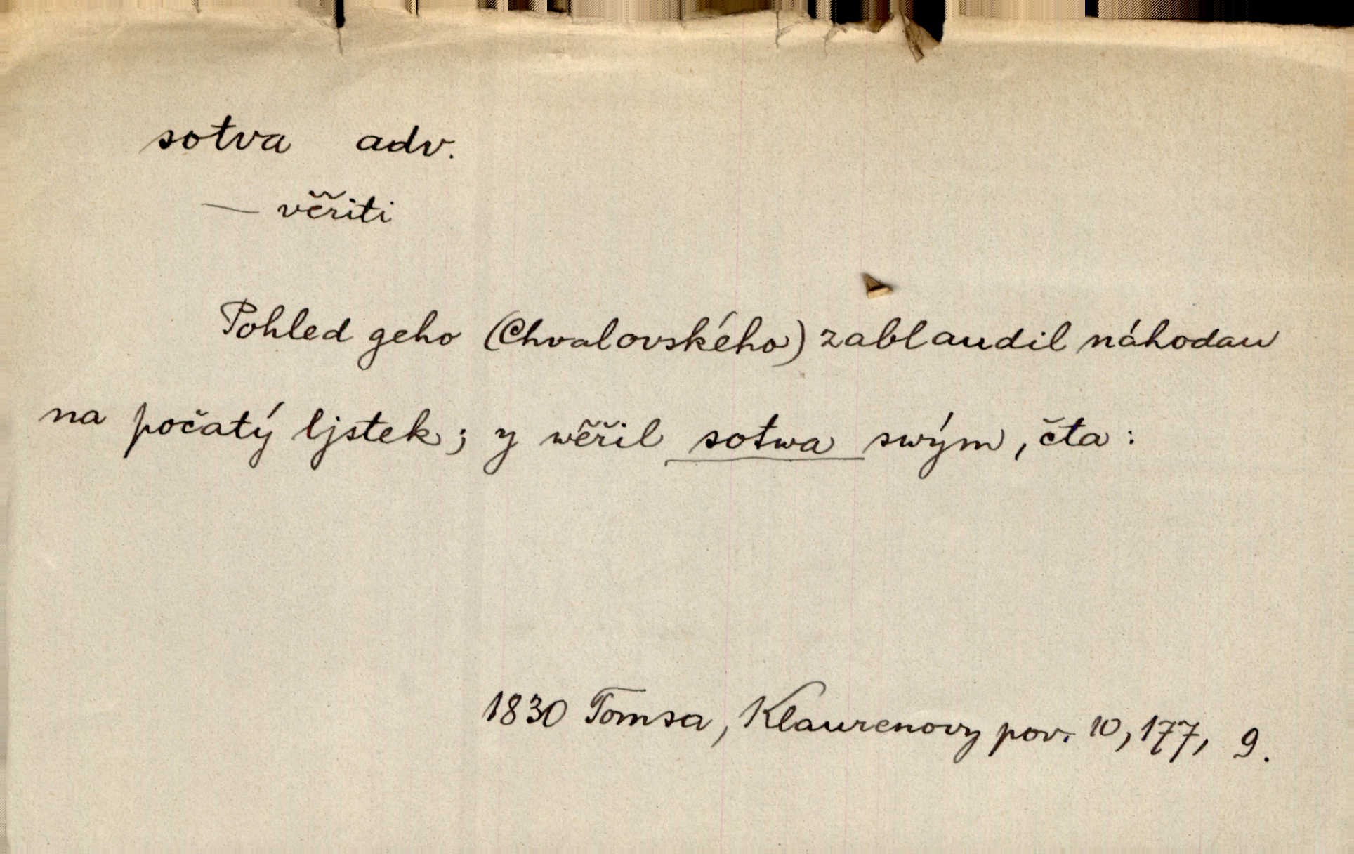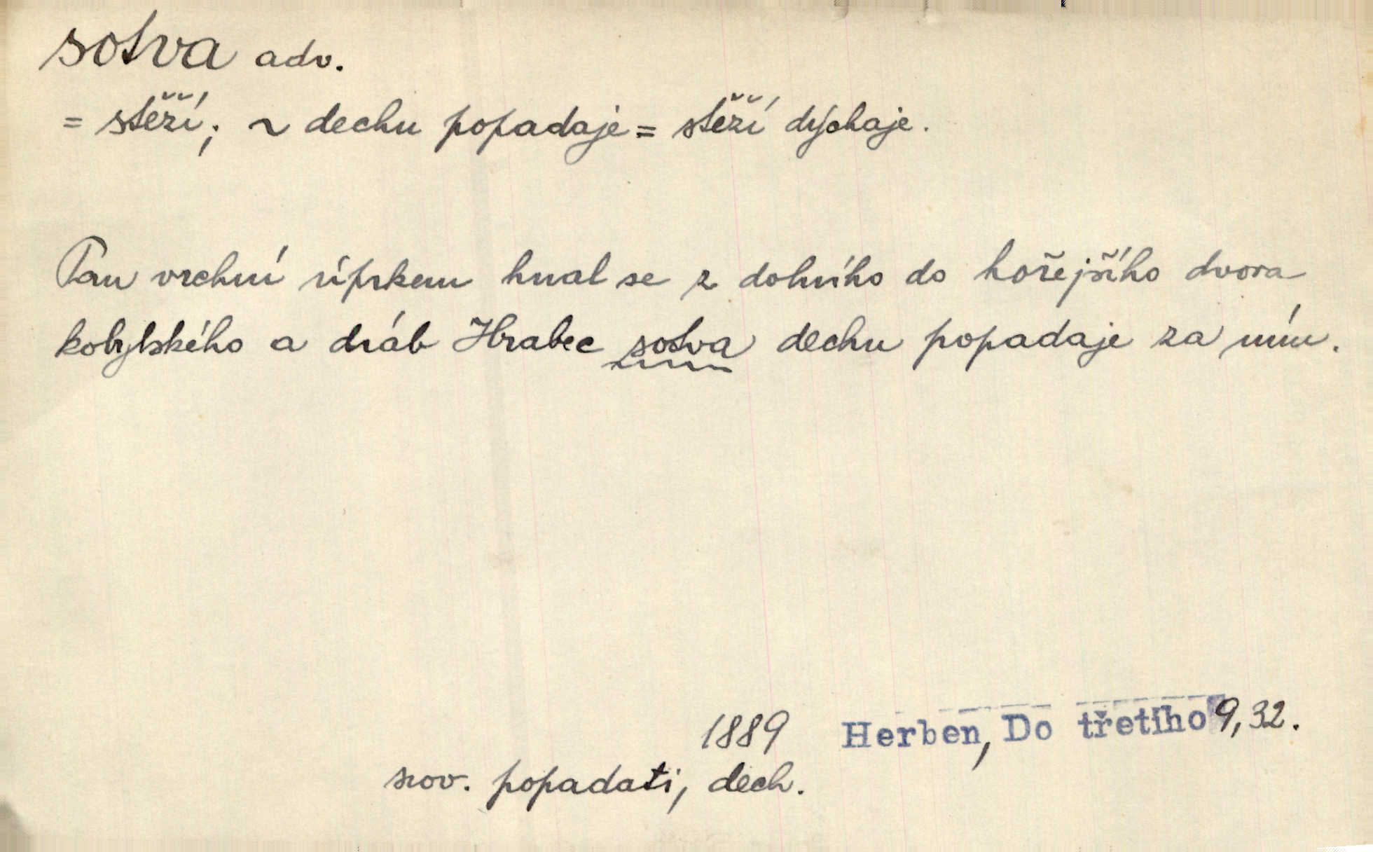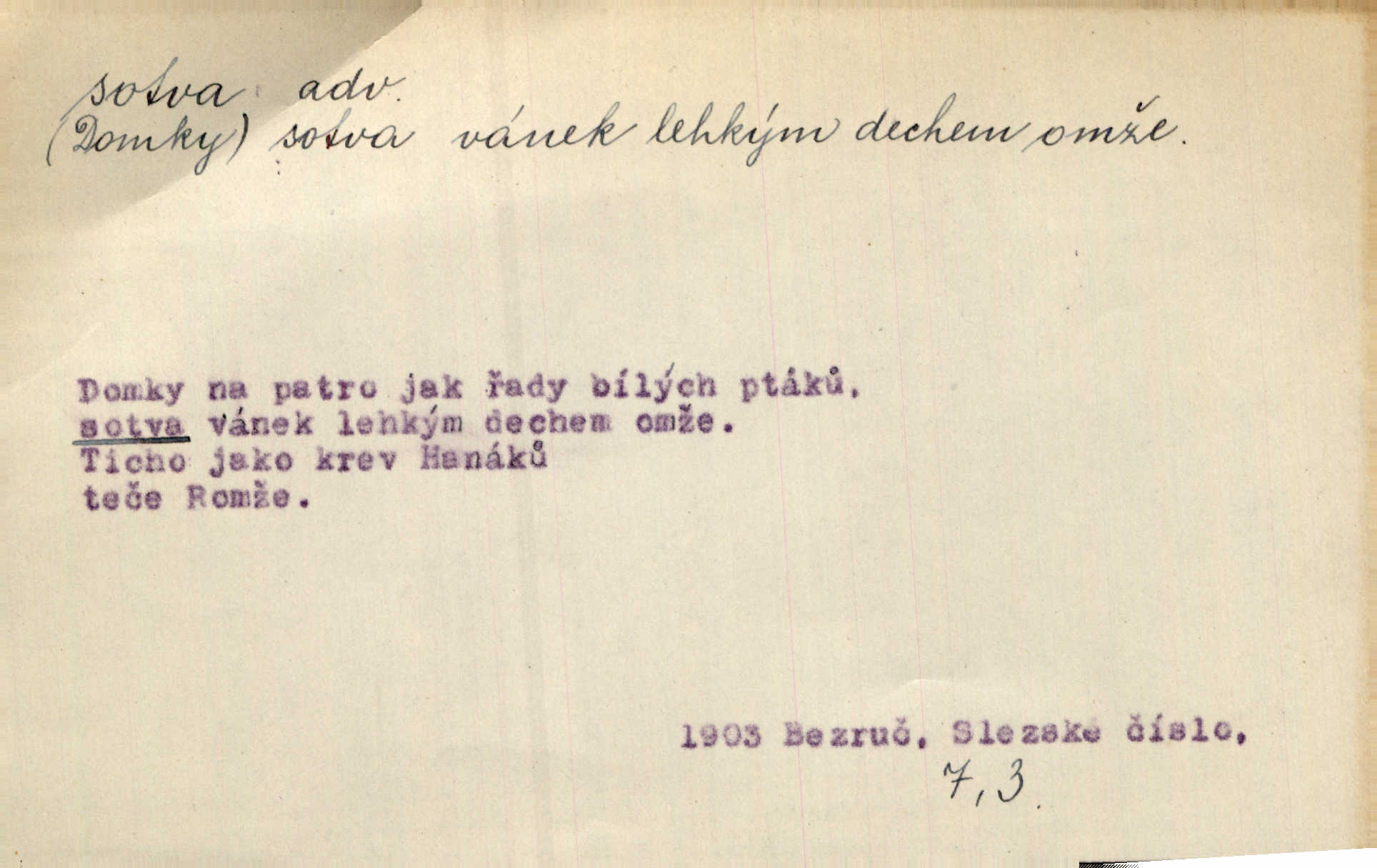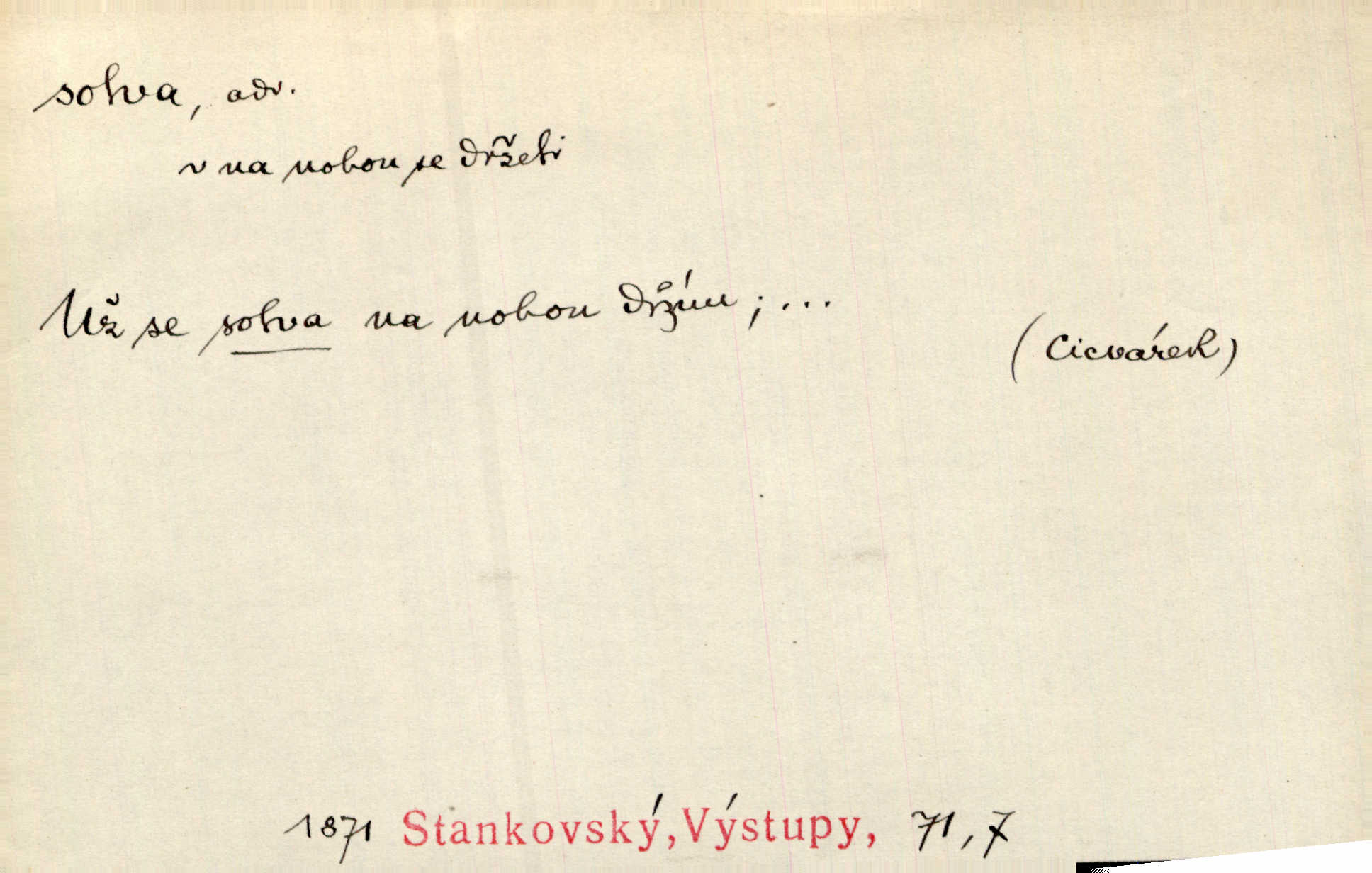 - sotva (poněk. zast. sotvy) adv. stěží, s námahou, těžce. Babička chudák stará sotva se vyškrábala. Něm. Já už taky kolikrát sotva lezu. Rais. Béře, béře ze hromady — klín již plný, sotva vstává. Erb. Oběma Karlíkům nasekal, že sotva šli. Jir. Vidí před sebou uzounký otvor, takže by se tam velký člověk sotva byl protáhnouti mohl. Něm. Vraziv [do světnice], dechu sotva popadaje jektal: „Maminko —.“ Rais. Mohla sotva ubránit se pláče. Vrch. Sotva ten jazyk že jsme si zachovali, a to ještě ne všichni a ne čistě. Havl. Žebrák sluchu sotvy věří. Staš. D vyjadřuje pochybnost, mírný odpor; asi ne, patrně ne, pravděpodobně nikoli. Kdybys věděla, kde to vlastně sedíš, sotva by se ti tu líbilo. Svět. To se sotva dá upříti, že se mnohá [dívka] snaží, aby zde našla obdivovatele. Hál. Komu není shůry dáno, v apatyce sotva koupí. Hajn. Jaký on je, on sotva uvěří. Jir. Máš na hradě co na práci? Sotva! Jan. [Rozárka:] Či není to zákonu jedno, kdo se dá za vinu potrestat? [Prokop:] To sotva. Tyl. „To on už, prosím, také sotva přijde,“ zněla odpověď. Šim. Od oné noci sotva kdo práh jizby té překročil. Jir. Myslíval, že by mu stará služka sotva čím mohla posloužiti. Jir. Dlouho se tu sotva kdy omeškal. Jir. D vyjadřuje velmi malou míru děje, činnosti, nemnoho, nepatrně, téměř ne. Přečetné obory technické leží ladem vůbec netknuty, nebo jen sotva. Čteme. V zadu naloženy byly dva kufry, které pro otepě sena sotva bylo viděti. Jir. Té noci jsem sotva oka zamhouřil. Jir. Cizinec bydlí na pusté skále, slunce mu sotva zasvítá! Mácha. Nebe stálo jako mramorové, suché listí sotva zašustělo. Herb. Na můj pozdrav sotva poděkovala. Šim. Olga sotva že se ohlédla a usmála. R. Svob. D vyjadřuje těsné dovršení něčeho, jen tak tak. To bylo děvčátko sotva tříleté. Rais. Dvacetiletý panovník oženil se s překrásnou Milenou Vukotićovou, tehdáž sotva čtrnáctiletou. Hol. Zdálo se mu, že leží sotva minutu. Herrm. Vždyť jsem pil sotva sklenici vína. K. Čap. Zpěváci přezpívali sotva dvě sloky. Třeb. Udělal sotva dvacet krokův. Šmil. Mně se nelíbila žádná, neboť mně sotva po kolena dosahovaly. Herb. D nedlouho, nedávno, krátce předtím. Jan Kolářík, mladý mužák sotva ženatý, vezl v zimě na saních dřevo s kopce. Herb. Vypadala jako z hnízda vyhozené, sotva vylíhlé ptáče. R. Svob. Slunce, které bylo sotva vyšlo, zdálo se jí šeré. Zey.