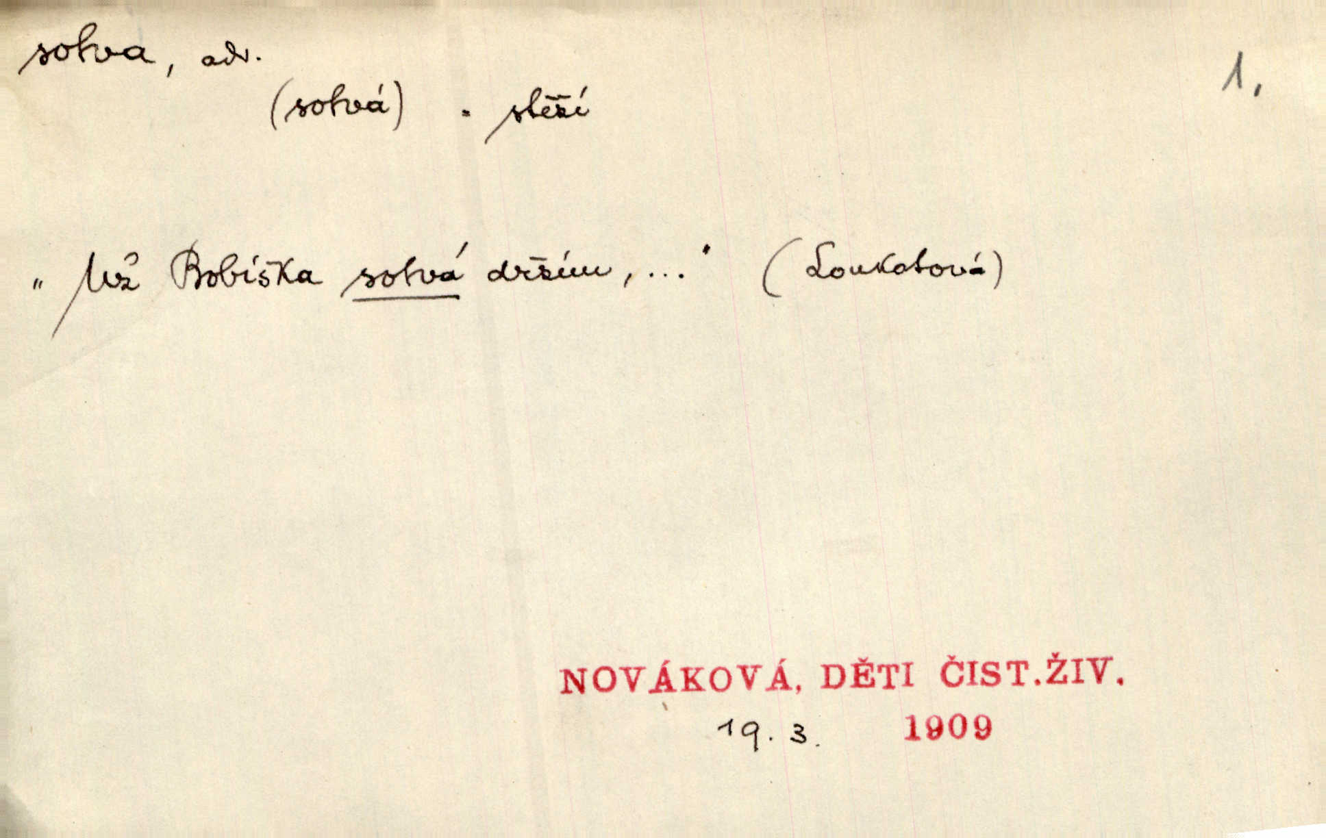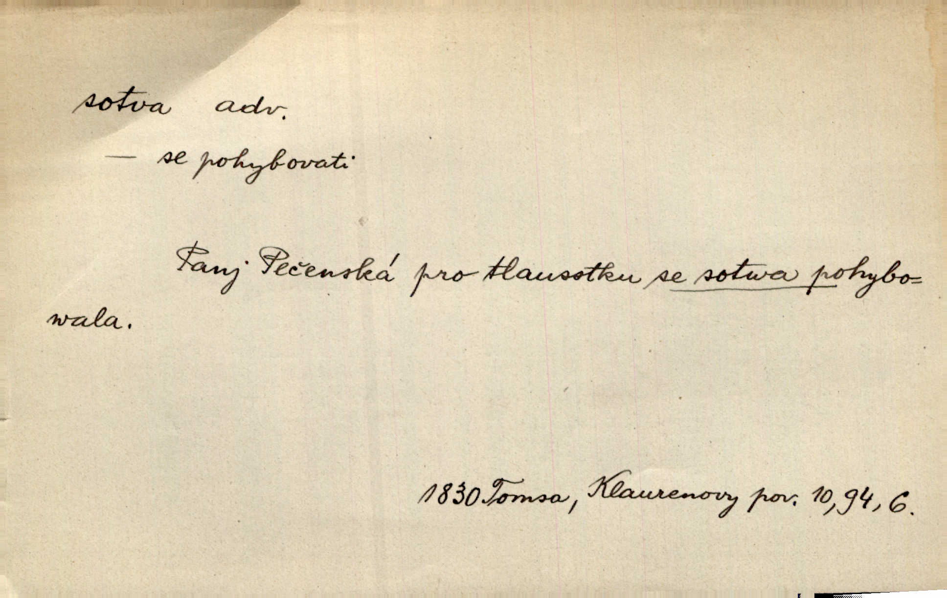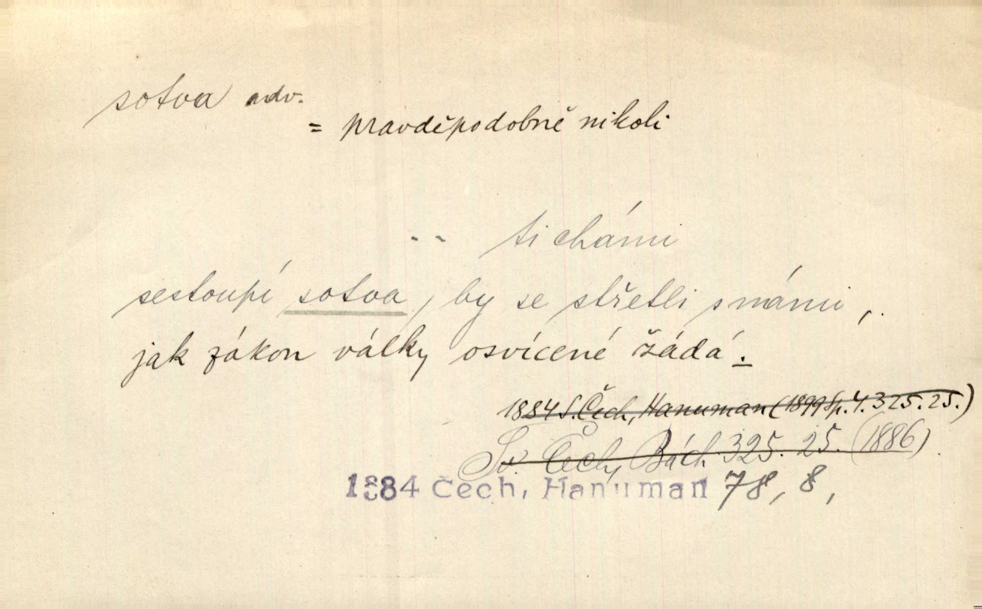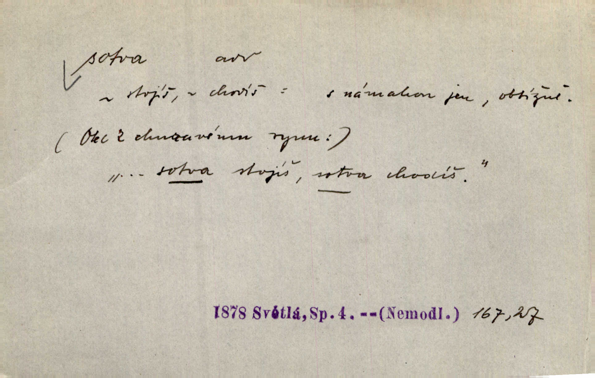 - sotva (poněk. zast. sotvy) adv. stěží, s námahou, těžce. Babička chudák stará sotva se vyškrábala. Něm. Já už taky kolikrát sotva lezu. Rais. Béře, béře ze hromady — klín již plný, sotva vstává. Erb. Oběma Karlíkům nasekal, že sotva šli. Jir. Vidí před sebou uzounký otvor, takže by se tam velký člověk sotva byl protáhnouti mohl. Něm. Vraziv [do světnice], dechu sotva popadaje jektal: „Maminko —.“ Rais. Mohla sotva ubránit se pláče. Vrch. Sotva ten jazyk že jsme si zachovali, a to ještě ne všichni a ne čistě. Havl. Žebrák sluchu sotvy věří. Staš. D vyjadřuje pochybnost, mírný odpor; asi ne, patrně ne, pravděpodobně nikoli. Kdybys věděla, kde to vlastně sedíš, sotva by se ti tu líbilo. Svět. To se sotva dá upříti, že se mnohá [dívka] snaží, aby zde našla obdivovatele. Hál. Komu není shůry dáno, v apatyce sotva koupí. Hajn. Jaký on je, on sotva uvěří. Jir. Máš na hradě co na práci? Sotva! Jan. [Rozárka:] Či není to zákonu jedno, kdo se dá za vinu potrestat? [Prokop:] To sotva. Tyl. „To on už, prosím, také sotva přijde,“ zněla odpověď. Šim. Od oné noci sotva kdo práh jizby té překročil. Jir. Myslíval, že by mu stará služka sotva čím mohla posloužiti. Jir. Dlouho se tu sotva kdy omeškal. Jir. D vyjadřuje velmi malou míru děje, činnosti, nemnoho, nepatrně, téměř ne. Přečetné obory technické leží ladem vůbec netknuty, nebo jen sotva. Čteme. V zadu naloženy byly dva kufry, které pro otepě sena sotva bylo viděti. Jir. Té noci jsem sotva oka zamhouřil. Jir. Cizinec bydlí na pusté skále, slunce mu sotva zasvítá! Mácha. Nebe stálo jako mramorové, suché listí sotva zašustělo. Herb. Na můj pozdrav sotva poděkovala. Šim. Olga sotva že se ohlédla a usmála. R. Svob. D vyjadřuje těsné dovršení něčeho, jen tak tak. To bylo děvčátko sotva tříleté. Rais. Dvacetiletý panovník oženil se s překrásnou Milenou Vukotićovou, tehdáž sotva čtrnáctiletou. Hol. Zdálo se mu, že leží sotva minutu. Herrm. Vždyť jsem pil sotva sklenici vína. K. Čap. Zpěváci přezpívali sotva dvě sloky. Třeb. Udělal sotva dvacet krokův. Šmil. Mně se nelíbila žádná, neboť mně sotva po kolena dosahovaly. Herb. D nedlouho, nedávno, krátce předtím. Jan Kolářík, mladý mužák sotva ženatý, vezl v zimě na saních dřevo s kopce. Herb. Vypadala jako z hnízda vyhozené, sotva vylíhlé ptáče. R. Svob. Slunce, které bylo sotva vyšlo, zdálo se jí šeré. Zey.