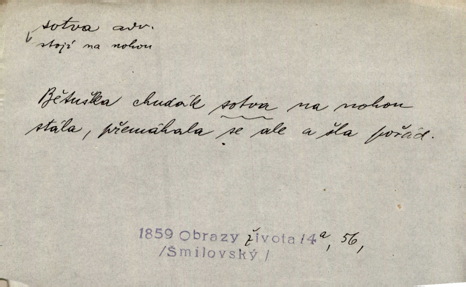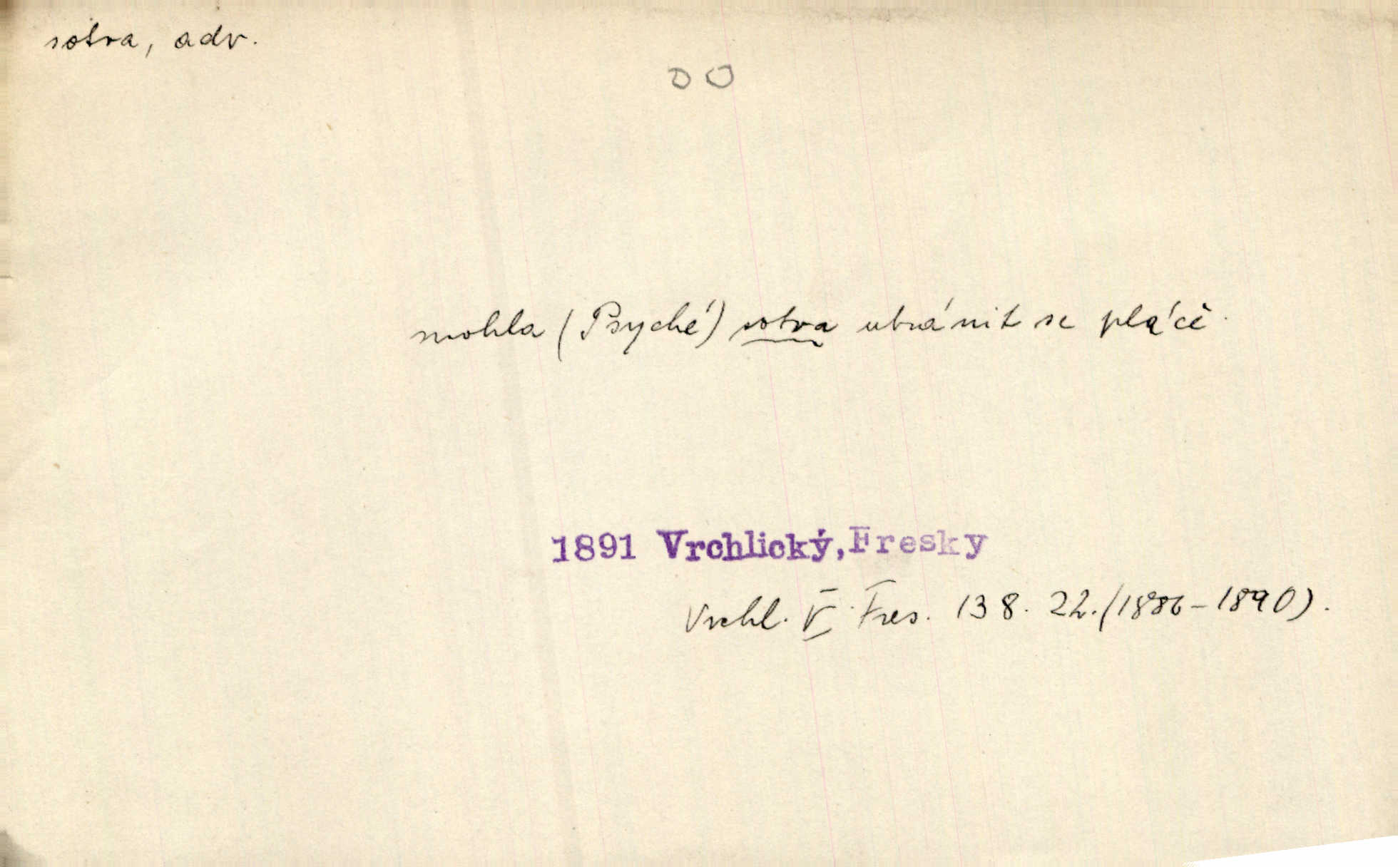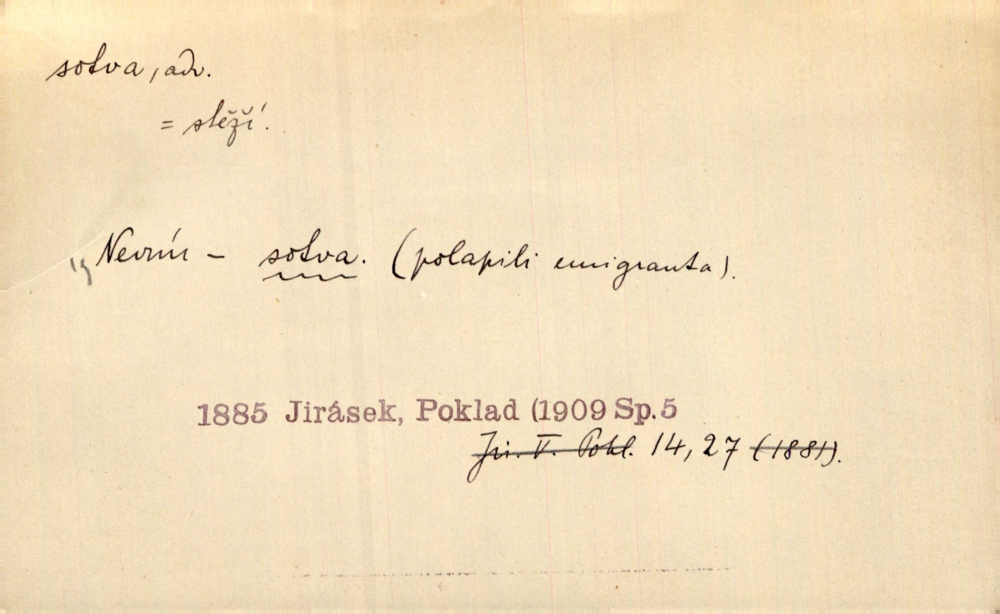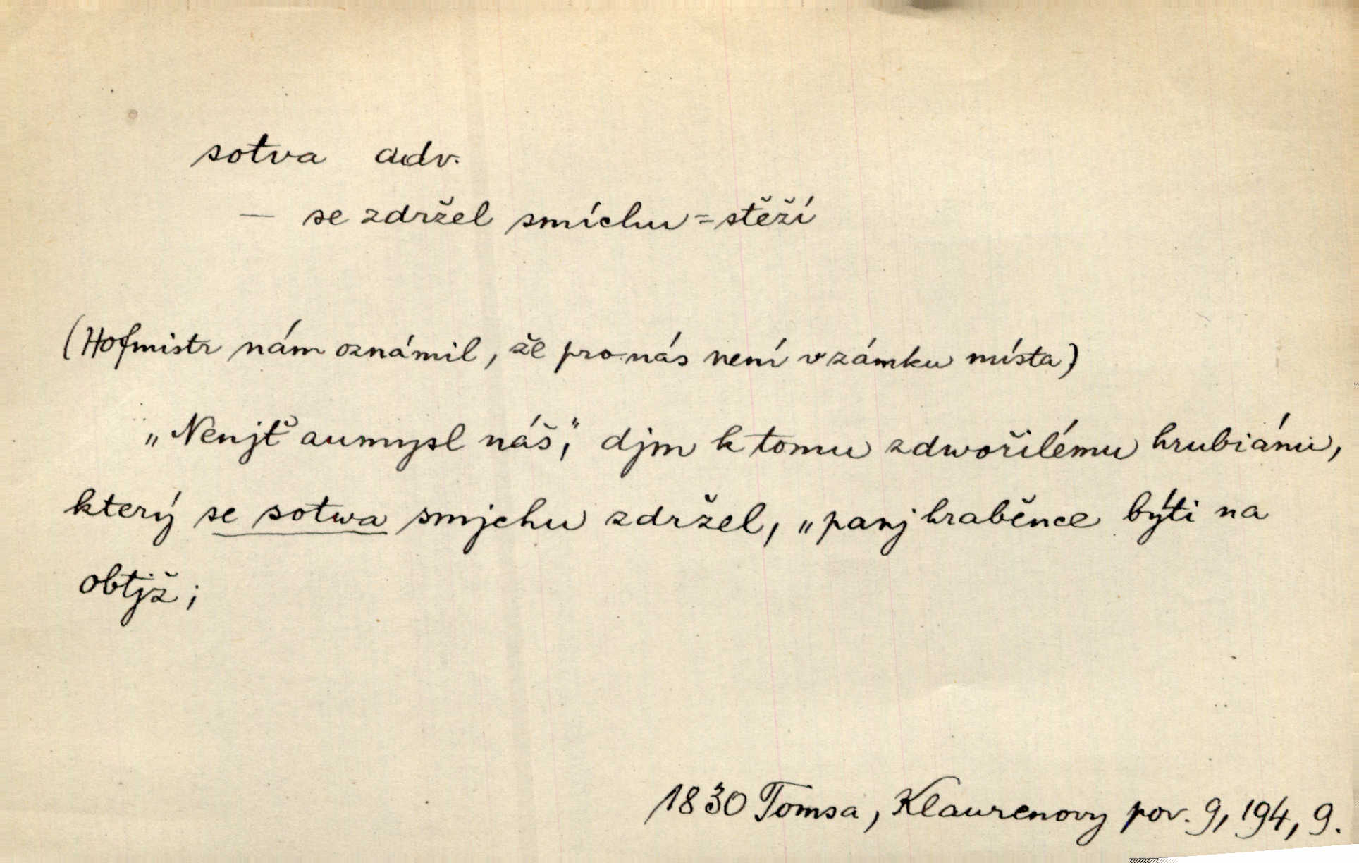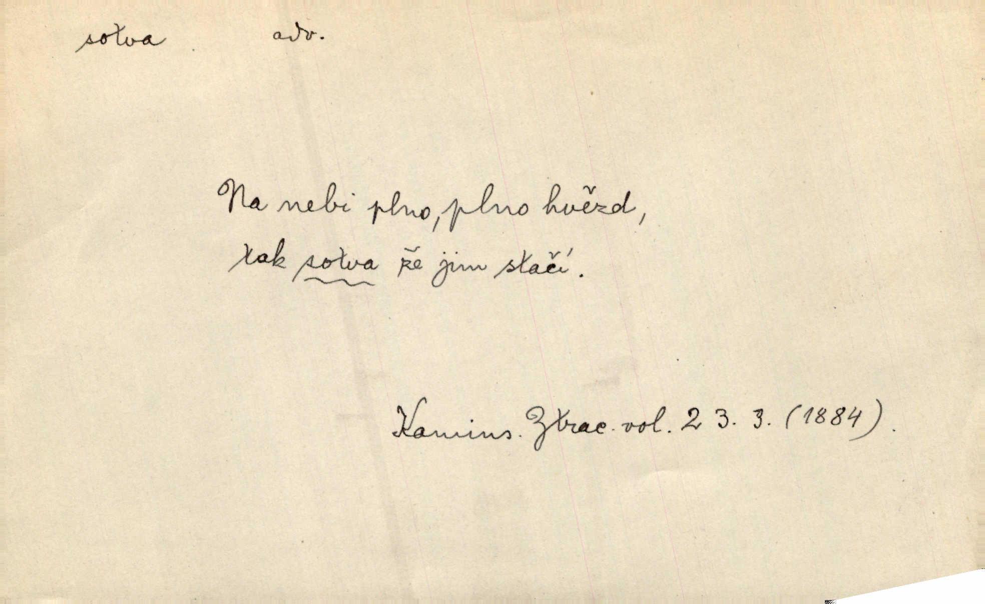 - sotva (poněk. zast. sotvy) adv. stěží, s námahou, těžce. Babička chudák stará sotva se vyškrábala. Něm. Já už taky kolikrát sotva lezu. Rais. Béře, béře ze hromady — klín již plný, sotva vstává. Erb. Oběma Karlíkům nasekal, že sotva šli. Jir. Vidí před sebou uzounký otvor, takže by se tam velký člověk sotva byl protáhnouti mohl. Něm. Vraziv [do světnice], dechu sotva popadaje jektal: „Maminko —.“ Rais. Mohla sotva ubránit se pláče. Vrch. Sotva ten jazyk že jsme si zachovali, a to ještě ne všichni a ne čistě. Havl. Žebrák sluchu sotvy věří. Staš. D vyjadřuje pochybnost, mírný odpor; asi ne, patrně ne, pravděpodobně nikoli. Kdybys věděla, kde to vlastně sedíš, sotva by se ti tu líbilo. Svět. To se sotva dá upříti, že se mnohá [dívka] snaží, aby zde našla obdivovatele. Hál. Komu není shůry dáno, v apatyce sotva koupí. Hajn. Jaký on je, on sotva uvěří. Jir. Máš na hradě co na práci? Sotva! Jan. [Rozárka:] Či není to zákonu jedno, kdo se dá za vinu potrestat? [Prokop:] To sotva. Tyl. „To on už, prosím, také sotva přijde,“ zněla odpověď. Šim. Od oné noci sotva kdo práh jizby té překročil. Jir. Myslíval, že by mu stará služka sotva čím mohla posloužiti. Jir. Dlouho se tu sotva kdy omeškal. Jir. D vyjadřuje velmi malou míru děje, činnosti, nemnoho, nepatrně, téměř ne. Přečetné obory technické leží ladem vůbec netknuty, nebo jen sotva. Čteme. V zadu naloženy byly dva kufry, které pro otepě sena sotva bylo viděti. Jir. Té noci jsem sotva oka zamhouřil. Jir. Cizinec bydlí na pusté skále, slunce mu sotva zasvítá! Mácha. Nebe stálo jako mramorové, suché listí sotva zašustělo. Herb. Na můj pozdrav sotva poděkovala. Šim. Olga sotva že se ohlédla a usmála. R. Svob. D vyjadřuje těsné dovršení něčeho, jen tak tak. To bylo děvčátko sotva tříleté. Rais. Dvacetiletý panovník oženil se s překrásnou Milenou Vukotićovou, tehdáž sotva čtrnáctiletou. Hol. Zdálo se mu, že leží sotva minutu. Herrm. Vždyť jsem pil sotva sklenici vína. K. Čap. Zpěváci přezpívali sotva dvě sloky. Třeb. Udělal sotva dvacet krokův. Šmil. Mně se nelíbila žádná, neboť mně sotva po kolena dosahovaly. Herb. D nedlouho, nedávno, krátce předtím. Jan Kolářík, mladý mužák sotva ženatý, vezl v zimě na saních dřevo s kopce. Herb. Vypadala jako z hnízda vyhozené, sotva vylíhlé ptáče. R. Svob. Slunce, které bylo sotva vyšlo, zdálo se jí šeré. Zey.