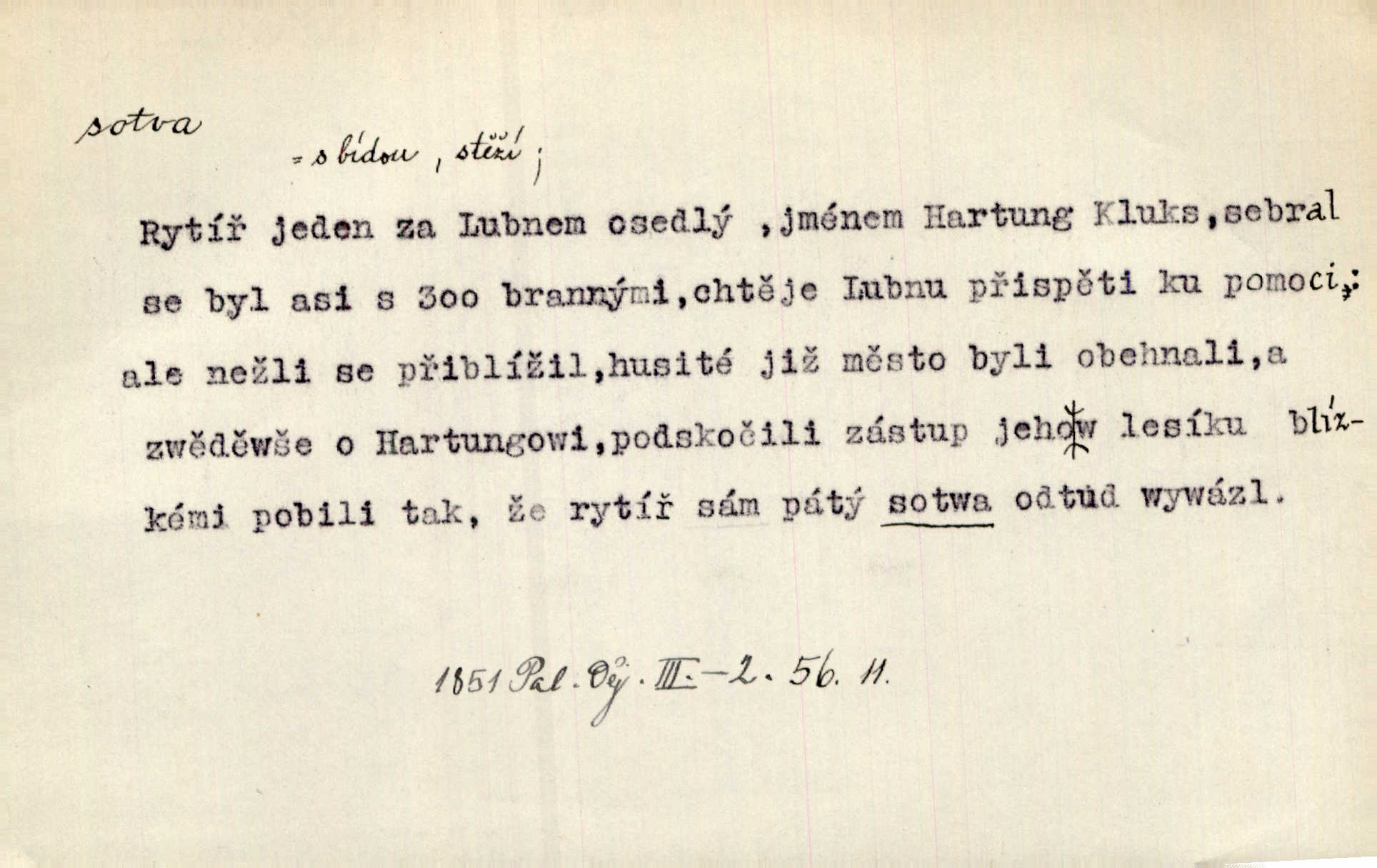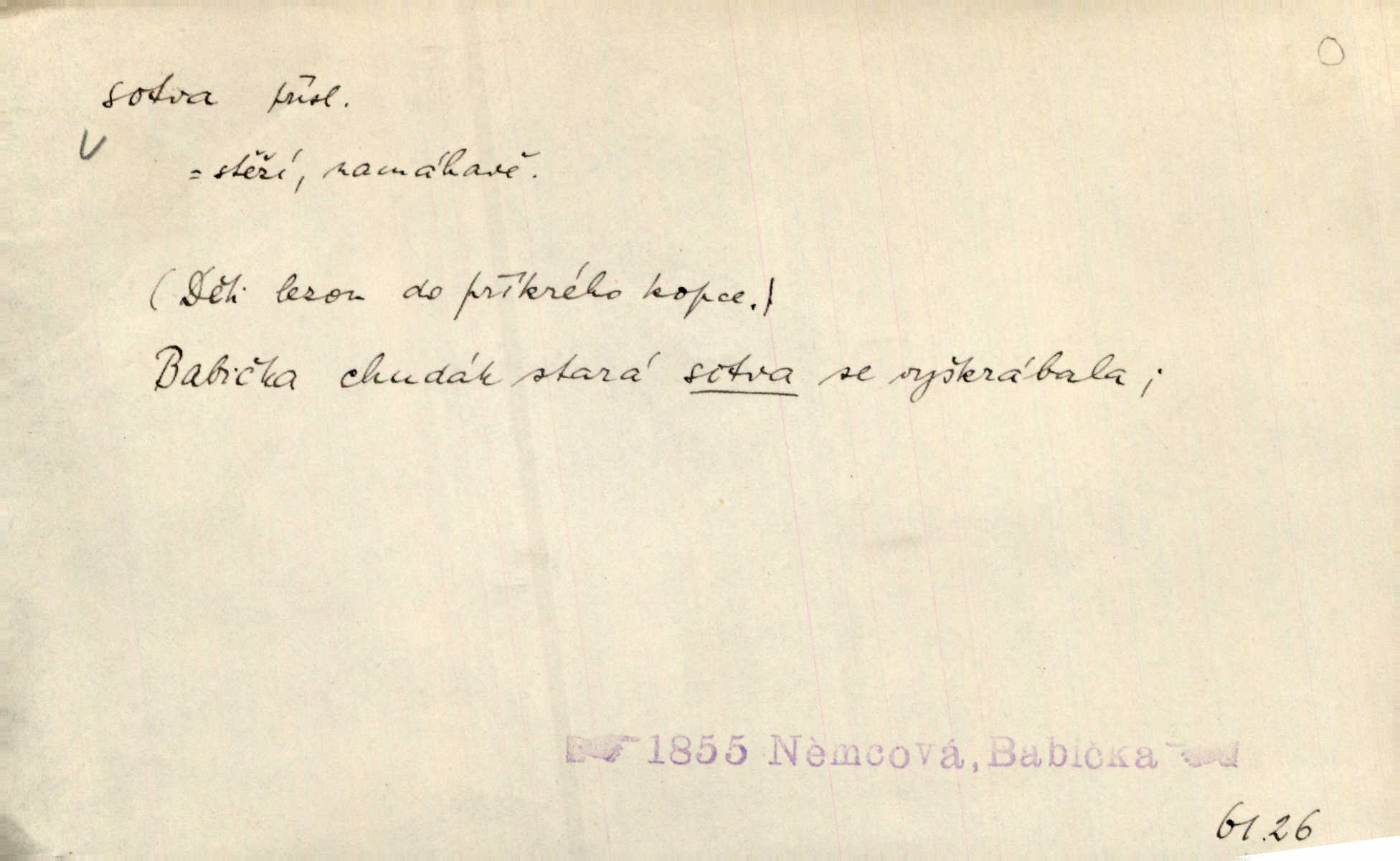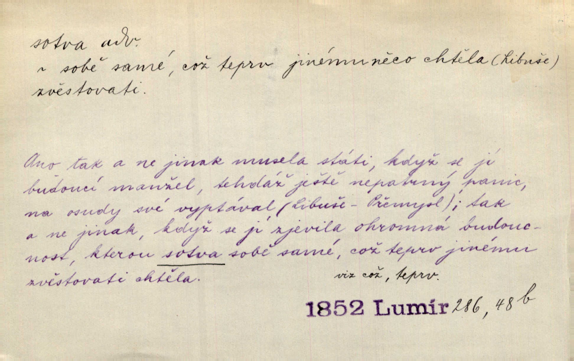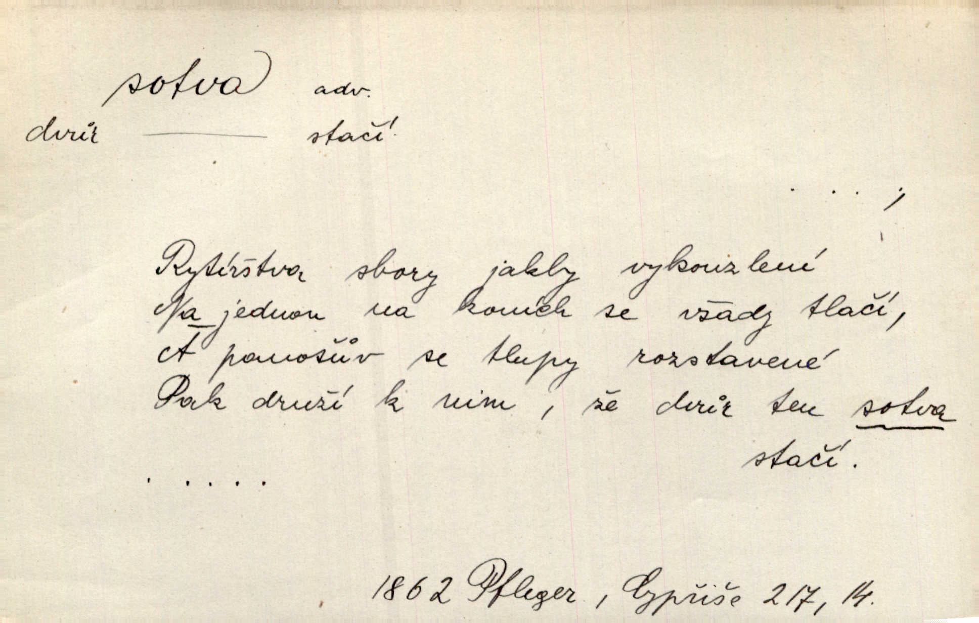 - sotva (poněk. zast. sotvy) adv. stěží, s námahou, těžce. Babička chudák stará sotva se vyškrábala. Něm. Já už taky kolikrát sotva lezu. Rais. Béře, béře ze hromady — klín již plný, sotva vstává. Erb. Oběma Karlíkům nasekal, že sotva šli. Jir. Vidí před sebou uzounký otvor, takže by se tam velký člověk sotva byl protáhnouti mohl. Něm. Vraziv [do světnice], dechu sotva popadaje jektal: „Maminko —.“ Rais. Mohla sotva ubránit se pláče. Vrch. Sotva ten jazyk že jsme si zachovali, a to ještě ne všichni a ne čistě. Havl. Žebrák sluchu sotvy věří. Staš. D vyjadřuje pochybnost, mírný odpor; asi ne, patrně ne, pravděpodobně nikoli. Kdybys věděla, kde to vlastně sedíš, sotva by se ti tu líbilo. Svět. To se sotva dá upříti, že se mnohá [dívka] snaží, aby zde našla obdivovatele. Hál. Komu není shůry dáno, v apatyce sotva koupí. Hajn. Jaký on je, on sotva uvěří. Jir. Máš na hradě co na práci? Sotva! Jan. [Rozárka:] Či není to zákonu jedno, kdo se dá za vinu potrestat? [Prokop:] To sotva. Tyl. „To on už, prosím, také sotva přijde,“ zněla odpověď. Šim. Od oné noci sotva kdo práh jizby té překročil. Jir. Myslíval, že by mu stará služka sotva čím mohla posloužiti. Jir. Dlouho se tu sotva kdy omeškal. Jir. D vyjadřuje velmi malou míru děje, činnosti, nemnoho, nepatrně, téměř ne. Přečetné obory technické leží ladem vůbec netknuty, nebo jen sotva. Čteme. V zadu naloženy byly dva kufry, které pro otepě sena sotva bylo viděti. Jir. Té noci jsem sotva oka zamhouřil. Jir. Cizinec bydlí na pusté skále, slunce mu sotva zasvítá! Mácha. Nebe stálo jako mramorové, suché listí sotva zašustělo. Herb. Na můj pozdrav sotva poděkovala. Šim. Olga sotva že se ohlédla a usmála. R. Svob. D vyjadřuje těsné dovršení něčeho, jen tak tak. To bylo děvčátko sotva tříleté. Rais. Dvacetiletý panovník oženil se s překrásnou Milenou Vukotićovou, tehdáž sotva čtrnáctiletou. Hol. Zdálo se mu, že leží sotva minutu. Herrm. Vždyť jsem pil sotva sklenici vína. K. Čap. Zpěváci přezpívali sotva dvě sloky. Třeb. Udělal sotva dvacet krokův. Šmil. Mně se nelíbila žádná, neboť mně sotva po kolena dosahovaly. Herb. D nedlouho, nedávno, krátce předtím. Jan Kolářík, mladý mužák sotva ženatý, vezl v zimě na saních dřevo s kopce. Herb. Vypadala jako z hnízda vyhozené, sotva vylíhlé ptáče. R. Svob. Slunce, které bylo sotva vyšlo, zdálo se jí šeré. Zey.