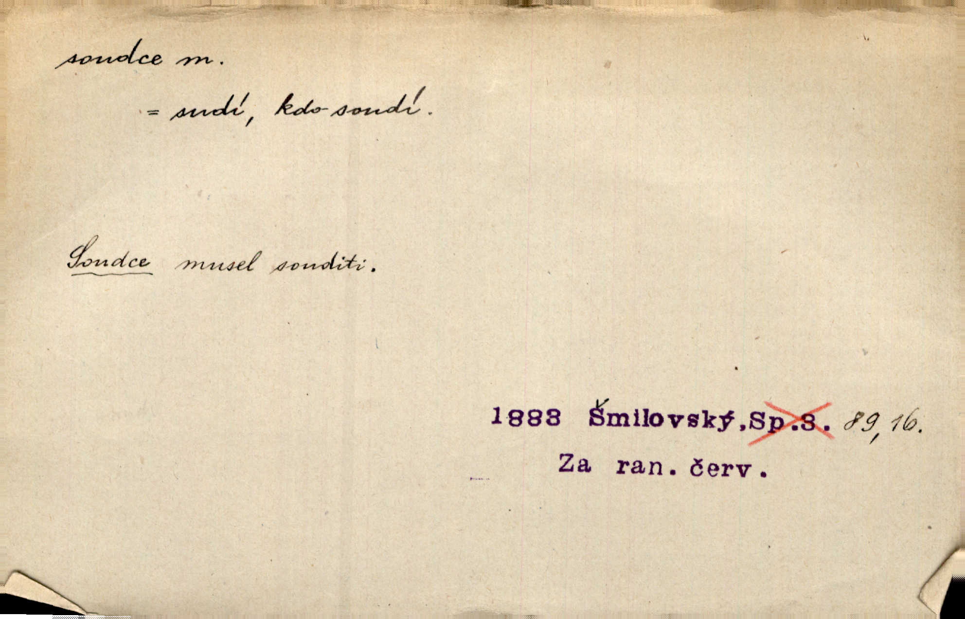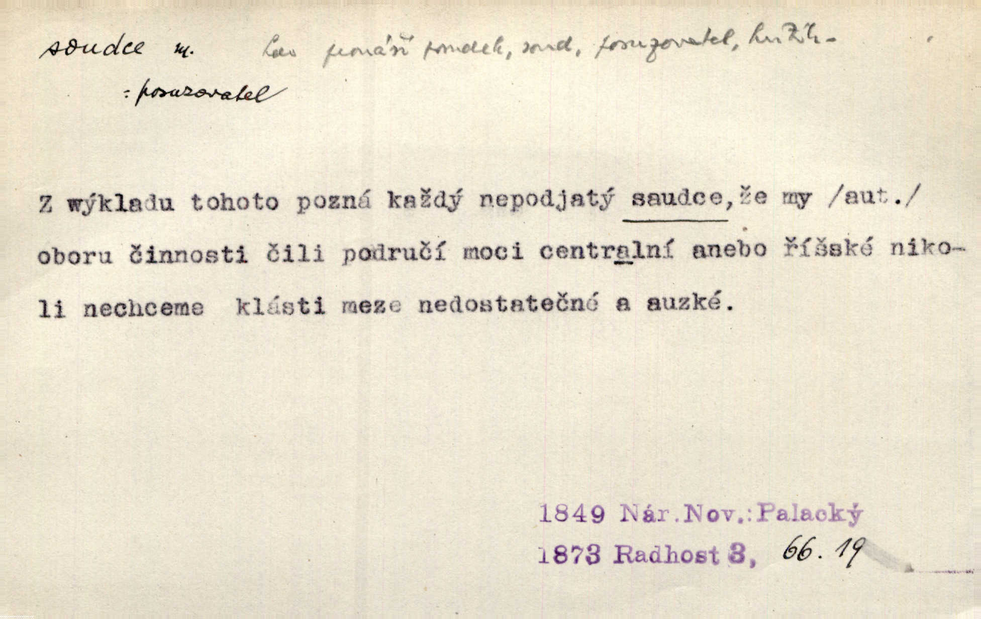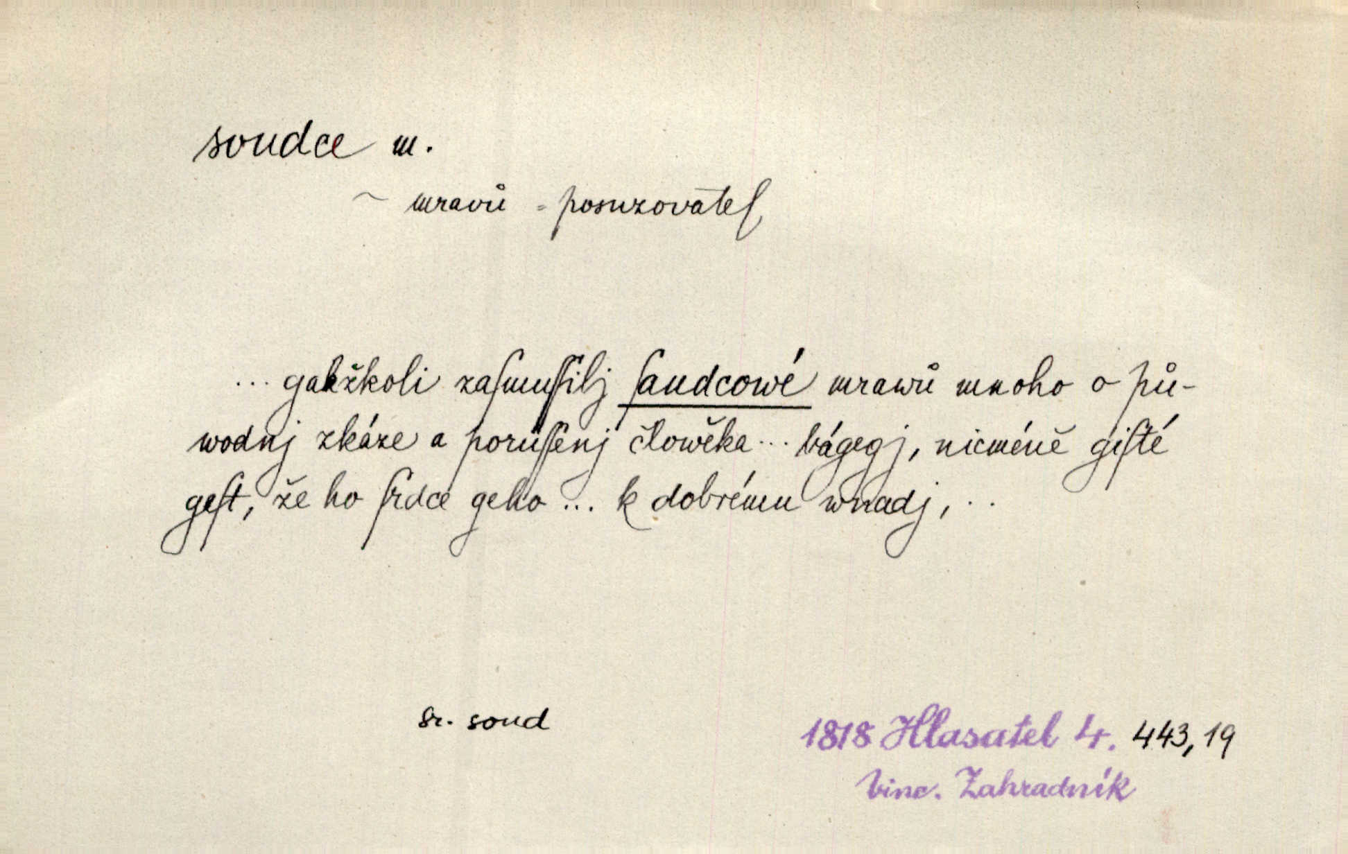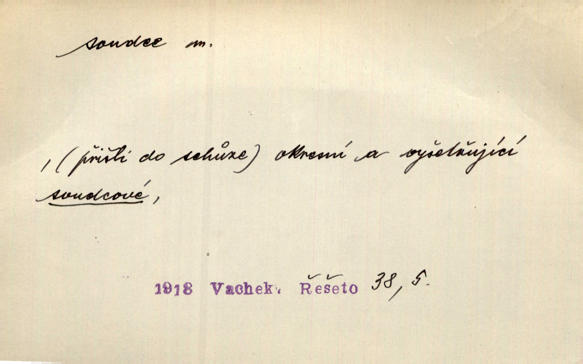 - soudce, -e (dial. soudcí, -ho) m. osoba pověřená řízením a rozhodováním pře. Soudce musel souditi. Šmil. Byl pyšný a nechtěl uposlechnouti nálezu soudcova. Helf. Vejdi, kam chceš, vejdi k hejtmanovi, soudcímu, a řekni jenom: Šolar! Nic víc. Mat. Dívajíc se mu do očí jako vyšetřující soudce, dala mu [kuchařka faráři] otázku. Baar. Nevíš-li a nekážeš-li ty, nevinná krev že volá do oblak o pomstu nejpronikavěji a že volání její před spravedlivého soudce proráží nejjistěji? Třeb. Jednou budeš umírati a před věčným soudcem za sebe účet skládati Bohem. Šmil. Dej, Soudce věčný, ať jak chci, tak mohu! Krás. Kdo tam v osamělé době s modlitbou se Soudci pokloní? Jabl. Práv. vyšetřující soudce člen krajského soudu, jemuž náleží konati přípravné řízení (vyhledávání i vyšetřování) o zločinech a přečinech. Soudce lidový osoba, jež nejsouc soudcem z povolání, jest povolána k soudcovskému spolupůsobení v trestním řízení. Vojenský soudce důstojník justiční služby, vykonávající vojenskou soudní pravomoc. Soudce laik vojenská osoba povolaná jako přísedící při soudním líčení. D rozhodčí při nějaké soutěži, při závodu, zápase a pod. Bylo umluveno, že bude místo souboje v Třebovli, soudcové boje pan Tista i rytíř Radimský. Ritt. V roce 1881 byl soudcem v polském konkursu básní o Calderonovi. Mach. Sport. rozhodčí. D kdo pronáší posudek, soud, posuzovatel, kritik. Z výkladu tohoto pozná každý nepodjatý soudce, že my oboru činnosti čili područí moci centralní anebo říšské nikoli nechceme klásti meze nedostatečné a ouzké. Pal. A Bassompierre byl všeobecně uznaným soudcem vnad ženských. Třeb. Shakespeare, básnický soudce minulosti, vystupuje tu [v Richardu III.] jako tvrdý, neúprosný posuzovatel. Týd. rozhl. Pochvalně se soudcové taktéž zmínili o kusu „Zdeněk ze Zásmuk“. Ner. Druhým soudcem ve věci vkusu je cit. Tille. Neznám jiného soudce než své svědomí. Zey. Nad mým svědomím neuznávám já nikoho na zemi za soudce. Pal. D Bibl. soudcové občasní osvoboditelé a vládci jednotlivých pokolení izraelských. Kniha Soudců část Starého Zákona.
