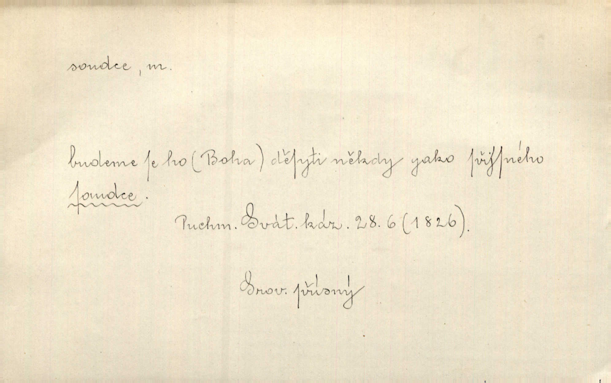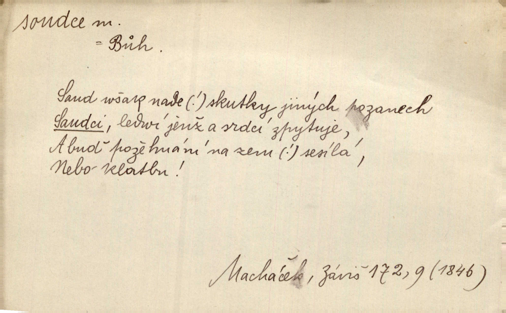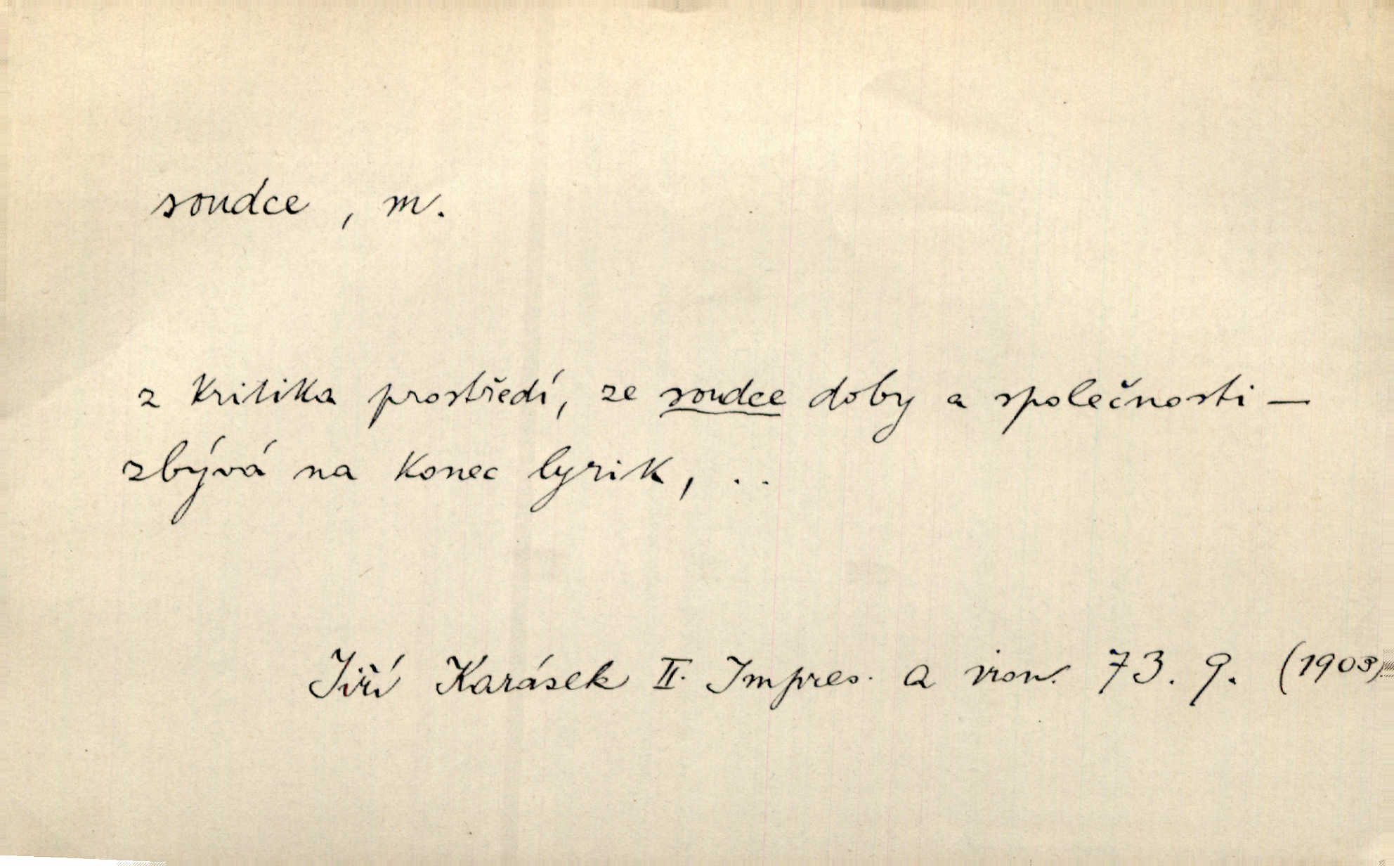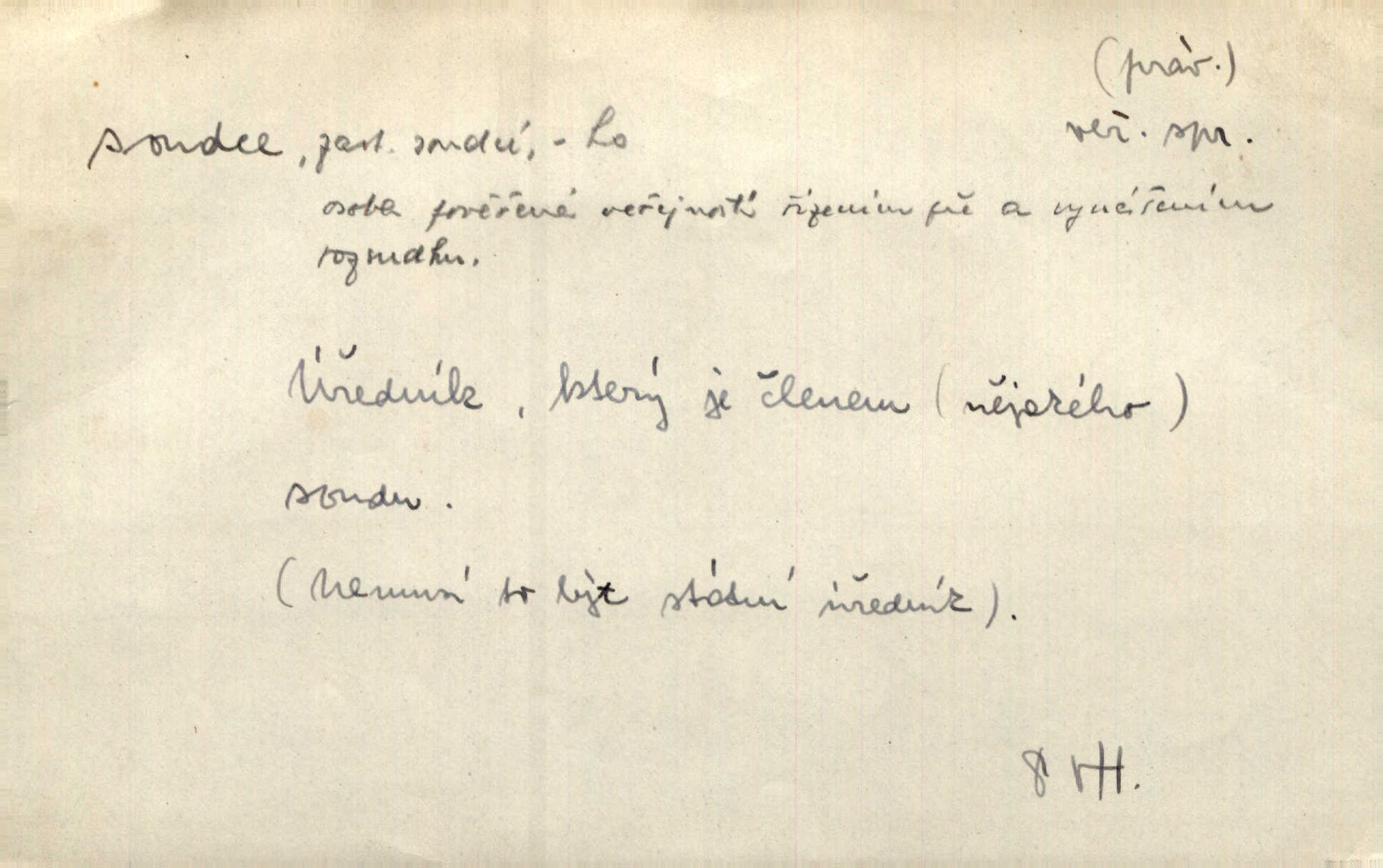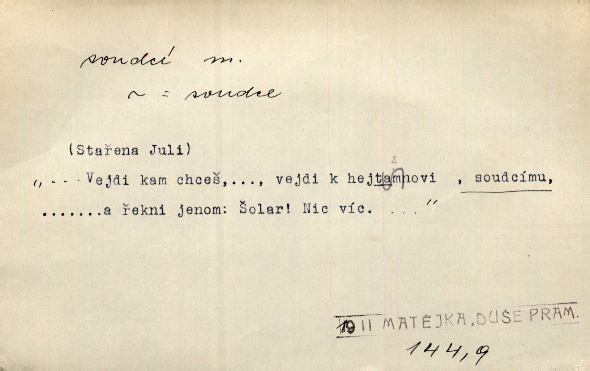 - soudce, -e (dial. soudcí, -ho) m. osoba pověřená řízením a rozhodováním pře. Soudce musel souditi. Šmil. Byl pyšný a nechtěl uposlechnouti nálezu soudcova. Helf. Vejdi, kam chceš, vejdi k hejtmanovi, soudcímu, a řekni jenom: Šolar! Nic víc. Mat. Dívajíc se mu do očí jako vyšetřující soudce, dala mu [kuchařka faráři] otázku. Baar. Nevíš-li a nekážeš-li ty, nevinná krev že volá do oblak o pomstu nejpronikavěji a že volání její před spravedlivého soudce proráží nejjistěji? Třeb. Jednou budeš umírati a před věčným soudcem za sebe účet skládati Bohem. Šmil. Dej, Soudce věčný, ať jak chci, tak mohu! Krás. Kdo tam v osamělé době s modlitbou se Soudci pokloní? Jabl. Práv. vyšetřující soudce člen krajského soudu, jemuž náleží konati přípravné řízení (vyhledávání i vyšetřování) o zločinech a přečinech. Soudce lidový osoba, jež nejsouc soudcem z povolání, jest povolána k soudcovskému spolupůsobení v trestním řízení. Vojenský soudce důstojník justiční služby, vykonávající vojenskou soudní pravomoc. Soudce laik vojenská osoba povolaná jako přísedící při soudním líčení. D rozhodčí při nějaké soutěži, při závodu, zápase a pod. Bylo umluveno, že bude místo souboje v Třebovli, soudcové boje pan Tista i rytíř Radimský. Ritt. V roce 1881 byl soudcem v polském konkursu básní o Calderonovi. Mach. Sport. rozhodčí. D kdo pronáší posudek, soud, posuzovatel, kritik. Z výkladu tohoto pozná každý nepodjatý soudce, že my oboru činnosti čili područí moci centralní anebo říšské nikoli nechceme klásti meze nedostatečné a ouzké. Pal. A Bassompierre byl všeobecně uznaným soudcem vnad ženských. Třeb. Shakespeare, básnický soudce minulosti, vystupuje tu [v Richardu III.] jako tvrdý, neúprosný posuzovatel. Týd. rozhl. Pochvalně se soudcové taktéž zmínili o kusu „Zdeněk ze Zásmuk“. Ner. Druhým soudcem ve věci vkusu je cit. Tille. Neznám jiného soudce než své svědomí. Zey. Nad mým svědomím neuznávám já nikoho na zemi za soudce. Pal. D Bibl. soudcové občasní osvoboditelé a vládci jednotlivých pokolení izraelských. Kniha Soudců část Starého Zákona.