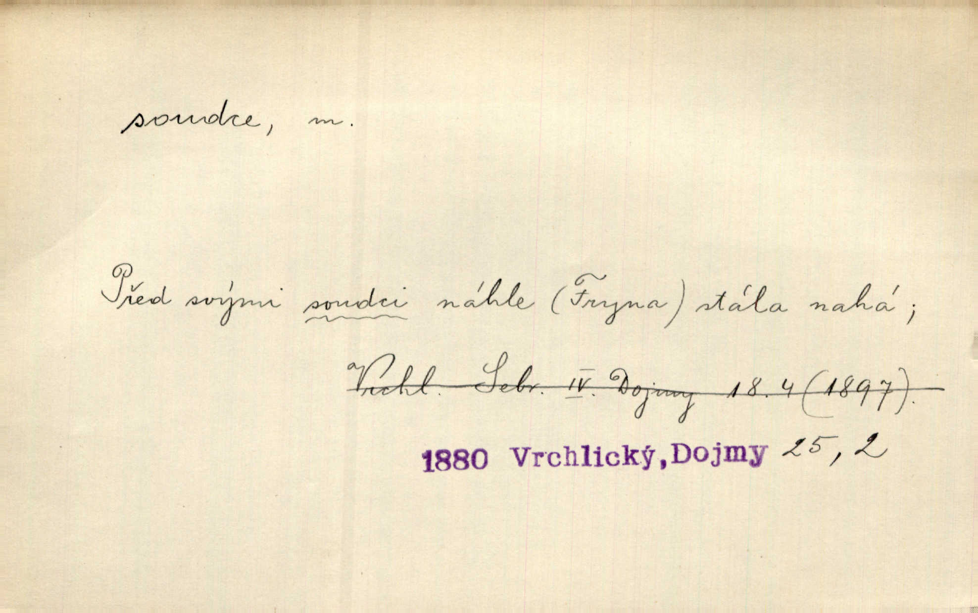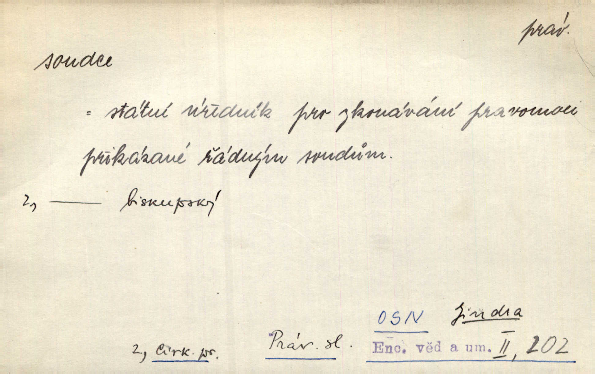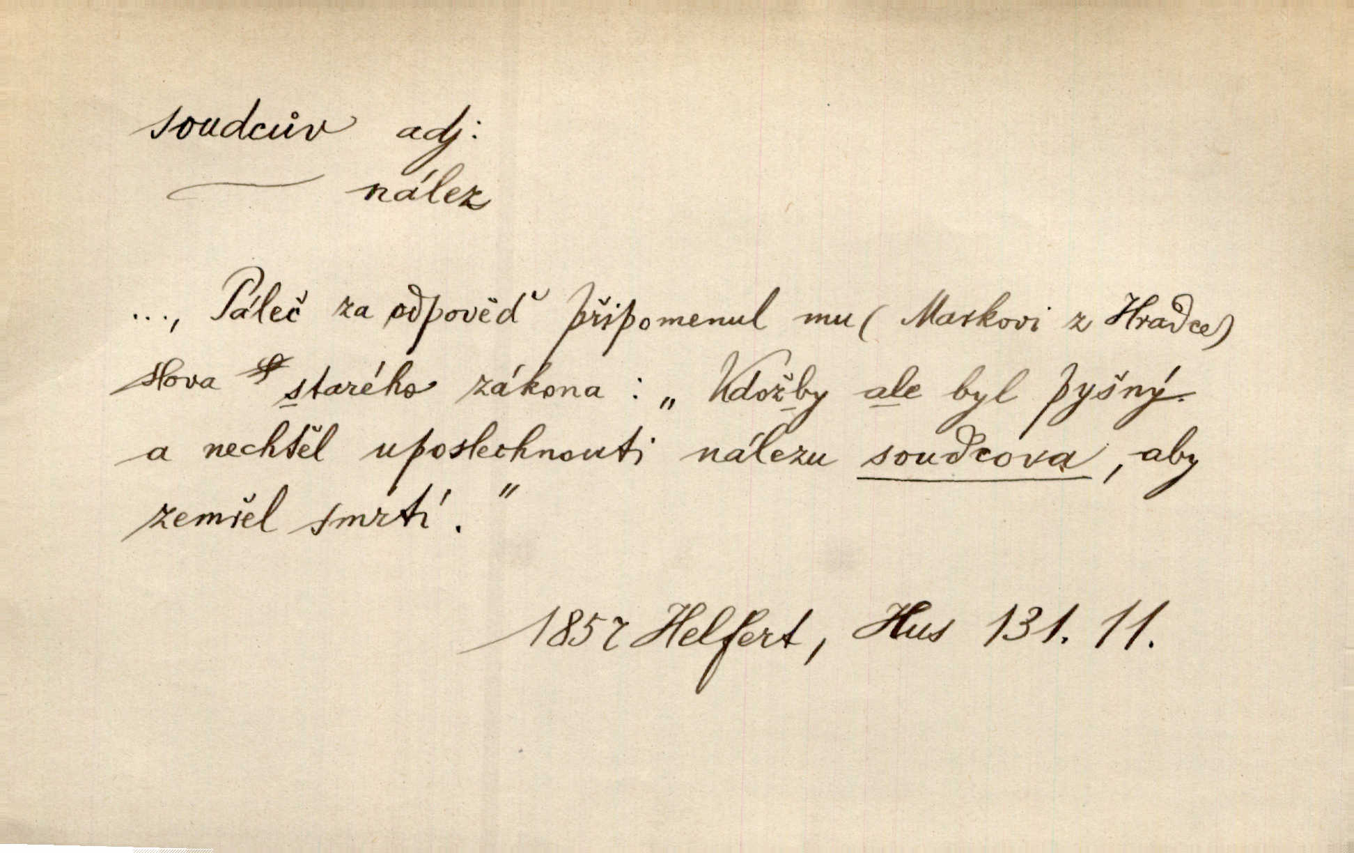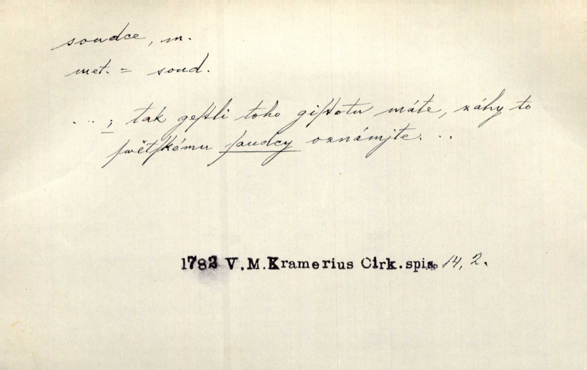 - soudce, -e (dial. soudcí, -ho) m. osoba pověřená řízením a rozhodováním pře. Soudce musel souditi. Šmil. Byl pyšný a nechtěl uposlechnouti nálezu soudcova. Helf. Vejdi, kam chceš, vejdi k hejtmanovi, soudcímu, a řekni jenom: Šolar! Nic víc. Mat. Dívajíc se mu do očí jako vyšetřující soudce, dala mu [kuchařka faráři] otázku. Baar. Nevíš-li a nekážeš-li ty, nevinná krev že volá do oblak o pomstu nejpronikavěji a že volání její před spravedlivého soudce proráží nejjistěji? Třeb. Jednou budeš umírati a před věčným soudcem za sebe účet skládati Bohem. Šmil. Dej, Soudce věčný, ať jak chci, tak mohu! Krás. Kdo tam v osamělé době s modlitbou se Soudci pokloní? Jabl. Práv. vyšetřující soudce člen krajského soudu, jemuž náleží konati přípravné řízení (vyhledávání i vyšetřování) o zločinech a přečinech. Soudce lidový osoba, jež nejsouc soudcem z povolání, jest povolána k soudcovskému spolupůsobení v trestním řízení. Vojenský soudce důstojník justiční služby, vykonávající vojenskou soudní pravomoc. Soudce laik vojenská osoba povolaná jako přísedící při soudním líčení. D rozhodčí při nějaké soutěži, při závodu, zápase a pod. Bylo umluveno, že bude místo souboje v Třebovli, soudcové boje pan Tista i rytíř Radimský. Ritt. V roce 1881 byl soudcem v polském konkursu básní o Calderonovi. Mach. Sport. rozhodčí. D kdo pronáší posudek, soud, posuzovatel, kritik. Z výkladu tohoto pozná každý nepodjatý soudce, že my oboru činnosti čili područí moci centralní anebo říšské nikoli nechceme klásti meze nedostatečné a ouzké. Pal. A Bassompierre byl všeobecně uznaným soudcem vnad ženských. Třeb. Shakespeare, básnický soudce minulosti, vystupuje tu [v Richardu III.] jako tvrdý, neúprosný posuzovatel. Týd. rozhl. Pochvalně se soudcové taktéž zmínili o kusu „Zdeněk ze Zásmuk“. Ner. Druhým soudcem ve věci vkusu je cit. Tille. Neznám jiného soudce než své svědomí. Zey. Nad mým svědomím neuznávám já nikoho na zemi za soudce. Pal. D Bibl. soudcové občasní osvoboditelé a vládci jednotlivých pokolení izraelských. Kniha Soudců část Starého Zákona.