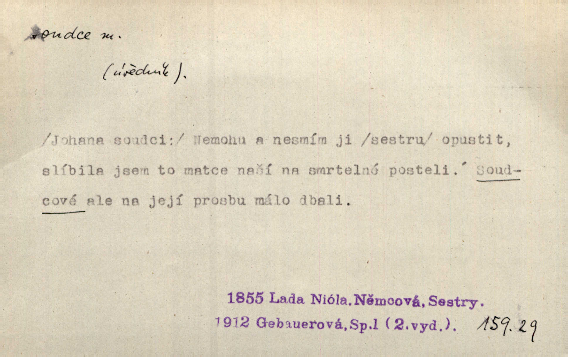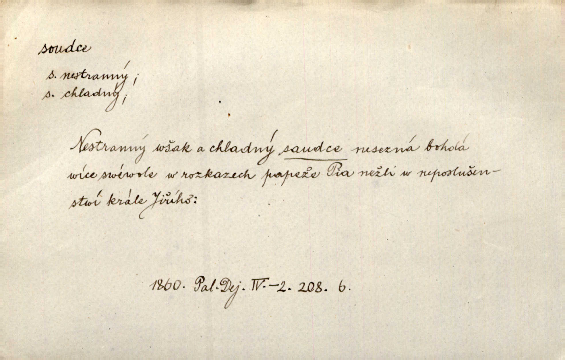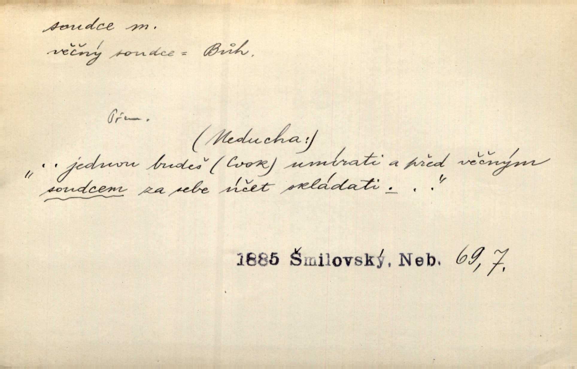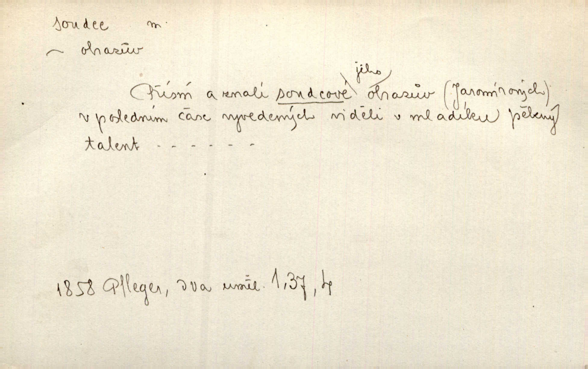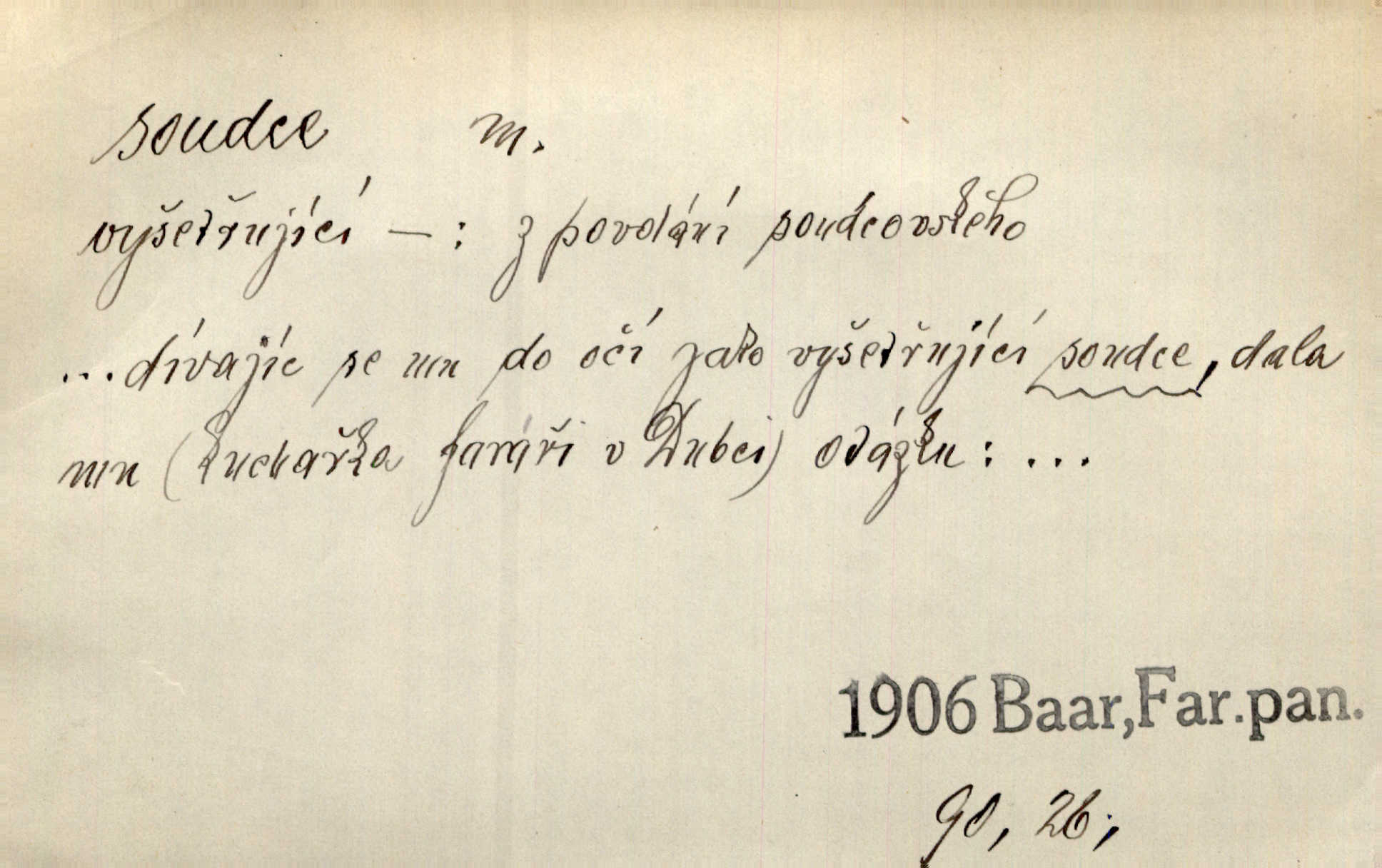 - soudce, -e (dial. soudcí, -ho) m. osoba pověřená řízením a rozhodováním pře. Soudce musel souditi. Šmil. Byl pyšný a nechtěl uposlechnouti nálezu soudcova. Helf. Vejdi, kam chceš, vejdi k hejtmanovi, soudcímu, a řekni jenom: Šolar! Nic víc. Mat. Dívajíc se mu do očí jako vyšetřující soudce, dala mu [kuchařka faráři] otázku. Baar. Nevíš-li a nekážeš-li ty, nevinná krev že volá do oblak o pomstu nejpronikavěji a že volání její před spravedlivého soudce proráží nejjistěji? Třeb. Jednou budeš umírati a před věčným soudcem za sebe účet skládati Bohem. Šmil. Dej, Soudce věčný, ať jak chci, tak mohu! Krás. Kdo tam v osamělé době s modlitbou se Soudci pokloní? Jabl. Práv. vyšetřující soudce člen krajského soudu, jemuž náleží konati přípravné řízení (vyhledávání i vyšetřování) o zločinech a přečinech. Soudce lidový osoba, jež nejsouc soudcem z povolání, jest povolána k soudcovskému spolupůsobení v trestním řízení. Vojenský soudce důstojník justiční služby, vykonávající vojenskou soudní pravomoc. Soudce laik vojenská osoba povolaná jako přísedící při soudním líčení. D rozhodčí při nějaké soutěži, při závodu, zápase a pod. Bylo umluveno, že bude místo souboje v Třebovli, soudcové boje pan Tista i rytíř Radimský. Ritt. V roce 1881 byl soudcem v polském konkursu básní o Calderonovi. Mach. Sport. rozhodčí. D kdo pronáší posudek, soud, posuzovatel, kritik. Z výkladu tohoto pozná každý nepodjatý soudce, že my oboru činnosti čili područí moci centralní anebo říšské nikoli nechceme klásti meze nedostatečné a ouzké. Pal. A Bassompierre byl všeobecně uznaným soudcem vnad ženských. Třeb. Shakespeare, básnický soudce minulosti, vystupuje tu [v Richardu III.] jako tvrdý, neúprosný posuzovatel. Týd. rozhl. Pochvalně se soudcové taktéž zmínili o kusu „Zdeněk ze Zásmuk“. Ner. Druhým soudcem ve věci vkusu je cit. Tille. Neznám jiného soudce než své svědomí. Zey. Nad mým svědomím neuznávám já nikoho na zemi za soudce. Pal. D Bibl. soudcové občasní osvoboditelé a vládci jednotlivých pokolení izraelských. Kniha Soudců část Starého Zákona.