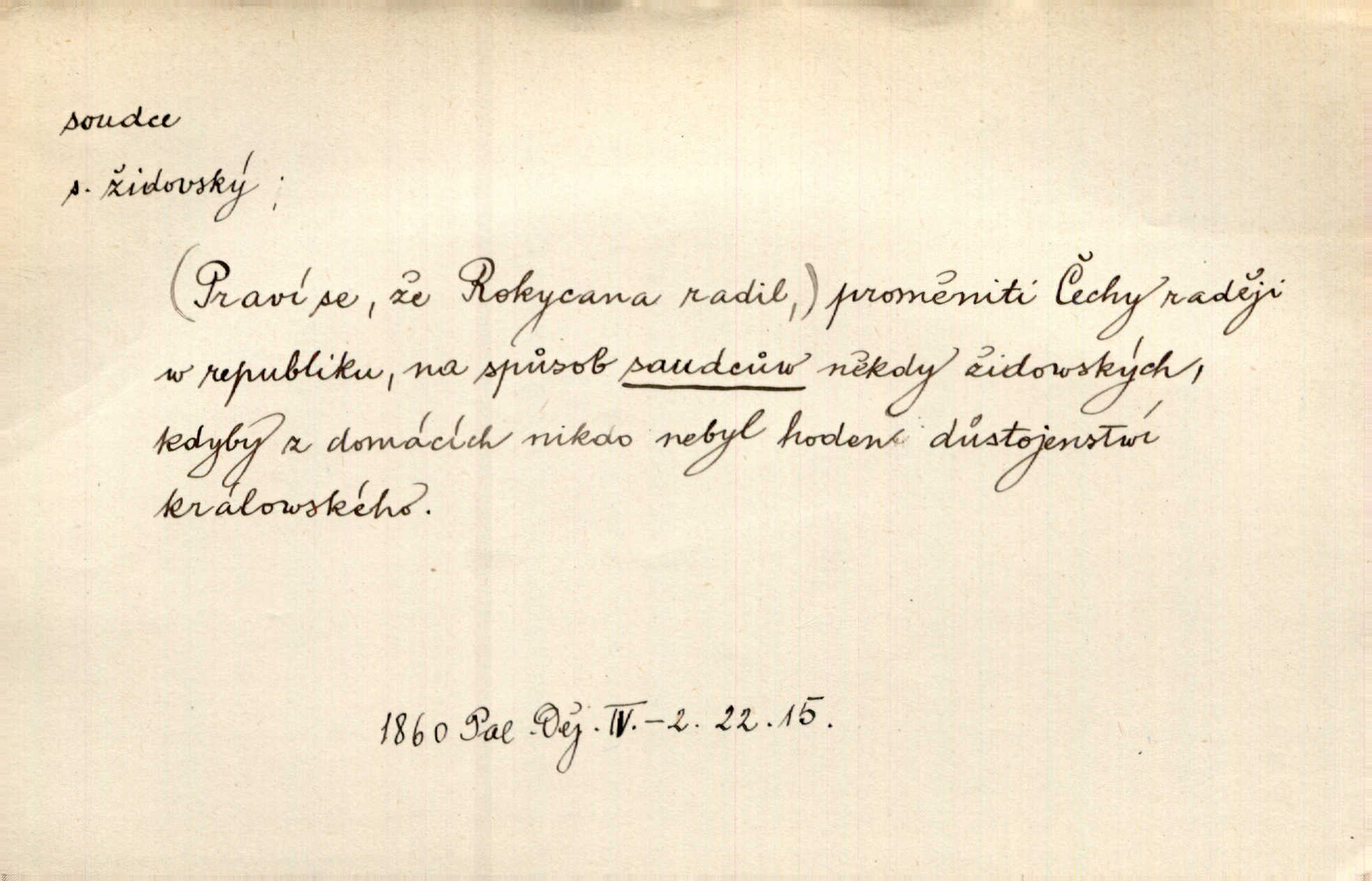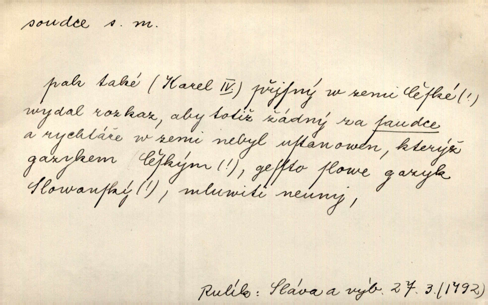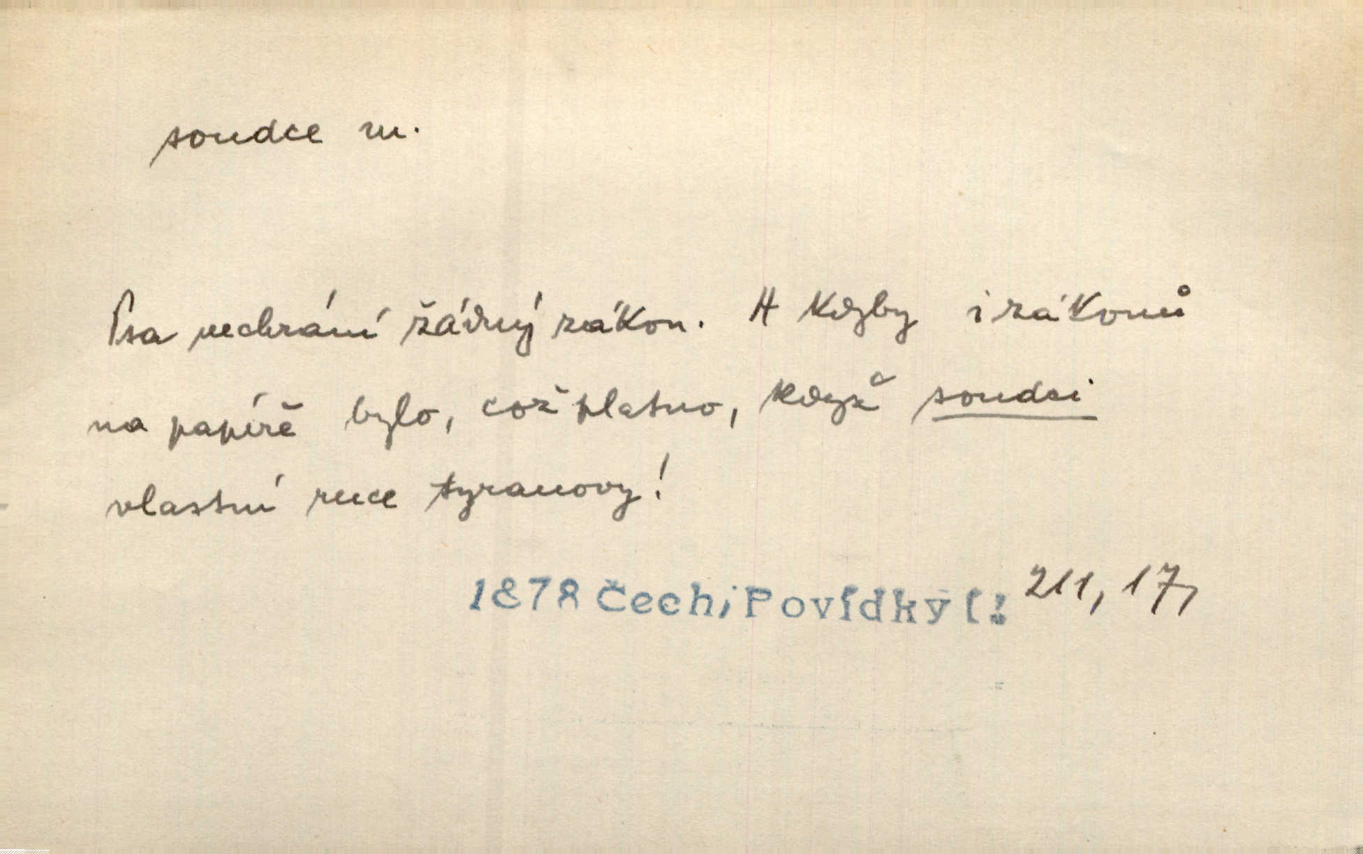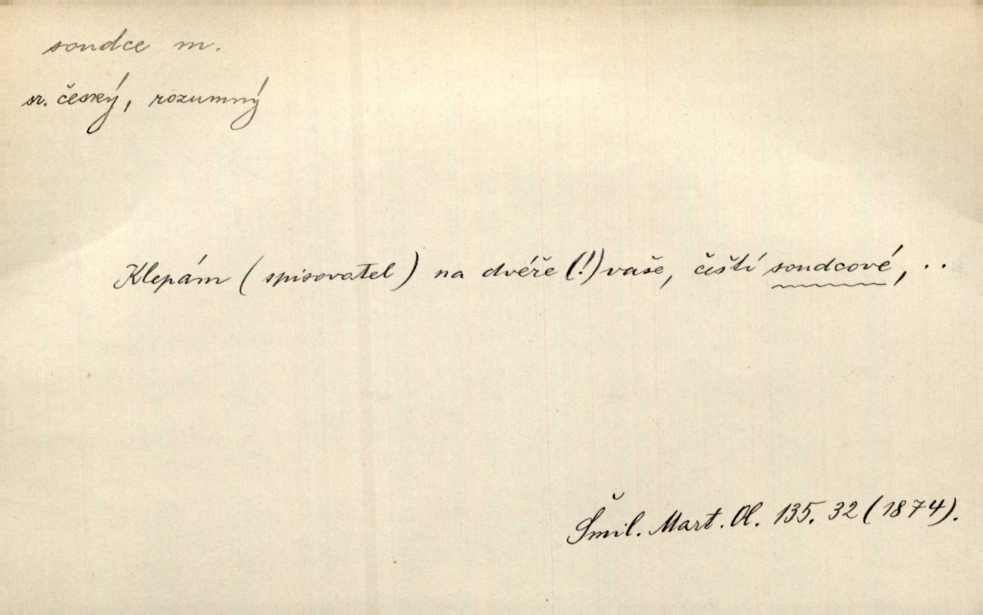 - soudce, -e (dial. soudcí, -ho) m. osoba pověřená řízením a rozhodováním pře. Soudce musel souditi. Šmil. Byl pyšný a nechtěl uposlechnouti nálezu soudcova. Helf. Vejdi, kam chceš, vejdi k hejtmanovi, soudcímu, a řekni jenom: Šolar! Nic víc. Mat. Dívajíc se mu do očí jako vyšetřující soudce, dala mu [kuchařka faráři] otázku. Baar. Nevíš-li a nekážeš-li ty, nevinná krev že volá do oblak o pomstu nejpronikavěji a že volání její před spravedlivého soudce proráží nejjistěji? Třeb. Jednou budeš umírati a před věčným soudcem za sebe účet skládati Bohem. Šmil. Dej, Soudce věčný, ať jak chci, tak mohu! Krás. Kdo tam v osamělé době s modlitbou se Soudci pokloní? Jabl. Práv. vyšetřující soudce člen krajského soudu, jemuž náleží konati přípravné řízení (vyhledávání i vyšetřování) o zločinech a přečinech. Soudce lidový osoba, jež nejsouc soudcem z povolání, jest povolána k soudcovskému spolupůsobení v trestním řízení. Vojenský soudce důstojník justiční služby, vykonávající vojenskou soudní pravomoc. Soudce laik vojenská osoba povolaná jako přísedící při soudním líčení. D rozhodčí při nějaké soutěži, při závodu, zápase a pod. Bylo umluveno, že bude místo souboje v Třebovli, soudcové boje pan Tista i rytíř Radimský. Ritt. V roce 1881 byl soudcem v polském konkursu básní o Calderonovi. Mach. Sport. rozhodčí. D kdo pronáší posudek, soud, posuzovatel, kritik. Z výkladu tohoto pozná každý nepodjatý soudce, že my oboru činnosti čili područí moci centralní anebo říšské nikoli nechceme klásti meze nedostatečné a ouzké. Pal. A Bassompierre byl všeobecně uznaným soudcem vnad ženských. Třeb. Shakespeare, básnický soudce minulosti, vystupuje tu [v Richardu III.] jako tvrdý, neúprosný posuzovatel. Týd. rozhl. Pochvalně se soudcové taktéž zmínili o kusu „Zdeněk ze Zásmuk“. Ner. Druhým soudcem ve věci vkusu je cit. Tille. Neznám jiného soudce než své svědomí. Zey. Nad mým svědomím neuznávám já nikoho na zemi za soudce. Pal. D Bibl. soudcové občasní osvoboditelé a vládci jednotlivých pokolení izraelských. Kniha Soudců část Starého Zákona.