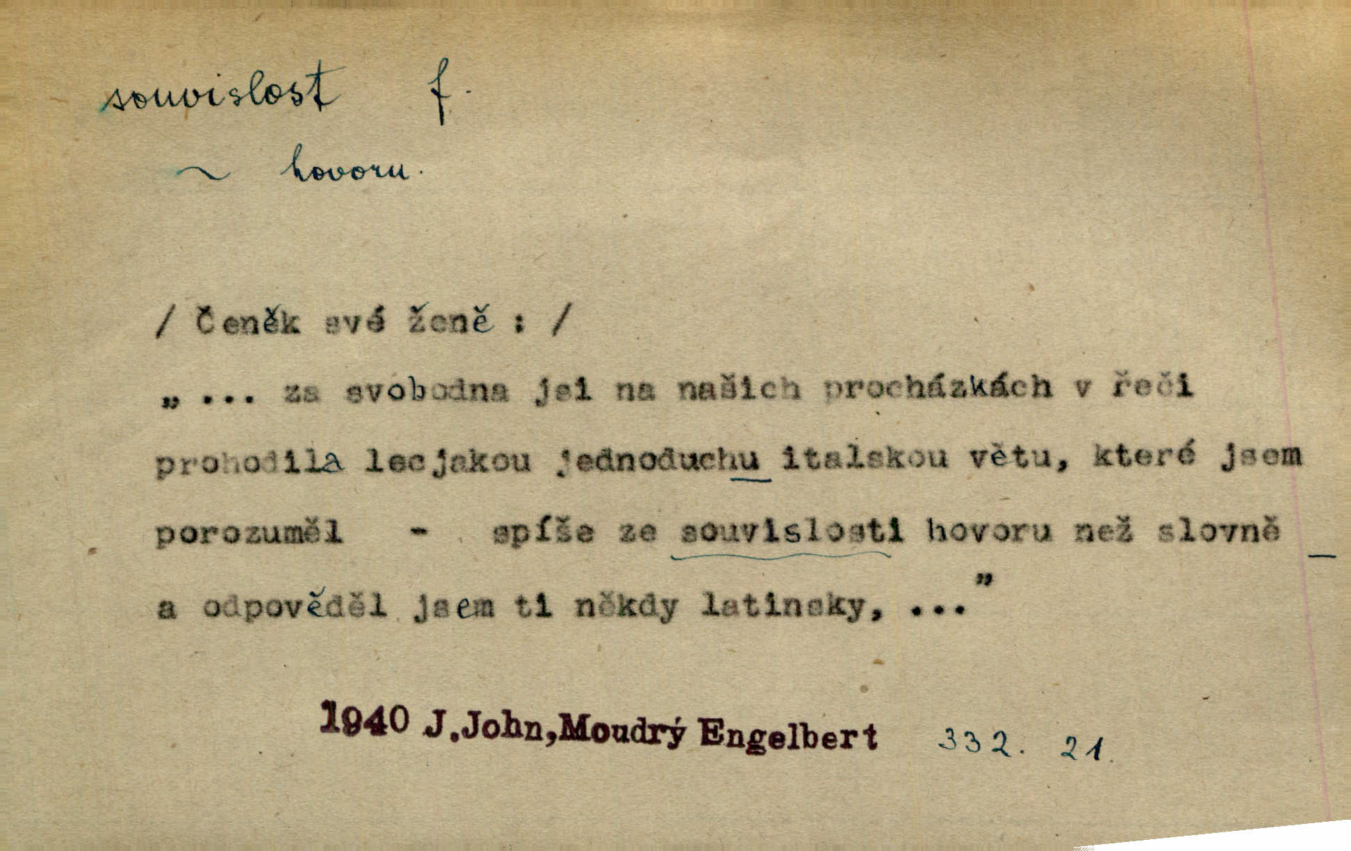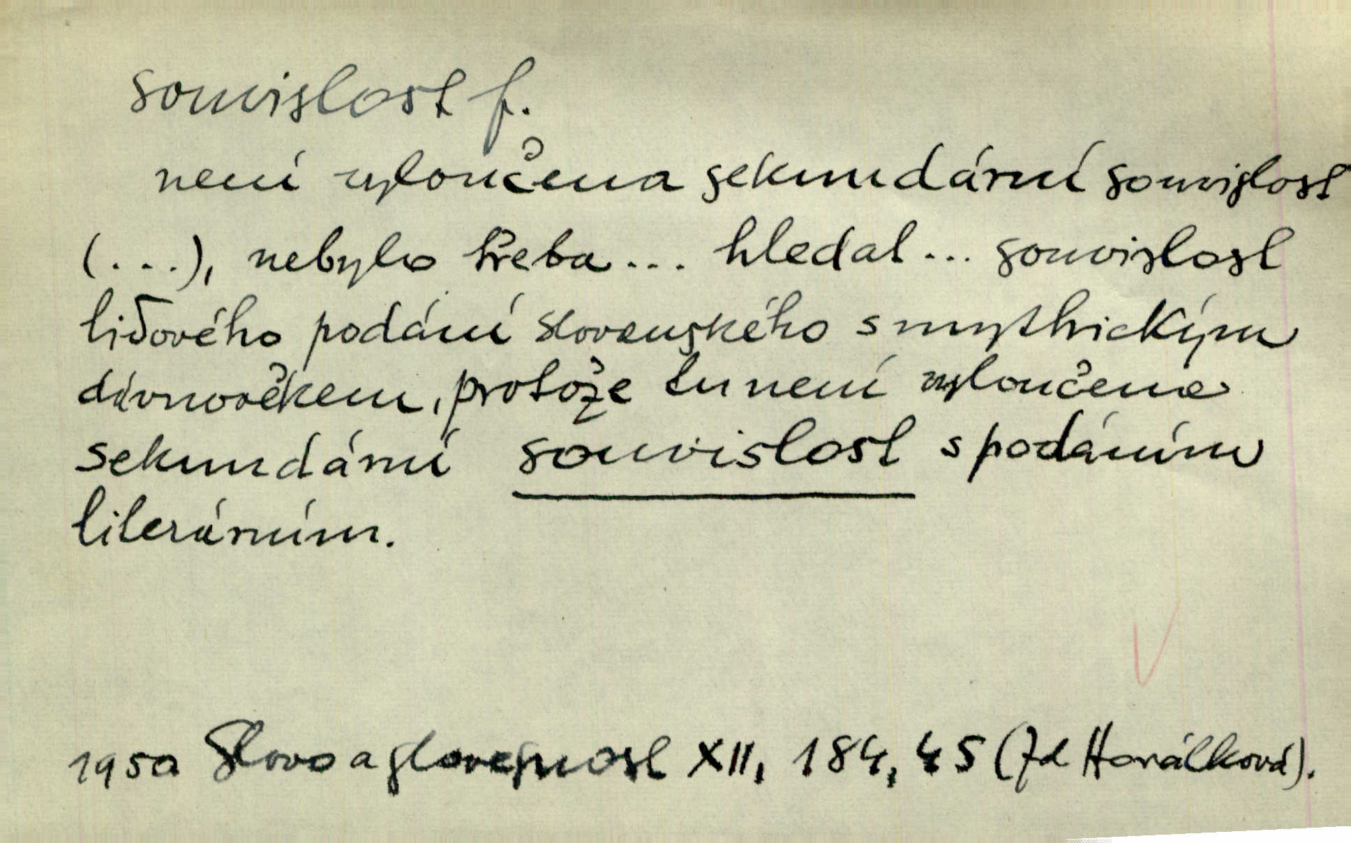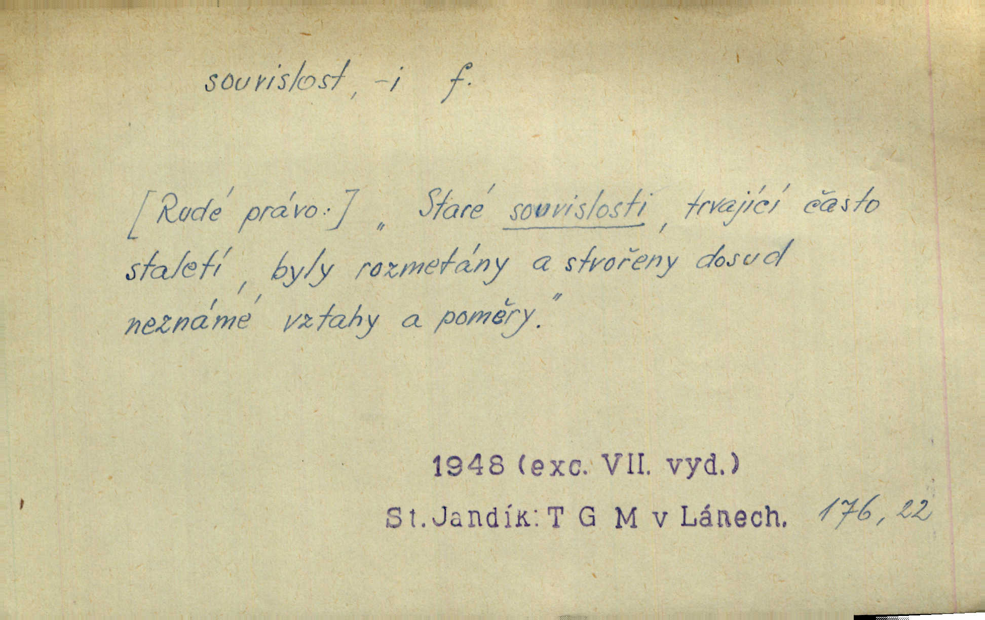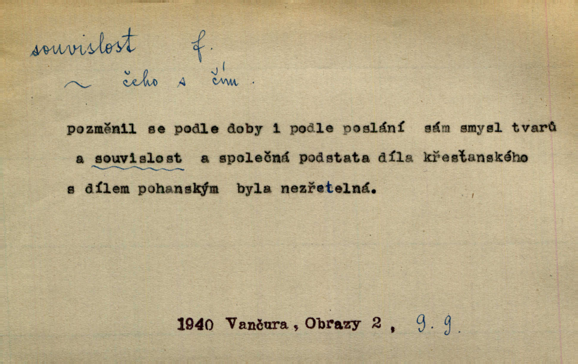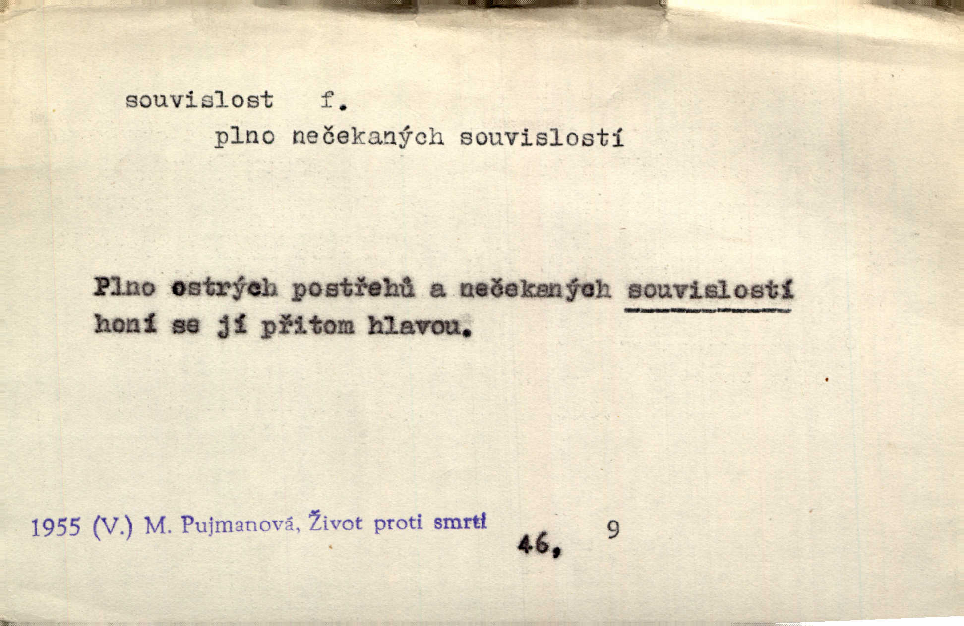 - souvislost, -i f. vzájemná spojitost, plynulost, nepřerušovanost. To byla první věta, jakou v souvislosti pronésti se mu dnes podařilo bez přerušování. Just. Velitel roty se stará o udržení souvislosti palby, aby nepřítel neměl před sebou nepostřelovanou mezeru. Voj. sl. kn. D vzájemný vztah, poměr k něčemu. Musím si uvést v souvislost to, co vidím. K. Čap. Těžko udati, jakou vnitřní souvislost tato slova měla. Hál. Při vší své fantastičnosti zůstává [Aleš] i tu v živé souvislosti s přírodou. V. Mrš. Novákova mohutná Jihočeská suita je důkazem nesmírné souvislosti skladatelovy s rodnou zemí. Rozhlas. Srovnáváme-li vespolek slova téhož významu v různé souvislosti větné, poznáváme, v jaké prvky lze slova rozčleňovati. Ertl. Práv. souvislost v řízení trestním.