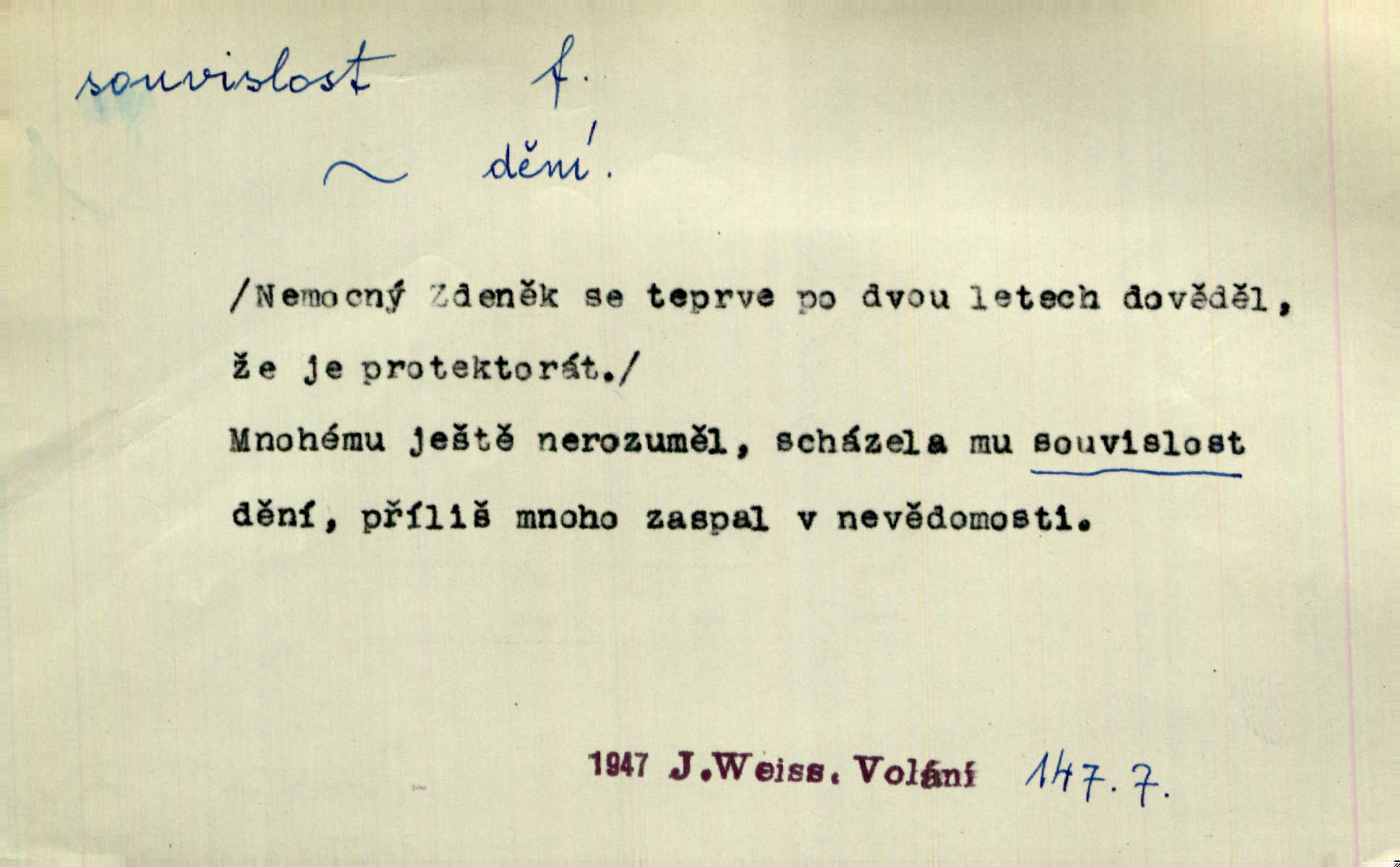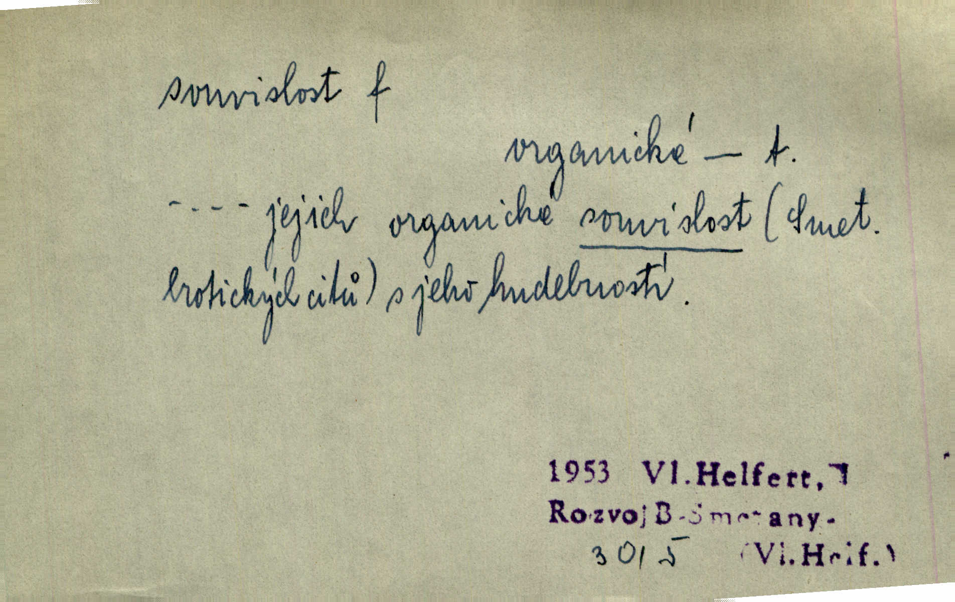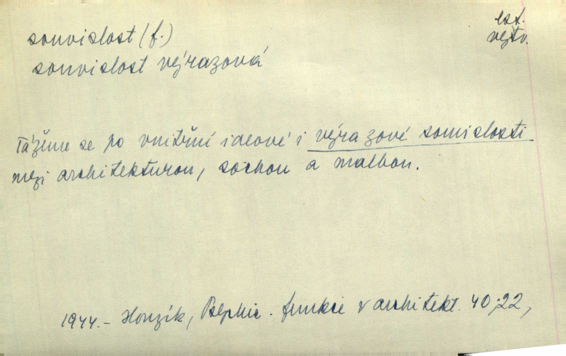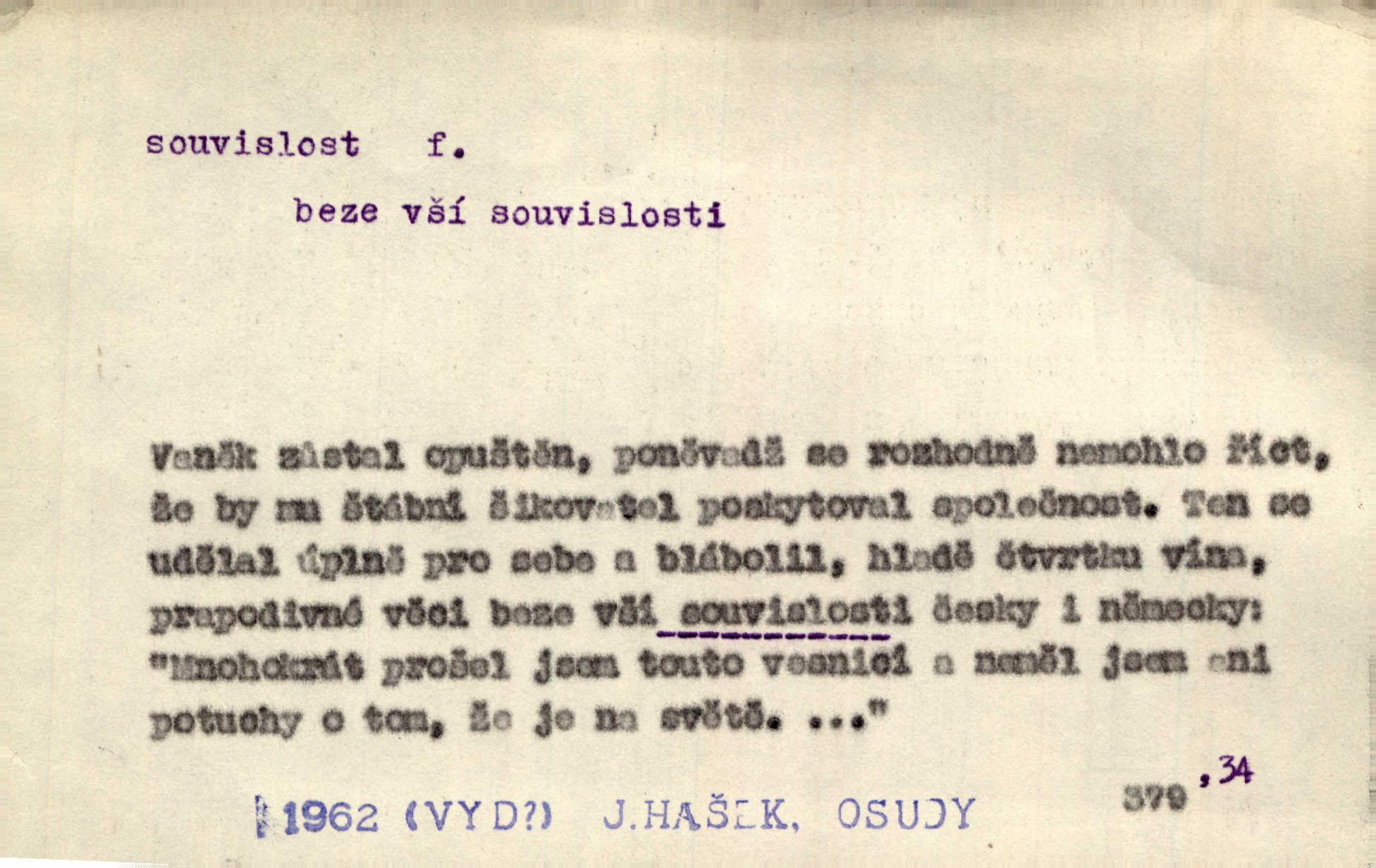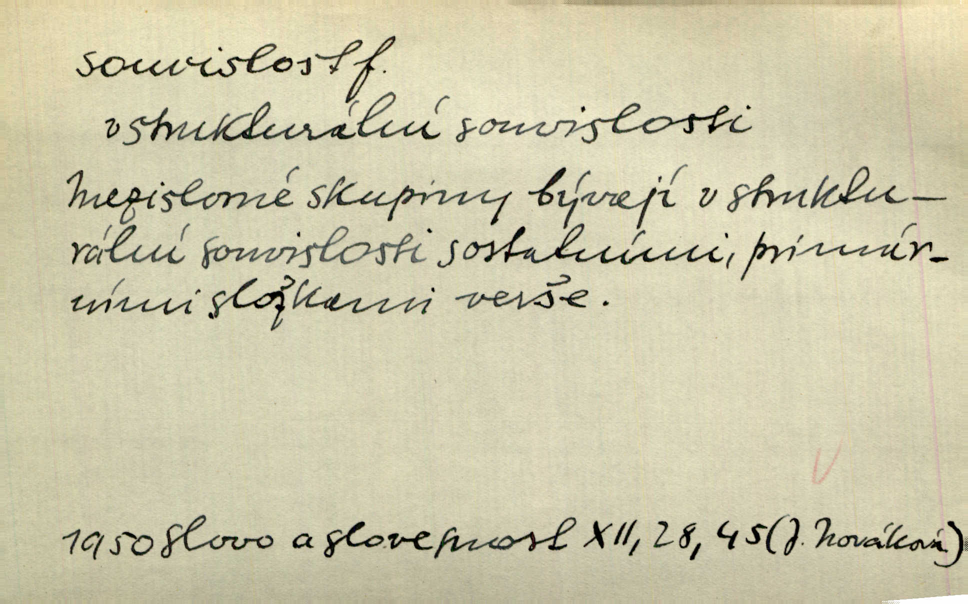 - souvislost, -i f. vzájemná spojitost, plynulost, nepřerušovanost. To byla první věta, jakou v souvislosti pronésti se mu dnes podařilo bez přerušování. Just. Velitel roty se stará o udržení souvislosti palby, aby nepřítel neměl před sebou nepostřelovanou mezeru. Voj. sl. kn. D vzájemný vztah, poměr k něčemu. Musím si uvést v souvislost to, co vidím. K. Čap. Těžko udati, jakou vnitřní souvislost tato slova měla. Hál. Při vší své fantastičnosti zůstává [Aleš] i tu v živé souvislosti s přírodou. V. Mrš. Novákova mohutná Jihočeská suita je důkazem nesmírné souvislosti skladatelovy s rodnou zemí. Rozhlas. Srovnáváme-li vespolek slova téhož významu v různé souvislosti větné, poznáváme, v jaké prvky lze slova rozčleňovati. Ertl. Práv. souvislost v řízení trestním.
