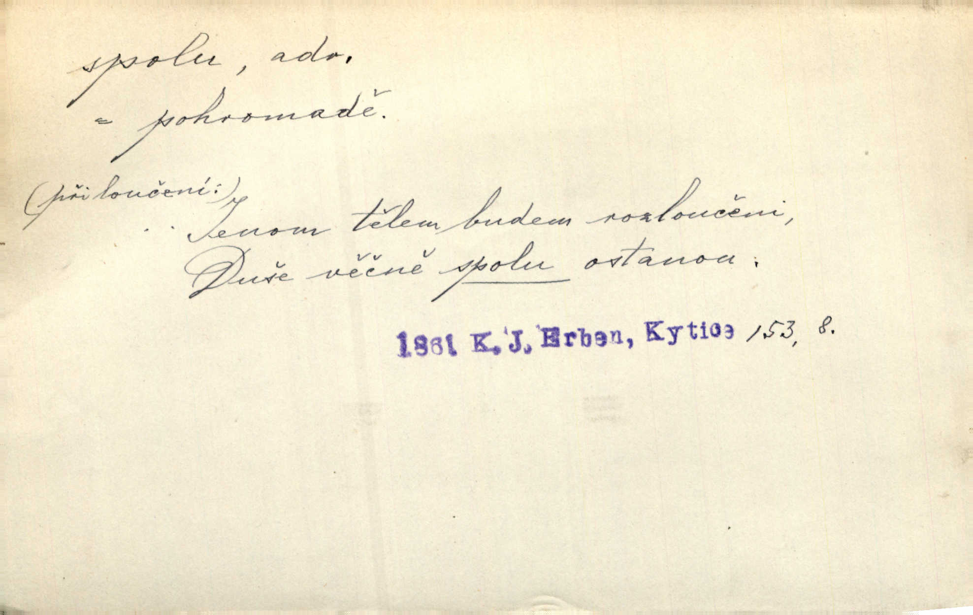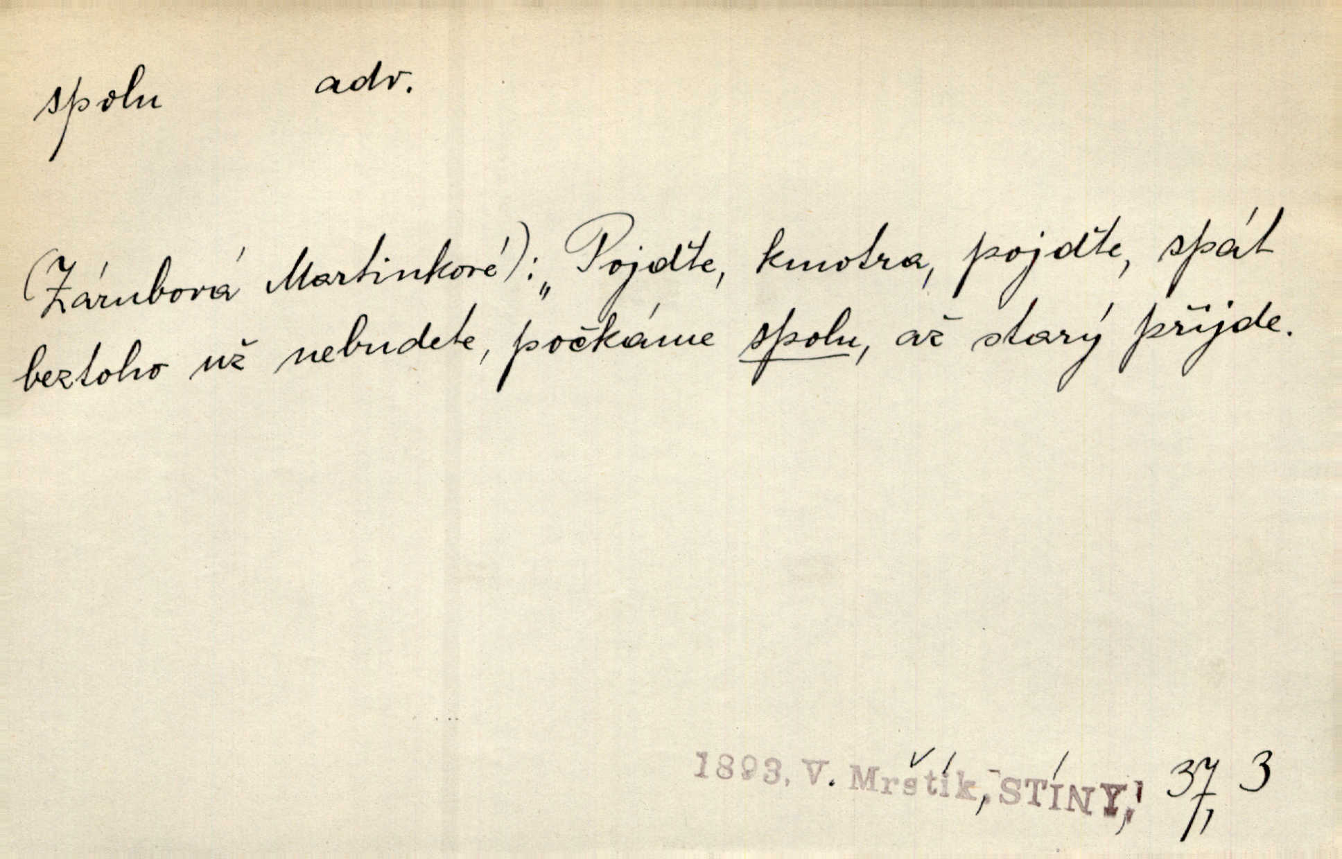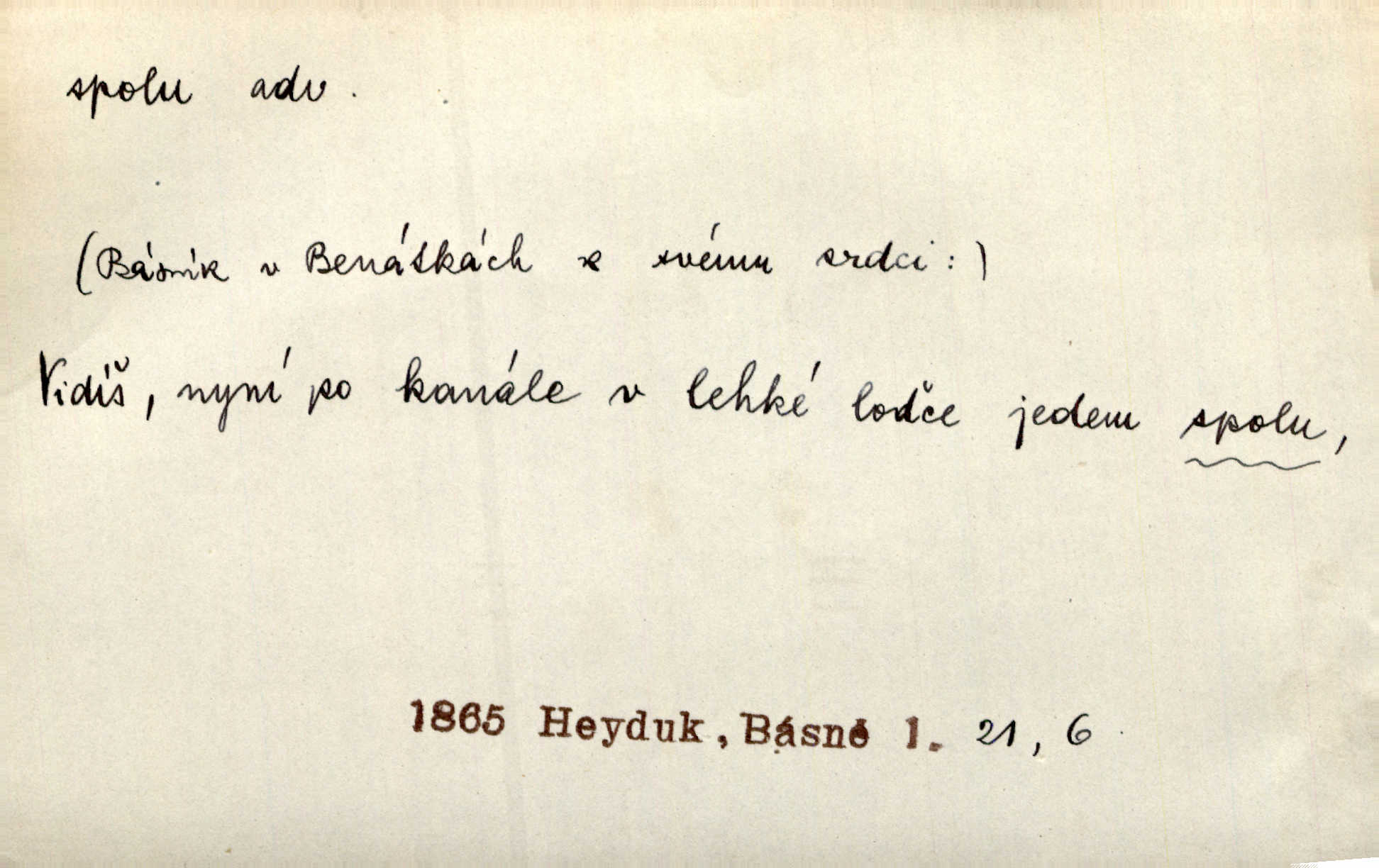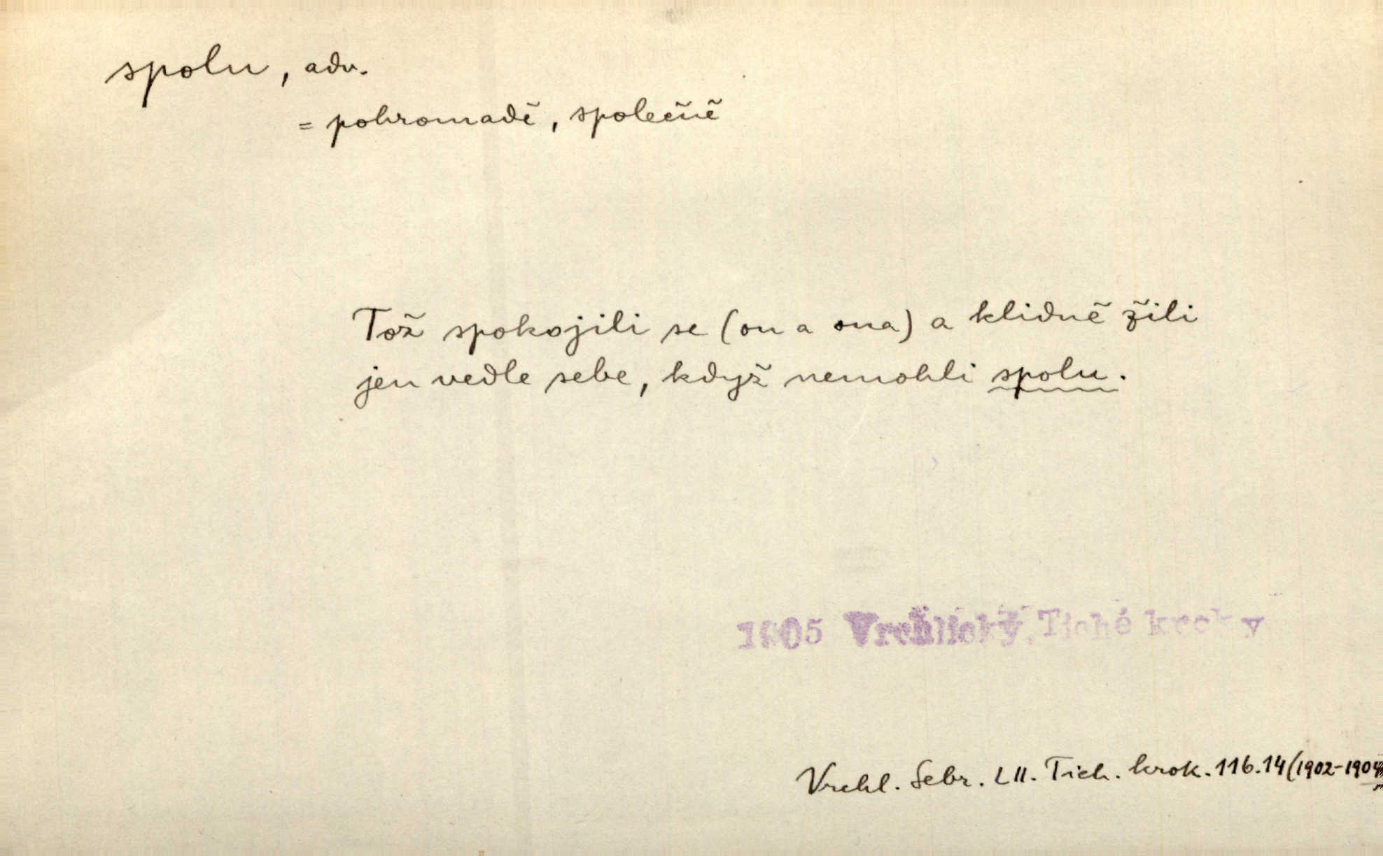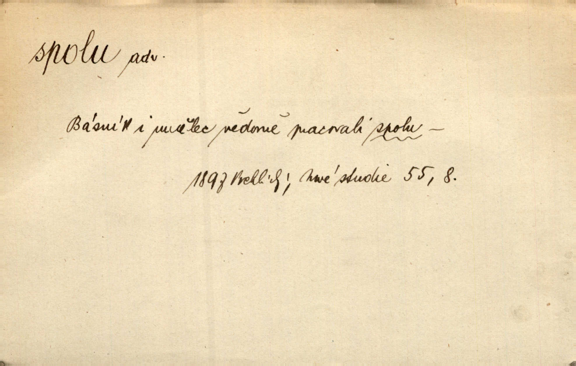 - spolu (bás. spol) adv. vyjadřuje blízkost, společnost při něčem, pohromadě, společně, zpr. o dvou. Ti dva už pili mnohou číši spolu. Ner. Tak půjdeme spolu — jestli mne vezmeš s sebou. Rais. Seděly spolu až na konci stolu. Baar. Básník i umělec vědomě pracovali spolu. Vrch. Jenom tělem budem rozloučeni, duše věčně spolu ostanou. Erb. Počkáme spolu, až starý přijde. V. Mrš. Můj Bože, jak bych stárnul rád, kdybychom stárnuli spolu [s V. Dykem]! H. Jel. Zvuk, oko, dech, jejž cítě viděl [Tomeš] spol — jaký to soulad, jaká duše jasná! Hál. D Lid. býti spolu žíti v manželství, býti manžely. To já mám tuze hodnou ženu. Patnáct let, a kdepak, víc, jsme spolu a ještě jsme se nezlobili. Jir. Půl roku jsou spolu a muž si je celý týden dvě hodiny od ní. Rais. Jsou již spolu několik neděl a ještě se takřka ani neviděli. Pfleg. D jeden s druhým, dohromady; navzájem, mezi sebou. Pojď, promluvíme spolu důvěrně! Vrch. Prostřed světnice se spolu setkali. Jir. Dvoje dvéře spojovaly bez pochyby dva oddíly hradu spolu. Choch. Podivná shoda v tvrzení těch dvou, žádného spojení spolu nemajících osob, vzbuzovala v něm přece žárlivost. Zey. Písničku „ešče jednó a jak se patří zrepetýrovali“ a dobře hlasy spolu srovnali. A. Mrš. Země šerem táhne, širým věkem plyne, měsíc hledí dolů, po staletí hledí, milují se spolu. Svob. Dvě strany se spolu o život a o smrt potýkají. Havl. Prodavač i kupec byli spolu spokojeni. Sab. Má tu rozlehlé revíry spolu souvisící, tvořící takměř jeden široširý hvozd. Jir. Jedli, pili, rozprávěli, dobrou vůli spolu měli. Čel. Mimo hudbu a šachy jsme nikdy víc spolu neměli nestýkali se. Čap. Ch. „Co pak jste zase spolu měly?“ obracela se k ní paní Žehurová oč jste se nepohodly, co jste si udělaly. Šim. D vyjadřuje přidání, připojení; zároveň s někým. Zůstal [na parníku] a jel spolu do Chuchle. Čap. Ch. Maminka se smála; zpívala pak také spolu. Šrám. Lid jásal, vítaje bojovníky, ale když se rozneslo, koho tu spolu nesou, umlkli zástupové a rozestupujíce se smekli uctivě, ana mrtvola [Marušky] kolem nesena. Jir. Vzlet [pták] do vzduchu, vzal spolu mé srdce zmámené. Vrch. D vyjadřuje souvislost, spojitost dalšího členu; rovněž, též, také, i. Zazvonil energicky na svého ceremonáře a spolu důvěrníka. Vach. Básník tento ryze národní patřil spolu veliké rodině umělců. Vrch. Ty [poeto] s tvůrčí rozkoší máš tvůrčí trýzeň spolu. Ner. Byl mladý muž a ohnivý a spolu básník. Win. Potom přistoupil k černé tabuli, vzal křídu a zpívaje kreslil spolu noty. Bouš. Mistr Hubáček a spolu starší počestného cechu krejčovského dal si i na chůzi záležeti. Třeb. Každý poctivý a spolu rozumný člověk jest liberální. Havl. Troubil na trubku a spolu také bubnoval na bubínek. Něm.