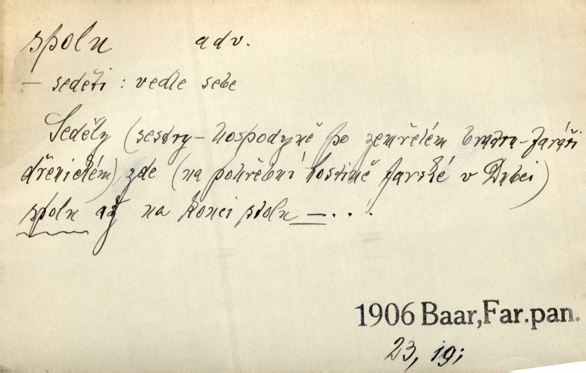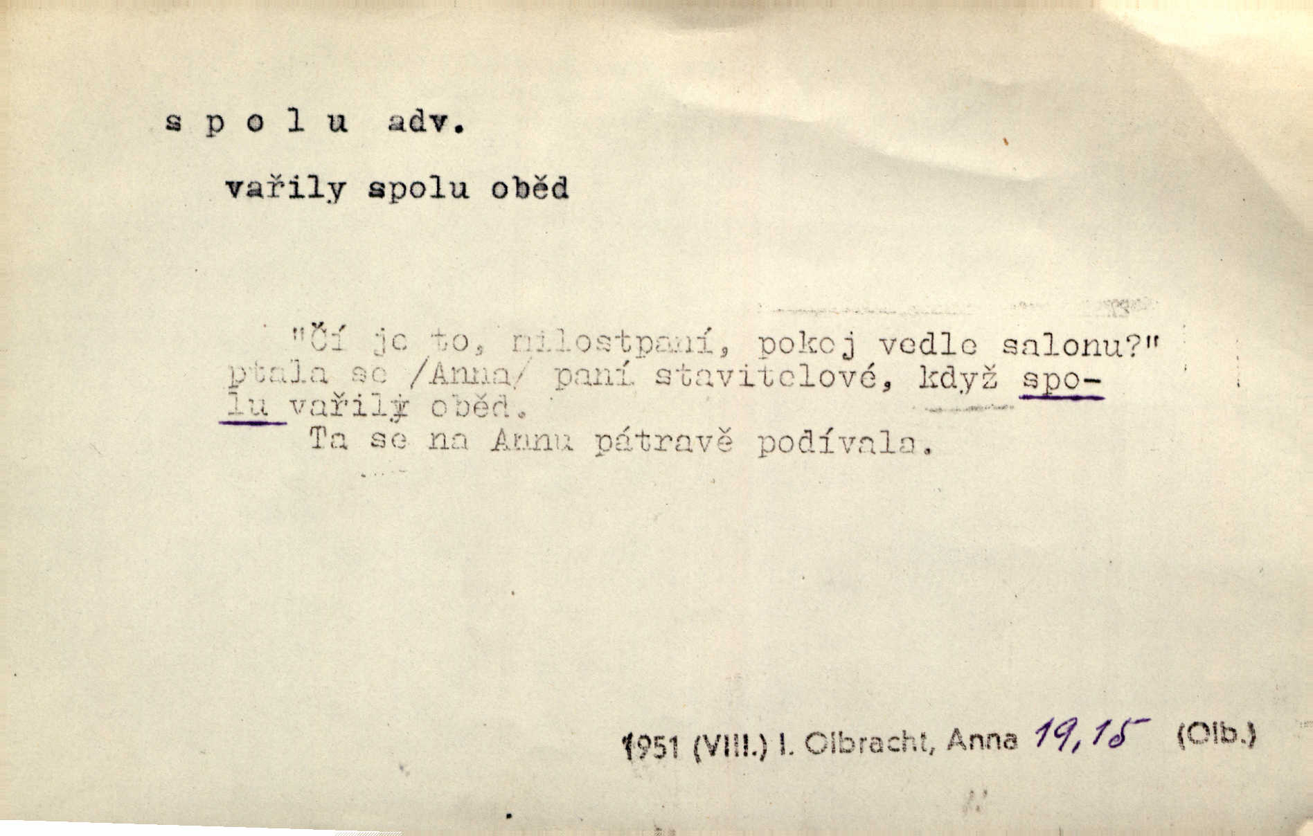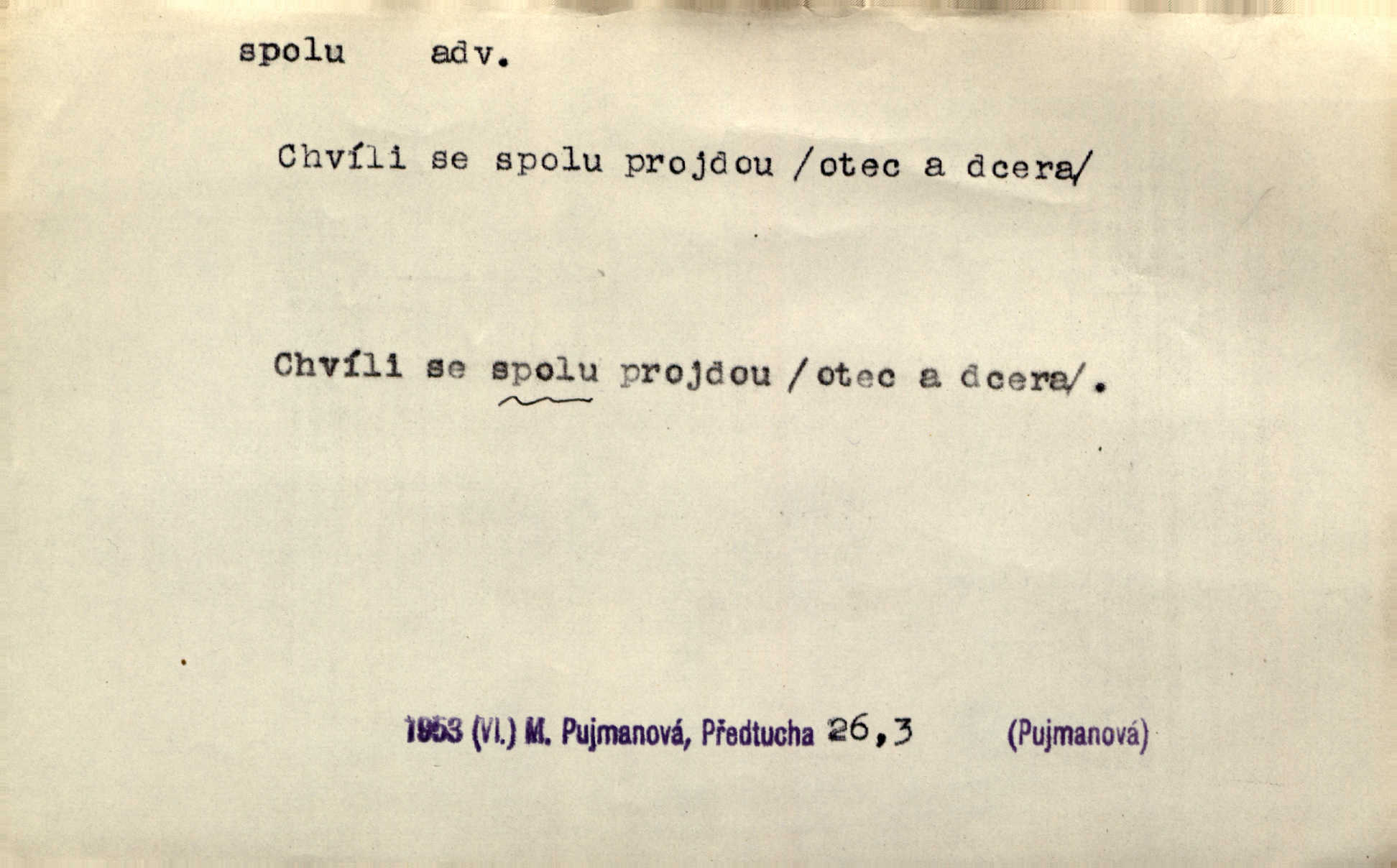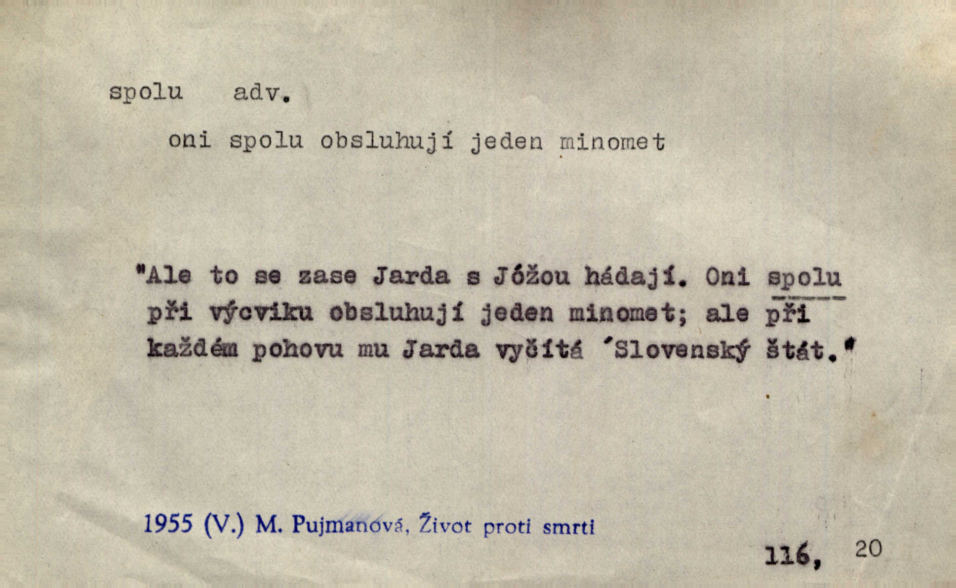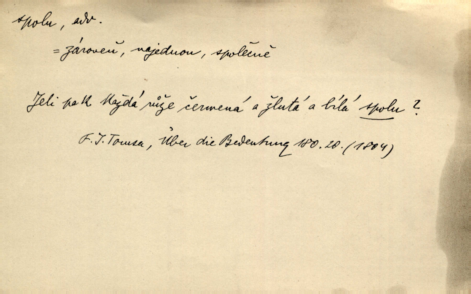 - spolu (bás. spol) adv. vyjadřuje blízkost, společnost při něčem, pohromadě, společně, zpr. o dvou. Ti dva už pili mnohou číši spolu. Ner. Tak půjdeme spolu — jestli mne vezmeš s sebou. Rais. Seděly spolu až na konci stolu. Baar. Básník i umělec vědomě pracovali spolu. Vrch. Jenom tělem budem rozloučeni, duše věčně spolu ostanou. Erb. Počkáme spolu, až starý přijde. V. Mrš. Můj Bože, jak bych stárnul rád, kdybychom stárnuli spolu [s V. Dykem]! H. Jel. Zvuk, oko, dech, jejž cítě viděl [Tomeš] spol — jaký to soulad, jaká duše jasná! Hál. D Lid. býti spolu žíti v manželství, býti manžely. To já mám tuze hodnou ženu. Patnáct let, a kdepak, víc, jsme spolu a ještě jsme se nezlobili. Jir. Půl roku jsou spolu a muž si je celý týden dvě hodiny od ní. Rais. Jsou již spolu několik neděl a ještě se takřka ani neviděli. Pfleg. D jeden s druhým, dohromady; navzájem, mezi sebou. Pojď, promluvíme spolu důvěrně! Vrch. Prostřed světnice se spolu setkali. Jir. Dvoje dvéře spojovaly bez pochyby dva oddíly hradu spolu. Choch. Podivná shoda v tvrzení těch dvou, žádného spojení spolu nemajících osob, vzbuzovala v něm přece žárlivost. Zey. Písničku „ešče jednó a jak se patří zrepetýrovali“ a dobře hlasy spolu srovnali. A. Mrš. Země šerem táhne, širým věkem plyne, měsíc hledí dolů, po staletí hledí, milují se spolu. Svob. Dvě strany se spolu o život a o smrt potýkají. Havl. Prodavač i kupec byli spolu spokojeni. Sab. Má tu rozlehlé revíry spolu souvisící, tvořící takměř jeden široširý hvozd. Jir. Jedli, pili, rozprávěli, dobrou vůli spolu měli. Čel. Mimo hudbu a šachy jsme nikdy víc spolu neměli nestýkali se. Čap. Ch. „Co pak jste zase spolu měly?“ obracela se k ní paní Žehurová oč jste se nepohodly, co jste si udělaly. Šim. D vyjadřuje přidání, připojení; zároveň s někým. Zůstal [na parníku] a jel spolu do Chuchle. Čap. Ch. Maminka se smála; zpívala pak také spolu. Šrám. Lid jásal, vítaje bojovníky, ale když se rozneslo, koho tu spolu nesou, umlkli zástupové a rozestupujíce se smekli uctivě, ana mrtvola [Marušky] kolem nesena. Jir. Vzlet [pták] do vzduchu, vzal spolu mé srdce zmámené. Vrch. D vyjadřuje souvislost, spojitost dalšího členu; rovněž, též, také, i. Zazvonil energicky na svého ceremonáře a spolu důvěrníka. Vach. Básník tento ryze národní patřil spolu veliké rodině umělců. Vrch. Ty [poeto] s tvůrčí rozkoší máš tvůrčí trýzeň spolu. Ner. Byl mladý muž a ohnivý a spolu básník. Win. Potom přistoupil k černé tabuli, vzal křídu a zpívaje kreslil spolu noty. Bouš. Mistr Hubáček a spolu starší počestného cechu krejčovského dal si i na chůzi záležeti. Třeb. Každý poctivý a spolu rozumný člověk jest liberální. Havl. Troubil na trubku a spolu také bubnoval na bubínek. Něm.