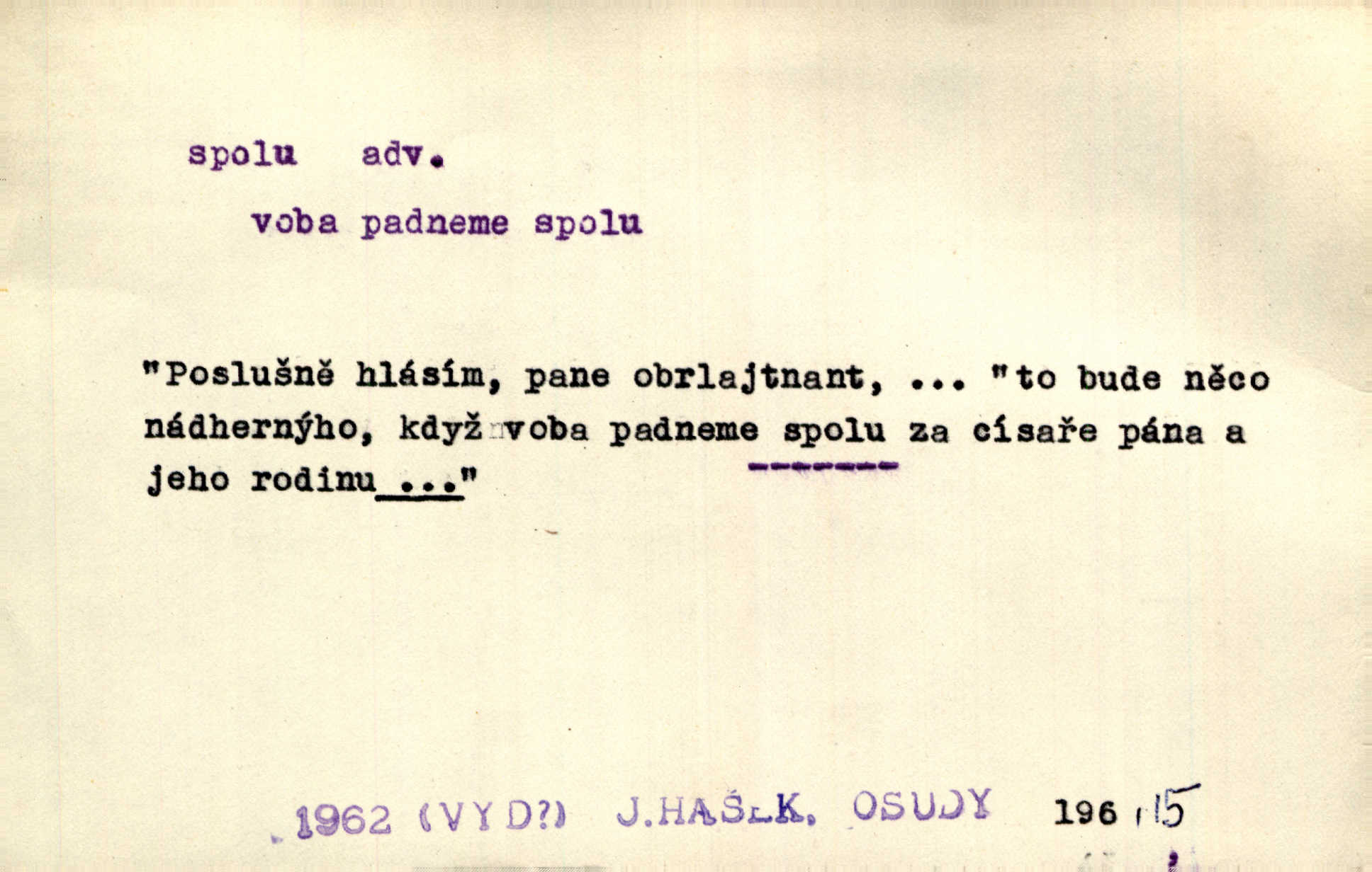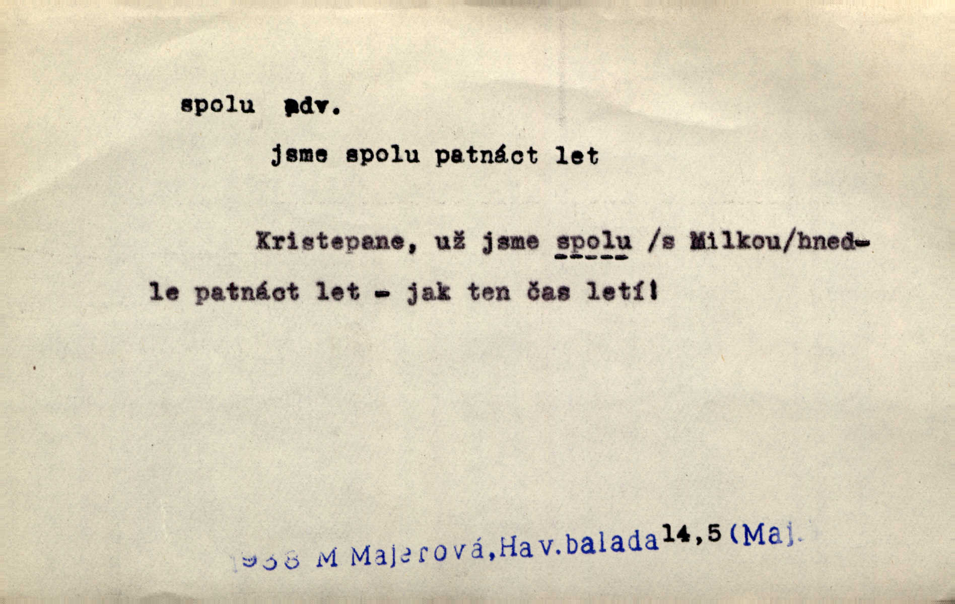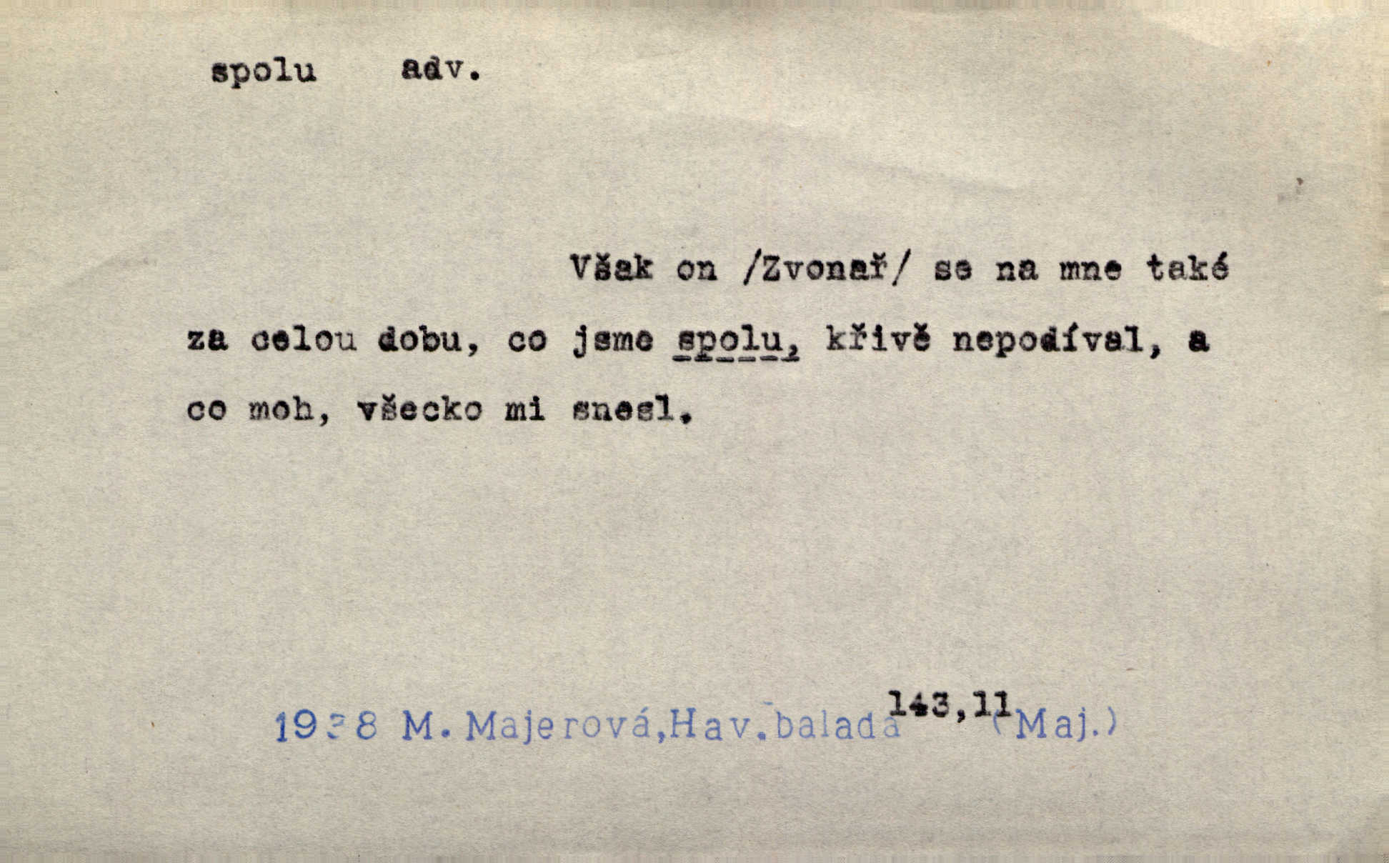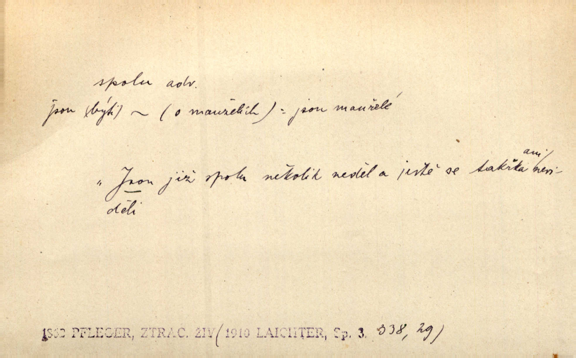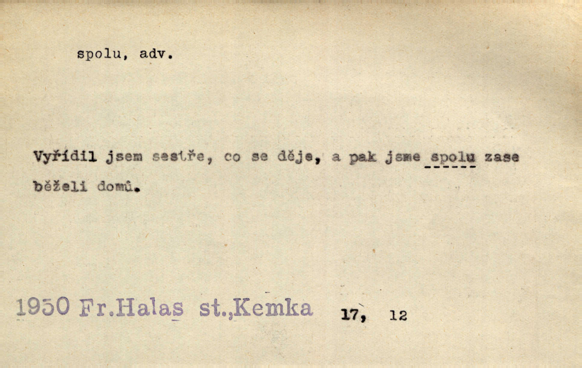 - spolu (bás. spol) adv. vyjadřuje blízkost, společnost při něčem, pohromadě, společně, zpr. o dvou. Ti dva už pili mnohou číši spolu. Ner. Tak půjdeme spolu — jestli mne vezmeš s sebou. Rais. Seděly spolu až na konci stolu. Baar. Básník i umělec vědomě pracovali spolu. Vrch. Jenom tělem budem rozloučeni, duše věčně spolu ostanou. Erb. Počkáme spolu, až starý přijde. V. Mrš. Můj Bože, jak bych stárnul rád, kdybychom stárnuli spolu [s V. Dykem]! H. Jel. Zvuk, oko, dech, jejž cítě viděl [Tomeš] spol — jaký to soulad, jaká duše jasná! Hál. D Lid. býti spolu žíti v manželství, býti manžely. To já mám tuze hodnou ženu. Patnáct let, a kdepak, víc, jsme spolu a ještě jsme se nezlobili. Jir. Půl roku jsou spolu a muž si je celý týden dvě hodiny od ní. Rais. Jsou již spolu několik neděl a ještě se takřka ani neviděli. Pfleg. D jeden s druhým, dohromady; navzájem, mezi sebou. Pojď, promluvíme spolu důvěrně! Vrch. Prostřed světnice se spolu setkali. Jir. Dvoje dvéře spojovaly bez pochyby dva oddíly hradu spolu. Choch. Podivná shoda v tvrzení těch dvou, žádného spojení spolu nemajících osob, vzbuzovala v něm přece žárlivost. Zey. Písničku „ešče jednó a jak se patří zrepetýrovali“ a dobře hlasy spolu srovnali. A. Mrš. Země šerem táhne, širým věkem plyne, měsíc hledí dolů, po staletí hledí, milují se spolu. Svob. Dvě strany se spolu o život a o smrt potýkají. Havl. Prodavač i kupec byli spolu spokojeni. Sab. Má tu rozlehlé revíry spolu souvisící, tvořící takměř jeden široširý hvozd. Jir. Jedli, pili, rozprávěli, dobrou vůli spolu měli. Čel. Mimo hudbu a šachy jsme nikdy víc spolu neměli nestýkali se. Čap. Ch. „Co pak jste zase spolu měly?“ obracela se k ní paní Žehurová oč jste se nepohodly, co jste si udělaly. Šim. D vyjadřuje přidání, připojení; zároveň s někým. Zůstal [na parníku] a jel spolu do Chuchle. Čap. Ch. Maminka se smála; zpívala pak také spolu. Šrám. Lid jásal, vítaje bojovníky, ale když se rozneslo, koho tu spolu nesou, umlkli zástupové a rozestupujíce se smekli uctivě, ana mrtvola [Marušky] kolem nesena. Jir. Vzlet [pták] do vzduchu, vzal spolu mé srdce zmámené. Vrch. D vyjadřuje souvislost, spojitost dalšího členu; rovněž, též, také, i. Zazvonil energicky na svého ceremonáře a spolu důvěrníka. Vach. Básník tento ryze národní patřil spolu veliké rodině umělců. Vrch. Ty [poeto] s tvůrčí rozkoší máš tvůrčí trýzeň spolu. Ner. Byl mladý muž a ohnivý a spolu básník. Win. Potom přistoupil k černé tabuli, vzal křídu a zpívaje kreslil spolu noty. Bouš. Mistr Hubáček a spolu starší počestného cechu krejčovského dal si i na chůzi záležeti. Třeb. Každý poctivý a spolu rozumný člověk jest liberální. Havl. Troubil na trubku a spolu také bubnoval na bubínek. Něm.