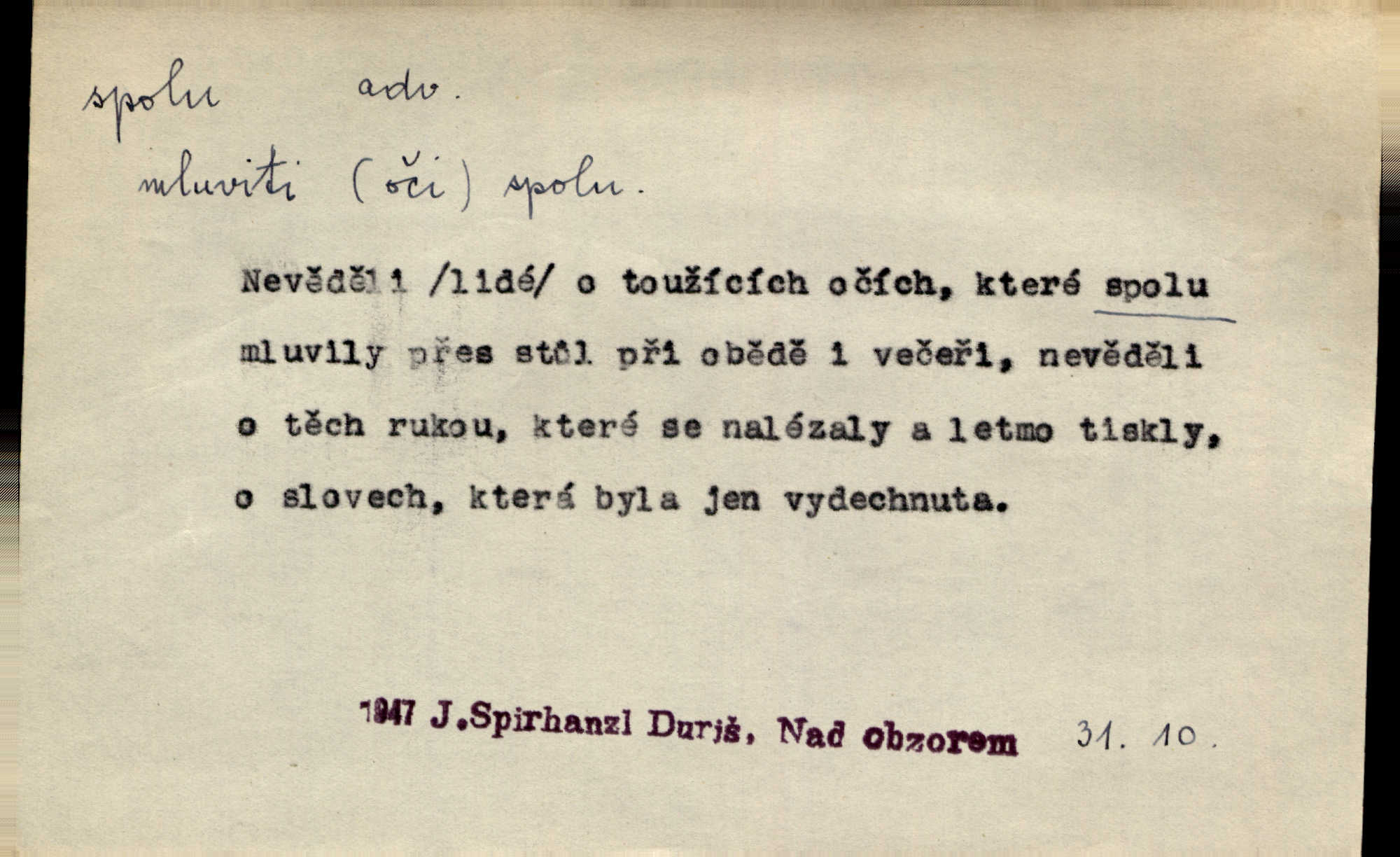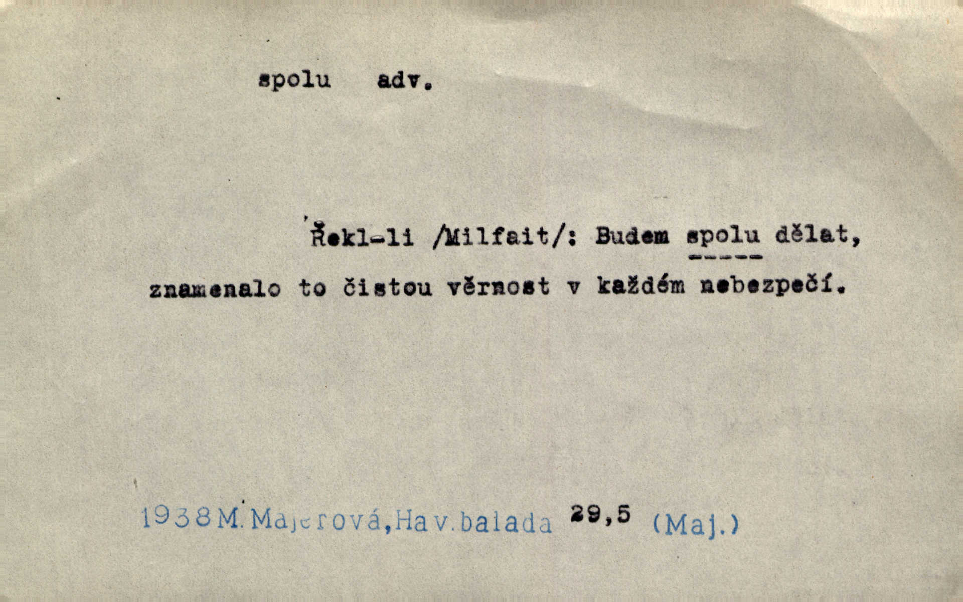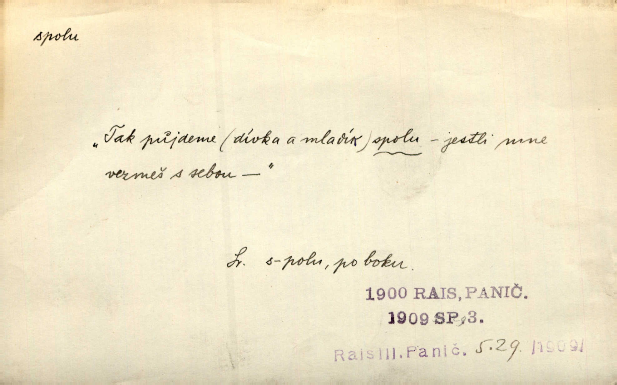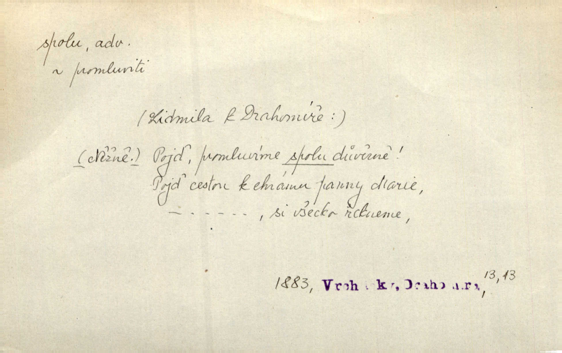 - spolu (bás. spol) adv. vyjadřuje blízkost, společnost při něčem, pohromadě, společně, zpr. o dvou. Ti dva už pili mnohou číši spolu. Ner. Tak půjdeme spolu — jestli mne vezmeš s sebou. Rais. Seděly spolu až na konci stolu. Baar. Básník i umělec vědomě pracovali spolu. Vrch. Jenom tělem budem rozloučeni, duše věčně spolu ostanou. Erb. Počkáme spolu, až starý přijde. V. Mrš. Můj Bože, jak bych stárnul rád, kdybychom stárnuli spolu [s V. Dykem]! H. Jel. Zvuk, oko, dech, jejž cítě viděl [Tomeš] spol — jaký to soulad, jaká duše jasná! Hál. D Lid. býti spolu žíti v manželství, býti manžely. To já mám tuze hodnou ženu. Patnáct let, a kdepak, víc, jsme spolu a ještě jsme se nezlobili. Jir. Půl roku jsou spolu a muž si je celý týden dvě hodiny od ní. Rais. Jsou již spolu několik neděl a ještě se takřka ani neviděli. Pfleg. D jeden s druhým, dohromady; navzájem, mezi sebou. Pojď, promluvíme spolu důvěrně! Vrch. Prostřed světnice se spolu setkali. Jir. Dvoje dvéře spojovaly bez pochyby dva oddíly hradu spolu. Choch. Podivná shoda v tvrzení těch dvou, žádného spojení spolu nemajících osob, vzbuzovala v něm přece žárlivost. Zey. Písničku „ešče jednó a jak se patří zrepetýrovali“ a dobře hlasy spolu srovnali. A. Mrš. Země šerem táhne, širým věkem plyne, měsíc hledí dolů, po staletí hledí, milují se spolu. Svob. Dvě strany se spolu o život a o smrt potýkají. Havl. Prodavač i kupec byli spolu spokojeni. Sab. Má tu rozlehlé revíry spolu souvisící, tvořící takměř jeden široširý hvozd. Jir. Jedli, pili, rozprávěli, dobrou vůli spolu měli. Čel. Mimo hudbu a šachy jsme nikdy víc spolu neměli nestýkali se. Čap. Ch. „Co pak jste zase spolu měly?“ obracela se k ní paní Žehurová oč jste se nepohodly, co jste si udělaly. Šim. D vyjadřuje přidání, připojení; zároveň s někým. Zůstal [na parníku] a jel spolu do Chuchle. Čap. Ch. Maminka se smála; zpívala pak také spolu. Šrám. Lid jásal, vítaje bojovníky, ale když se rozneslo, koho tu spolu nesou, umlkli zástupové a rozestupujíce se smekli uctivě, ana mrtvola [Marušky] kolem nesena. Jir. Vzlet [pták] do vzduchu, vzal spolu mé srdce zmámené. Vrch. D vyjadřuje souvislost, spojitost dalšího členu; rovněž, též, také, i. Zazvonil energicky na svého ceremonáře a spolu důvěrníka. Vach. Básník tento ryze národní patřil spolu veliké rodině umělců. Vrch. Ty [poeto] s tvůrčí rozkoší máš tvůrčí trýzeň spolu. Ner. Byl mladý muž a ohnivý a spolu básník. Win. Potom přistoupil k černé tabuli, vzal křídu a zpívaje kreslil spolu noty. Bouš. Mistr Hubáček a spolu starší počestného cechu krejčovského dal si i na chůzi záležeti. Třeb. Každý poctivý a spolu rozumný člověk jest liberální. Havl. Troubil na trubku a spolu také bubnoval na bubínek. Něm.