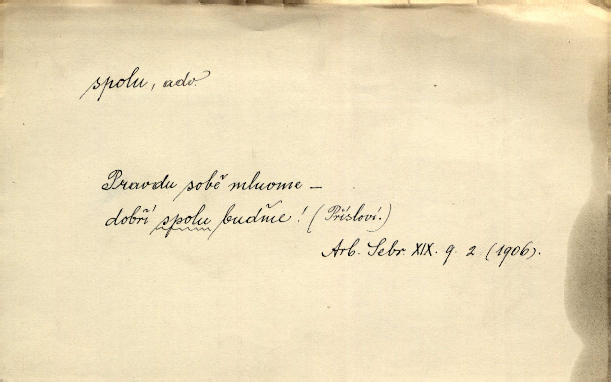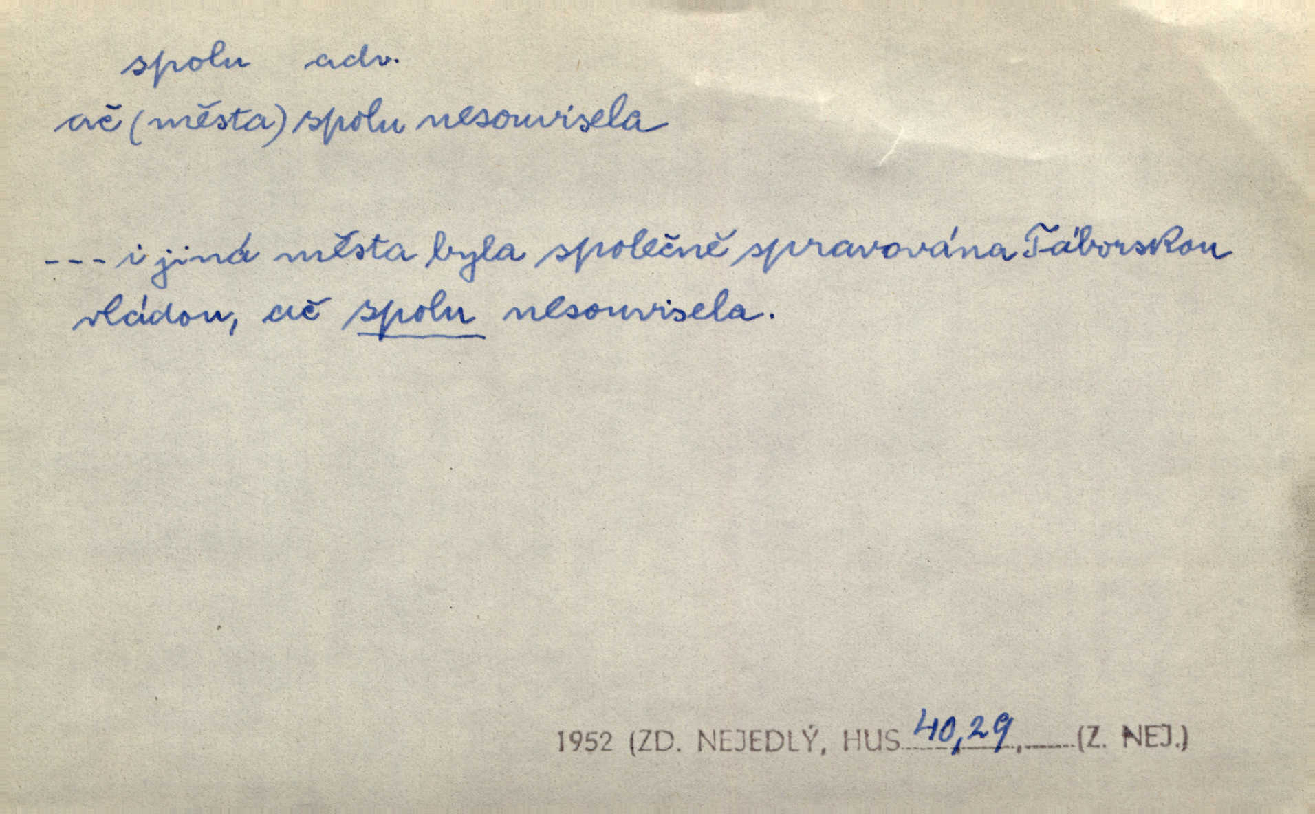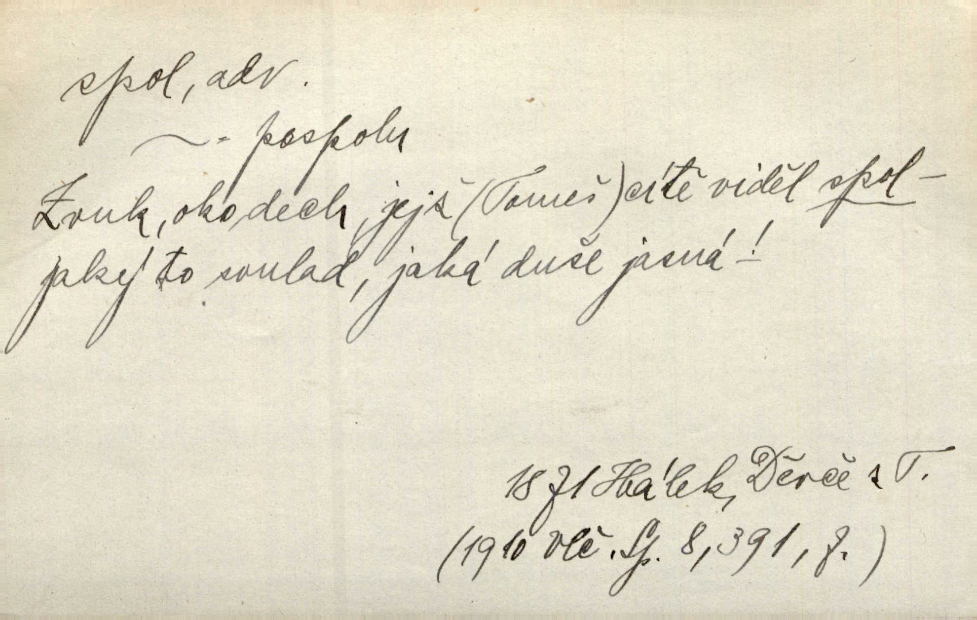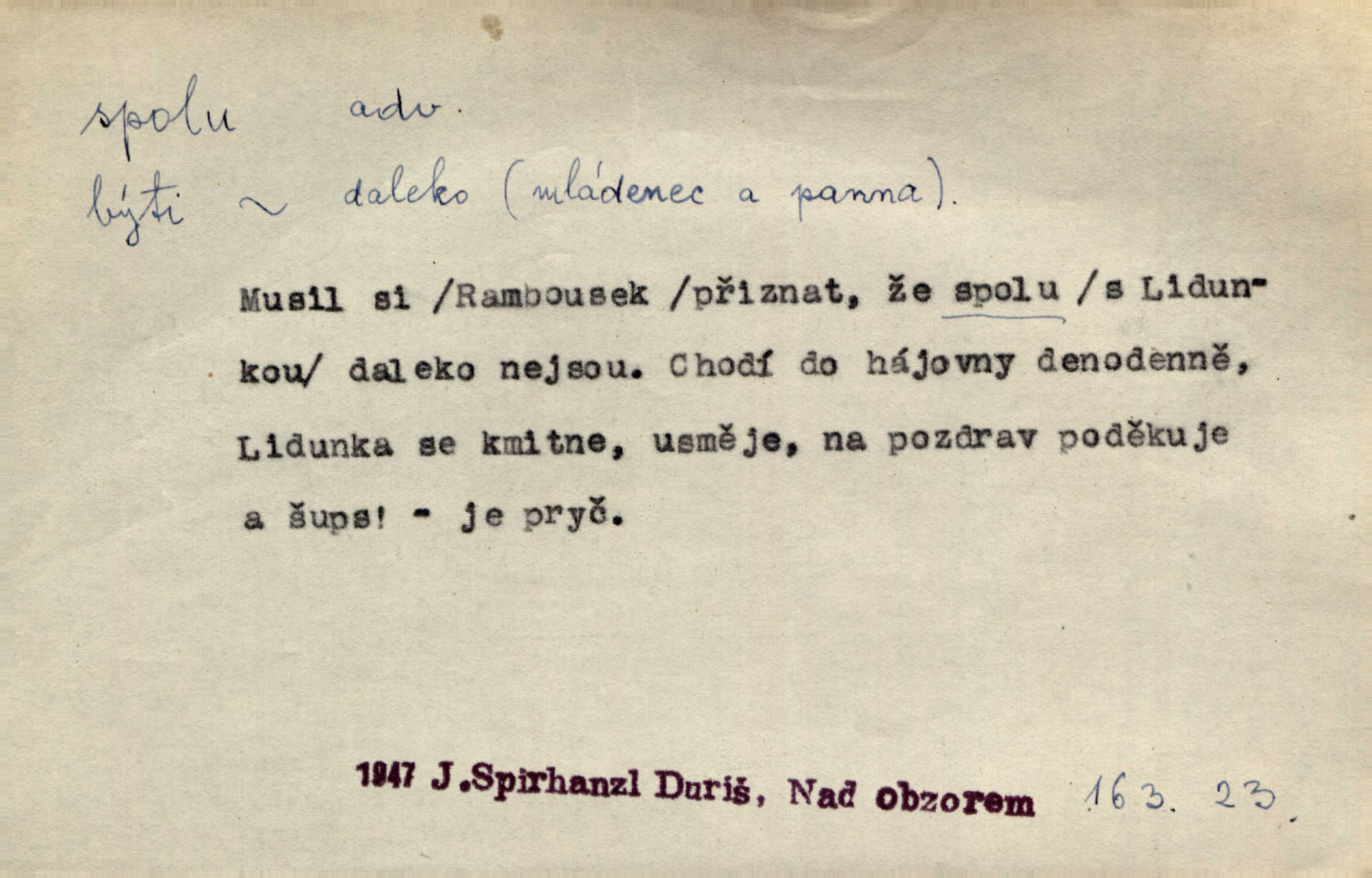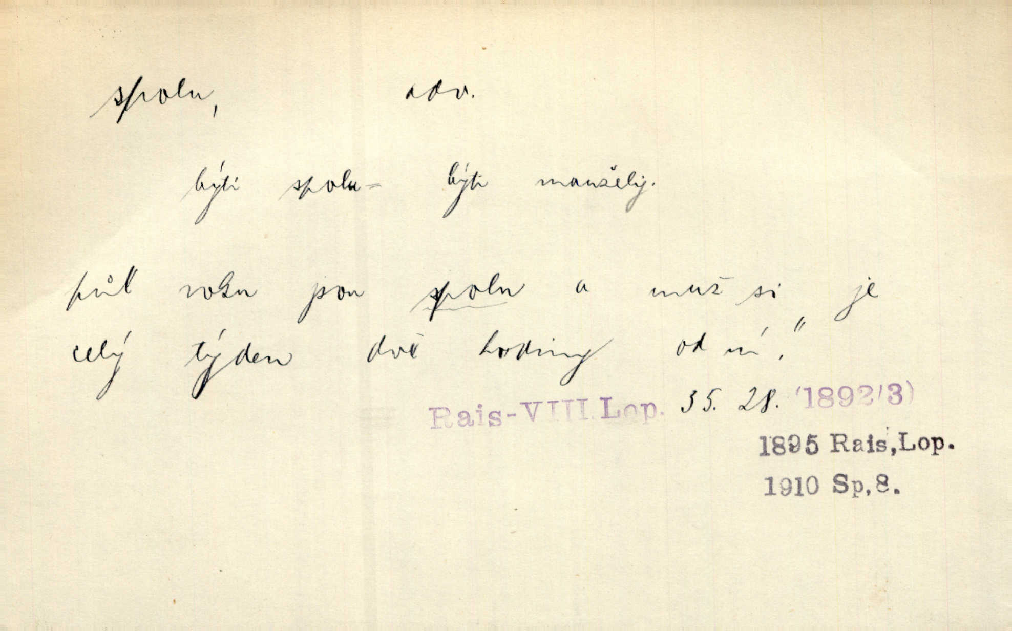 - spolu (bás. spol) adv. vyjadřuje blízkost, společnost při něčem, pohromadě, společně, zpr. o dvou. Ti dva už pili mnohou číši spolu. Ner. Tak půjdeme spolu — jestli mne vezmeš s sebou. Rais. Seděly spolu až na konci stolu. Baar. Básník i umělec vědomě pracovali spolu. Vrch. Jenom tělem budem rozloučeni, duše věčně spolu ostanou. Erb. Počkáme spolu, až starý přijde. V. Mrš. Můj Bože, jak bych stárnul rád, kdybychom stárnuli spolu [s V. Dykem]! H. Jel. Zvuk, oko, dech, jejž cítě viděl [Tomeš] spol — jaký to soulad, jaká duše jasná! Hál. D Lid. býti spolu žíti v manželství, býti manžely. To já mám tuze hodnou ženu. Patnáct let, a kdepak, víc, jsme spolu a ještě jsme se nezlobili. Jir. Půl roku jsou spolu a muž si je celý týden dvě hodiny od ní. Rais. Jsou již spolu několik neděl a ještě se takřka ani neviděli. Pfleg. D jeden s druhým, dohromady; navzájem, mezi sebou. Pojď, promluvíme spolu důvěrně! Vrch. Prostřed světnice se spolu setkali. Jir. Dvoje dvéře spojovaly bez pochyby dva oddíly hradu spolu. Choch. Podivná shoda v tvrzení těch dvou, žádného spojení spolu nemajících osob, vzbuzovala v něm přece žárlivost. Zey. Písničku „ešče jednó a jak se patří zrepetýrovali“ a dobře hlasy spolu srovnali. A. Mrš. Země šerem táhne, širým věkem plyne, měsíc hledí dolů, po staletí hledí, milují se spolu. Svob. Dvě strany se spolu o život a o smrt potýkají. Havl. Prodavač i kupec byli spolu spokojeni. Sab. Má tu rozlehlé revíry spolu souvisící, tvořící takměř jeden široširý hvozd. Jir. Jedli, pili, rozprávěli, dobrou vůli spolu měli. Čel. Mimo hudbu a šachy jsme nikdy víc spolu neměli nestýkali se. Čap. Ch. „Co pak jste zase spolu měly?“ obracela se k ní paní Žehurová oč jste se nepohodly, co jste si udělaly. Šim. D vyjadřuje přidání, připojení; zároveň s někým. Zůstal [na parníku] a jel spolu do Chuchle. Čap. Ch. Maminka se smála; zpívala pak také spolu. Šrám. Lid jásal, vítaje bojovníky, ale když se rozneslo, koho tu spolu nesou, umlkli zástupové a rozestupujíce se smekli uctivě, ana mrtvola [Marušky] kolem nesena. Jir. Vzlet [pták] do vzduchu, vzal spolu mé srdce zmámené. Vrch. D vyjadřuje souvislost, spojitost dalšího členu; rovněž, též, také, i. Zazvonil energicky na svého ceremonáře a spolu důvěrníka. Vach. Básník tento ryze národní patřil spolu veliké rodině umělců. Vrch. Ty [poeto] s tvůrčí rozkoší máš tvůrčí trýzeň spolu. Ner. Byl mladý muž a ohnivý a spolu básník. Win. Potom přistoupil k černé tabuli, vzal křídu a zpívaje kreslil spolu noty. Bouš. Mistr Hubáček a spolu starší počestného cechu krejčovského dal si i na chůzi záležeti. Třeb. Každý poctivý a spolu rozumný člověk jest liberální. Havl. Troubil na trubku a spolu také bubnoval na bubínek. Něm.