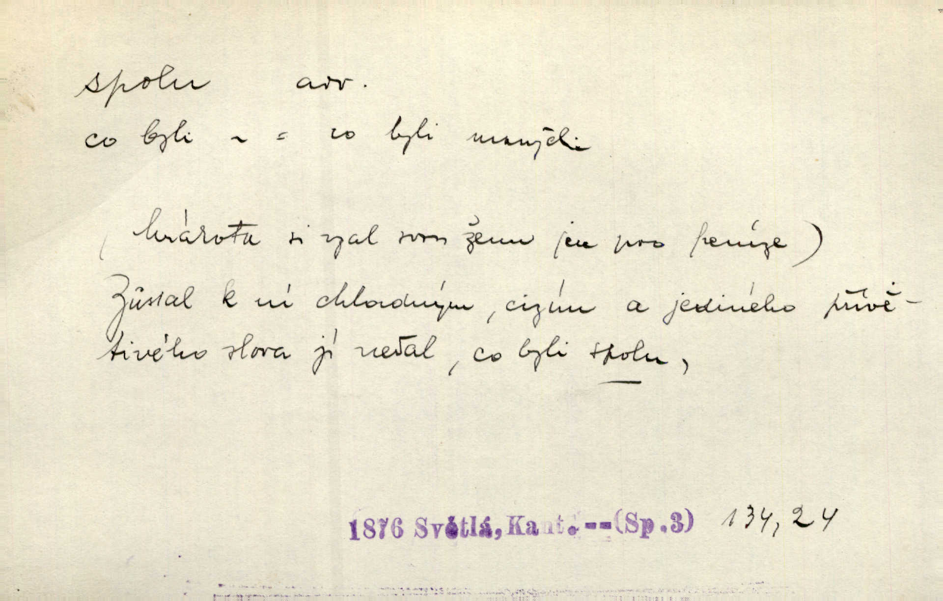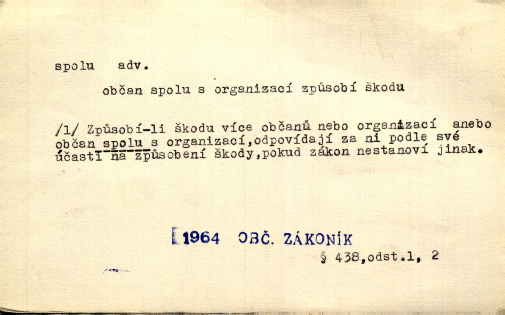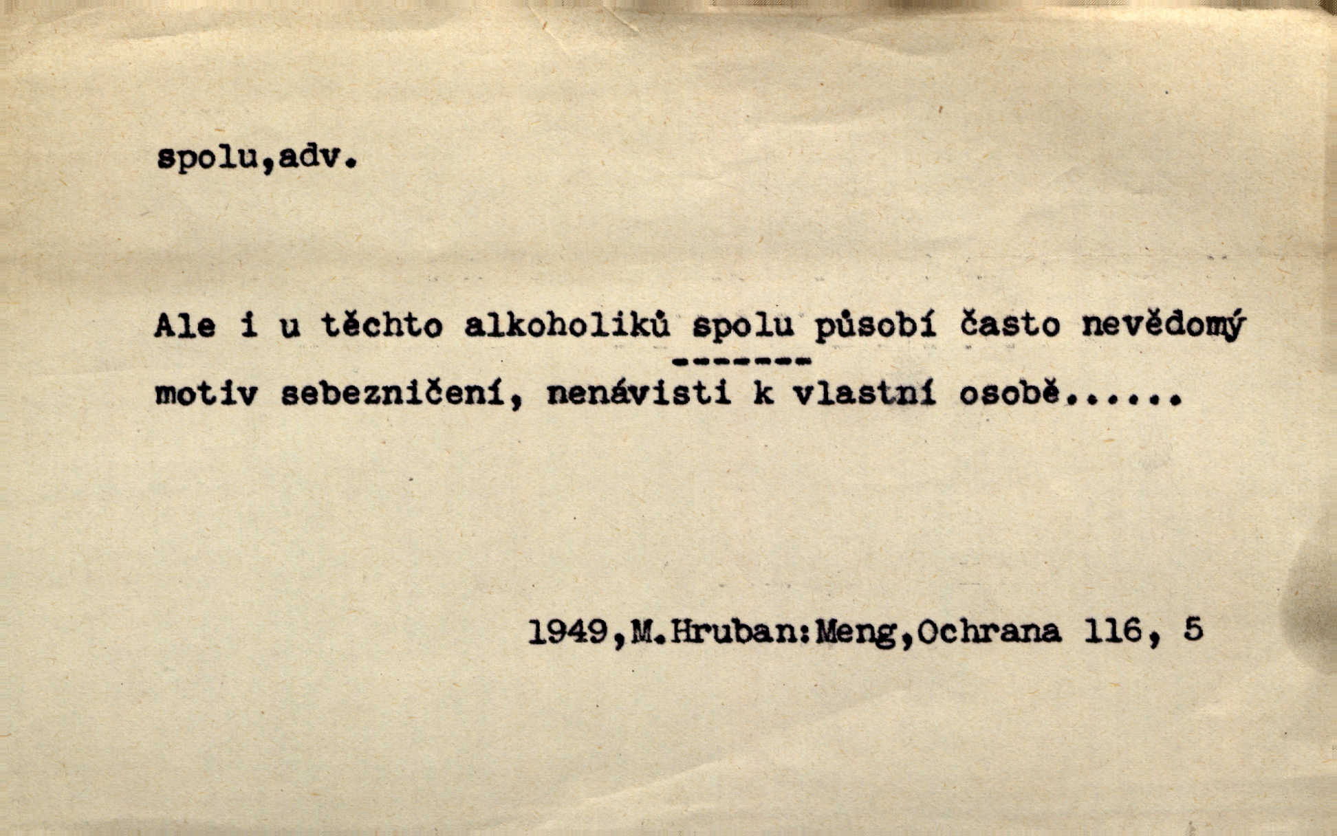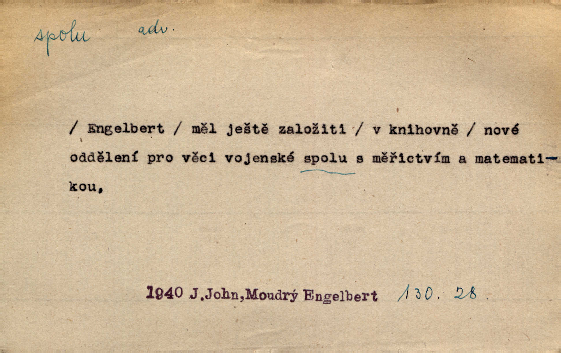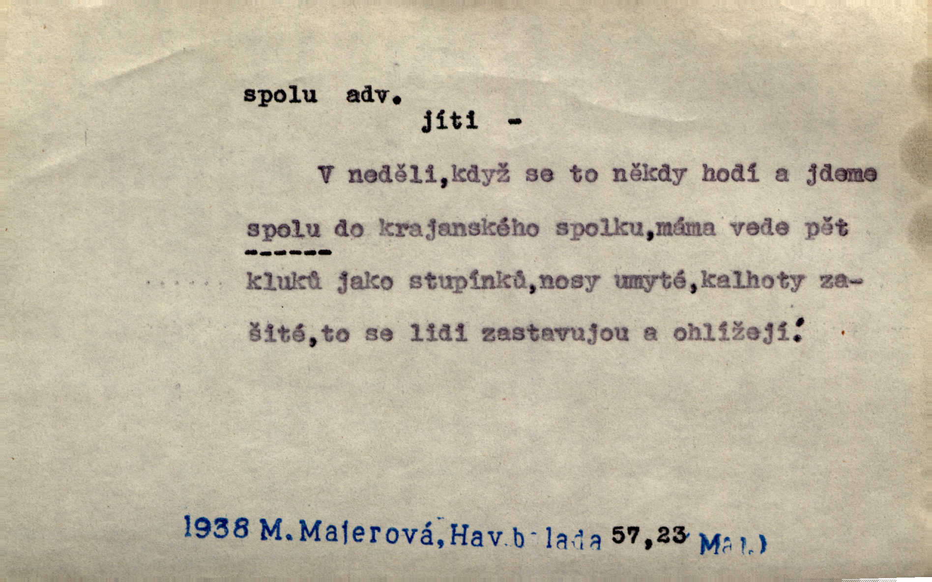 - spolu (bás. spol) adv. vyjadřuje blízkost, společnost při něčem, pohromadě, společně, zpr. o dvou. Ti dva už pili mnohou číši spolu. Ner. Tak půjdeme spolu — jestli mne vezmeš s sebou. Rais. Seděly spolu až na konci stolu. Baar. Básník i umělec vědomě pracovali spolu. Vrch. Jenom tělem budem rozloučeni, duše věčně spolu ostanou. Erb. Počkáme spolu, až starý přijde. V. Mrš. Můj Bože, jak bych stárnul rád, kdybychom stárnuli spolu [s V. Dykem]! H. Jel. Zvuk, oko, dech, jejž cítě viděl [Tomeš] spol — jaký to soulad, jaká duše jasná! Hál. D Lid. býti spolu žíti v manželství, býti manžely. To já mám tuze hodnou ženu. Patnáct let, a kdepak, víc, jsme spolu a ještě jsme se nezlobili. Jir. Půl roku jsou spolu a muž si je celý týden dvě hodiny od ní. Rais. Jsou již spolu několik neděl a ještě se takřka ani neviděli. Pfleg. D jeden s druhým, dohromady; navzájem, mezi sebou. Pojď, promluvíme spolu důvěrně! Vrch. Prostřed světnice se spolu setkali. Jir. Dvoje dvéře spojovaly bez pochyby dva oddíly hradu spolu. Choch. Podivná shoda v tvrzení těch dvou, žádného spojení spolu nemajících osob, vzbuzovala v něm přece žárlivost. Zey. Písničku „ešče jednó a jak se patří zrepetýrovali“ a dobře hlasy spolu srovnali. A. Mrš. Země šerem táhne, širým věkem plyne, měsíc hledí dolů, po staletí hledí, milují se spolu. Svob. Dvě strany se spolu o život a o smrt potýkají. Havl. Prodavač i kupec byli spolu spokojeni. Sab. Má tu rozlehlé revíry spolu souvisící, tvořící takměř jeden široširý hvozd. Jir. Jedli, pili, rozprávěli, dobrou vůli spolu měli. Čel. Mimo hudbu a šachy jsme nikdy víc spolu neměli nestýkali se. Čap. Ch. „Co pak jste zase spolu měly?“ obracela se k ní paní Žehurová oč jste se nepohodly, co jste si udělaly. Šim. D vyjadřuje přidání, připojení; zároveň s někým. Zůstal [na parníku] a jel spolu do Chuchle. Čap. Ch. Maminka se smála; zpívala pak také spolu. Šrám. Lid jásal, vítaje bojovníky, ale když se rozneslo, koho tu spolu nesou, umlkli zástupové a rozestupujíce se smekli uctivě, ana mrtvola [Marušky] kolem nesena. Jir. Vzlet [pták] do vzduchu, vzal spolu mé srdce zmámené. Vrch. D vyjadřuje souvislost, spojitost dalšího členu; rovněž, též, také, i. Zazvonil energicky na svého ceremonáře a spolu důvěrníka. Vach. Básník tento ryze národní patřil spolu veliké rodině umělců. Vrch. Ty [poeto] s tvůrčí rozkoší máš tvůrčí trýzeň spolu. Ner. Byl mladý muž a ohnivý a spolu básník. Win. Potom přistoupil k černé tabuli, vzal křídu a zpívaje kreslil spolu noty. Bouš. Mistr Hubáček a spolu starší počestného cechu krejčovského dal si i na chůzi záležeti. Třeb. Každý poctivý a spolu rozumný člověk jest liberální. Havl. Troubil na trubku a spolu také bubnoval na bubínek. Něm.