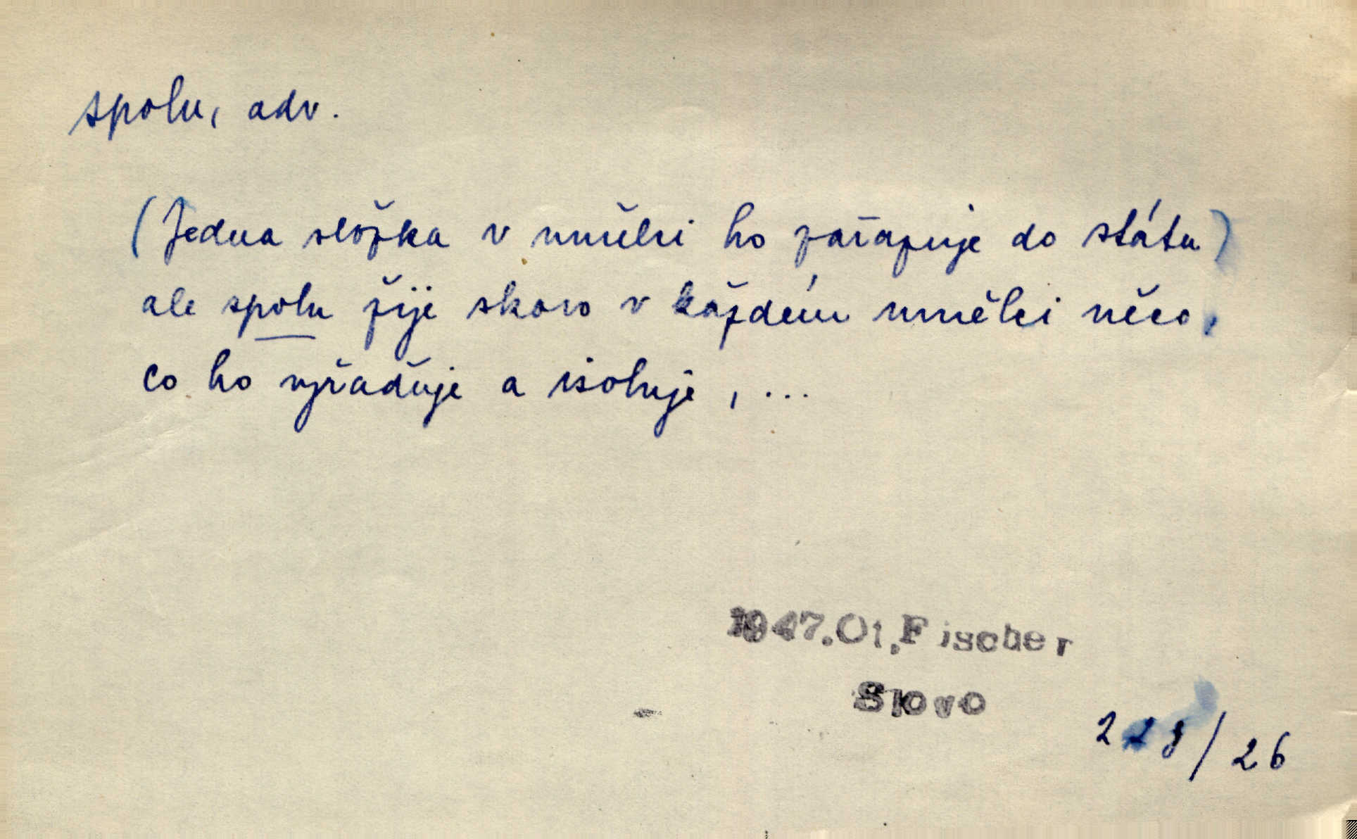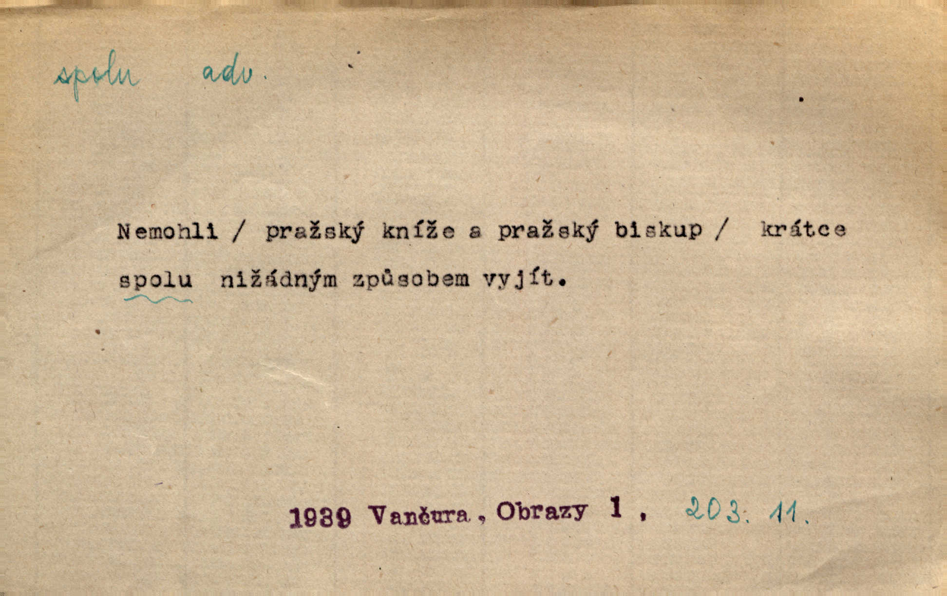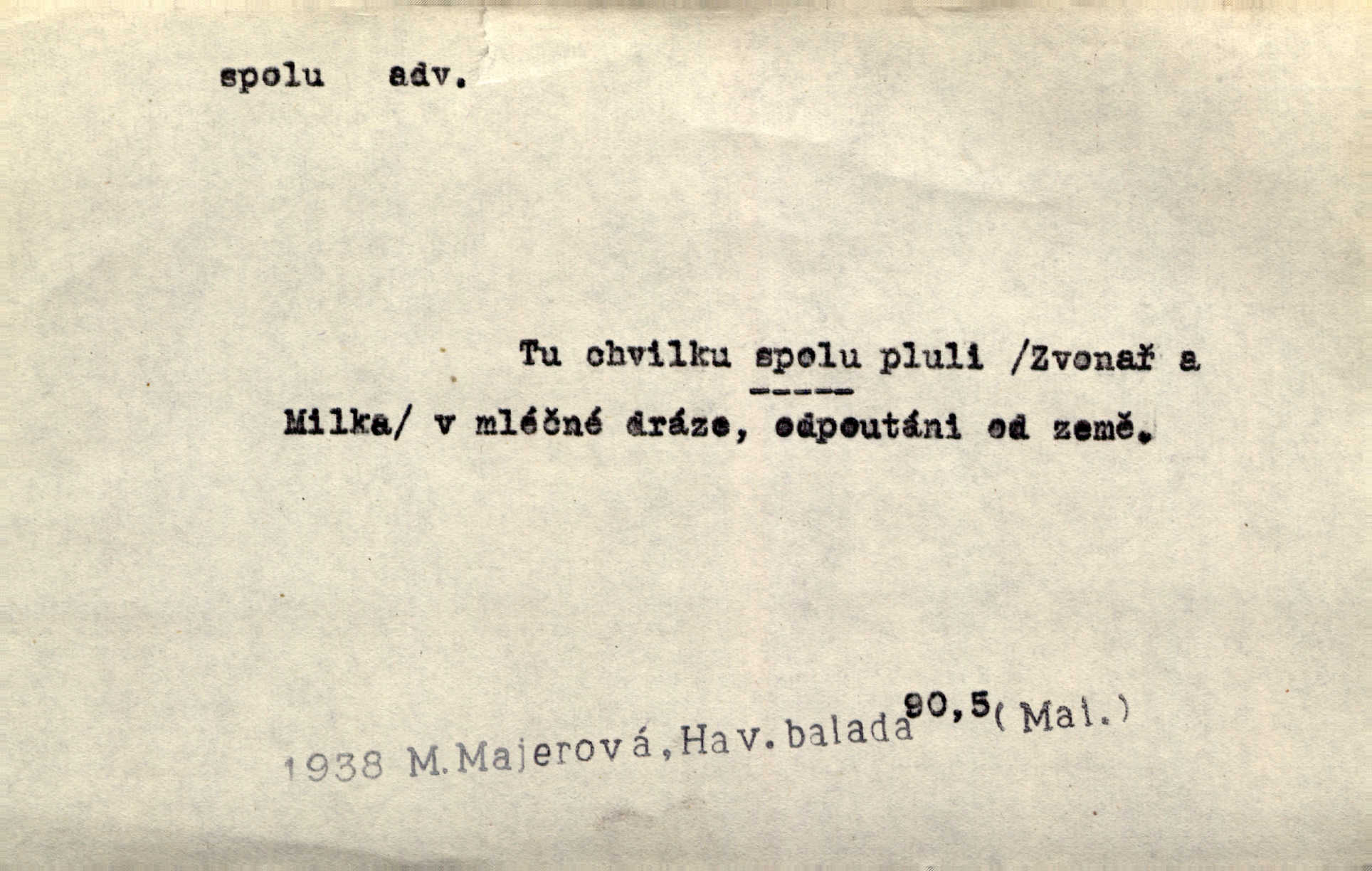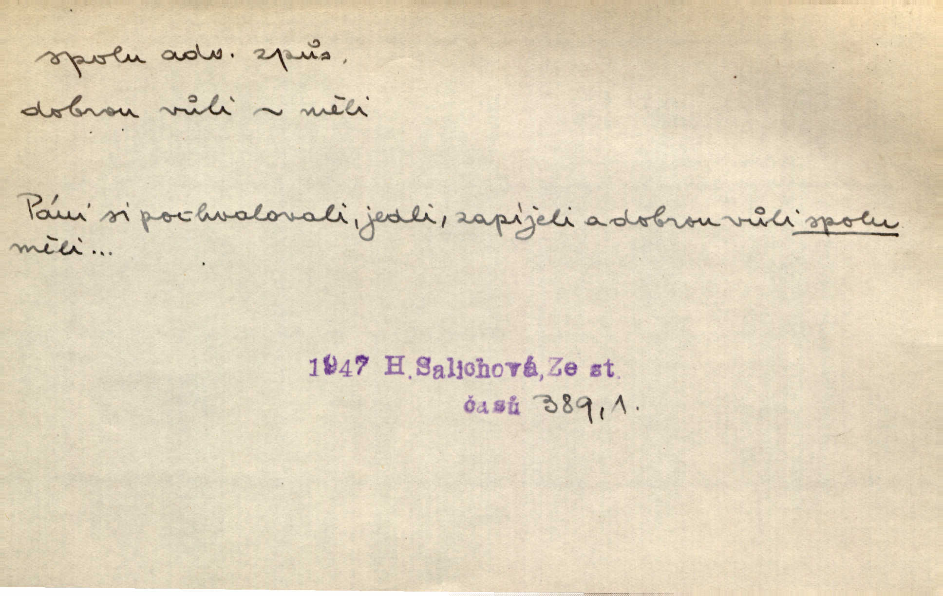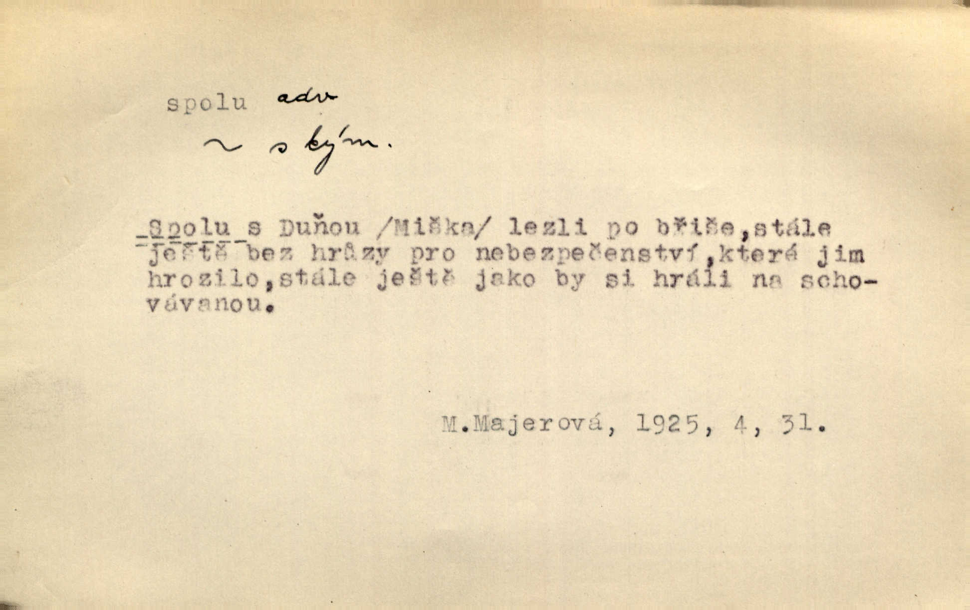 - spolu (bás. spol) adv. vyjadřuje blízkost, společnost při něčem, pohromadě, společně, zpr. o dvou. Ti dva už pili mnohou číši spolu. Ner. Tak půjdeme spolu — jestli mne vezmeš s sebou. Rais. Seděly spolu až na konci stolu. Baar. Básník i umělec vědomě pracovali spolu. Vrch. Jenom tělem budem rozloučeni, duše věčně spolu ostanou. Erb. Počkáme spolu, až starý přijde. V. Mrš. Můj Bože, jak bych stárnul rád, kdybychom stárnuli spolu [s V. Dykem]! H. Jel. Zvuk, oko, dech, jejž cítě viděl [Tomeš] spol — jaký to soulad, jaká duše jasná! Hál. D Lid. býti spolu žíti v manželství, býti manžely. To já mám tuze hodnou ženu. Patnáct let, a kdepak, víc, jsme spolu a ještě jsme se nezlobili. Jir. Půl roku jsou spolu a muž si je celý týden dvě hodiny od ní. Rais. Jsou již spolu několik neděl a ještě se takřka ani neviděli. Pfleg. D jeden s druhým, dohromady; navzájem, mezi sebou. Pojď, promluvíme spolu důvěrně! Vrch. Prostřed světnice se spolu setkali. Jir. Dvoje dvéře spojovaly bez pochyby dva oddíly hradu spolu. Choch. Podivná shoda v tvrzení těch dvou, žádného spojení spolu nemajících osob, vzbuzovala v něm přece žárlivost. Zey. Písničku „ešče jednó a jak se patří zrepetýrovali“ a dobře hlasy spolu srovnali. A. Mrš. Země šerem táhne, širým věkem plyne, měsíc hledí dolů, po staletí hledí, milují se spolu. Svob. Dvě strany se spolu o život a o smrt potýkají. Havl. Prodavač i kupec byli spolu spokojeni. Sab. Má tu rozlehlé revíry spolu souvisící, tvořící takměř jeden široširý hvozd. Jir. Jedli, pili, rozprávěli, dobrou vůli spolu měli. Čel. Mimo hudbu a šachy jsme nikdy víc spolu neměli nestýkali se. Čap. Ch. „Co pak jste zase spolu měly?“ obracela se k ní paní Žehurová oč jste se nepohodly, co jste si udělaly. Šim. D vyjadřuje přidání, připojení; zároveň s někým. Zůstal [na parníku] a jel spolu do Chuchle. Čap. Ch. Maminka se smála; zpívala pak také spolu. Šrám. Lid jásal, vítaje bojovníky, ale když se rozneslo, koho tu spolu nesou, umlkli zástupové a rozestupujíce se smekli uctivě, ana mrtvola [Marušky] kolem nesena. Jir. Vzlet [pták] do vzduchu, vzal spolu mé srdce zmámené. Vrch. D vyjadřuje souvislost, spojitost dalšího členu; rovněž, též, také, i. Zazvonil energicky na svého ceremonáře a spolu důvěrníka. Vach. Básník tento ryze národní patřil spolu veliké rodině umělců. Vrch. Ty [poeto] s tvůrčí rozkoší máš tvůrčí trýzeň spolu. Ner. Byl mladý muž a ohnivý a spolu básník. Win. Potom přistoupil k černé tabuli, vzal křídu a zpívaje kreslil spolu noty. Bouš. Mistr Hubáček a spolu starší počestného cechu krejčovského dal si i na chůzi záležeti. Třeb. Každý poctivý a spolu rozumný člověk jest liberální. Havl. Troubil na trubku a spolu také bubnoval na bubínek. Něm.