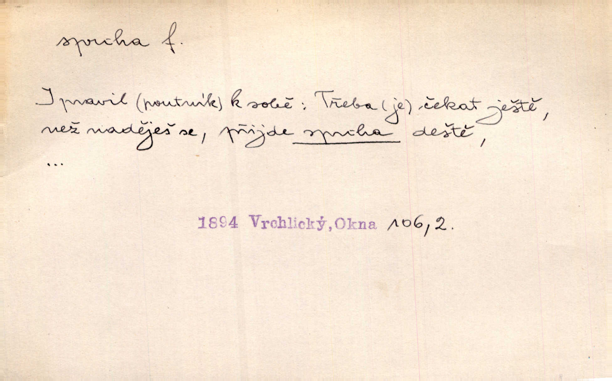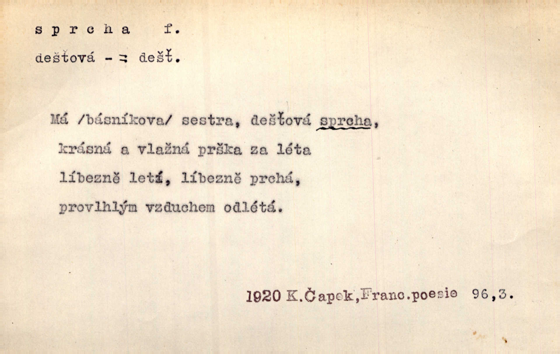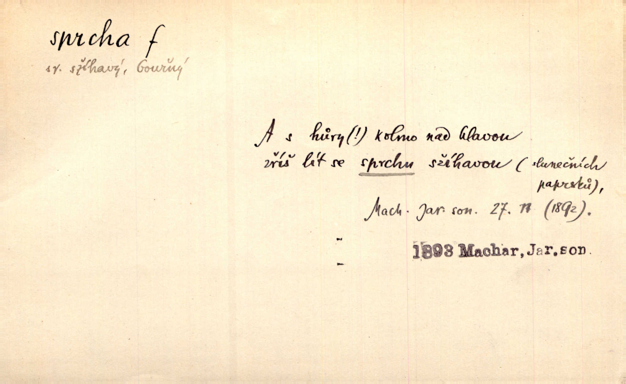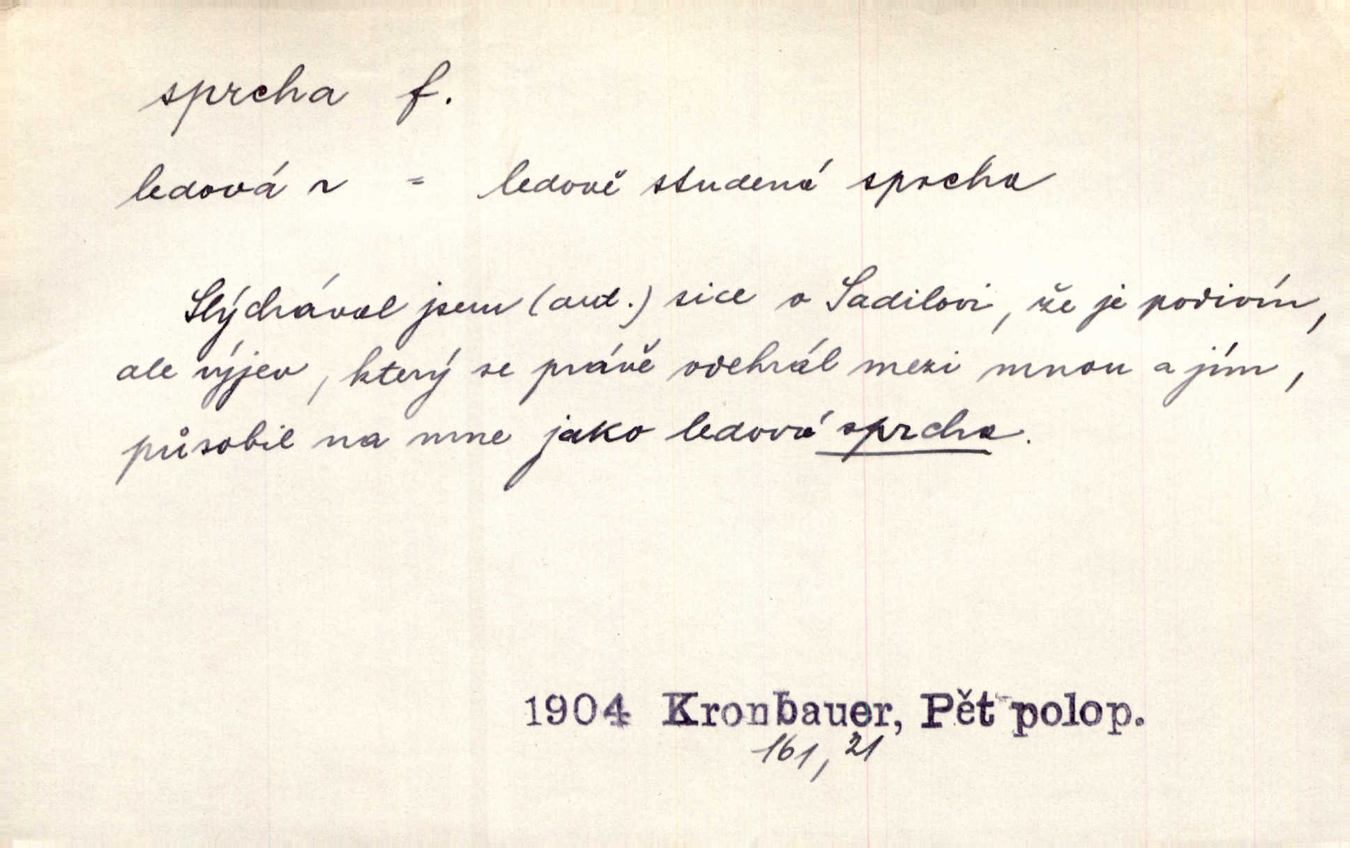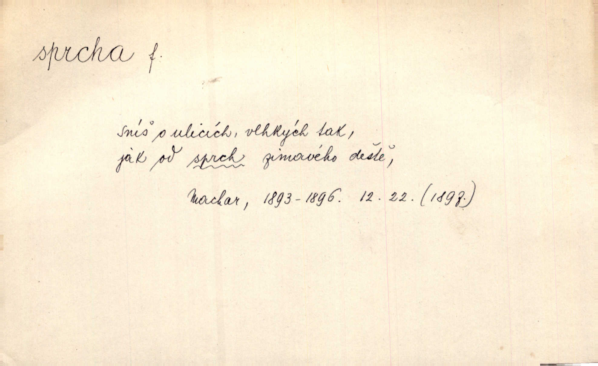 - sprcha, -y f. lid. a kniž. prudký, krátký dešť, sprška. Stromy v školské zahradě stály nehnutě a blaženě snášely bujnou sprchu. Rais. Nany šla mlhou a deštěm, nedbajíc sprchy padající se stromů. Klost. Okna zvučela již také ostrou sprchou lijavce. Jah. Výjev, který se právě odehrál mezi mnou a jím, působil na mne jako ledová sprcha. Kronb. Přen. Paže otevírá, polibků svých sprchou hosta vítá. Vrch. Jak je [knížky] otvírala, vypadla z nich celá sprcha malovaných obrázků. Merh. Jemná sprcha bolestné rozkoše rozlila se po jeho nervech. Kar. Jízlivá narážka polila Viktora studenou sprchou. Vach. Když se jednou rozhovořil o slečně Elince, skropil ho kolega štiplavě mrazivou sprchou. Jah. D umělý postřik na způsob deště; zařízení koupelny n. lázní na takový postřik. Otupován byl lázní potu a sprch, do nichž jej trainer vehnal. Čap. Ch. Nabídnou vám studenou sprchu. Ben. Kdo viděl za Rakouska umývárny a sprchy pro vojáky? Mach. Dejte pozor, aby nezamrzly sprchy. Přít.