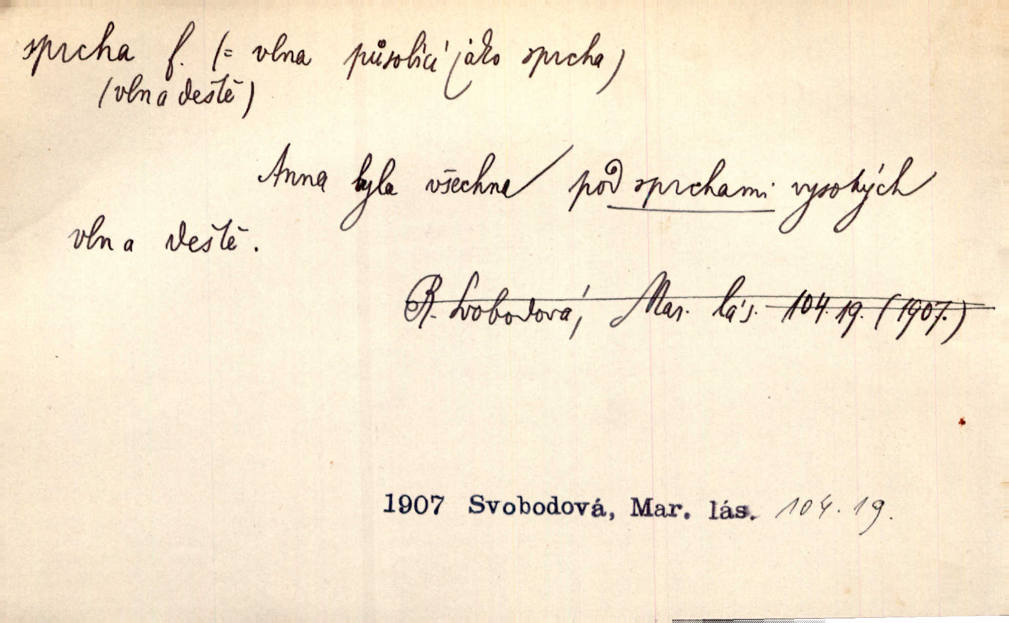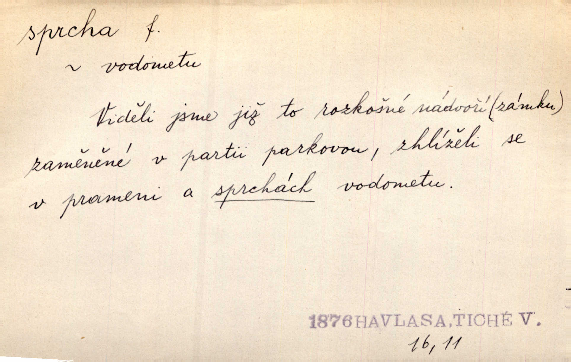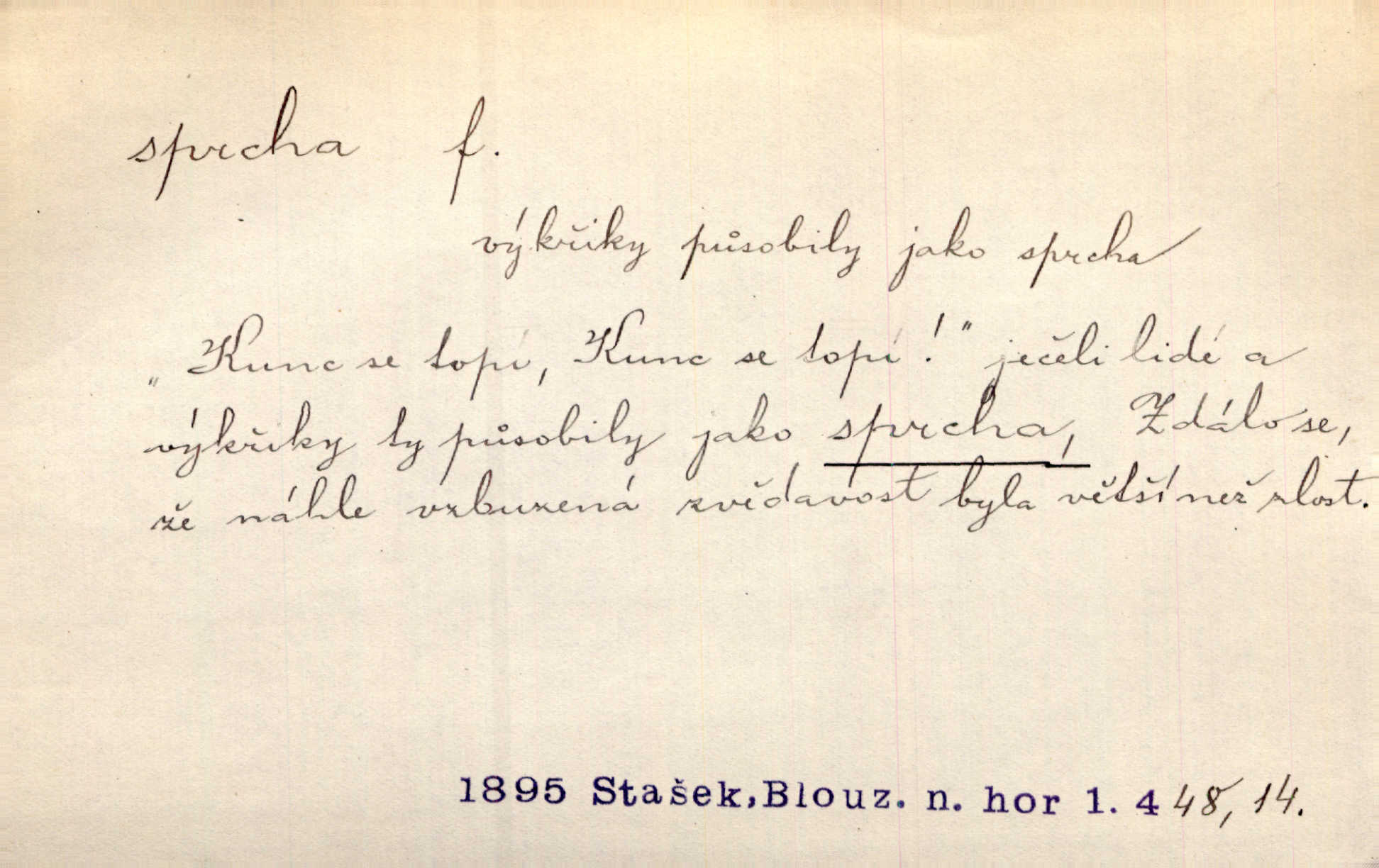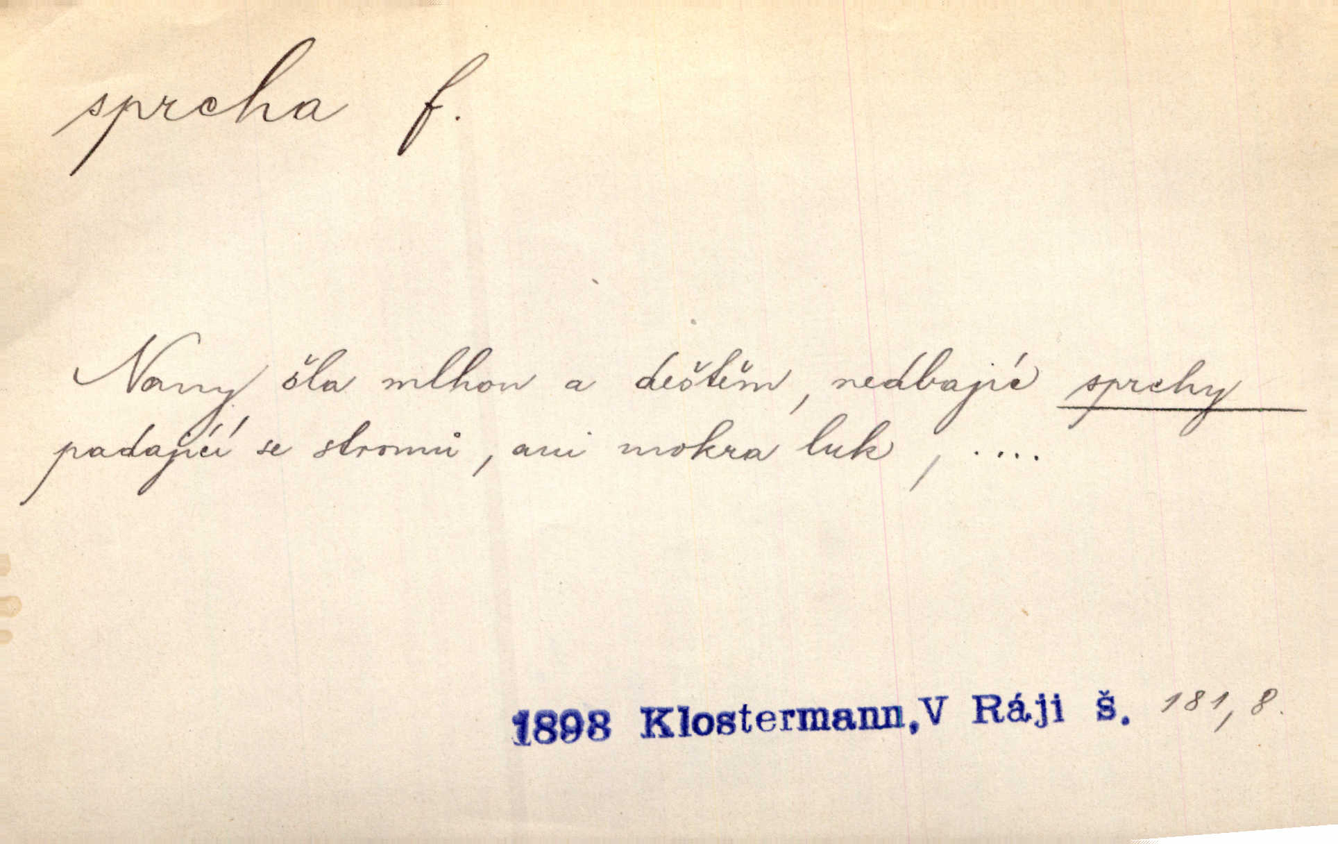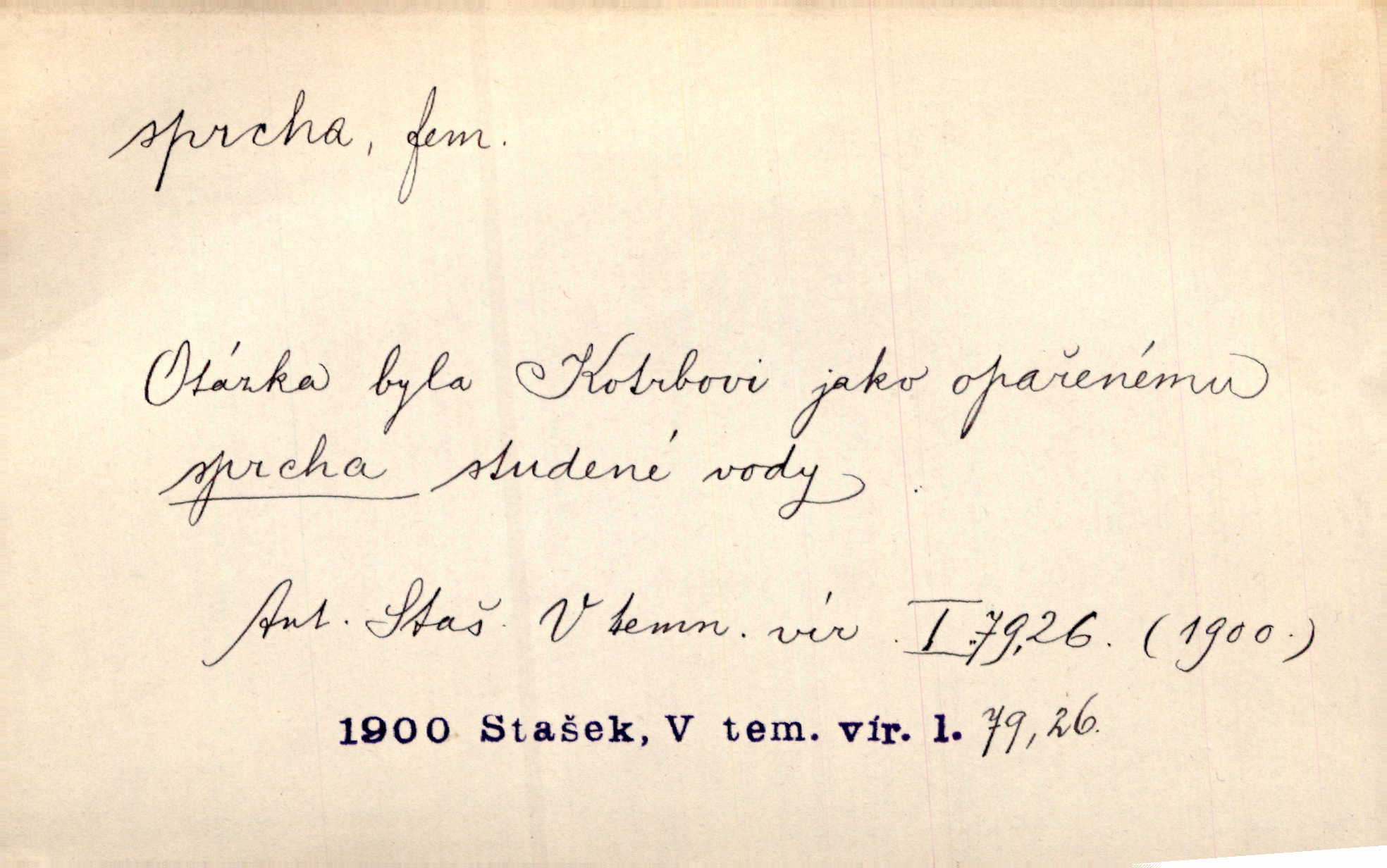 - sprcha, -y f. lid. a kniž. prudký, krátký dešť, sprška. Stromy v školské zahradě stály nehnutě a blaženě snášely bujnou sprchu. Rais. Nany šla mlhou a deštěm, nedbajíc sprchy padající se stromů. Klost. Okna zvučela již také ostrou sprchou lijavce. Jah. Výjev, který se právě odehrál mezi mnou a jím, působil na mne jako ledová sprcha. Kronb. Přen. Paže otevírá, polibků svých sprchou hosta vítá. Vrch. Jak je [knížky] otvírala, vypadla z nich celá sprcha malovaných obrázků. Merh. Jemná sprcha bolestné rozkoše rozlila se po jeho nervech. Kar. Jízlivá narážka polila Viktora studenou sprchou. Vach. Když se jednou rozhovořil o slečně Elince, skropil ho kolega štiplavě mrazivou sprchou. Jah. D umělý postřik na způsob deště; zařízení koupelny n. lázní na takový postřik. Otupován byl lázní potu a sprch, do nichž jej trainer vehnal. Čap. Ch. Nabídnou vám studenou sprchu. Ben. Kdo viděl za Rakouska umývárny a sprchy pro vojáky? Mach. Dejte pozor, aby nezamrzly sprchy. Přít.