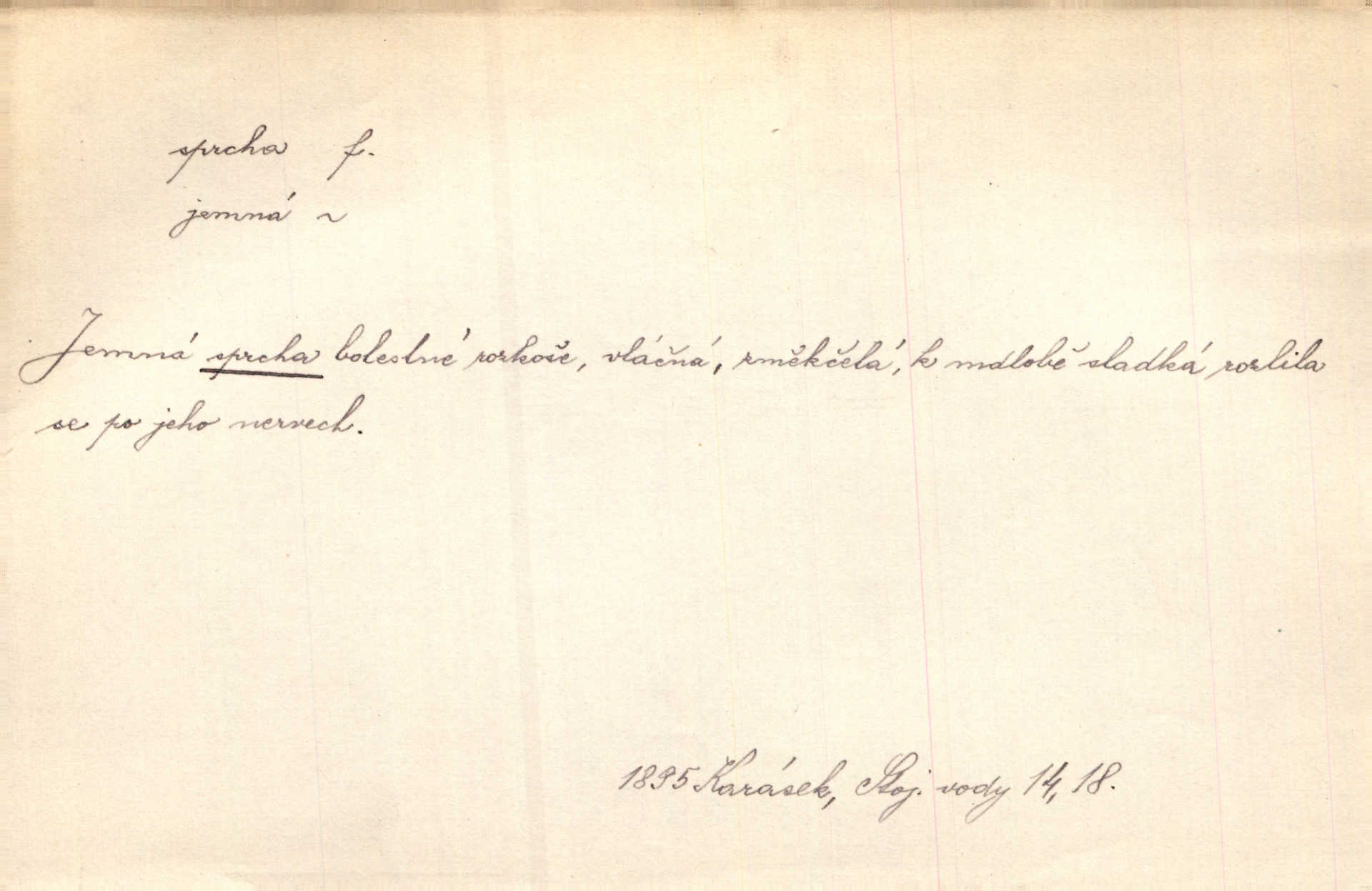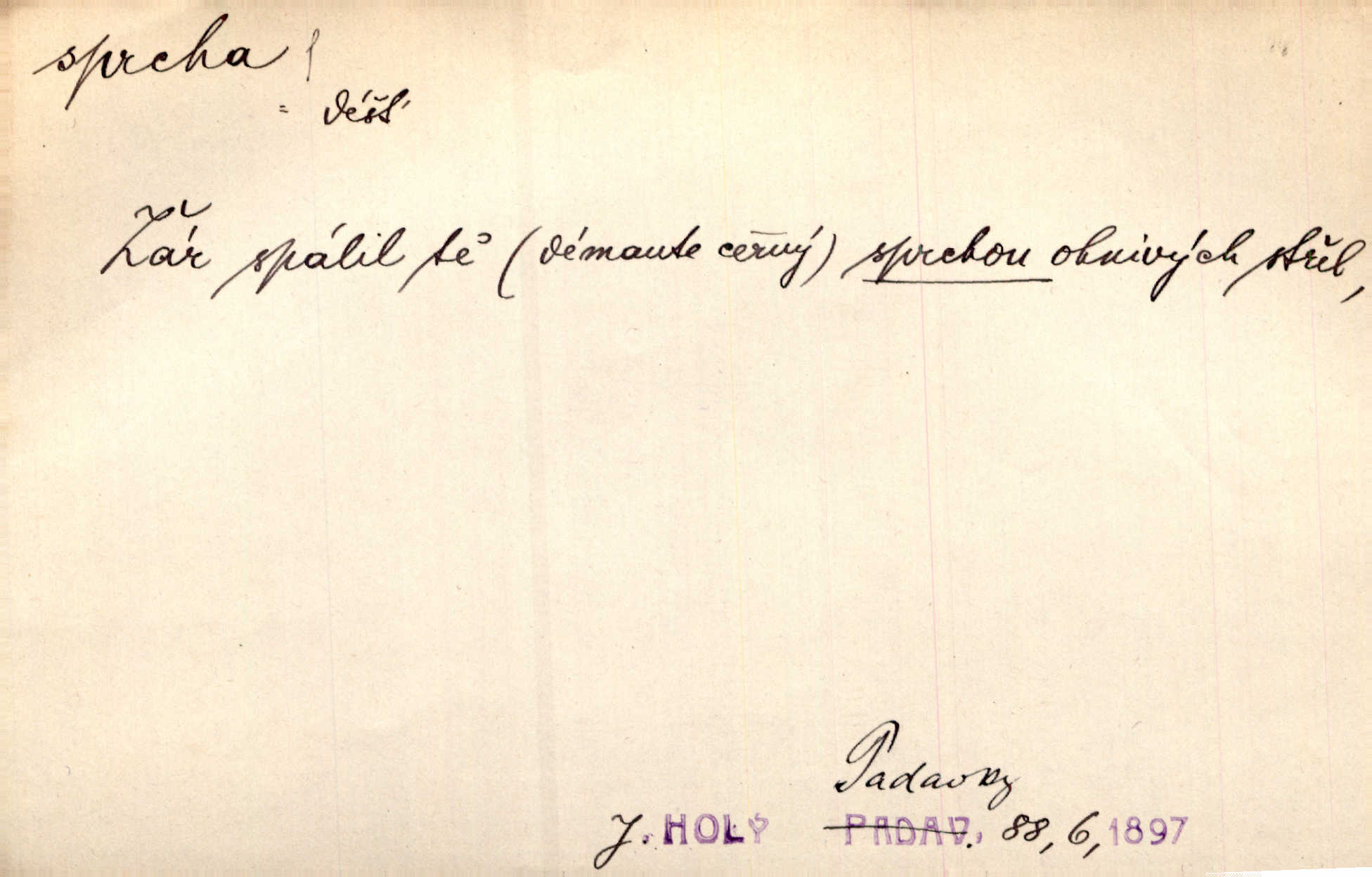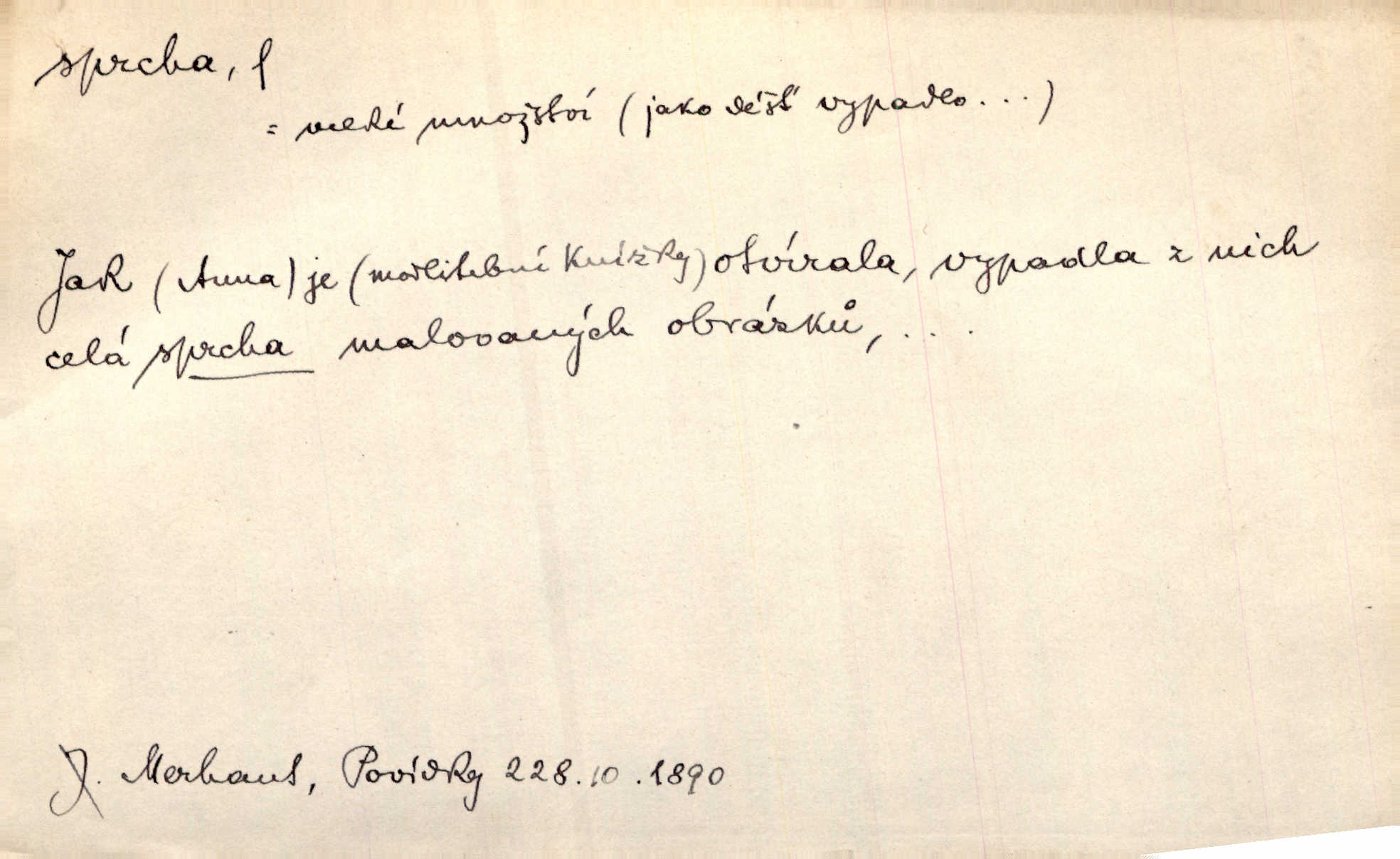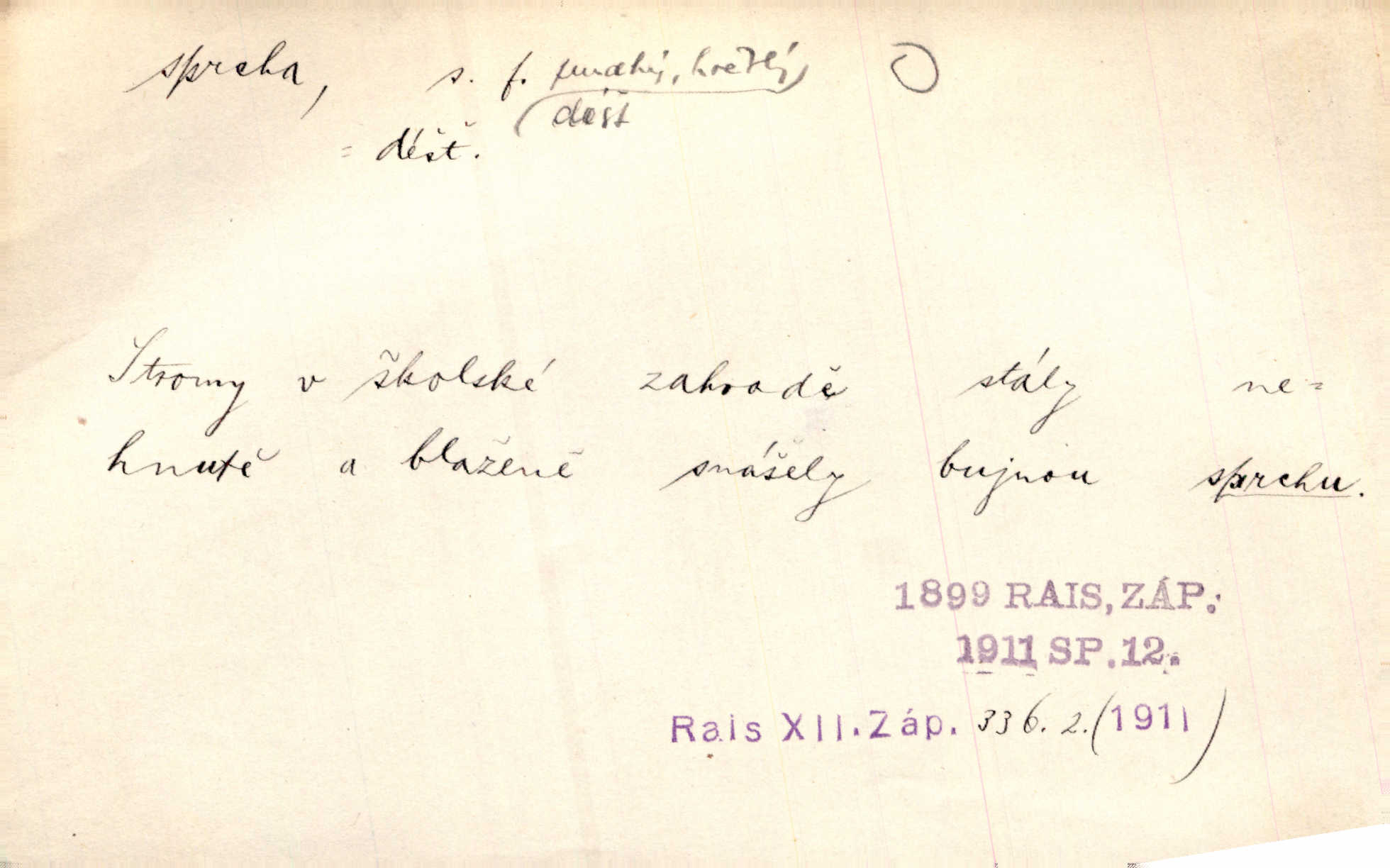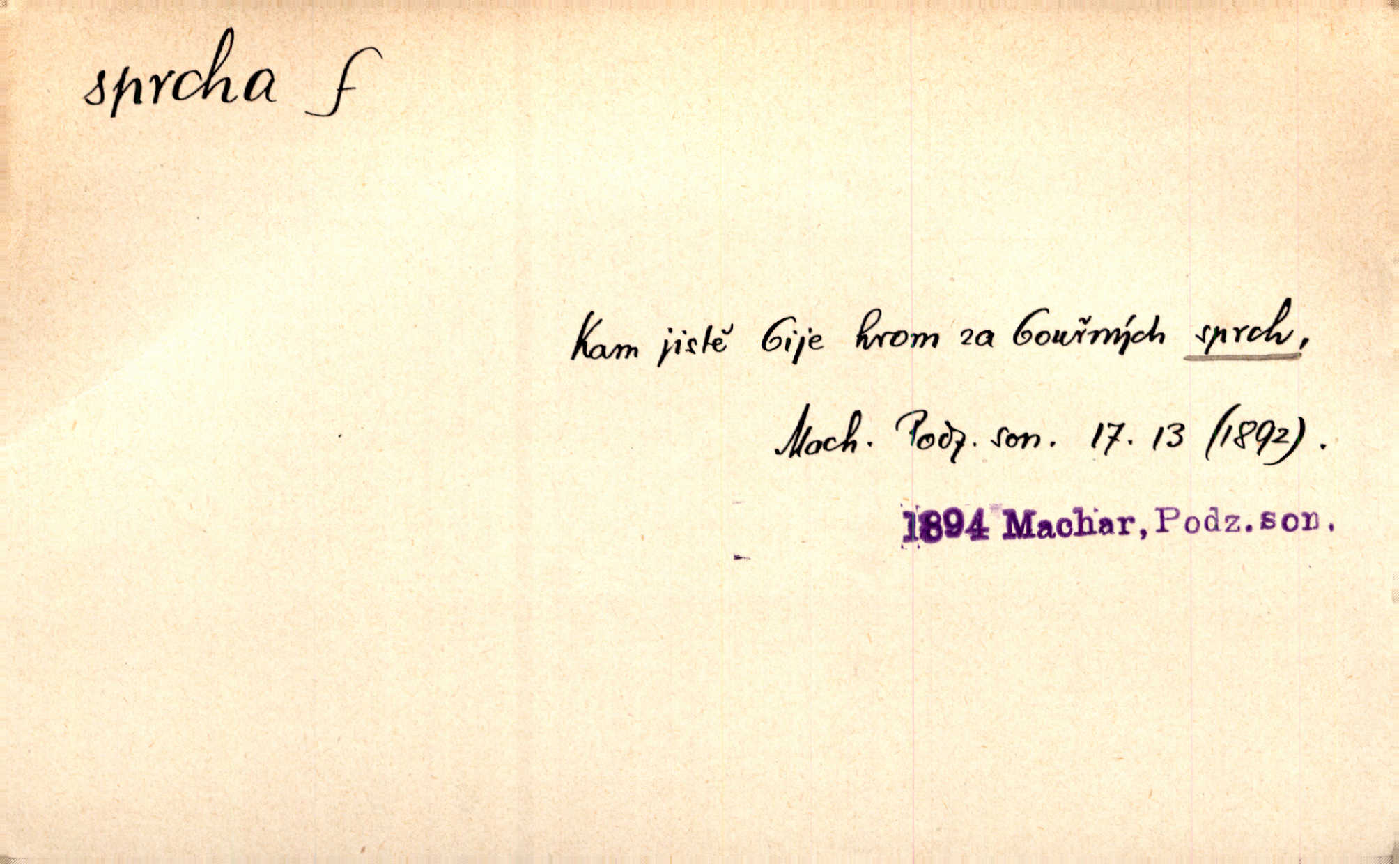 - sprcha, -y f. lid. a kniž. prudký, krátký dešť, sprška. Stromy v školské zahradě stály nehnutě a blaženě snášely bujnou sprchu. Rais. Nany šla mlhou a deštěm, nedbajíc sprchy padající se stromů. Klost. Okna zvučela již také ostrou sprchou lijavce. Jah. Výjev, který se právě odehrál mezi mnou a jím, působil na mne jako ledová sprcha. Kronb. Přen. Paže otevírá, polibků svých sprchou hosta vítá. Vrch. Jak je [knížky] otvírala, vypadla z nich celá sprcha malovaných obrázků. Merh. Jemná sprcha bolestné rozkoše rozlila se po jeho nervech. Kar. Jízlivá narážka polila Viktora studenou sprchou. Vach. Když se jednou rozhovořil o slečně Elince, skropil ho kolega štiplavě mrazivou sprchou. Jah. D umělý postřik na způsob deště; zařízení koupelny n. lázní na takový postřik. Otupován byl lázní potu a sprch, do nichž jej trainer vehnal. Čap. Ch. Nabídnou vám studenou sprchu. Ben. Kdo viděl za Rakouska umývárny a sprchy pro vojáky? Mach. Dejte pozor, aby nezamrzly sprchy. Přít.
