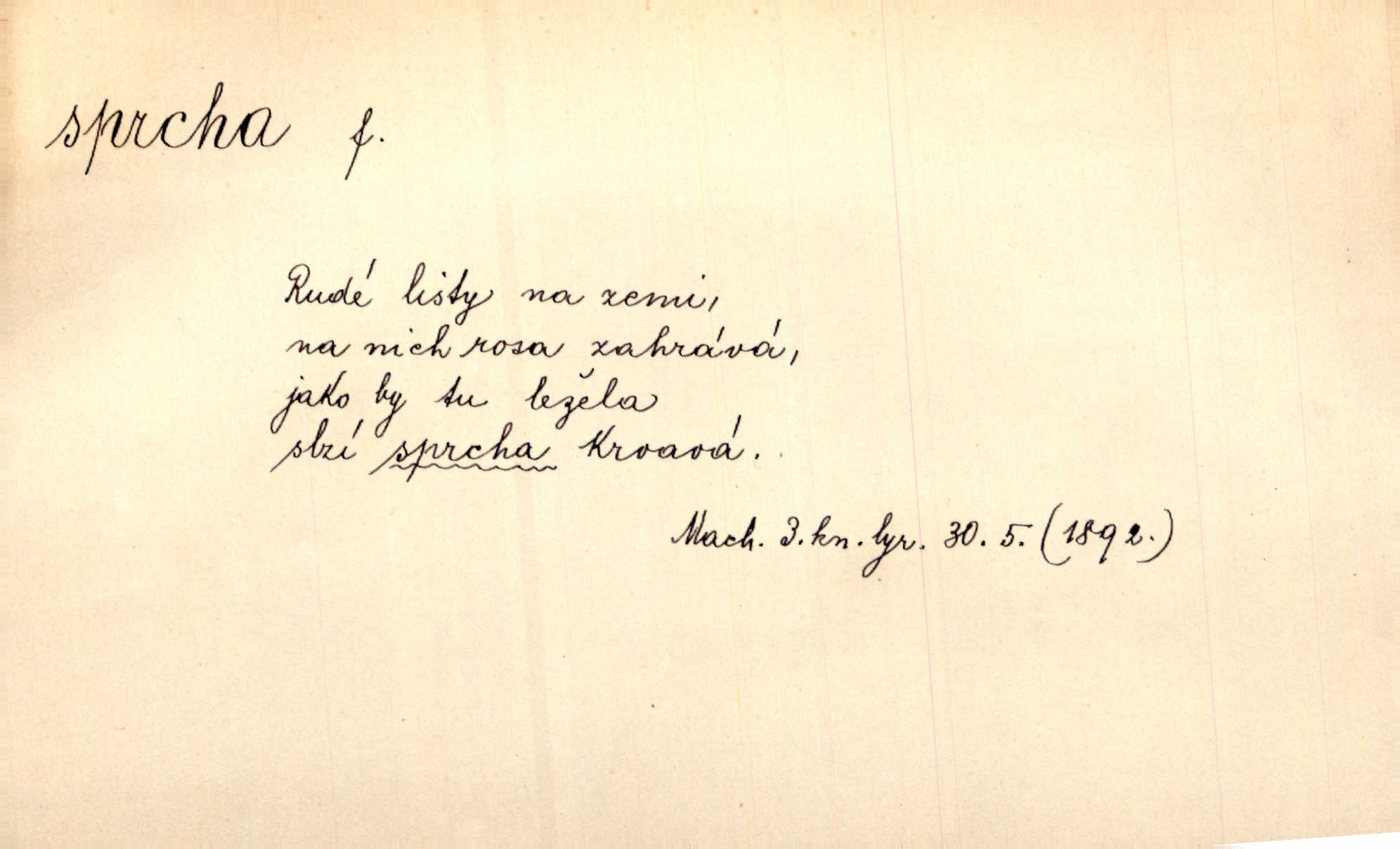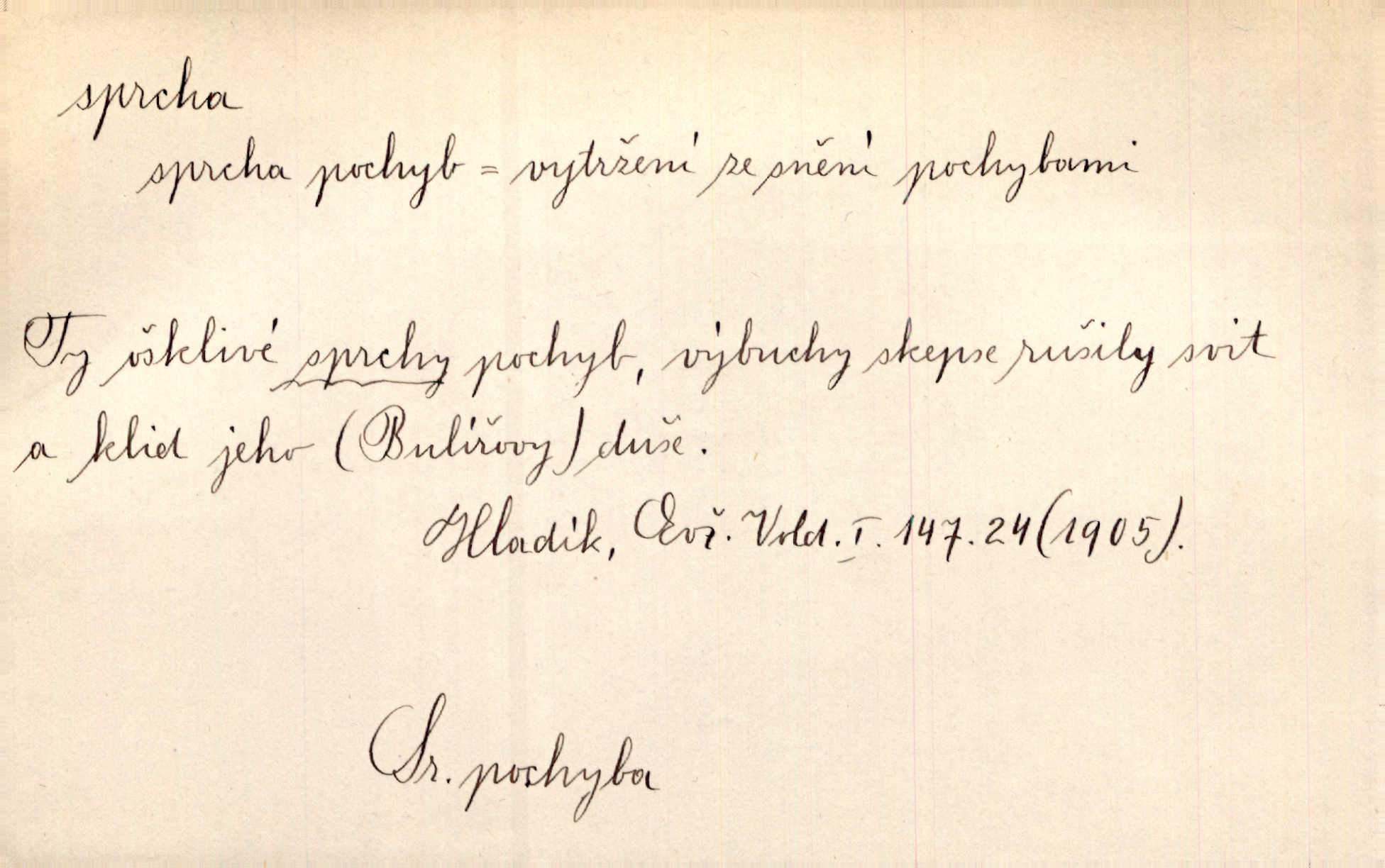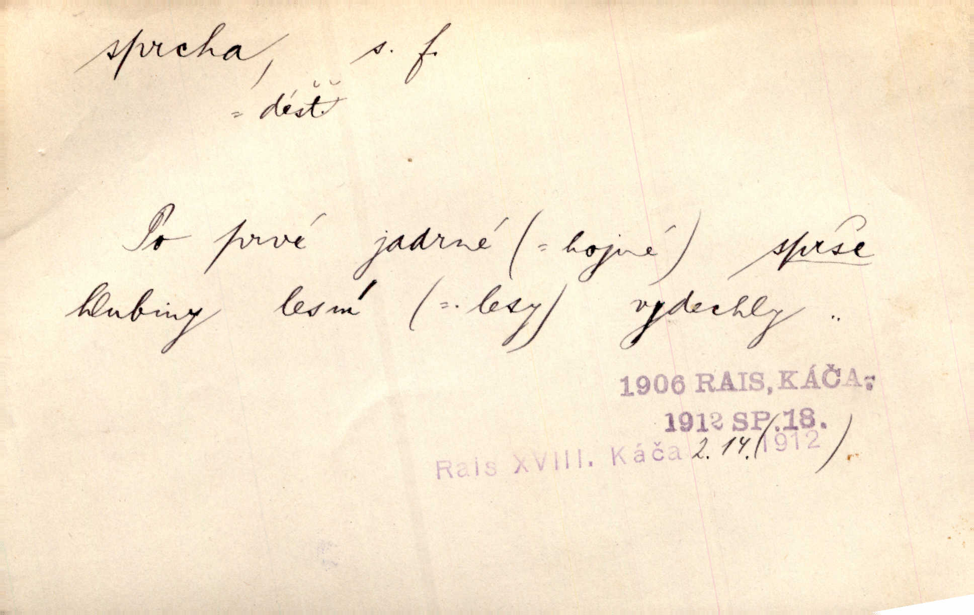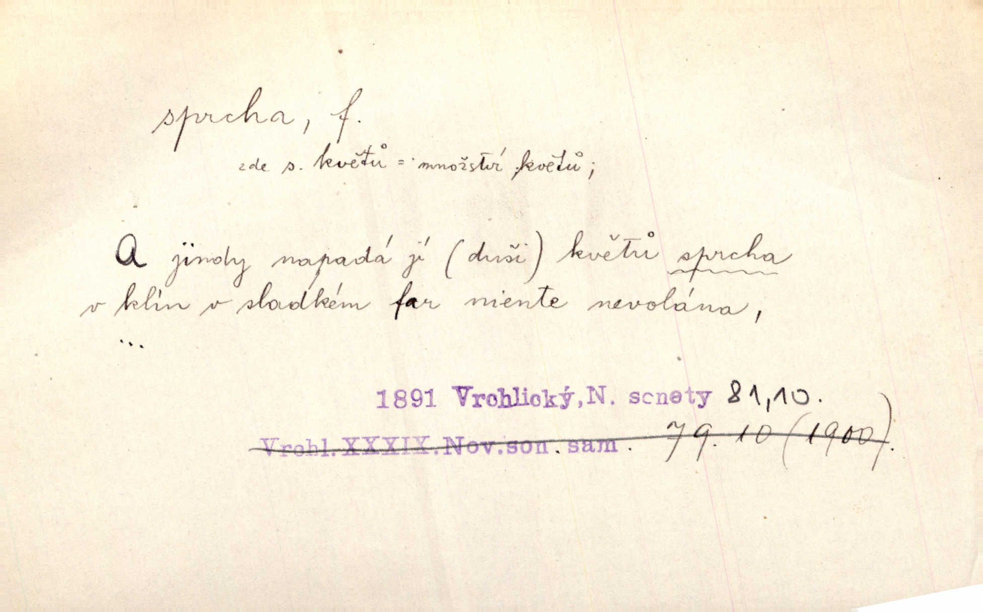 - sprcha, -y f. lid. a kniž. prudký, krátký dešť, sprška. Stromy v školské zahradě stály nehnutě a blaženě snášely bujnou sprchu. Rais. Nany šla mlhou a deštěm, nedbajíc sprchy padající se stromů. Klost. Okna zvučela již také ostrou sprchou lijavce. Jah. Výjev, který se právě odehrál mezi mnou a jím, působil na mne jako ledová sprcha. Kronb. Přen. Paže otevírá, polibků svých sprchou hosta vítá. Vrch. Jak je [knížky] otvírala, vypadla z nich celá sprcha malovaných obrázků. Merh. Jemná sprcha bolestné rozkoše rozlila se po jeho nervech. Kar. Jízlivá narážka polila Viktora studenou sprchou. Vach. Když se jednou rozhovořil o slečně Elince, skropil ho kolega štiplavě mrazivou sprchou. Jah. D umělý postřik na způsob deště; zařízení koupelny n. lázní na takový postřik. Otupován byl lázní potu a sprch, do nichž jej trainer vehnal. Čap. Ch. Nabídnou vám studenou sprchu. Ben. Kdo viděl za Rakouska umývárny a sprchy pro vojáky? Mach. Dejte pozor, aby nezamrzly sprchy. Přít.