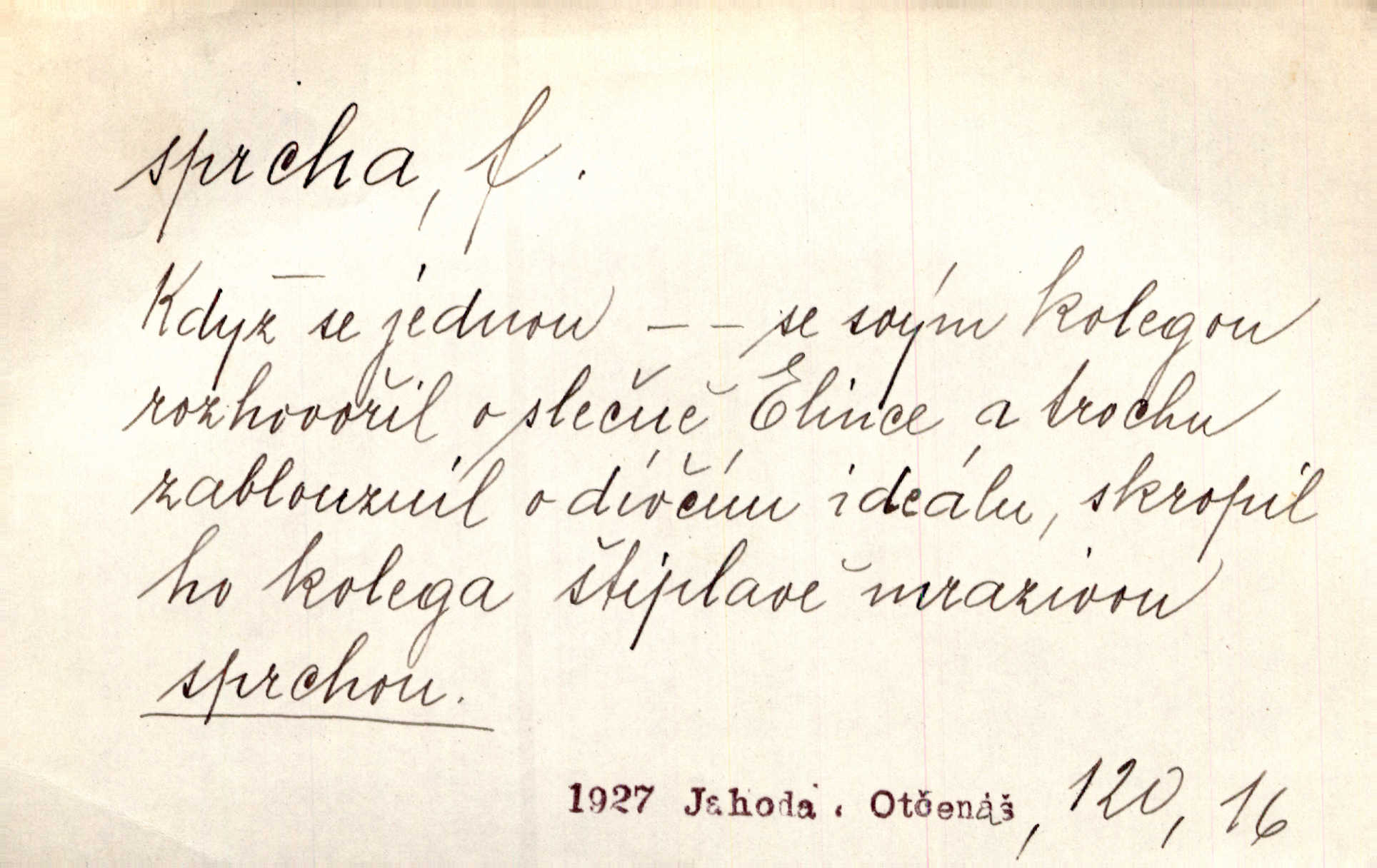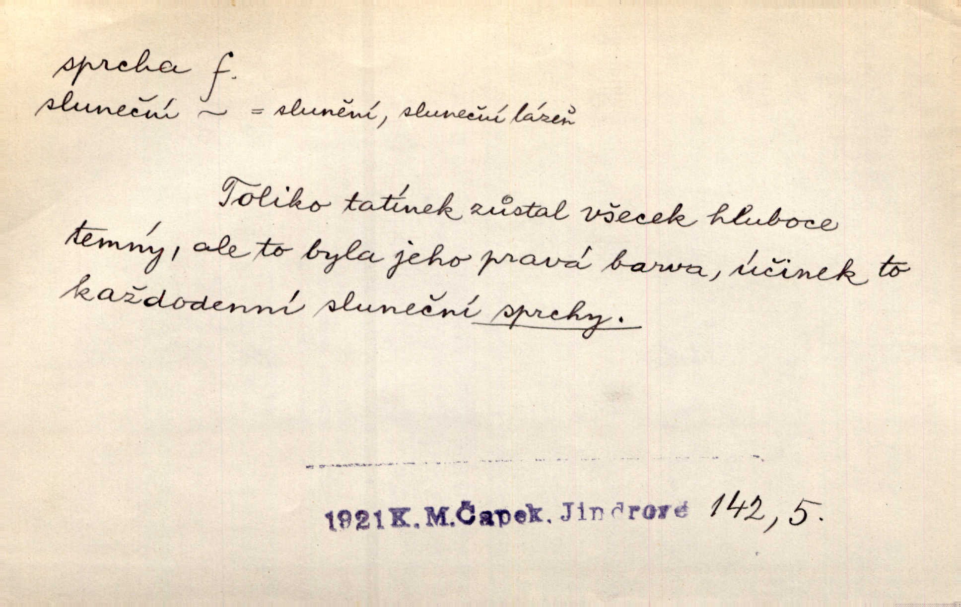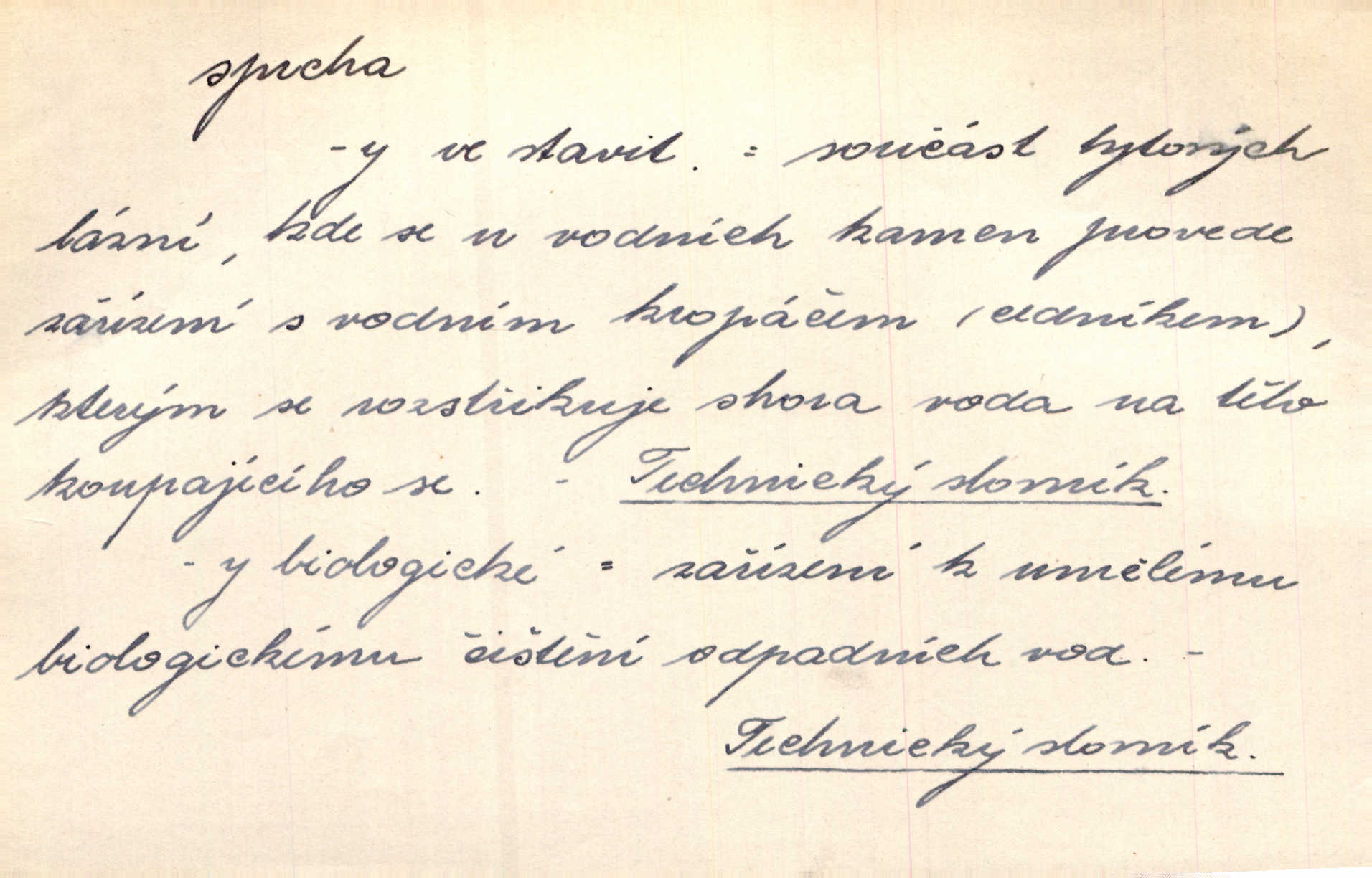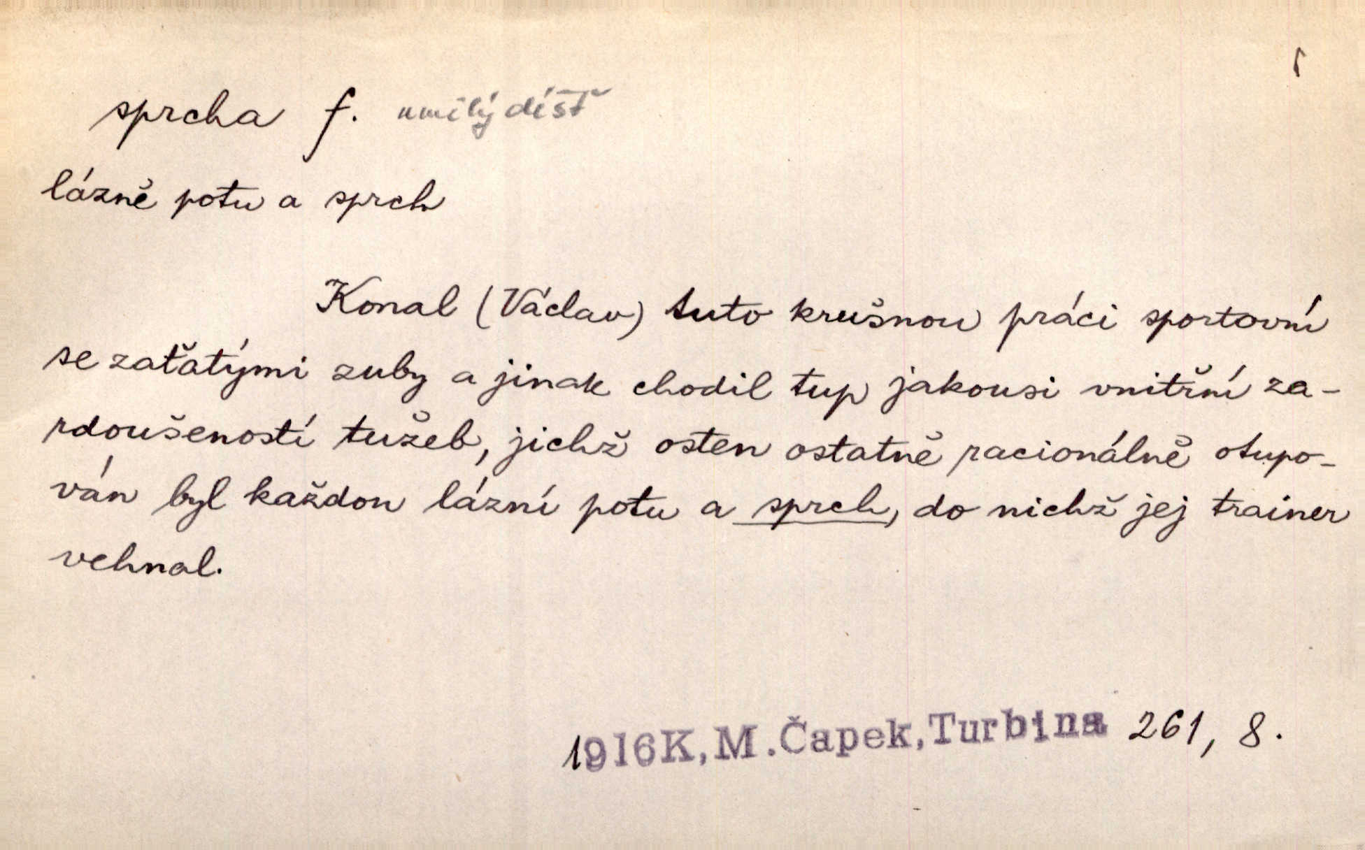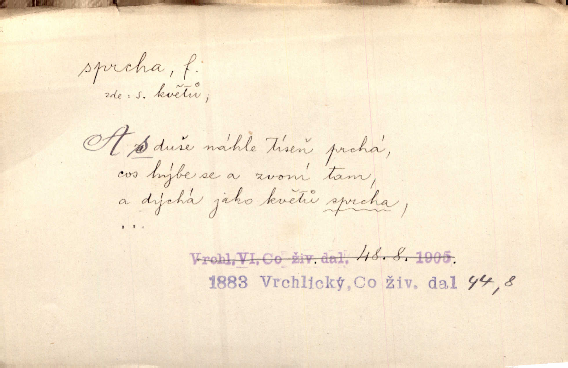 - sprcha, -y f. lid. a kniž. prudký, krátký dešť, sprška. Stromy v školské zahradě stály nehnutě a blaženě snášely bujnou sprchu. Rais. Nany šla mlhou a deštěm, nedbajíc sprchy padající se stromů. Klost. Okna zvučela již také ostrou sprchou lijavce. Jah. Výjev, který se právě odehrál mezi mnou a jím, působil na mne jako ledová sprcha. Kronb. Přen. Paže otevírá, polibků svých sprchou hosta vítá. Vrch. Jak je [knížky] otvírala, vypadla z nich celá sprcha malovaných obrázků. Merh. Jemná sprcha bolestné rozkoše rozlila se po jeho nervech. Kar. Jízlivá narážka polila Viktora studenou sprchou. Vach. Když se jednou rozhovořil o slečně Elince, skropil ho kolega štiplavě mrazivou sprchou. Jah. D umělý postřik na způsob deště; zařízení koupelny n. lázní na takový postřik. Otupován byl lázní potu a sprch, do nichž jej trainer vehnal. Čap. Ch. Nabídnou vám studenou sprchu. Ben. Kdo viděl za Rakouska umývárny a sprchy pro vojáky? Mach. Dejte pozor, aby nezamrzly sprchy. Přít.