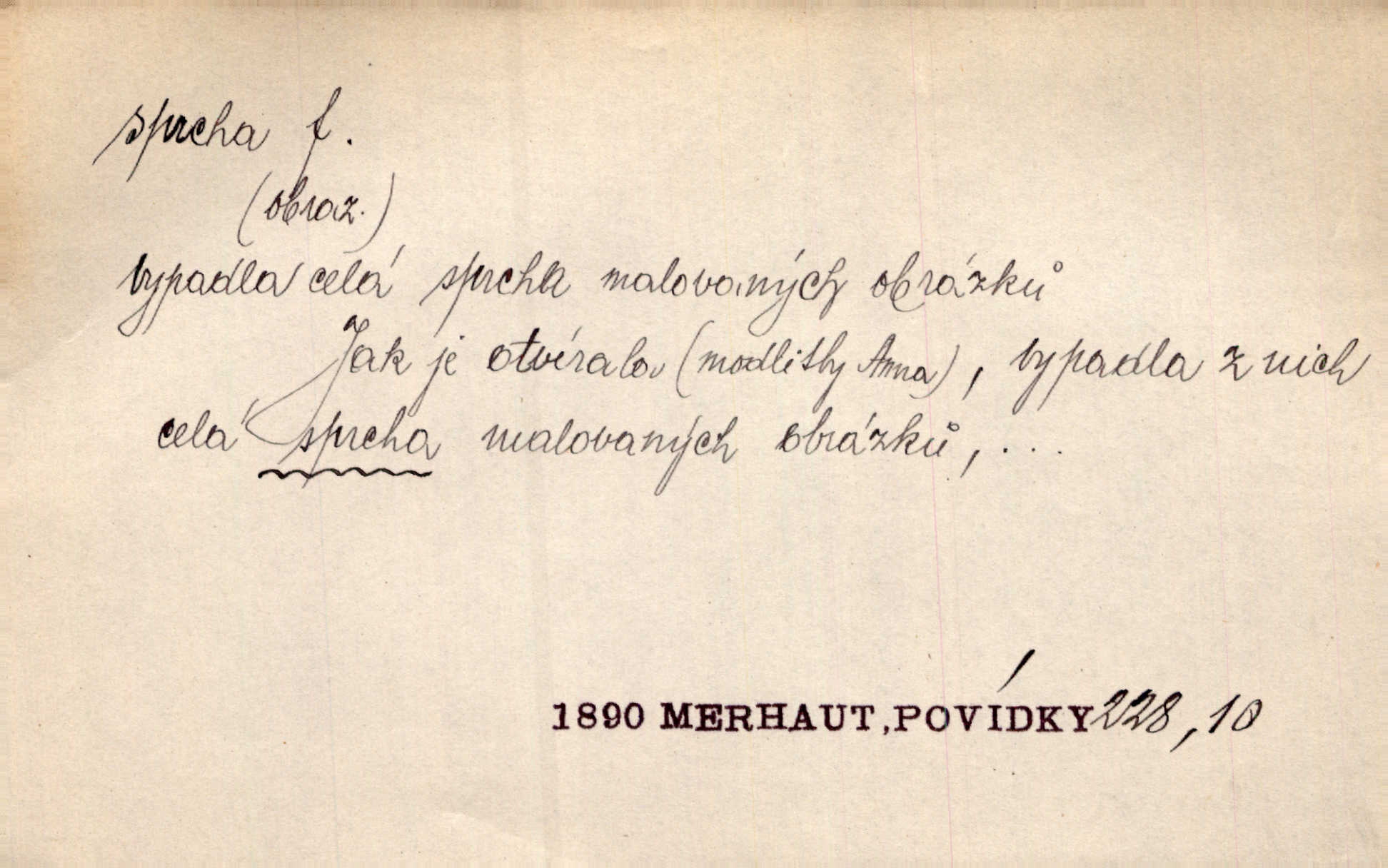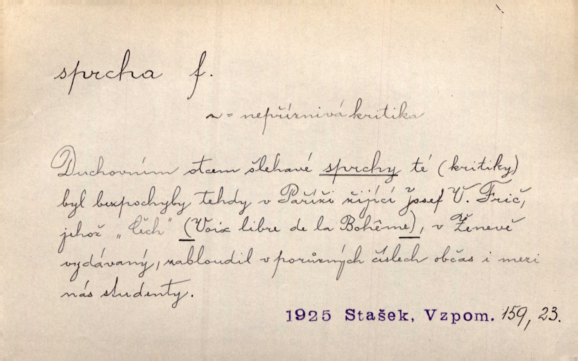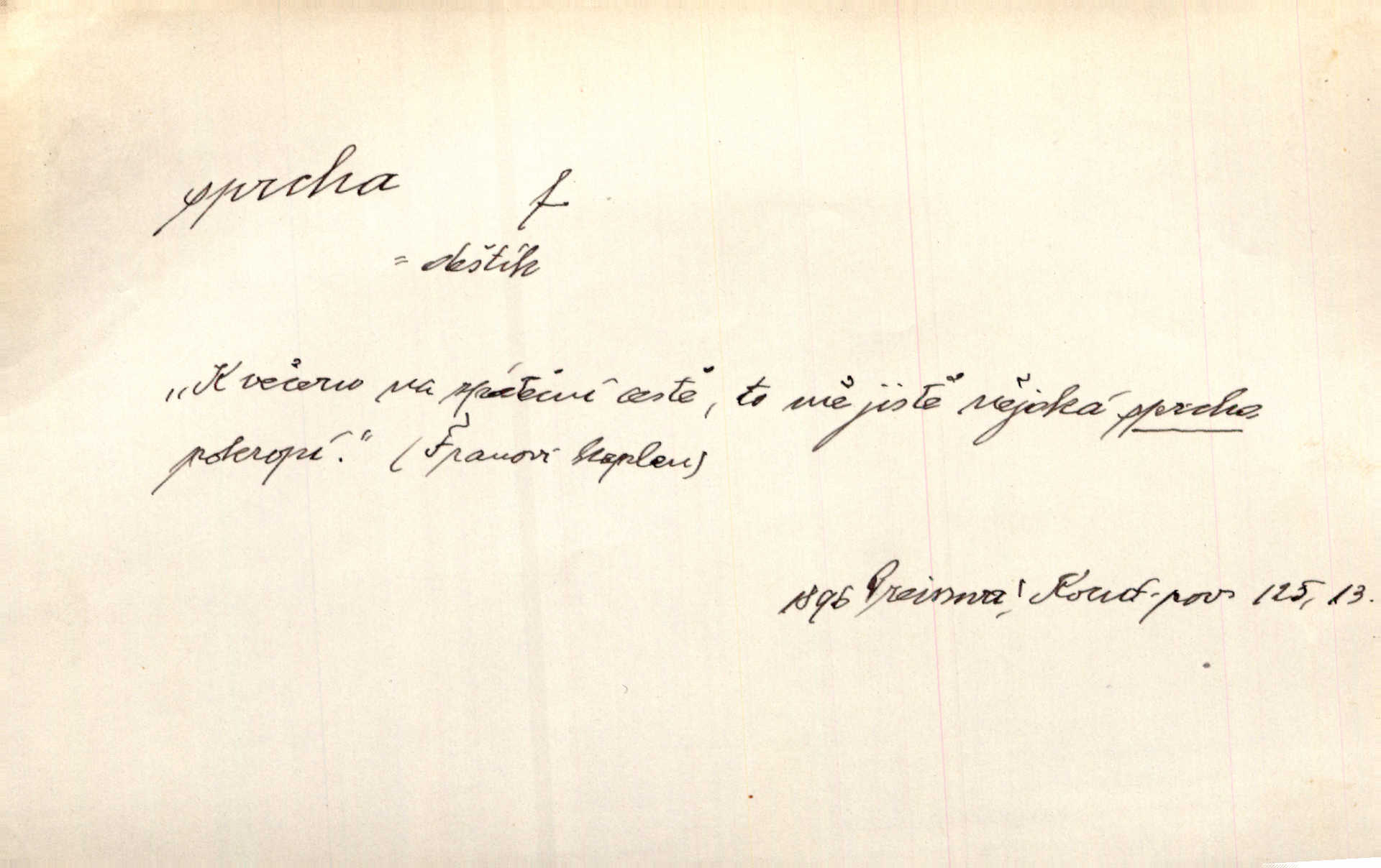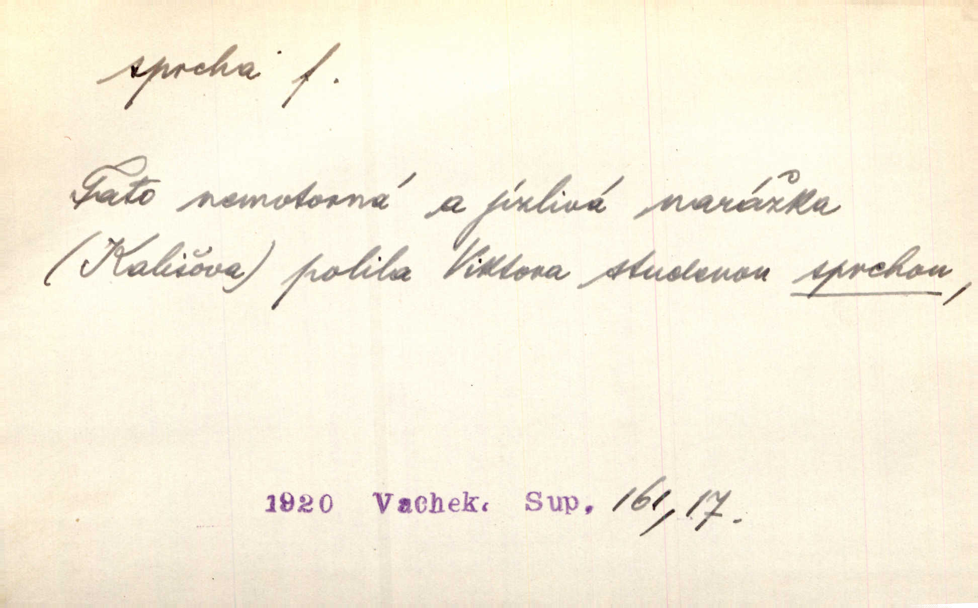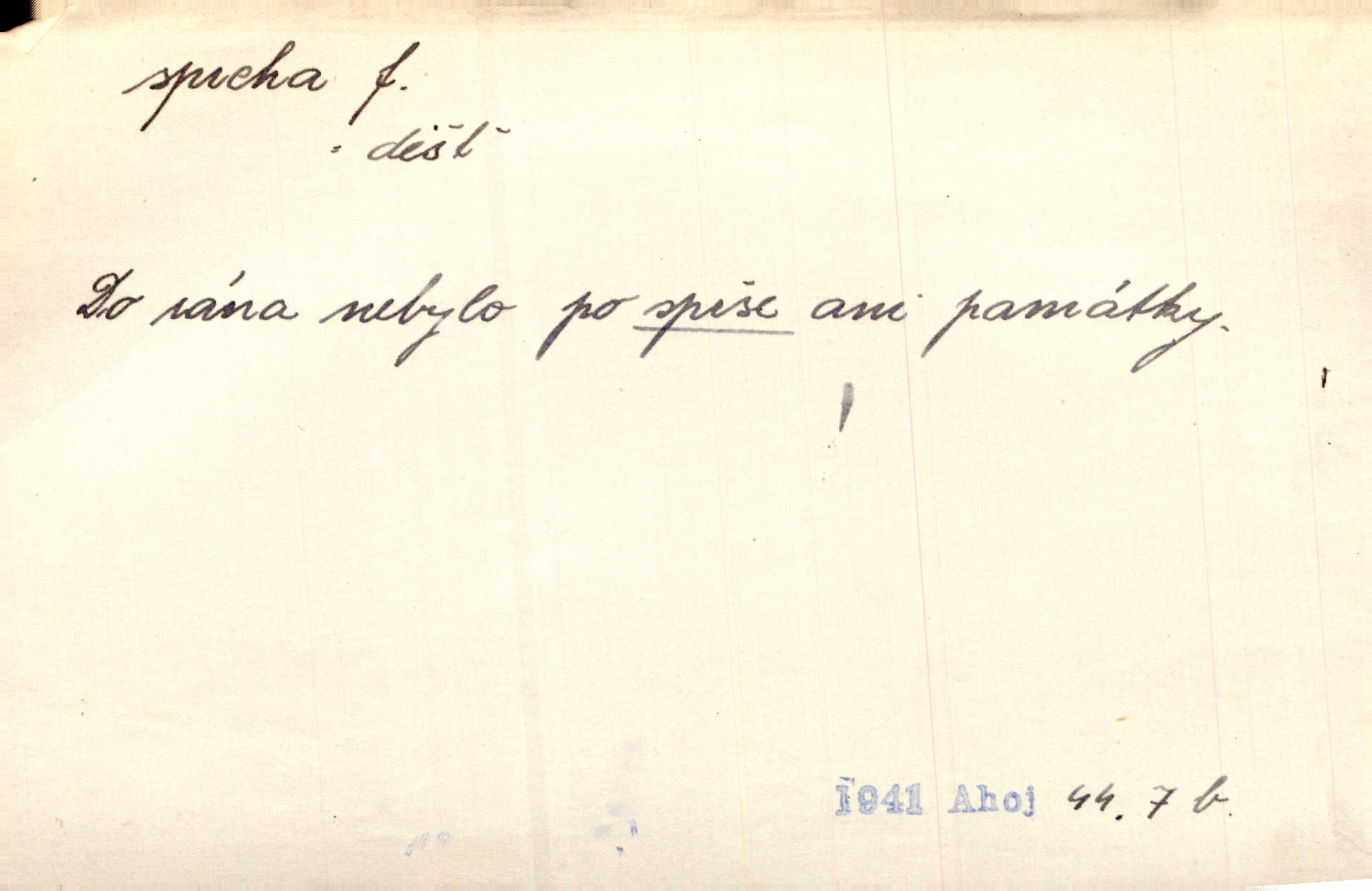 - sprcha, -y f. lid. a kniž. prudký, krátký dešť, sprška. Stromy v školské zahradě stály nehnutě a blaženě snášely bujnou sprchu. Rais. Nany šla mlhou a deštěm, nedbajíc sprchy padající se stromů. Klost. Okna zvučela již také ostrou sprchou lijavce. Jah. Výjev, který se právě odehrál mezi mnou a jím, působil na mne jako ledová sprcha. Kronb. Přen. Paže otevírá, polibků svých sprchou hosta vítá. Vrch. Jak je [knížky] otvírala, vypadla z nich celá sprcha malovaných obrázků. Merh. Jemná sprcha bolestné rozkoše rozlila se po jeho nervech. Kar. Jízlivá narážka polila Viktora studenou sprchou. Vach. Když se jednou rozhovořil o slečně Elince, skropil ho kolega štiplavě mrazivou sprchou. Jah. D umělý postřik na způsob deště; zařízení koupelny n. lázní na takový postřik. Otupován byl lázní potu a sprch, do nichž jej trainer vehnal. Čap. Ch. Nabídnou vám studenou sprchu. Ben. Kdo viděl za Rakouska umývárny a sprchy pro vojáky? Mach. Dejte pozor, aby nezamrzly sprchy. Přít.