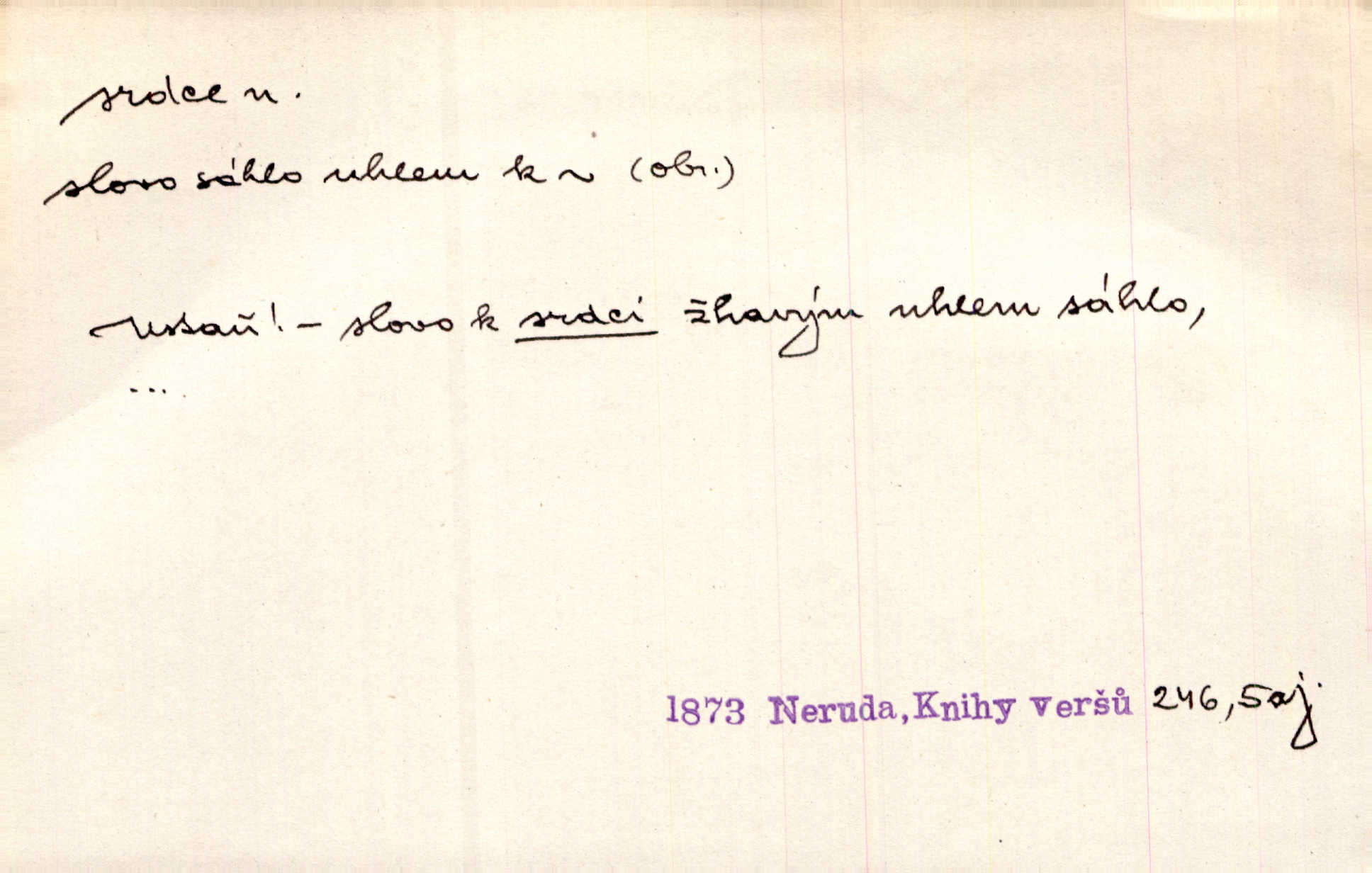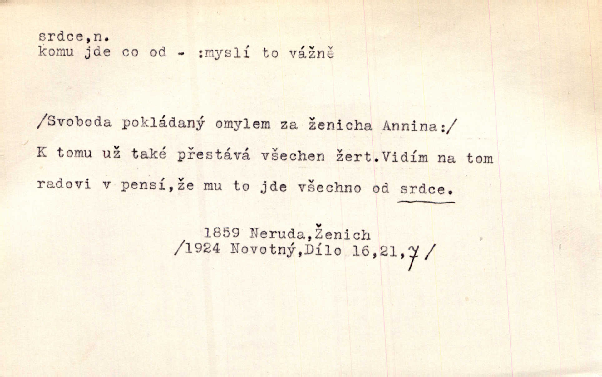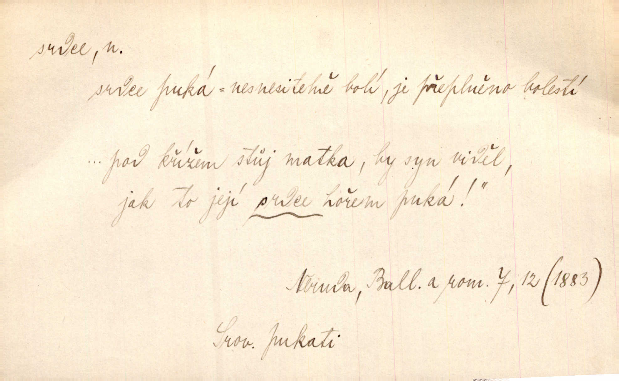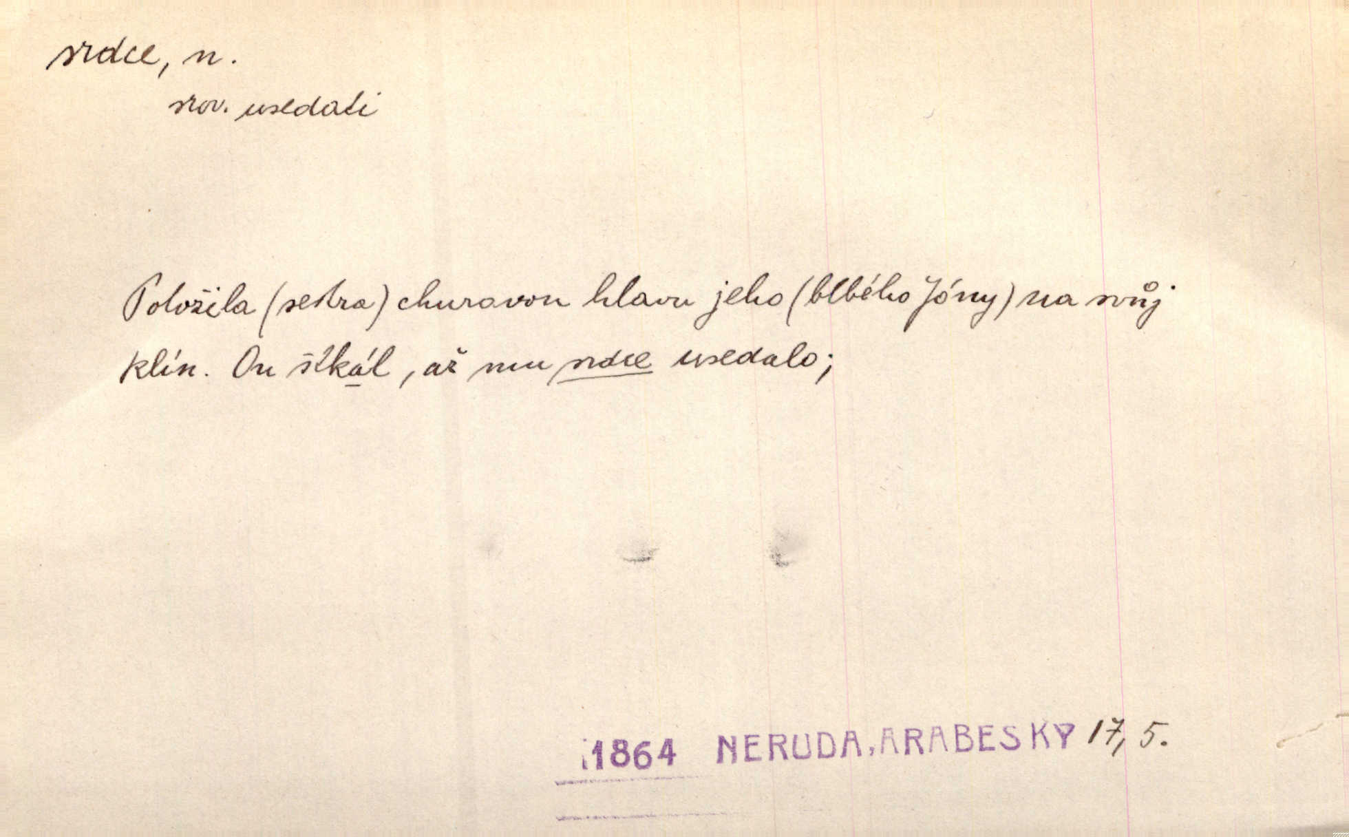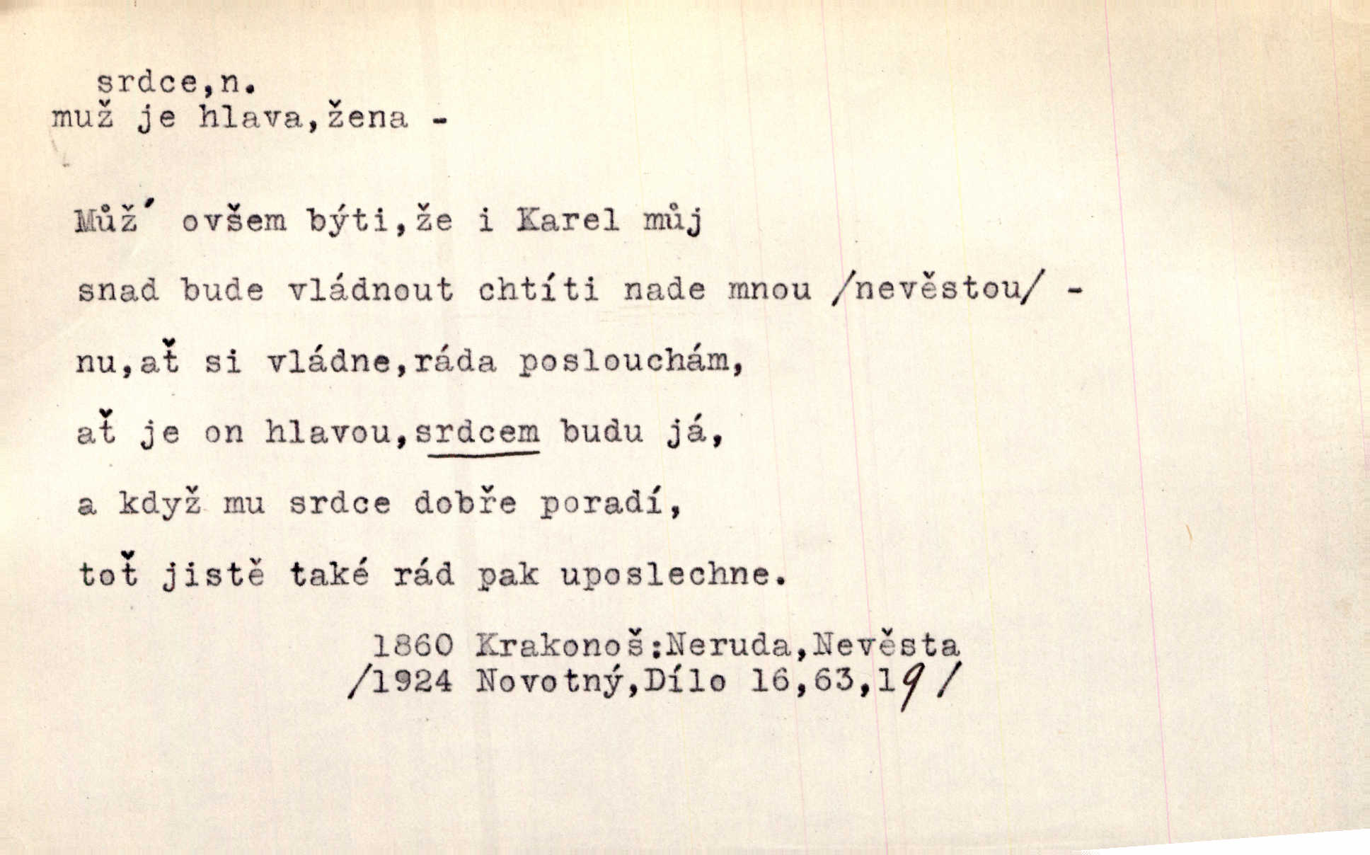 - srdce, -e n. orgán charakteristického tvaru uložený v prsou a uvádějící krev do oběhu. Srdce mi prudce bušilo. Šim. Jaro se ozvalo ve prsou, srdce tak buší a tepe. Ner. Včera [mu] zase „srdce vynechávalo“ nepravidelně tlouklo. Čap. Ch. Všecka krev vehnala se mu k srdci. Šmil. Pocítíte bolest, jakoby dýkou projel vaše srdce. Kar. Svině křičela, jakoby jí nůž do srdce vráželi hrozně. Hol. Okolo srdce mi bylo tak ouzko. Rub. V Hanušovi se při těch slovích srdce stáhlo. Šmil. Takové usmání v lících rozpučilo, že by bolestí se srdce rozskočilo. Ner. Pak bylo Jírovi, jako by se mu mělo srdce utrhnout. Hál. Já nejsem zlá, jak o mně povídají, já bych srdce rozdělila. Klost. Srdce z prsou by si za Antoše vyřízla — jen kdyby mu pomohla udělala by všechno možné. A. Mrš. Žloutly se tu ryzce, až se srdce smálo. Třeb. A srdce zrovna zmíralo v sladké té dřímotě V. Mrš. Ta dítky má — div mne to nezmučí! Pod srdcem jedno, druhé v náručí je těhotná. Vrch. Je [Bělehrad] jakoby srdcem dunajských kralů středem, jádrem. Ner. Přen. Tam, tam na Východě začalo srdce lidstva bít začal kulturní život! Ner. Černá země hýbala se pod povrchem, jakoby i srdce země už zabušilo jaru na uvítanou. Herb. Ba zdá se mi, že duše hájů nepustí ptáky z náruče, až slavíček, to srdce lesa, si při mém srdci zatluče. Hál. [V rolnictvu] vidím srdce národa. Svět. A mezi ním a plání leží Betar, to srdce vzpoury. Vrch. Byla tu Kutná Hora, stříbrné srdce království. Šus. Srdce vlasti, Praho, zdráva buď! Heyd. Výmluvný ten protest proti porobě a násilí nemohl jinak než otřásti srdcem Anglie. Krás. Círk. kongregace Srdce Ježíšova a Mariina několik řeholních společností katolické církve. Lék. dutý sval příčně pruhovaný, tvaru nepravidelně zploštělého kužele působící pohyb krve v cévách. Kuch. dušené hovězí srdce. D symbol, sídlo citu (lásky, nenávisti, radosti, bolesti). Brzy k srdci, brzy k rozumu klonila se. Šmil. Jsou [Kosmické písně] básněny více mozkem, než srdcem. Kar. Ruka vykonává vše, co jí srdce a hlava poroučí. Ner. Srdce se musí umlčeti a třeba i vyrvati. Jir. Srdce ji táhlo k dceři a k vnoučátkům. Něm. Probůh! což nemáš srdce? Krás. Jsou mezi vámi ještě lidé bez kusa srdce. Hol. Hledám lidi, v mém jak ve snu žili; bez srdce však larvy najdu jen. Mácha. Měl už tenkrát tvrdé srdce jako kámen byl nemilosrdný, necitelný. Šmil. Ženy mají srdce příliš blízko u mozku milují s rozvahou. Maj. Má [Františka] někoho již v srdci? miluje ho. Prav. Hoj, já mladá dívčina, srdce nezadané. Erb. Kterak se tedy nazývá vyvolená tvého srdce? Just. Vyznával upřímně, že po ní celým srdcem toužil. Prav. Milá dcero, co mohu říci, když si už podle srdce svého zvolila lásky. Něm. Jdi si, Alberte, kam tě srdce pudí. Jir. Rozdělil své srdce mezi Verunku a Teklu. Herb. Pravda-li, strýčku, že máte srdce pro naši vlast? Gabler. Nejpevněji však přilnulo srdce Jungmannovo k horoucímu vlastenci Vydrovi. Zel. Cítím, že tento člověk přirůstá mi k srdci. Mah. Stárkovi padla hned první den do srdce. Svět. Můj milý český jinochu, já v srdci svém tě nosím. Ner. Od přítele srdce odvrátil přestal ho mít rád. Svět. Nenáviděl od srdce křivdu opravdově. Šmil. Nenávidí z gruntu srdce směr, jakým se nese nynější lékařská literatura. Čech. Bylo jim velmi těžko u srdce byli zarmouceni. Šmil. Přece někdy to srdce stáhne zabolí to. Šim. Měl srdce v kleštích byl v úzkostech. Šmil. Jen mi teď nedělej těžké srdce nedělej starost, lítost. Něm. Musí ho srdce bolet, že pro několik hrstí obilí udělal nebožáka nešťastného musí trpět. Svět. A zas plakala, až jí srdce usedalo velmi lítostivě. Svět. Srdce ve mně radostí poskočilo. Rub. Odejde-li ona, dětem se srdce utrhne budou v těžkém žalu. Hol. Nevěsta jej odmítla a on si to vzal k srdci trápil se. Poláč. Vzal jste si k srdci mé napomenutí řídil jste se jím? Hlad. Mladá paní nebrala si příliš k srdci všechny zlomyslnosti a urážky nedbala jich. Her. Nepřeneseš přes srdce, abys jim zničil celou budoucnost nesneseš lhostejně. K. Čap. Nemohouc mužovo jednání přenésti přes srdce, podstrkovala synovi sem tam groš strpěti. Herb. Co srdce ráčilo, to se vítězným nedojedům vydati musilo vše, čeho žádali. Herb. Bylo mi tatínka z toho srdce líto upřímně. Kos. Pláče ze srdce lítostivě, upřímně. Vrch. S jak těžkým srdcem vytahoval své zlaťáky velmi nerad! Dyk. Umíral s lehkým srdcem lehce. Kun. S lehčím srdcem vrátil jsem se k Pavlovi Lum. D základ povahové stránky, sídlo duševního života, nitro. Lidé se umějí přetvařovati, kdo jim vidí do srdce? Šmil. Nemajíce v srdci žádné náboženství, před světem největší nábožnůstkářství provozují. Havl. Čekal s nápadným neklidem v srdci. Vach. Teď ukázal srdce i ledví objevil se v pravé podobě. Baar. Lidí dost, však srdcí, srdcí málo dobrých lidí. Heyd. Antonín má dobré srdce. Jir. Oni nemají zlé srdce. Šim. Kdo má kus poctivého srdce, raduje se s Vámi. Herb. Měl měkké srdce a tvrdou hlavu. Rub. Měla od jakživa srdce z másla byla jemná, citlivá. Tyl. Obr s srdcem dítěte dobrácký, citlivý. Mach. Zlatý skví se na prsou mu háv, ale pod ním bije srdce zrádné je zrádcem. Kamen. Měl štíra v srdci nasazeného byl neklidný. Baar. Co byl ženat, otevřel jí srdce vyznal se ze všeho. Svět. A dnes po letech vím, že Aleš každému srdce neotevře. Rais. Otevřel knězi hříšné své srdce. Šrám. Po ty tři roky s nikým od srdce nepromluvil upřímně. K. Čap. Vylívá srdce své mluví důvěrně. Ner. Vypravovati upřímně a nelíčeně, od srdce k srdci, dovede člověk toliko řečí jednou. K