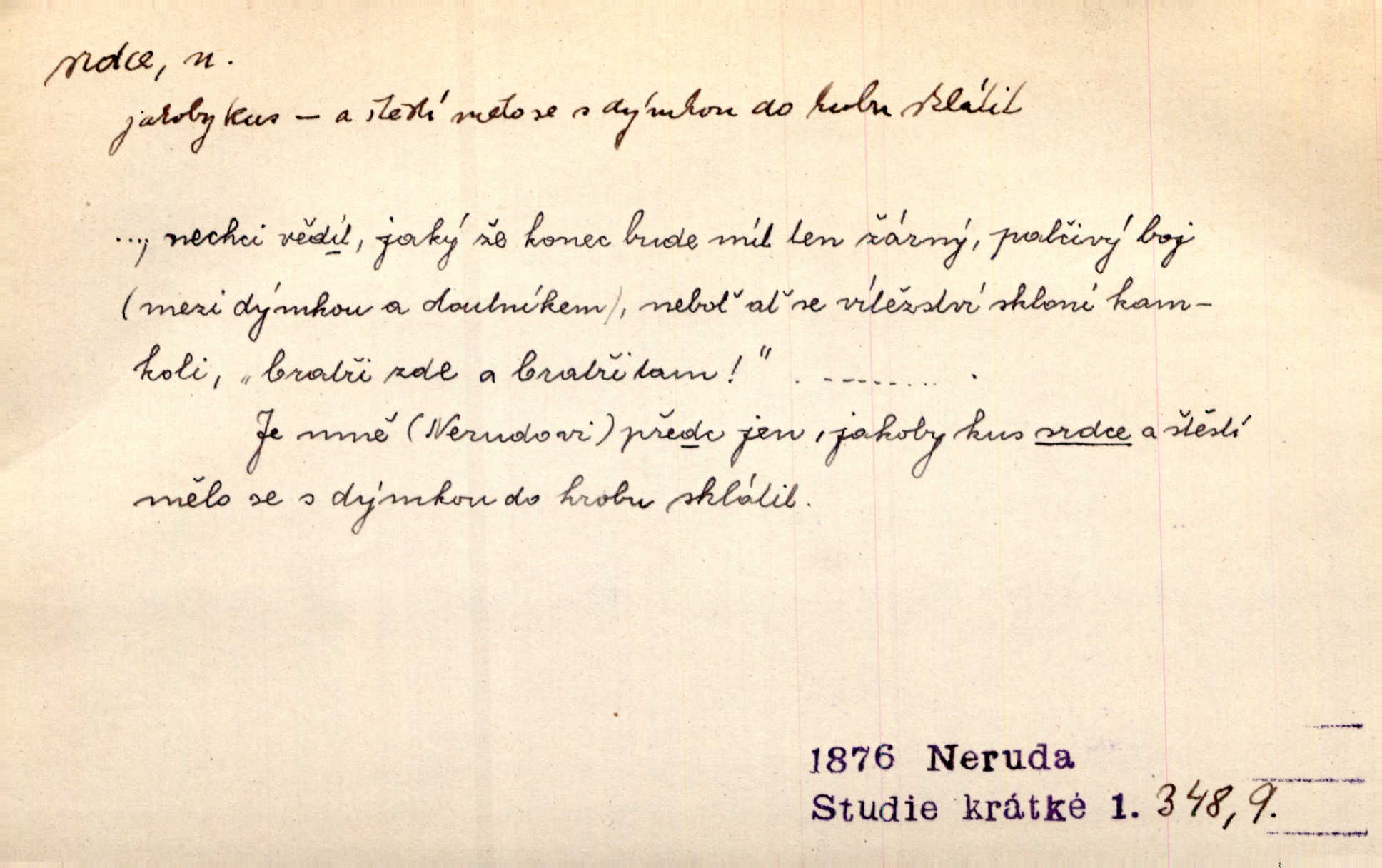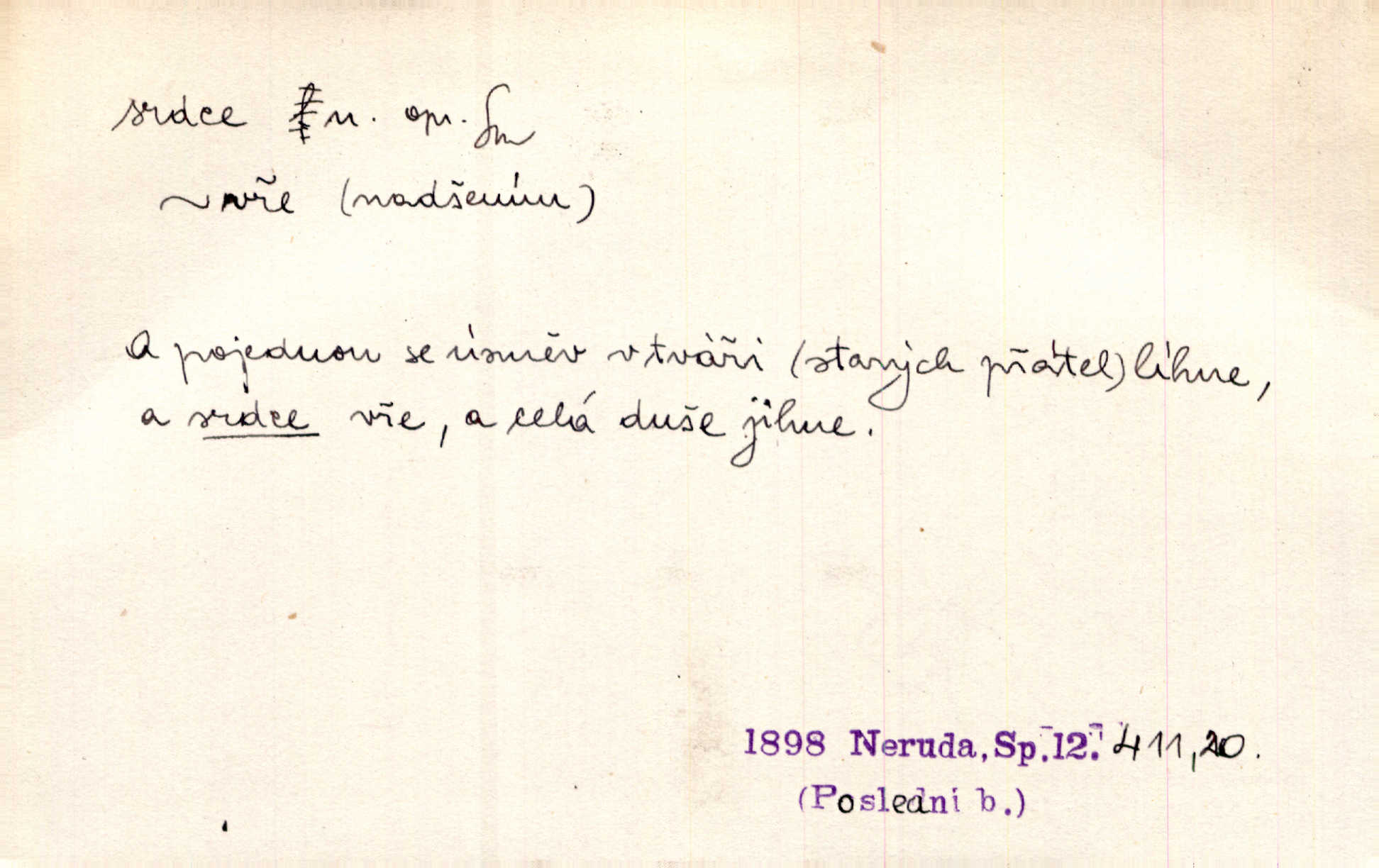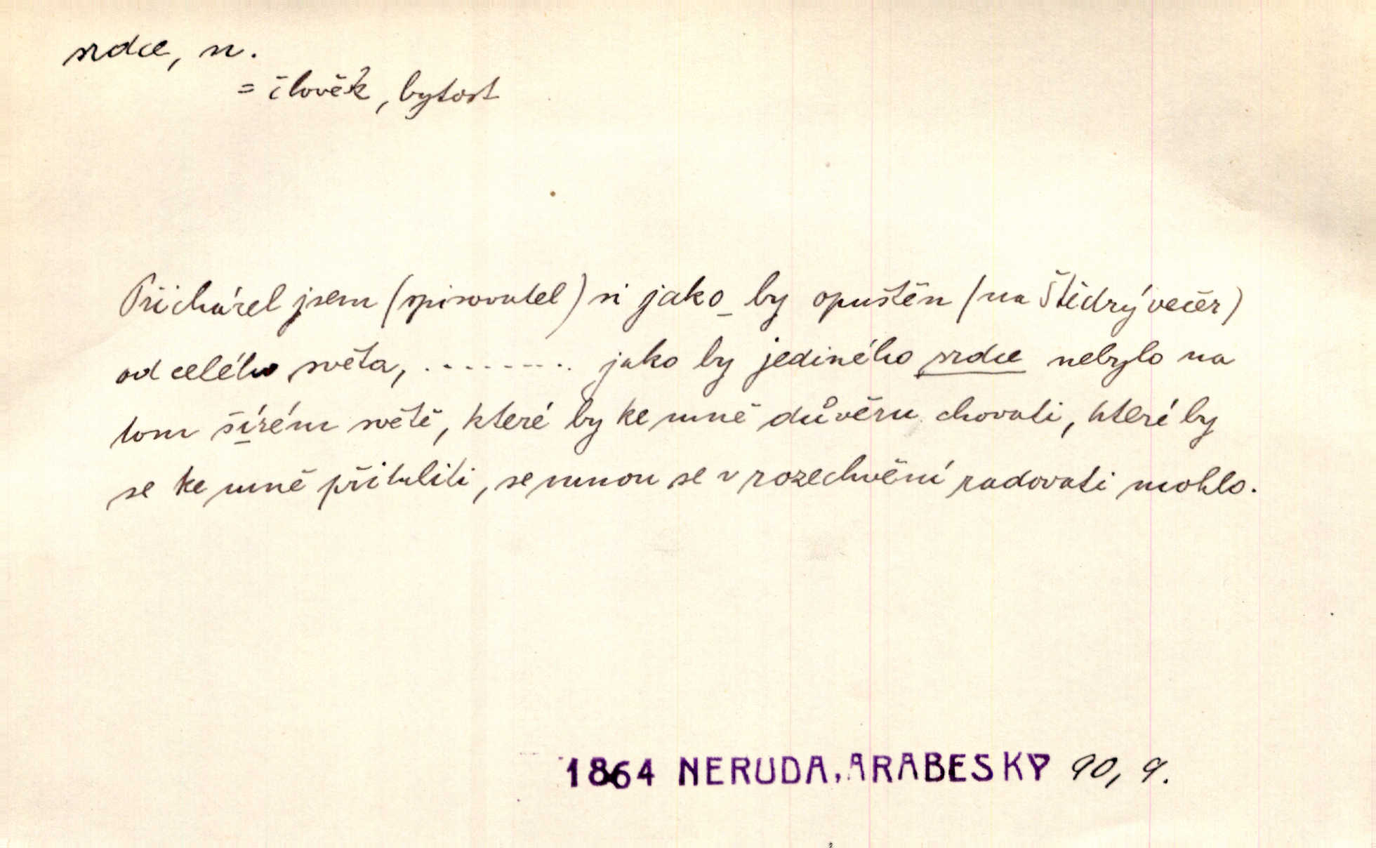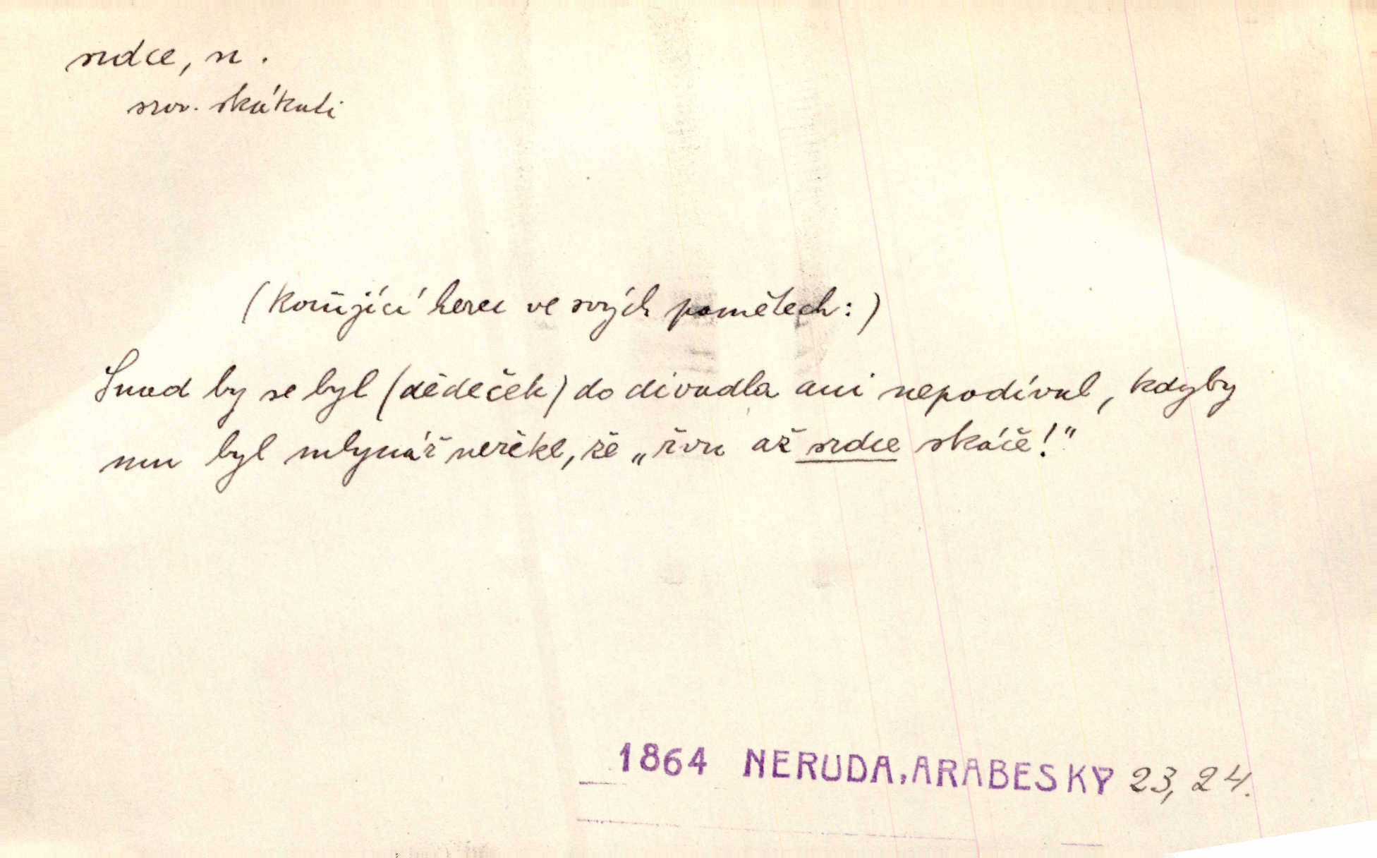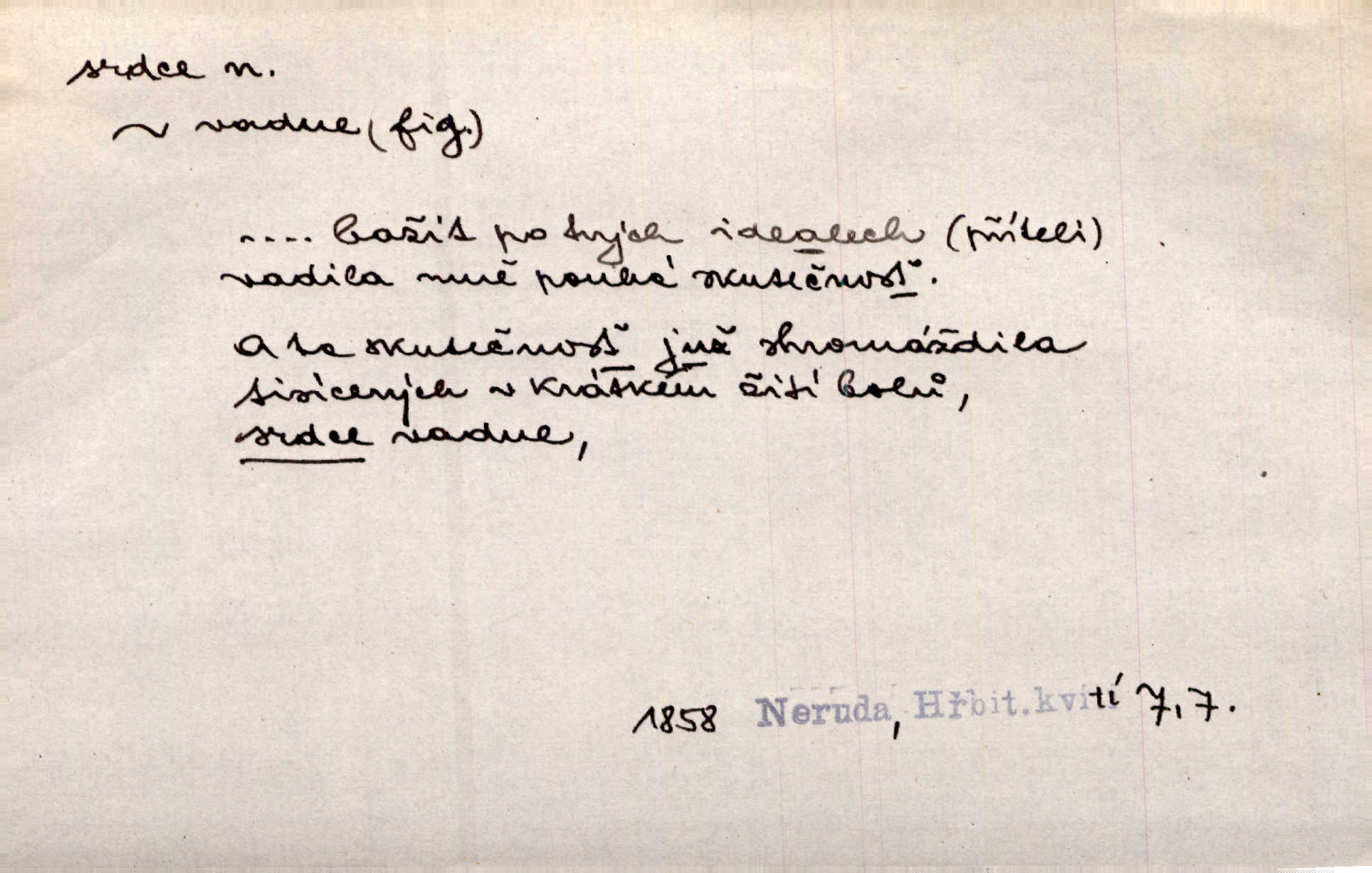 - srdce, -e n. orgán charakteristického tvaru uložený v prsou a uvádějící krev do oběhu. Srdce mi prudce bušilo. Šim. Jaro se ozvalo ve prsou, srdce tak buší a tepe. Ner. Včera [mu] zase „srdce vynechávalo“ nepravidelně tlouklo. Čap. Ch. Všecka krev vehnala se mu k srdci. Šmil. Pocítíte bolest, jakoby dýkou projel vaše srdce. Kar. Svině křičela, jakoby jí nůž do srdce vráželi hrozně. Hol. Okolo srdce mi bylo tak ouzko. Rub. V Hanušovi se při těch slovích srdce stáhlo. Šmil. Takové usmání v lících rozpučilo, že by bolestí se srdce rozskočilo. Ner. Pak bylo Jírovi, jako by se mu mělo srdce utrhnout. Hál. Já nejsem zlá, jak o mně povídají, já bych srdce rozdělila. Klost. Srdce z prsou by si za Antoše vyřízla — jen kdyby mu pomohla udělala by všechno možné. A. Mrš. Žloutly se tu ryzce, až se srdce smálo. Třeb. A srdce zrovna zmíralo v sladké té dřímotě V. Mrš. Ta dítky má — div mne to nezmučí! Pod srdcem jedno, druhé v náručí je těhotná. Vrch. Je [Bělehrad] jakoby srdcem dunajských kralů středem, jádrem. Ner. Přen. Tam, tam na Východě začalo srdce lidstva bít začal kulturní život! Ner. Černá země hýbala se pod povrchem, jakoby i srdce země už zabušilo jaru na uvítanou. Herb. Ba zdá se mi, že duše hájů nepustí ptáky z náruče, až slavíček, to srdce lesa, si při mém srdci zatluče. Hál. [V rolnictvu] vidím srdce národa. Svět. A mezi ním a plání leží Betar, to srdce vzpoury. Vrch. Byla tu Kutná Hora, stříbrné srdce království. Šus. Srdce vlasti, Praho, zdráva buď! Heyd. Výmluvný ten protest proti porobě a násilí nemohl jinak než otřásti srdcem Anglie. Krás. Círk. kongregace Srdce Ježíšova a Mariina několik řeholních společností katolické církve. Lék. dutý sval příčně pruhovaný, tvaru nepravidelně zploštělého kužele působící pohyb krve v cévách. Kuch. dušené hovězí srdce. D symbol, sídlo citu (lásky, nenávisti, radosti, bolesti). Brzy k srdci, brzy k rozumu klonila se. Šmil. Jsou [Kosmické písně] básněny více mozkem, než srdcem. Kar. Ruka vykonává vše, co jí srdce a hlava poroučí. Ner. Srdce se musí umlčeti a třeba i vyrvati. Jir. Srdce ji táhlo k dceři a k vnoučátkům. Něm. Probůh! což nemáš srdce? Krás. Jsou mezi vámi ještě lidé bez kusa srdce. Hol. Hledám lidi, v mém jak ve snu žili; bez srdce však larvy najdu jen. Mácha. Měl už tenkrát tvrdé srdce jako kámen byl nemilosrdný, necitelný. Šmil. Ženy mají srdce příliš blízko u mozku milují s rozvahou. Maj. Má [Františka] někoho již v srdci? miluje ho. Prav. Hoj, já mladá dívčina, srdce nezadané. Erb. Kterak se tedy nazývá vyvolená tvého srdce? Just. Vyznával upřímně, že po ní celým srdcem toužil. Prav. Milá dcero, co mohu říci, když si už podle srdce svého zvolila lásky. Něm. Jdi si, Alberte, kam tě srdce pudí. Jir. Rozdělil své srdce mezi Verunku a Teklu. Herb. Pravda-li, strýčku, že máte srdce pro naši vlast? Gabler. Nejpevněji však přilnulo srdce Jungmannovo k horoucímu vlastenci Vydrovi. Zel. Cítím, že tento člověk přirůstá mi k srdci. Mah. Stárkovi padla hned první den do srdce. Svět. Můj milý český jinochu, já v srdci svém tě nosím. Ner. Od přítele srdce odvrátil přestal ho mít rád. Svět. Nenáviděl od srdce křivdu opravdově. Šmil. Nenávidí z gruntu srdce směr, jakým se nese nynější lékařská literatura. Čech. Bylo jim velmi těžko u srdce byli zarmouceni. Šmil. Přece někdy to srdce stáhne zabolí to. Šim. Měl srdce v kleštích byl v úzkostech. Šmil. Jen mi teď nedělej těžké srdce nedělej starost, lítost. Něm. Musí ho srdce bolet, že pro několik hrstí obilí udělal nebožáka nešťastného musí trpět. Svět. A zas plakala, až jí srdce usedalo velmi lítostivě. Svět. Srdce ve mně radostí poskočilo. Rub. Odejde-li ona, dětem se srdce utrhne budou v těžkém žalu. Hol. Nevěsta jej odmítla a on si to vzal k srdci trápil se. Poláč. Vzal jste si k srdci mé napomenutí řídil jste se jím? Hlad. Mladá paní nebrala si příliš k srdci všechny zlomyslnosti a urážky nedbala jich. Her. Nepřeneseš přes srdce, abys jim zničil celou budoucnost nesneseš lhostejně. K. Čap. Nemohouc mužovo jednání přenésti přes srdce, podstrkovala synovi sem tam groš strpěti. Herb. Co srdce ráčilo, to se vítězným nedojedům vydati musilo vše, čeho žádali. Herb. Bylo mi tatínka z toho srdce líto upřímně. Kos. Pláče ze srdce lítostivě, upřímně. Vrch. S jak těžkým srdcem vytahoval své zlaťáky velmi nerad! Dyk. Umíral s lehkým srdcem lehce. Kun. S lehčím srdcem vrátil jsem se k Pavlovi Lum. D základ povahové stránky, sídlo duševního života, nitro. Lidé se umějí přetvařovati, kdo jim vidí do srdce? Šmil. Nemajíce v srdci žádné náboženství, před světem největší nábožnůstkářství provozují. Havl. Čekal s nápadným neklidem v srdci. Vach. Teď ukázal srdce i ledví objevil se v pravé podobě. Baar. Lidí dost, však srdcí, srdcí málo dobrých lidí. Heyd. Antonín má dobré srdce. Jir. Oni nemají zlé srdce. Šim. Kdo má kus poctivého srdce, raduje se s Vámi. Herb. Měl měkké srdce a tvrdou hlavu. Rub. Měla od jakživa srdce z másla byla jemná, citlivá. Tyl. Obr s srdcem dítěte dobrácký, citlivý. Mach. Zlatý skví se na prsou mu háv, ale pod ním bije srdce zrádné je zrádcem. Kamen. Měl štíra v srdci nasazeného byl neklidný. Baar. Co byl ženat, otevřel jí srdce vyznal se ze všeho. Svět. A dnes po letech vím, že Aleš každému srdce neotevře. Rais. Otevřel knězi hříšné své srdce. Šrám. Po ty tři roky s nikým od srdce nepromluvil upřímně. K. Čap. Vylívá srdce své mluví důvěrně. Ner. Vypravovati upřímně a nelíčeně, od srdce k srdci, dovede člověk toliko řečí jednou. K