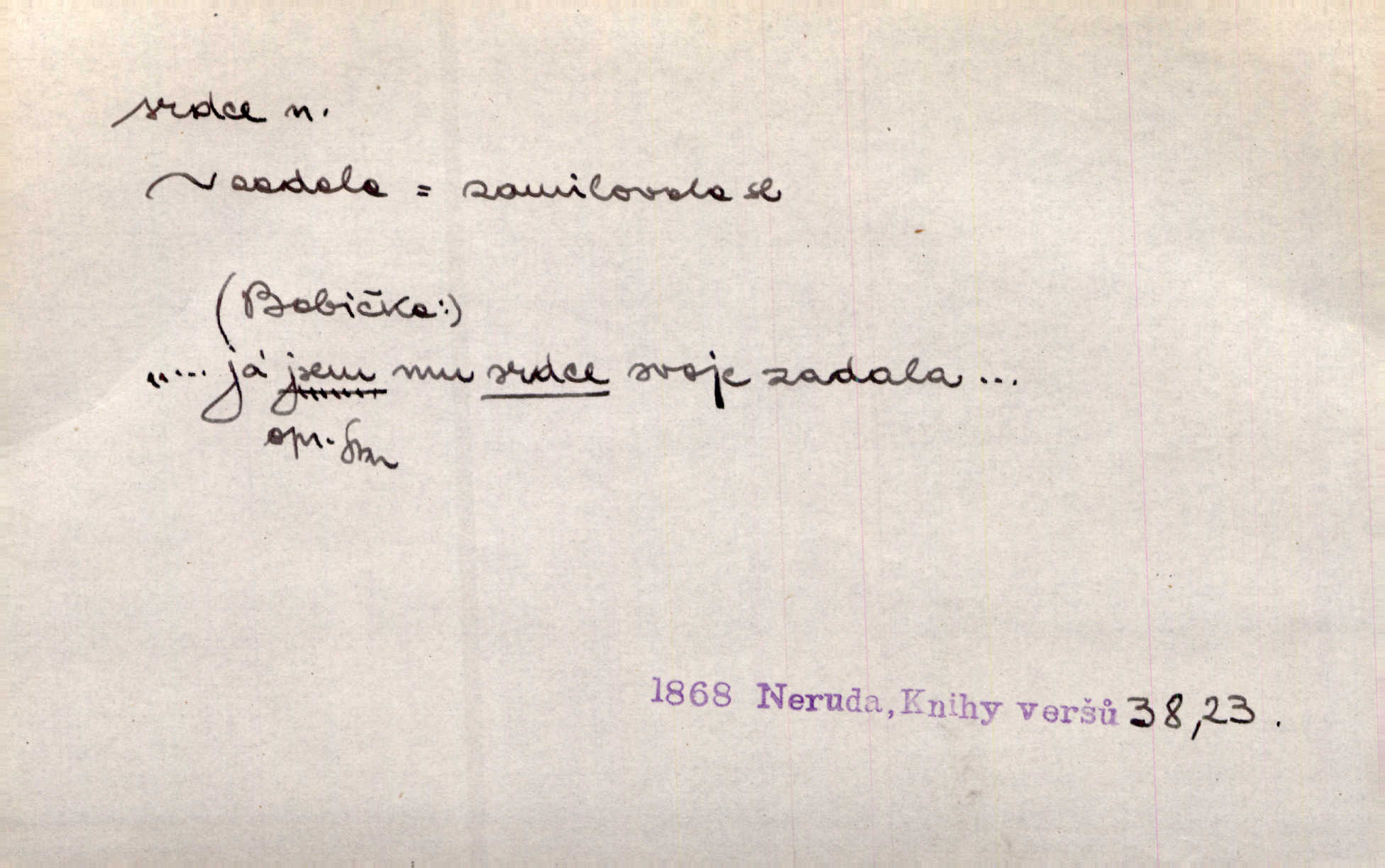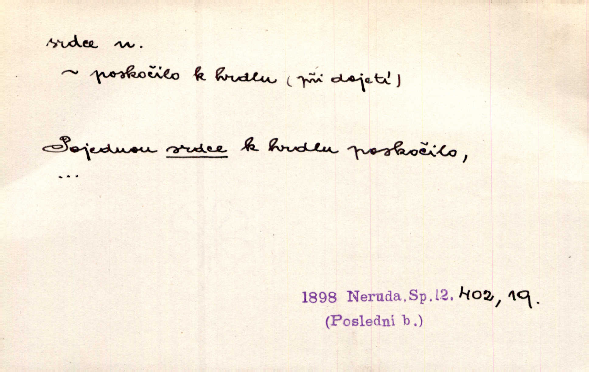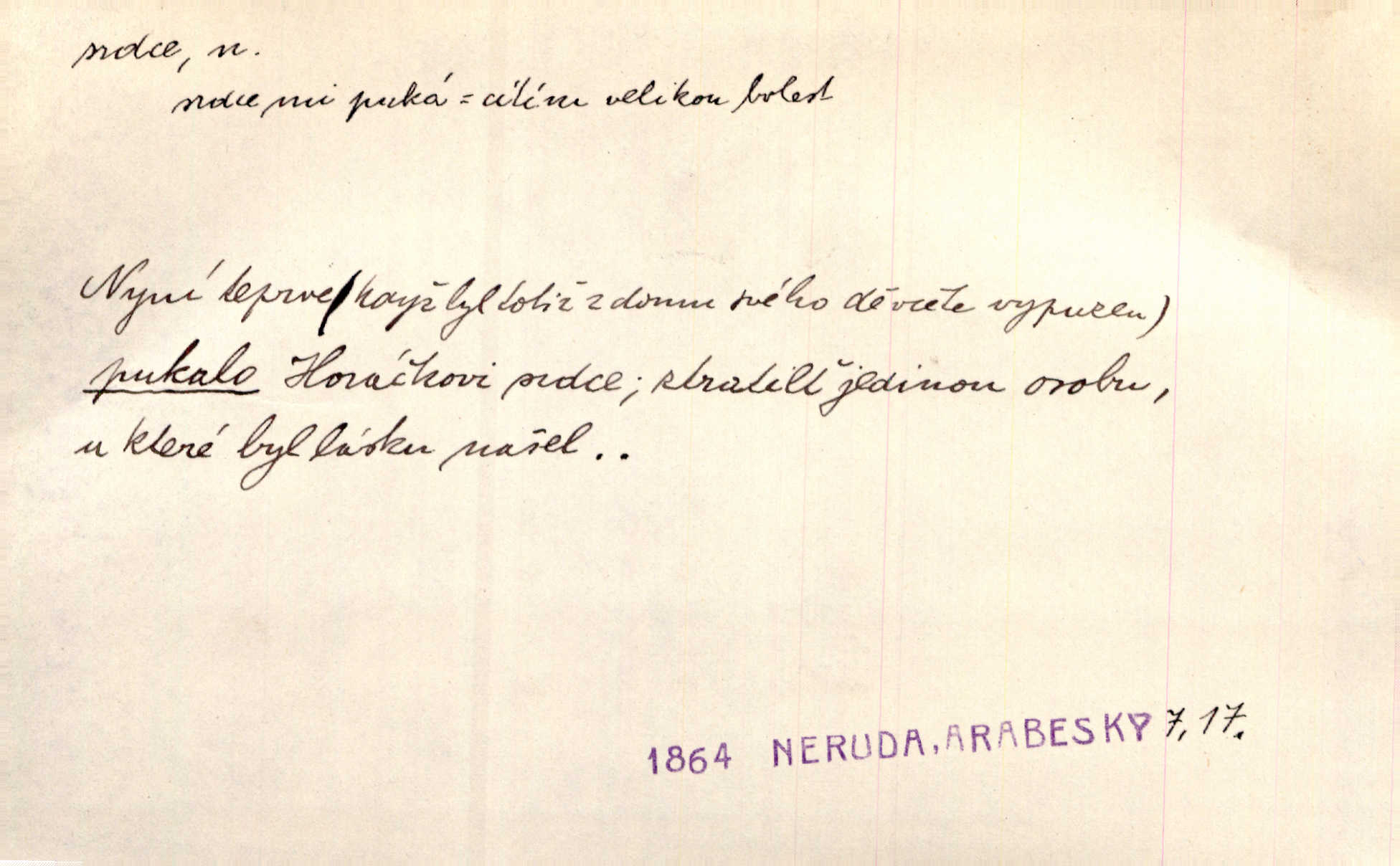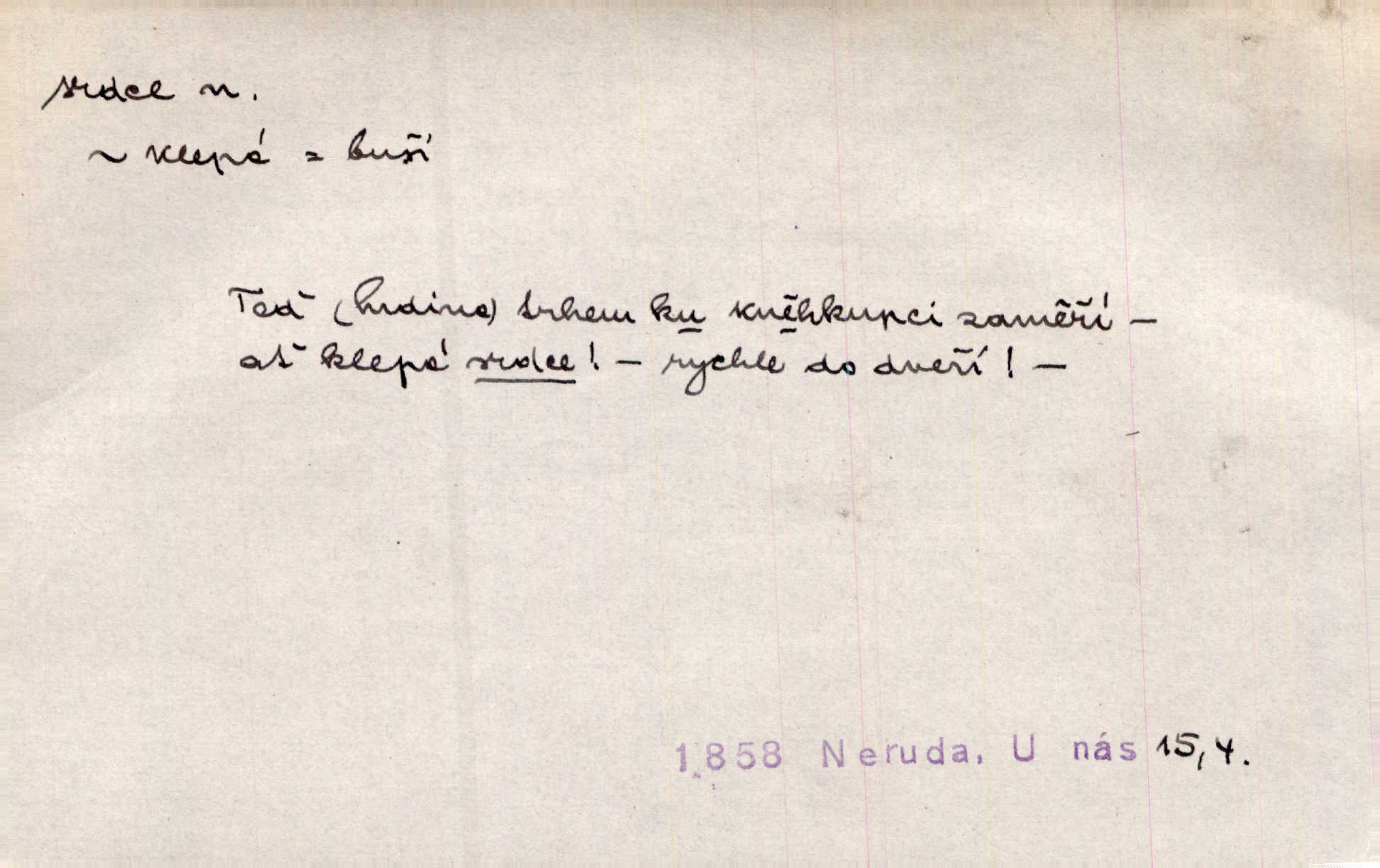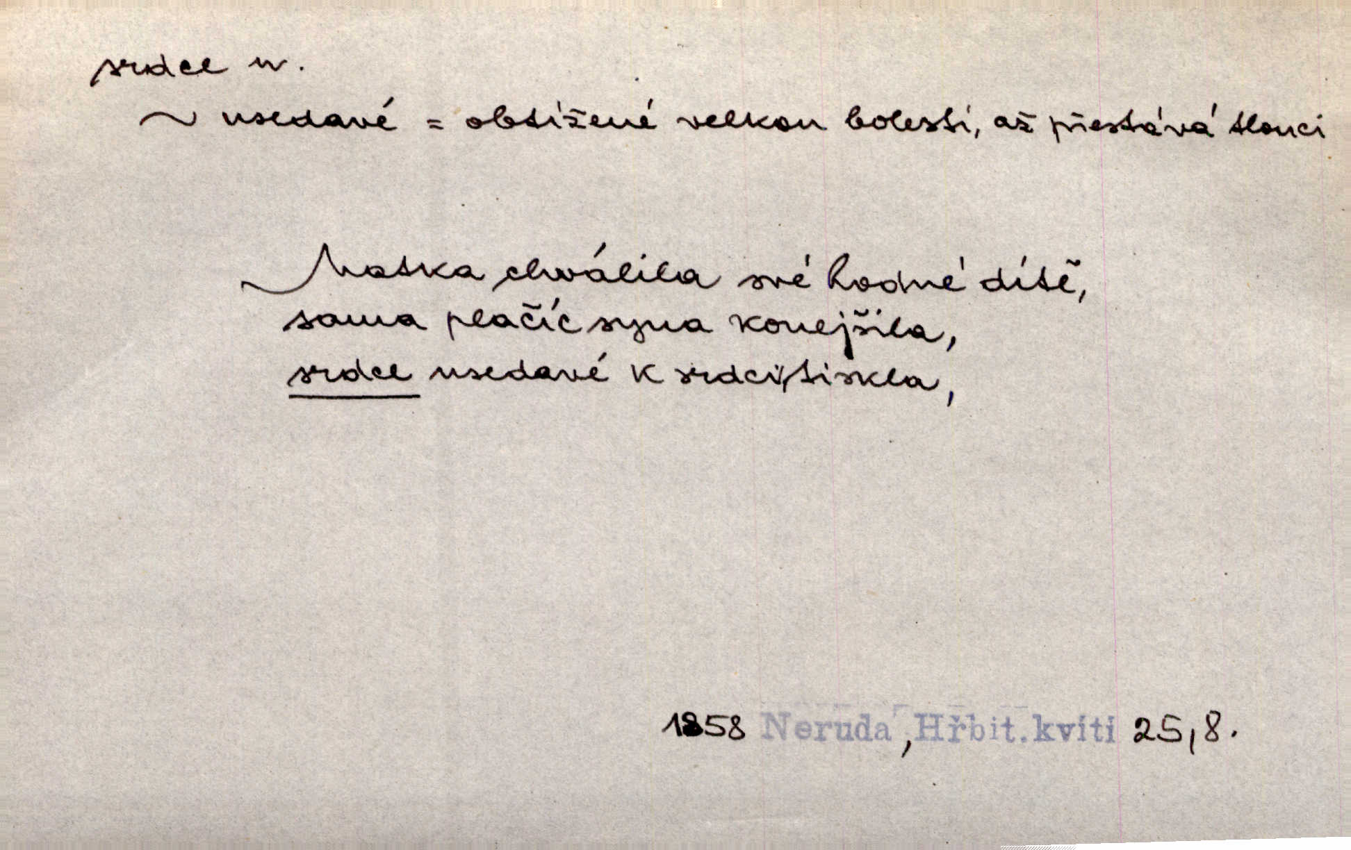 - srdce, -e n. orgán charakteristického tvaru uložený v prsou a uvádějící krev do oběhu. Srdce mi prudce bušilo. Šim. Jaro se ozvalo ve prsou, srdce tak buší a tepe. Ner. Včera [mu] zase „srdce vynechávalo“ nepravidelně tlouklo. Čap. Ch. Všecka krev vehnala se mu k srdci. Šmil. Pocítíte bolest, jakoby dýkou projel vaše srdce. Kar. Svině křičela, jakoby jí nůž do srdce vráželi hrozně. Hol. Okolo srdce mi bylo tak ouzko. Rub. V Hanušovi se při těch slovích srdce stáhlo. Šmil. Takové usmání v lících rozpučilo, že by bolestí se srdce rozskočilo. Ner. Pak bylo Jírovi, jako by se mu mělo srdce utrhnout. Hál. Já nejsem zlá, jak o mně povídají, já bych srdce rozdělila. Klost. Srdce z prsou by si za Antoše vyřízla — jen kdyby mu pomohla udělala by všechno možné. A. Mrš. Žloutly se tu ryzce, až se srdce smálo. Třeb. A srdce zrovna zmíralo v sladké té dřímotě V. Mrš. Ta dítky má — div mne to nezmučí! Pod srdcem jedno, druhé v náručí je těhotná. Vrch. Je [Bělehrad] jakoby srdcem dunajských kralů středem, jádrem. Ner. Přen. Tam, tam na Východě začalo srdce lidstva bít začal kulturní život! Ner. Černá země hýbala se pod povrchem, jakoby i srdce země už zabušilo jaru na uvítanou. Herb. Ba zdá se mi, že duše hájů nepustí ptáky z náruče, až slavíček, to srdce lesa, si při mém srdci zatluče. Hál. [V rolnictvu] vidím srdce národa. Svět. A mezi ním a plání leží Betar, to srdce vzpoury. Vrch. Byla tu Kutná Hora, stříbrné srdce království. Šus. Srdce vlasti, Praho, zdráva buď! Heyd. Výmluvný ten protest proti porobě a násilí nemohl jinak než otřásti srdcem Anglie. Krás. Círk. kongregace Srdce Ježíšova a Mariina několik řeholních společností katolické církve. Lék. dutý sval příčně pruhovaný, tvaru nepravidelně zploštělého kužele působící pohyb krve v cévách. Kuch. dušené hovězí srdce. D symbol, sídlo citu (lásky, nenávisti, radosti, bolesti). Brzy k srdci, brzy k rozumu klonila se. Šmil. Jsou [Kosmické písně] básněny více mozkem, než srdcem. Kar. Ruka vykonává vše, co jí srdce a hlava poroučí. Ner. Srdce se musí umlčeti a třeba i vyrvati. Jir. Srdce ji táhlo k dceři a k vnoučátkům. Něm. Probůh! což nemáš srdce? Krás. Jsou mezi vámi ještě lidé bez kusa srdce. Hol. Hledám lidi, v mém jak ve snu žili; bez srdce však larvy najdu jen. Mácha. Měl už tenkrát tvrdé srdce jako kámen byl nemilosrdný, necitelný. Šmil. Ženy mají srdce příliš blízko u mozku milují s rozvahou. Maj. Má [Františka] někoho již v srdci? miluje ho. Prav. Hoj, já mladá dívčina, srdce nezadané. Erb. Kterak se tedy nazývá vyvolená tvého srdce? Just. Vyznával upřímně, že po ní celým srdcem toužil. Prav. Milá dcero, co mohu říci, když si už podle srdce svého zvolila lásky. Něm. Jdi si, Alberte, kam tě srdce pudí. Jir. Rozdělil své srdce mezi Verunku a Teklu. Herb. Pravda-li, strýčku, že máte srdce pro naši vlast? Gabler. Nejpevněji však přilnulo srdce Jungmannovo k horoucímu vlastenci Vydrovi. Zel. Cítím, že tento člověk přirůstá mi k srdci. Mah. Stárkovi padla hned první den do srdce. Svět. Můj milý český jinochu, já v srdci svém tě nosím. Ner. Od přítele srdce odvrátil přestal ho mít rád. Svět. Nenáviděl od srdce křivdu opravdově. Šmil. Nenávidí z gruntu srdce směr, jakým se nese nynější lékařská literatura. Čech. Bylo jim velmi těžko u srdce byli zarmouceni. Šmil. Přece někdy to srdce stáhne zabolí to. Šim. Měl srdce v kleštích byl v úzkostech. Šmil. Jen mi teď nedělej těžké srdce nedělej starost, lítost. Něm. Musí ho srdce bolet, že pro několik hrstí obilí udělal nebožáka nešťastného musí trpět. Svět. A zas plakala, až jí srdce usedalo velmi lítostivě. Svět. Srdce ve mně radostí poskočilo. Rub. Odejde-li ona, dětem se srdce utrhne budou v těžkém žalu. Hol. Nevěsta jej odmítla a on si to vzal k srdci trápil se. Poláč. Vzal jste si k srdci mé napomenutí řídil jste se jím? Hlad. Mladá paní nebrala si příliš k srdci všechny zlomyslnosti a urážky nedbala jich. Her. Nepřeneseš přes srdce, abys jim zničil celou budoucnost nesneseš lhostejně. K. Čap. Nemohouc mužovo jednání přenésti přes srdce, podstrkovala synovi sem tam groš strpěti. Herb. Co srdce ráčilo, to se vítězným nedojedům vydati musilo vše, čeho žádali. Herb. Bylo mi tatínka z toho srdce líto upřímně. Kos. Pláče ze srdce lítostivě, upřímně. Vrch. S jak těžkým srdcem vytahoval své zlaťáky velmi nerad! Dyk. Umíral s lehkým srdcem lehce. Kun. S lehčím srdcem vrátil jsem se k Pavlovi Lum. D základ povahové stránky, sídlo duševního života, nitro. Lidé se umějí přetvařovati, kdo jim vidí do srdce? Šmil. Nemajíce v srdci žádné náboženství, před světem největší nábožnůstkářství provozují. Havl. Čekal s nápadným neklidem v srdci. Vach. Teď ukázal srdce i ledví objevil se v pravé podobě. Baar. Lidí dost, však srdcí, srdcí málo dobrých lidí. Heyd. Antonín má dobré srdce. Jir. Oni nemají zlé srdce. Šim. Kdo má kus poctivého srdce, raduje se s Vámi. Herb. Měl měkké srdce a tvrdou hlavu. Rub. Měla od jakživa srdce z másla byla jemná, citlivá. Tyl. Obr s srdcem dítěte dobrácký, citlivý. Mach. Zlatý skví se na prsou mu háv, ale pod ním bije srdce zrádné je zrádcem. Kamen. Měl štíra v srdci nasazeného byl neklidný. Baar. Co byl ženat, otevřel jí srdce vyznal se ze všeho. Svět. A dnes po letech vím, že Aleš každému srdce neotevře. Rais. Otevřel knězi hříšné své srdce. Šrám. Po ty tři roky s nikým od srdce nepromluvil upřímně. K. Čap. Vylívá srdce své mluví důvěrně. Ner. Vypravovati upřímně a nelíčeně, od srdce k srdci, dovede člověk toliko řečí jednou. K