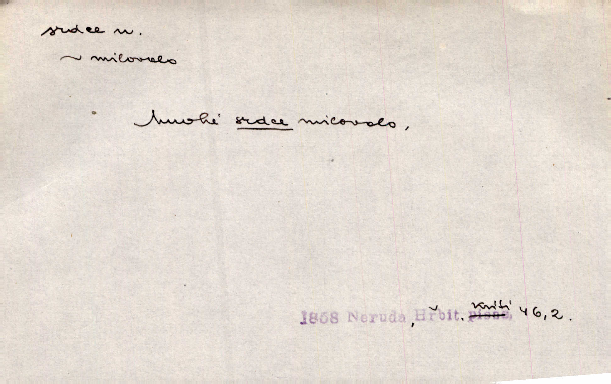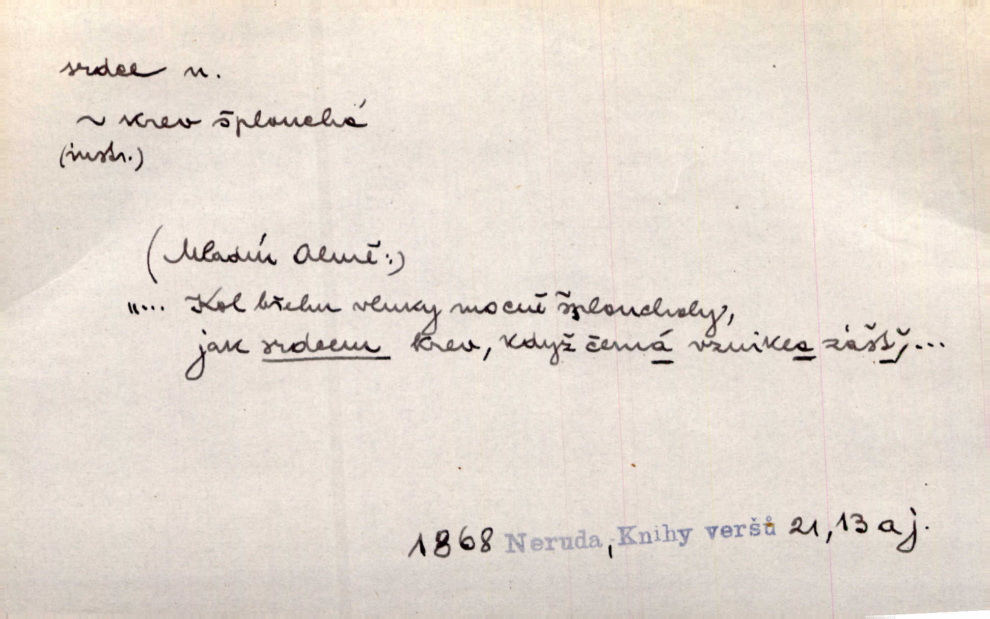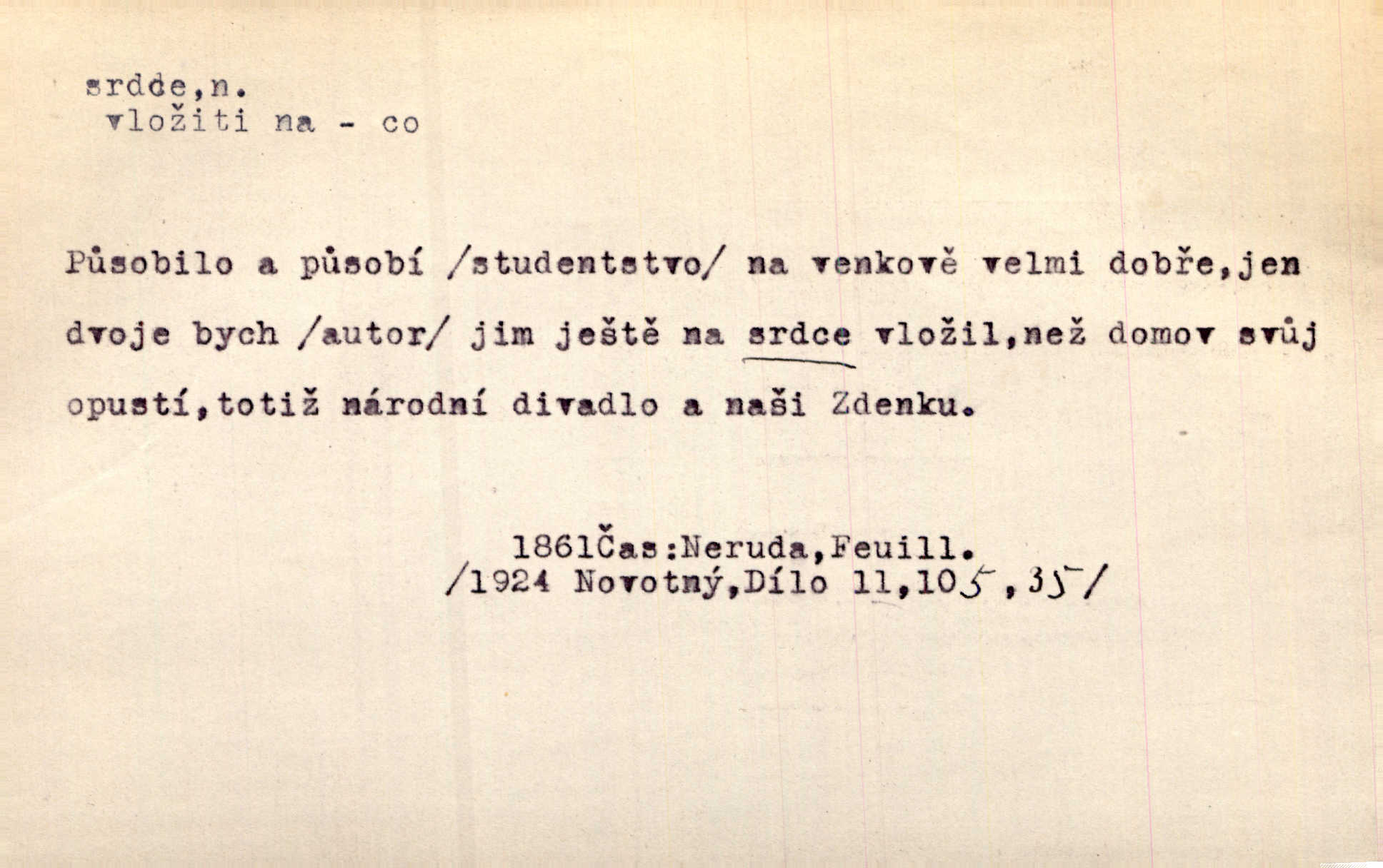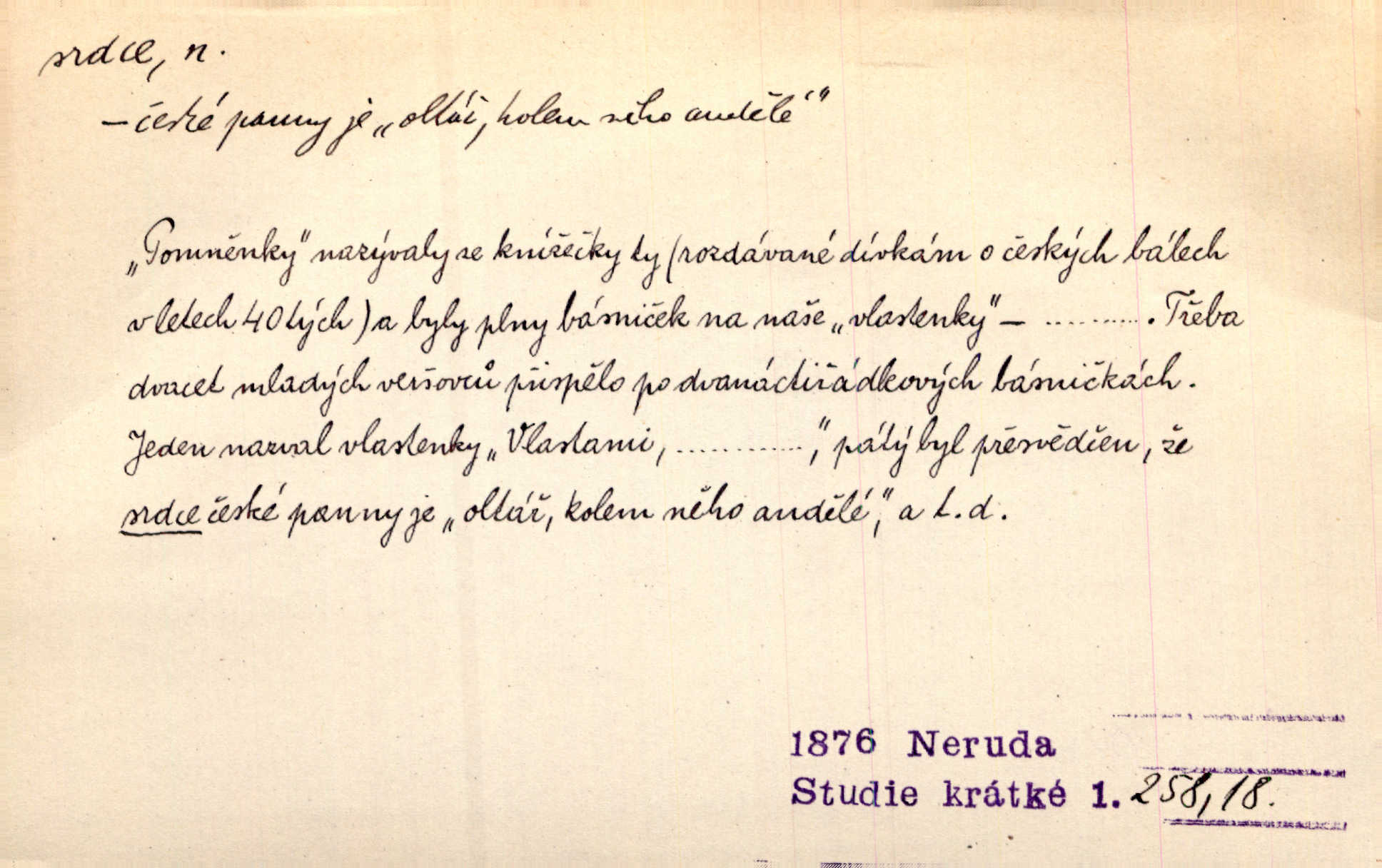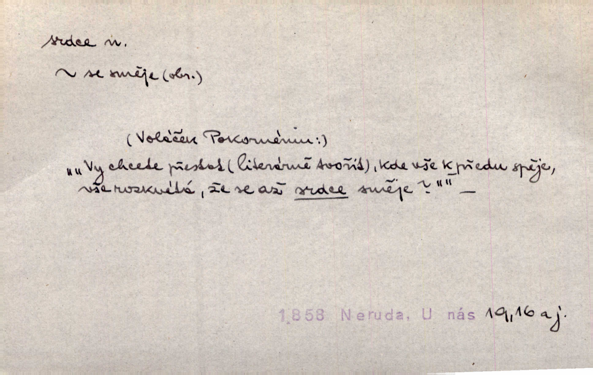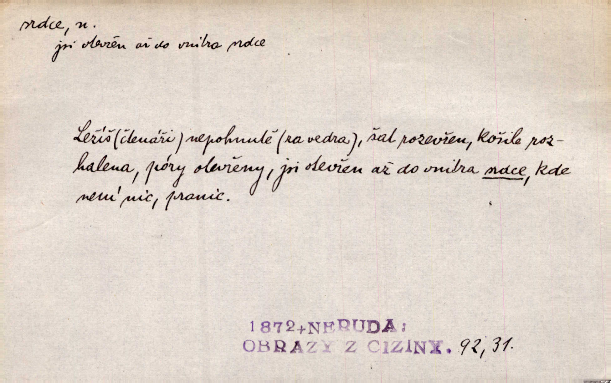 - srdce, -e n. orgán charakteristického tvaru uložený v prsou a uvádějící krev do oběhu. Srdce mi prudce bušilo. Šim. Jaro se ozvalo ve prsou, srdce tak buší a tepe. Ner. Včera [mu] zase „srdce vynechávalo“ nepravidelně tlouklo. Čap. Ch. Všecka krev vehnala se mu k srdci. Šmil. Pocítíte bolest, jakoby dýkou projel vaše srdce. Kar. Svině křičela, jakoby jí nůž do srdce vráželi hrozně. Hol. Okolo srdce mi bylo tak ouzko. Rub. V Hanušovi se při těch slovích srdce stáhlo. Šmil. Takové usmání v lících rozpučilo, že by bolestí se srdce rozskočilo. Ner. Pak bylo Jírovi, jako by se mu mělo srdce utrhnout. Hál. Já nejsem zlá, jak o mně povídají, já bych srdce rozdělila. Klost. Srdce z prsou by si za Antoše vyřízla — jen kdyby mu pomohla udělala by všechno možné. A. Mrš. Žloutly se tu ryzce, až se srdce smálo. Třeb. A srdce zrovna zmíralo v sladké té dřímotě V. Mrš. Ta dítky má — div mne to nezmučí! Pod srdcem jedno, druhé v náručí je těhotná. Vrch. Je [Bělehrad] jakoby srdcem dunajských kralů středem, jádrem. Ner. Přen. Tam, tam na Východě začalo srdce lidstva bít začal kulturní život! Ner. Černá země hýbala se pod povrchem, jakoby i srdce země už zabušilo jaru na uvítanou. Herb. Ba zdá se mi, že duše hájů nepustí ptáky z náruče, až slavíček, to srdce lesa, si při mém srdci zatluče. Hál. [V rolnictvu] vidím srdce národa. Svět. A mezi ním a plání leží Betar, to srdce vzpoury. Vrch. Byla tu Kutná Hora, stříbrné srdce království. Šus. Srdce vlasti, Praho, zdráva buď! Heyd. Výmluvný ten protest proti porobě a násilí nemohl jinak než otřásti srdcem Anglie. Krás. Círk. kongregace Srdce Ježíšova a Mariina několik řeholních společností katolické církve. Lék. dutý sval příčně pruhovaný, tvaru nepravidelně zploštělého kužele působící pohyb krve v cévách. Kuch. dušené hovězí srdce. D symbol, sídlo citu (lásky, nenávisti, radosti, bolesti). Brzy k srdci, brzy k rozumu klonila se. Šmil. Jsou [Kosmické písně] básněny více mozkem, než srdcem. Kar. Ruka vykonává vše, co jí srdce a hlava poroučí. Ner. Srdce se musí umlčeti a třeba i vyrvati. Jir. Srdce ji táhlo k dceři a k vnoučátkům. Něm. Probůh! což nemáš srdce? Krás. Jsou mezi vámi ještě lidé bez kusa srdce. Hol. Hledám lidi, v mém jak ve snu žili; bez srdce však larvy najdu jen. Mácha. Měl už tenkrát tvrdé srdce jako kámen byl nemilosrdný, necitelný. Šmil. Ženy mají srdce příliš blízko u mozku milují s rozvahou. Maj. Má [Františka] někoho již v srdci? miluje ho. Prav. Hoj, já mladá dívčina, srdce nezadané. Erb. Kterak se tedy nazývá vyvolená tvého srdce? Just. Vyznával upřímně, že po ní celým srdcem toužil. Prav. Milá dcero, co mohu říci, když si už podle srdce svého zvolila lásky. Něm. Jdi si, Alberte, kam tě srdce pudí. Jir. Rozdělil své srdce mezi Verunku a Teklu. Herb. Pravda-li, strýčku, že máte srdce pro naši vlast? Gabler. Nejpevněji však přilnulo srdce Jungmannovo k horoucímu vlastenci Vydrovi. Zel. Cítím, že tento člověk přirůstá mi k srdci. Mah. Stárkovi padla hned první den do srdce. Svět. Můj milý český jinochu, já v srdci svém tě nosím. Ner. Od přítele srdce odvrátil přestal ho mít rád. Svět. Nenáviděl od srdce křivdu opravdově. Šmil. Nenávidí z gruntu srdce směr, jakým se nese nynější lékařská literatura. Čech. Bylo jim velmi těžko u srdce byli zarmouceni. Šmil. Přece někdy to srdce stáhne zabolí to. Šim. Měl srdce v kleštích byl v úzkostech. Šmil. Jen mi teď nedělej těžké srdce nedělej starost, lítost. Něm. Musí ho srdce bolet, že pro několik hrstí obilí udělal nebožáka nešťastného musí trpět. Svět. A zas plakala, až jí srdce usedalo velmi lítostivě. Svět. Srdce ve mně radostí poskočilo. Rub. Odejde-li ona, dětem se srdce utrhne budou v těžkém žalu. Hol. Nevěsta jej odmítla a on si to vzal k srdci trápil se. Poláč. Vzal jste si k srdci mé napomenutí řídil jste se jím? Hlad. Mladá paní nebrala si příliš k srdci všechny zlomyslnosti a urážky nedbala jich. Her. Nepřeneseš přes srdce, abys jim zničil celou budoucnost nesneseš lhostejně. K. Čap. Nemohouc mužovo jednání přenésti přes srdce, podstrkovala synovi sem tam groš strpěti. Herb. Co srdce ráčilo, to se vítězným nedojedům vydati musilo vše, čeho žádali. Herb. Bylo mi tatínka z toho srdce líto upřímně. Kos. Pláče ze srdce lítostivě, upřímně. Vrch. S jak těžkým srdcem vytahoval své zlaťáky velmi nerad! Dyk. Umíral s lehkým srdcem lehce. Kun. S lehčím srdcem vrátil jsem se k Pavlovi Lum. D základ povahové stránky, sídlo duševního života, nitro. Lidé se umějí přetvařovati, kdo jim vidí do srdce? Šmil. Nemajíce v srdci žádné náboženství, před světem největší nábožnůstkářství provozují. Havl. Čekal s nápadným neklidem v srdci. Vach. Teď ukázal srdce i ledví objevil se v pravé podobě. Baar. Lidí dost, však srdcí, srdcí málo dobrých lidí. Heyd. Antonín má dobré srdce. Jir. Oni nemají zlé srdce. Šim. Kdo má kus poctivého srdce, raduje se s Vámi. Herb. Měl měkké srdce a tvrdou hlavu. Rub. Měla od jakživa srdce z másla byla jemná, citlivá. Tyl. Obr s srdcem dítěte dobrácký, citlivý. Mach. Zlatý skví se na prsou mu háv, ale pod ním bije srdce zrádné je zrádcem. Kamen. Měl štíra v srdci nasazeného byl neklidný. Baar. Co byl ženat, otevřel jí srdce vyznal se ze všeho. Svět. A dnes po letech vím, že Aleš každému srdce neotevře. Rais. Otevřel knězi hříšné své srdce. Šrám. Po ty tři roky s nikým od srdce nepromluvil upřímně. K. Čap. Vylívá srdce své mluví důvěrně. Ner. Vypravovati upřímně a nelíčeně, od srdce k srdci, dovede člověk toliko řečí jednou. K